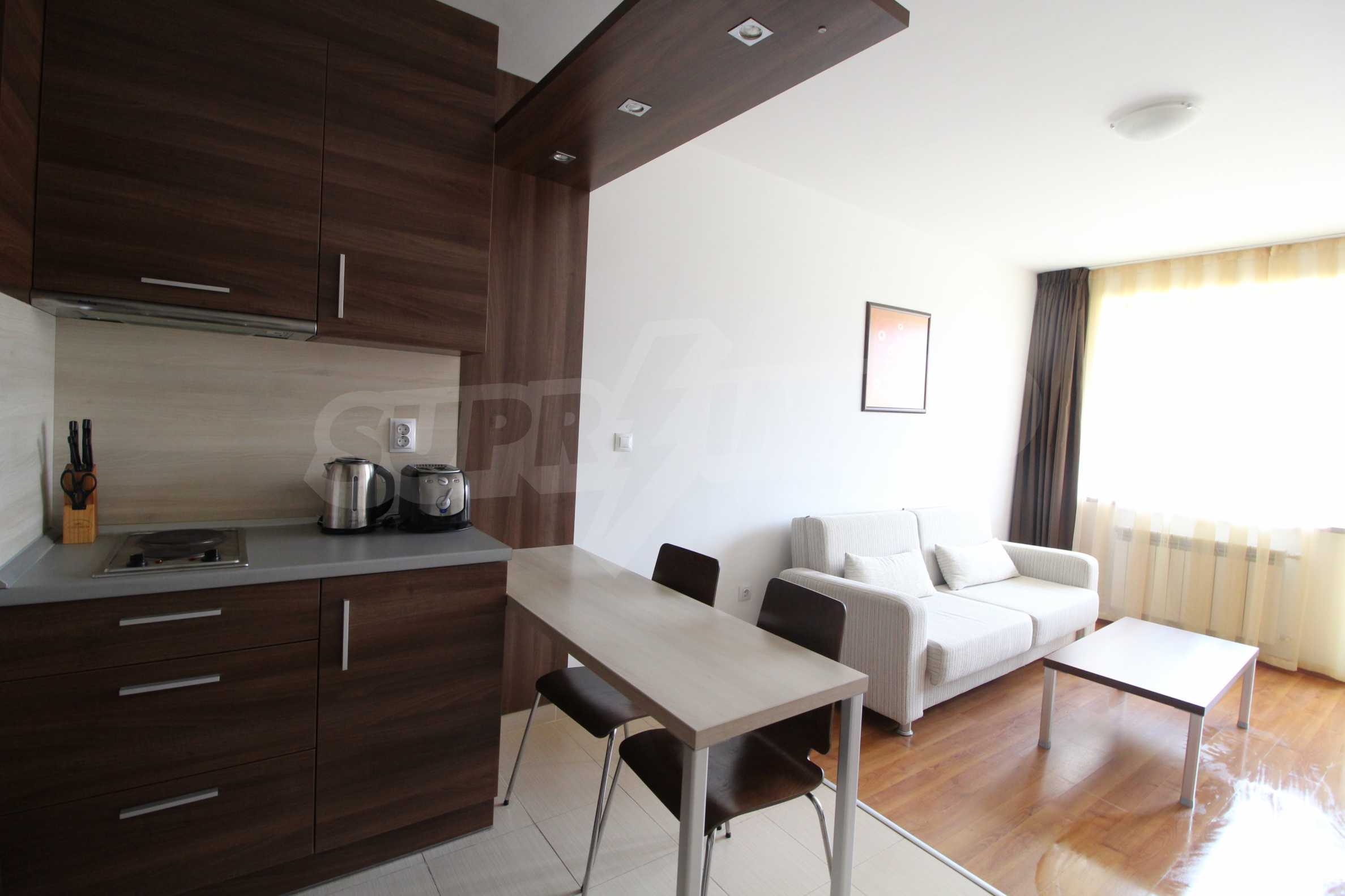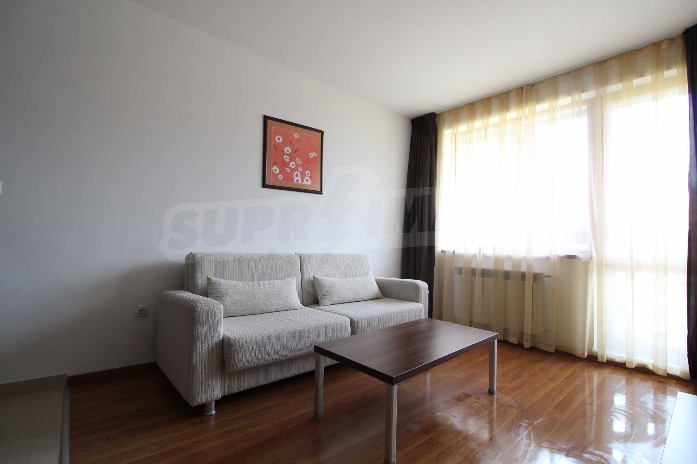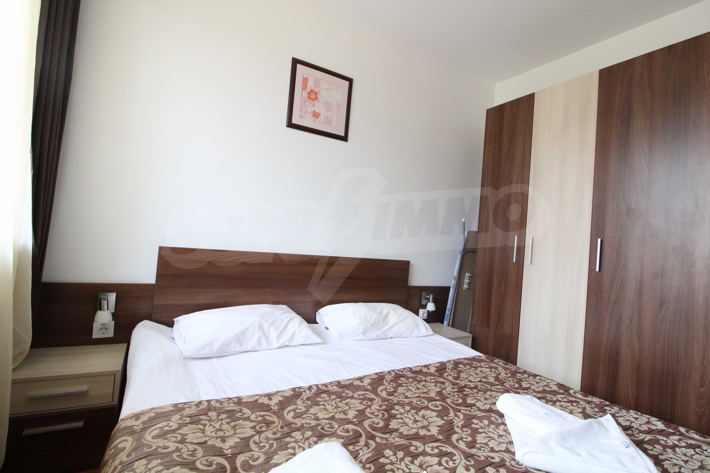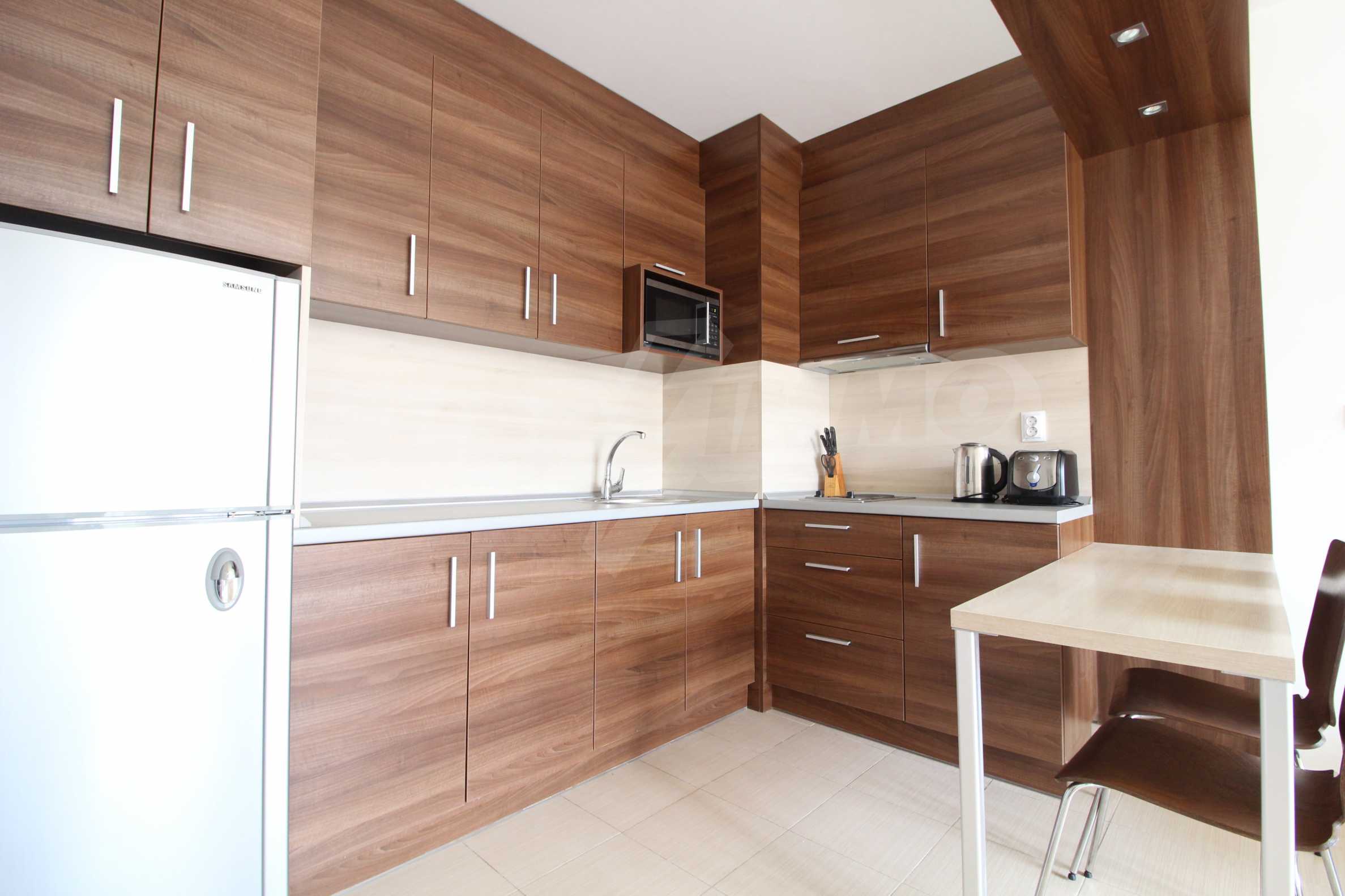 One-bedroom apartment with an area of 58.06 sq.m., which is located in Belvedere Holiday Club complex. The property offers: an equipped kitchen with living room and terrace, one bedroom and bathroom with toilet. The apartment is located on the fifth floor. The kitchen consists of kitchen cupboards, refrigerator, stove and dining table. The living room is furnished with sofa, armchair and TV. The bedroom offers double bed, bedside tables and wardrobe.