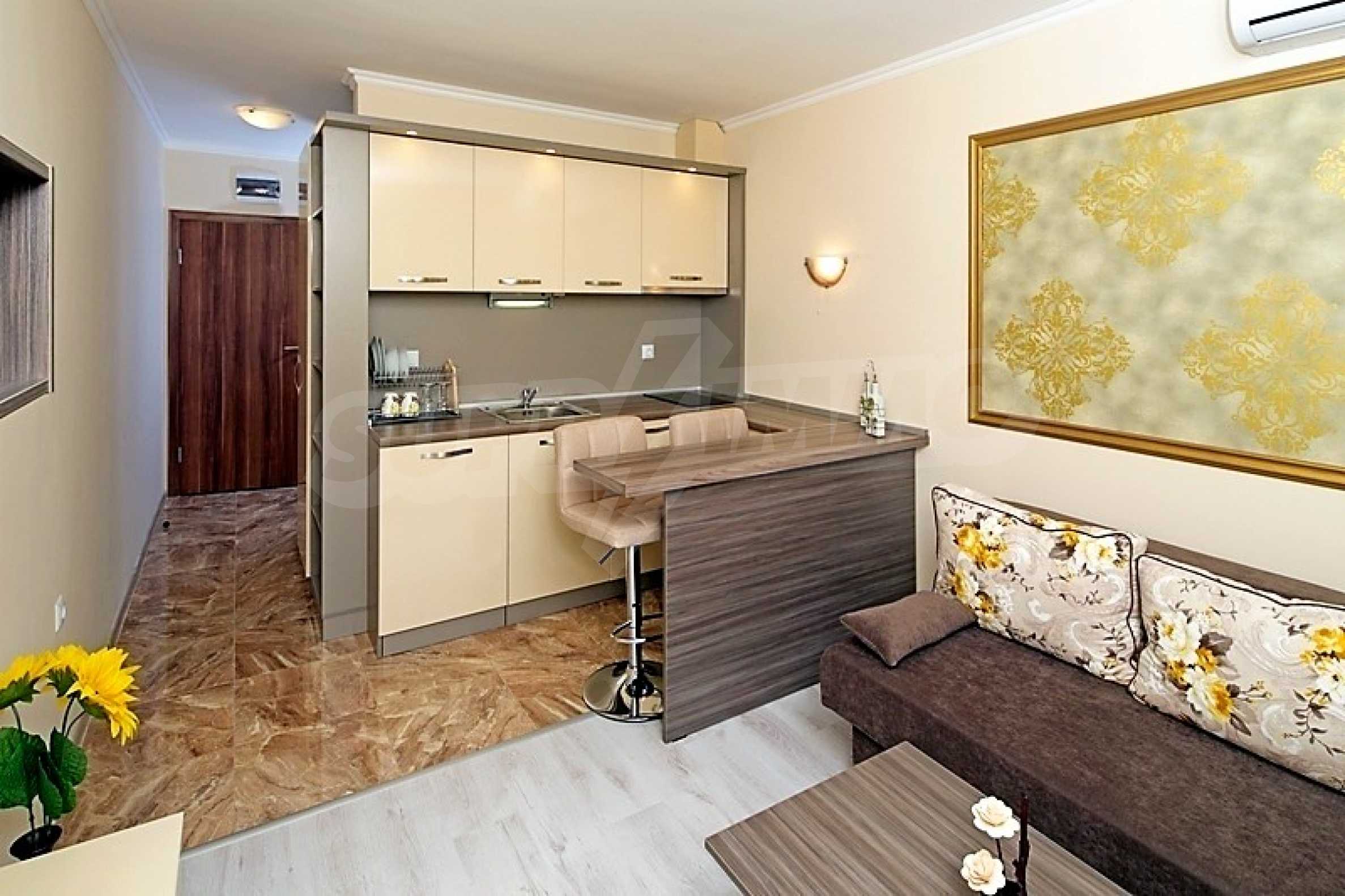 The apartment is located on the first floor in a building with luxurious common parts and a modern elevator and has an area of 30.08 m2. It is 100% finished with turnkey furniture: equipped bathroom with boiler, luxury sanitary equipment and faience, flooring - terracotta and laminate flooring, walls and ceilings - latex, PVC window frames, air conditioning with cooling and heating system, cable TV and Internet, furniture and appliances.