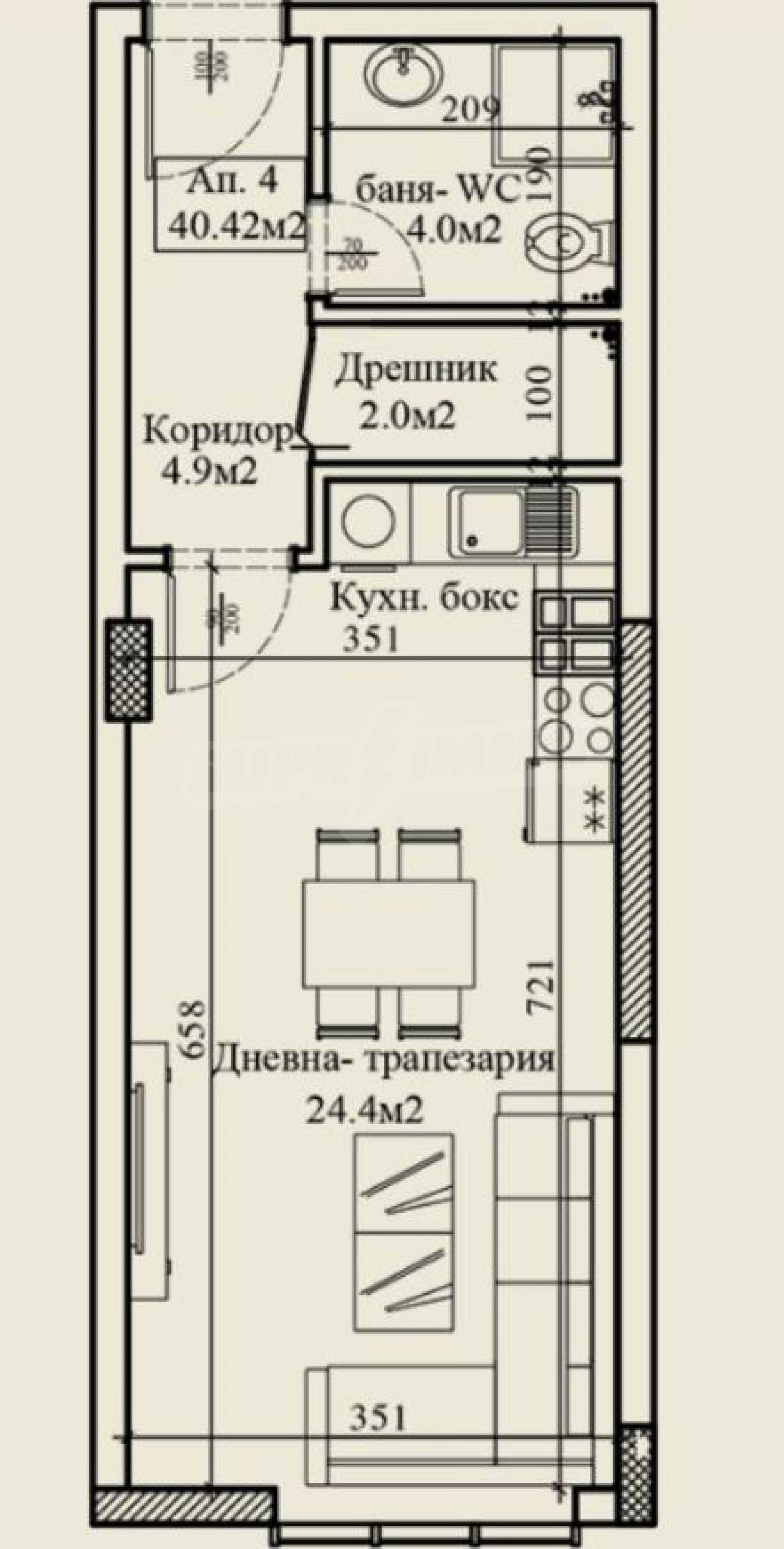 The offered one-bedroom apartment has a living area of 40.42 m2, on which there are: a room of 24.4 m2, a bathroom of 4 m2, a closet 2 m2 and an entrance of 5 m2. The sale is finished according to BDS.