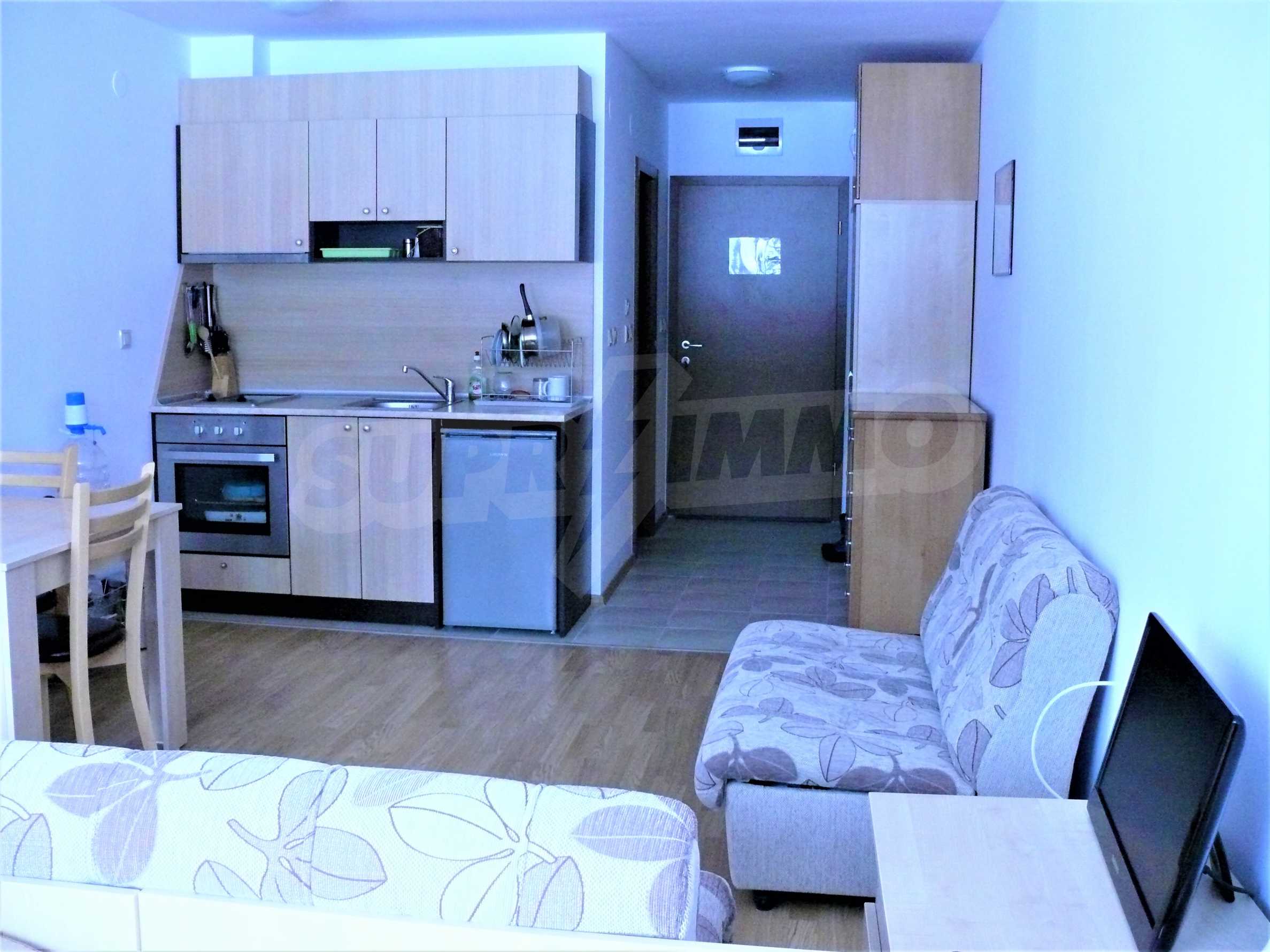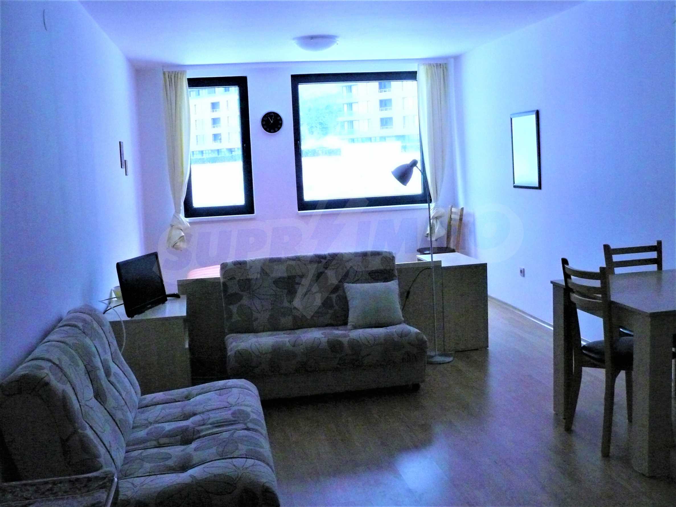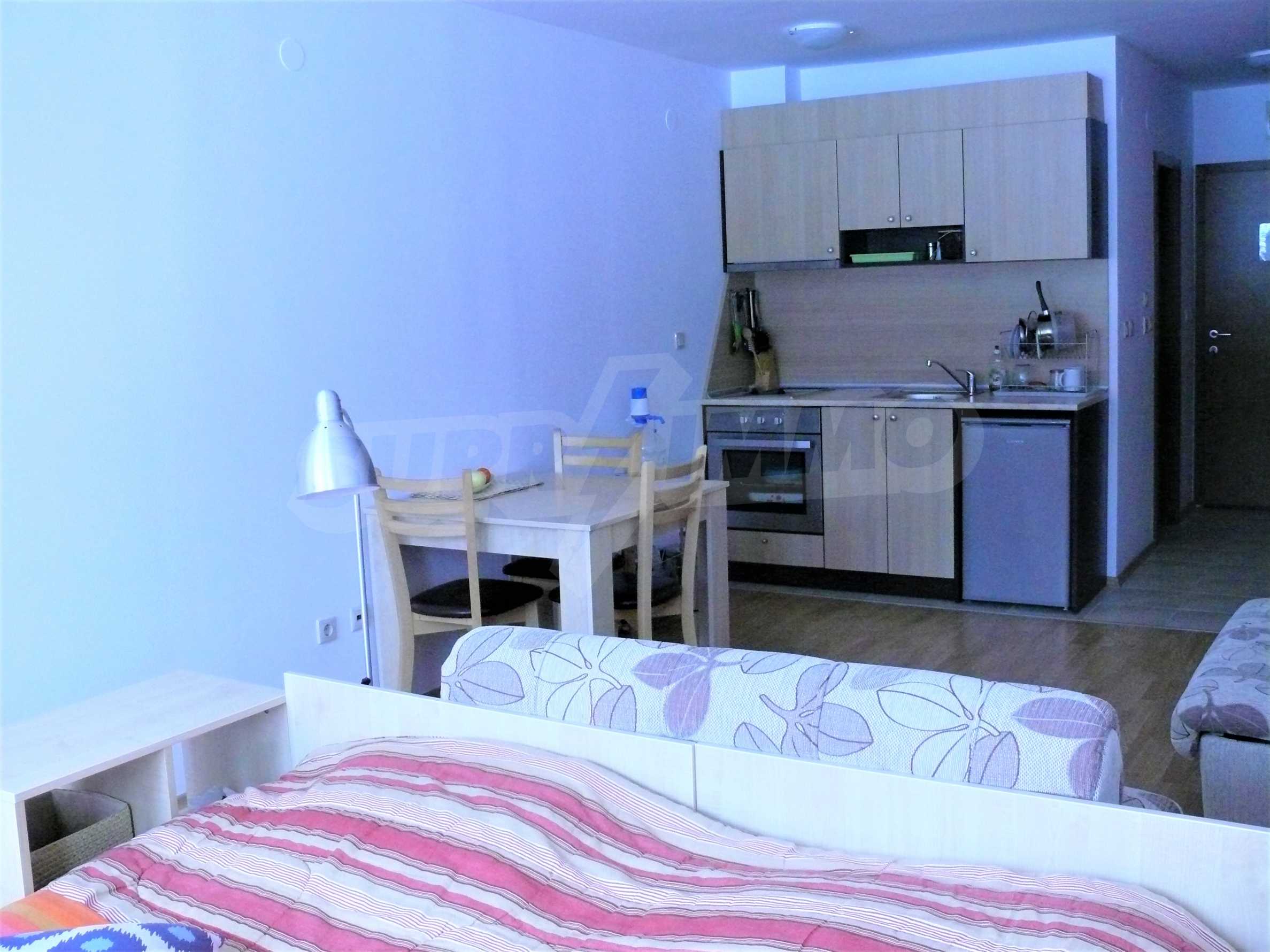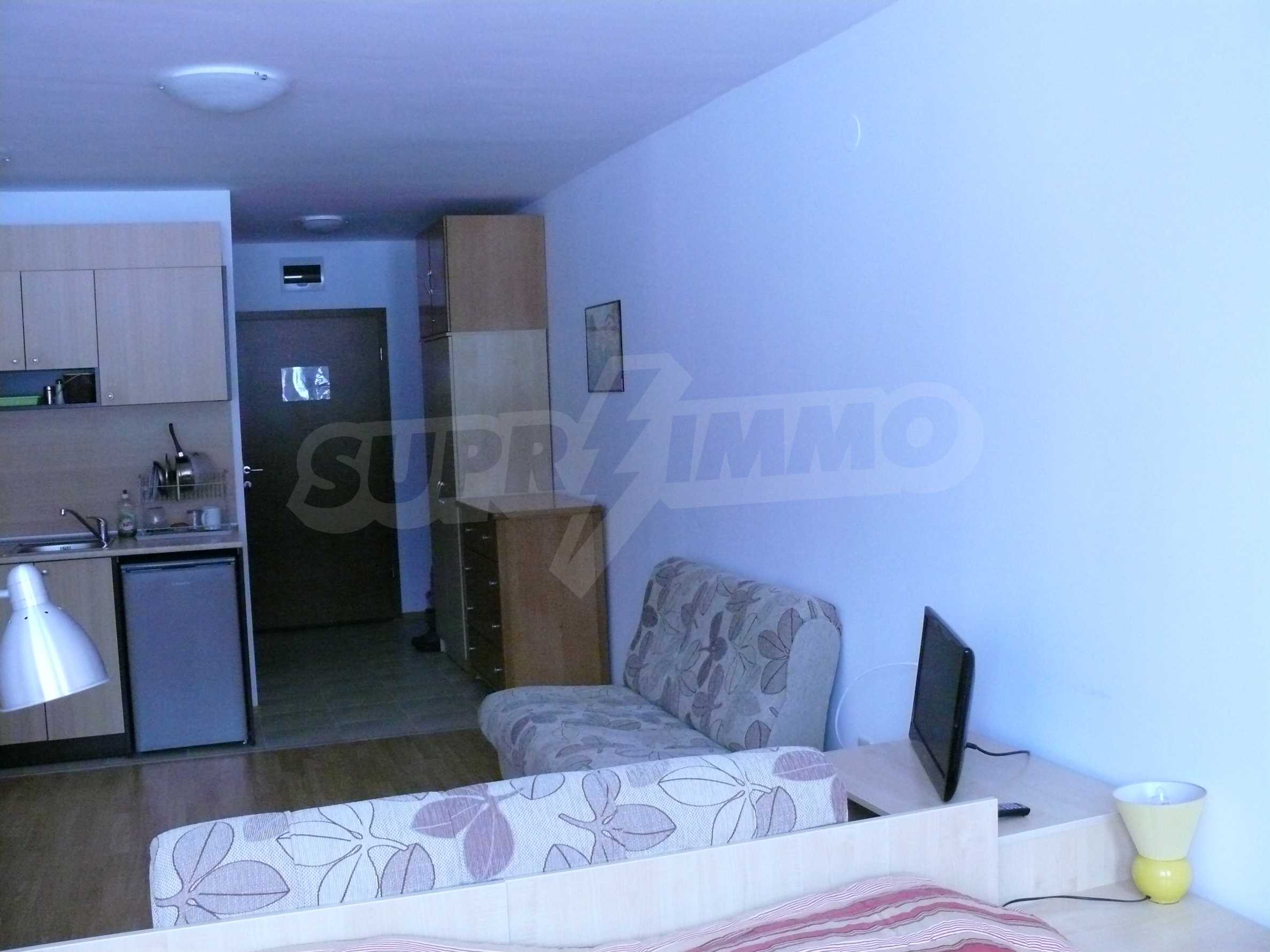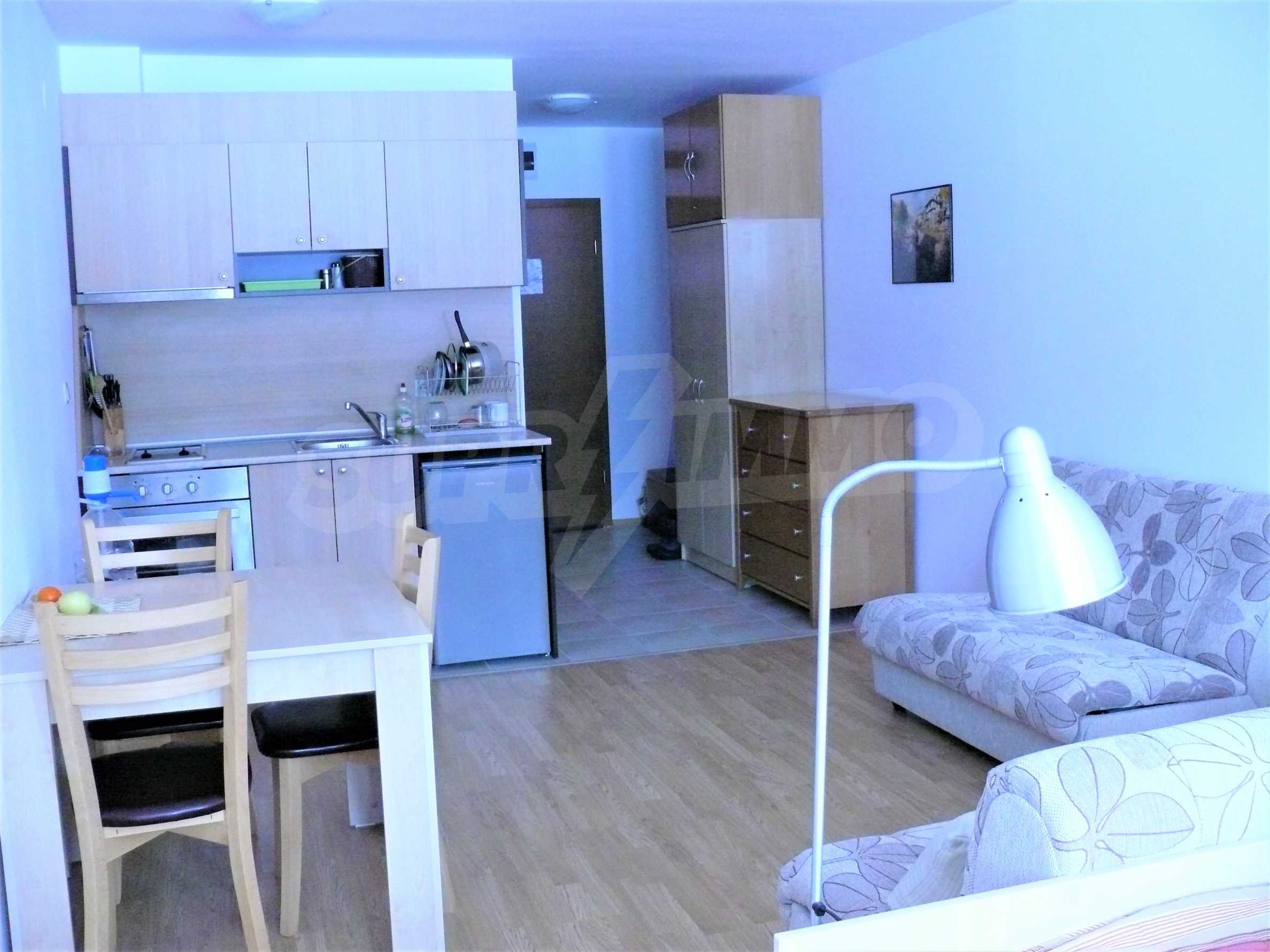 Spacious furnished studio located in the luxurious Aspen Golf complex. The hotel is located 2 km away from Razlog and 8 km from the ski resort of Bansko. The studio is fully furnished and ready to move in. The apartment consists of a small equipped kitchen, bed, sofas, dining table, bathroom with toilet. The property reveals a mountain view. The apartment is located on the first floor.