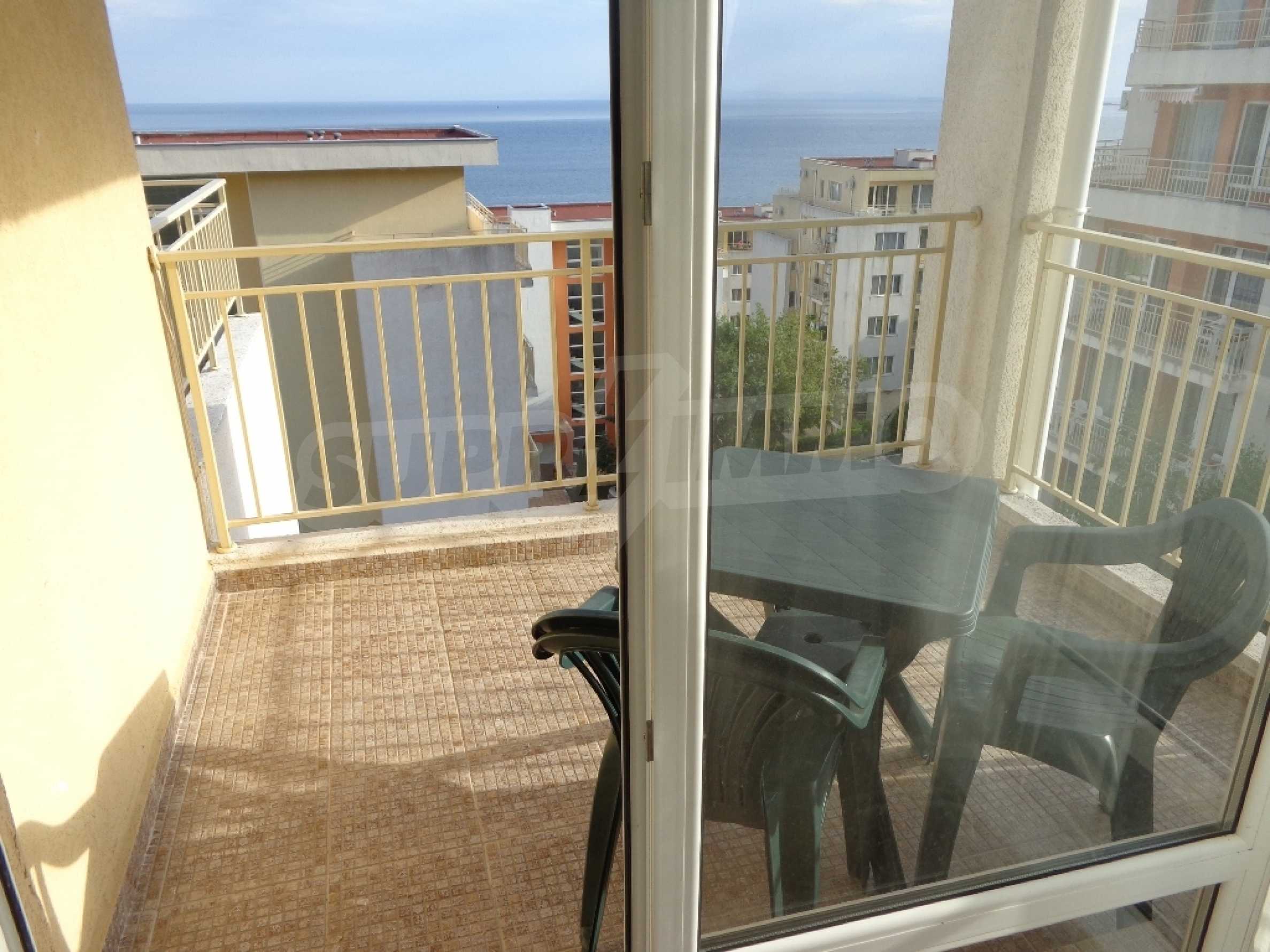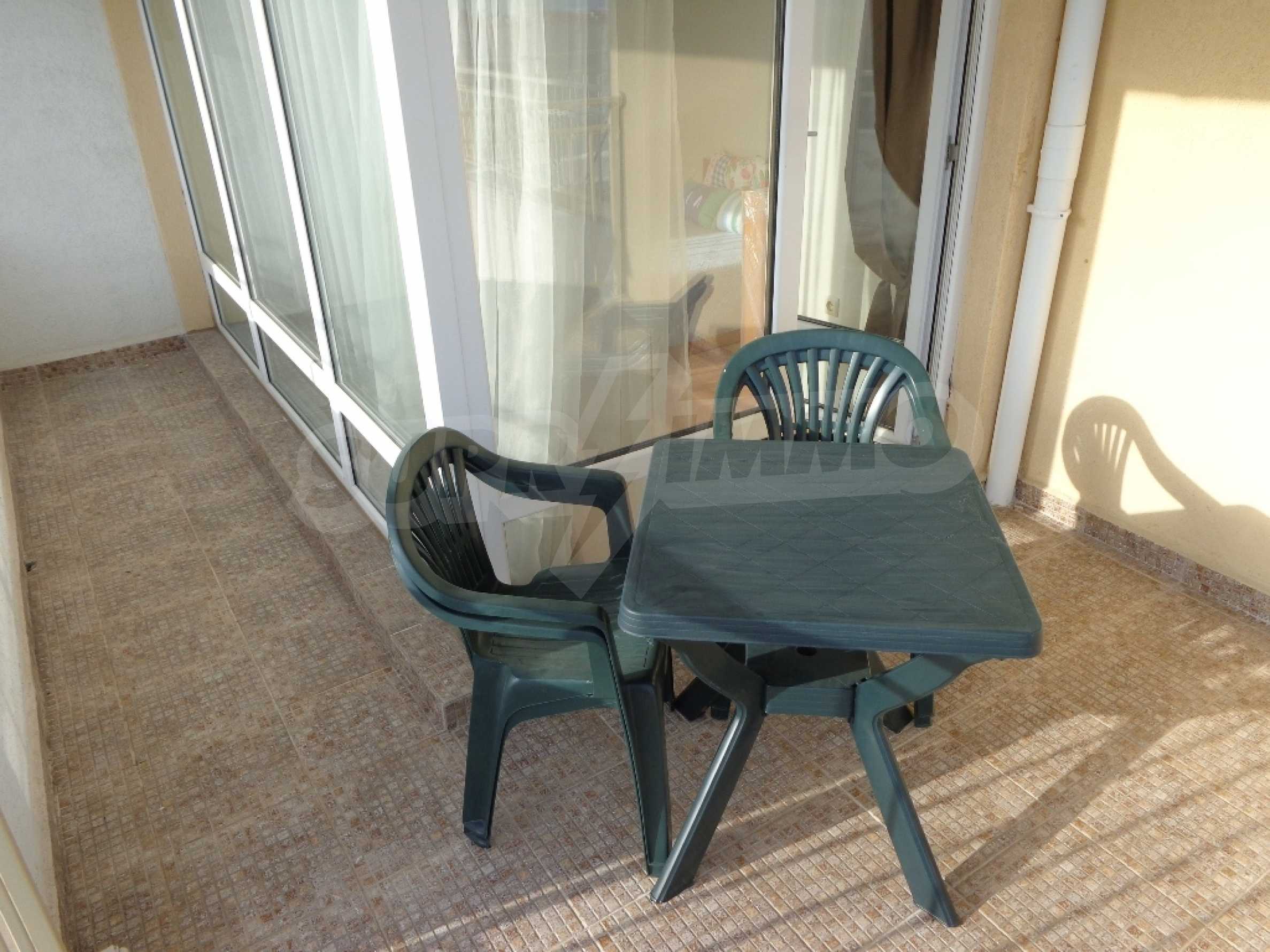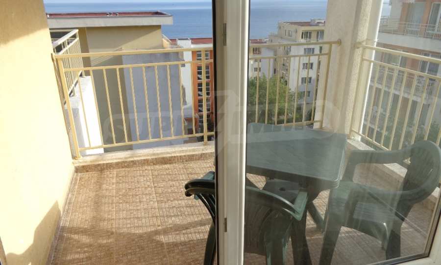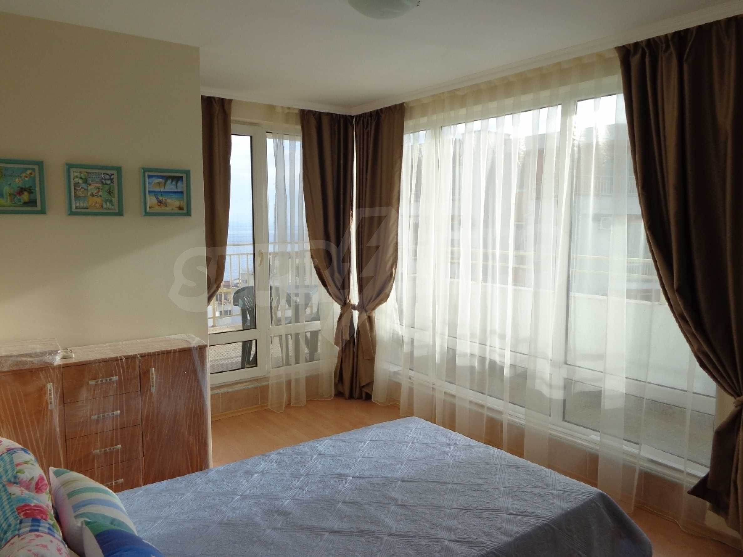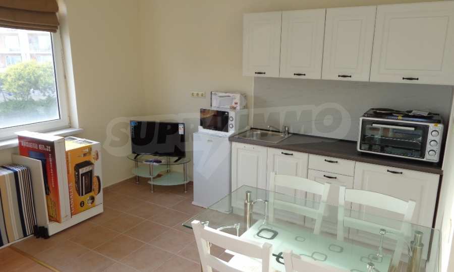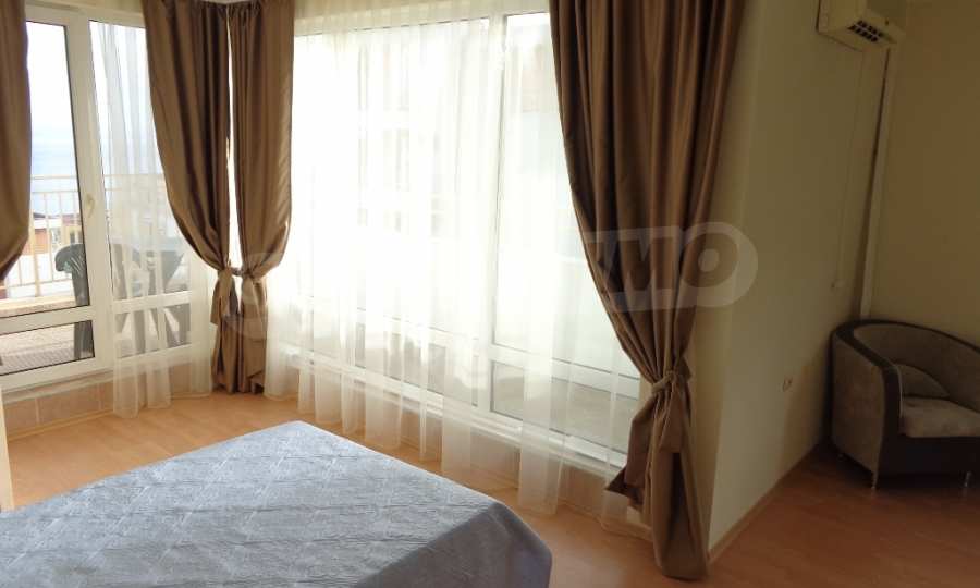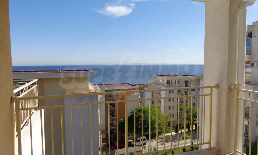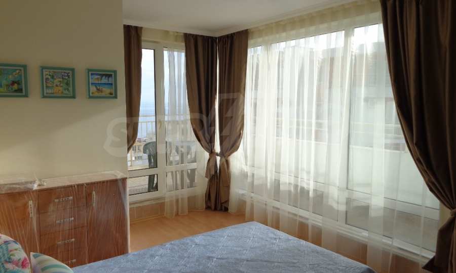 Sold! Finished documents for a transaction at a notary! We offer you a very spacious studio (net area 44 sq.m.) in the Crown Fort complex, located on the second line of the sea, directly next to the St. Vlas reserve. From the windows of the studio opens a beautiful panoramic view of the sea, the old Nessebar and St. Vlas. The studio is very cozy, furnished and equipped in “provance” style. It has a large terrace, ideal for a summer holiday as a place for relaxation, sunbathing, a dining area or a summer kitchen. breading and other features allow it). The cost of this alteration is 500 euros and is not included in the current cost of housing. According to the title deed, the apartment has apartment status!, The studio is equipped with absolute new furniture and appliances (some have not yet been unpacked). Installed high-quality kitchen from the natural array (the lower and upper row of cabinets). Also fully equipped, necessary in the daily and all household appliances, cups, plates, pots, etc., Located on the 5th of 6 floors. There is an elevator. The complex works year-round!
