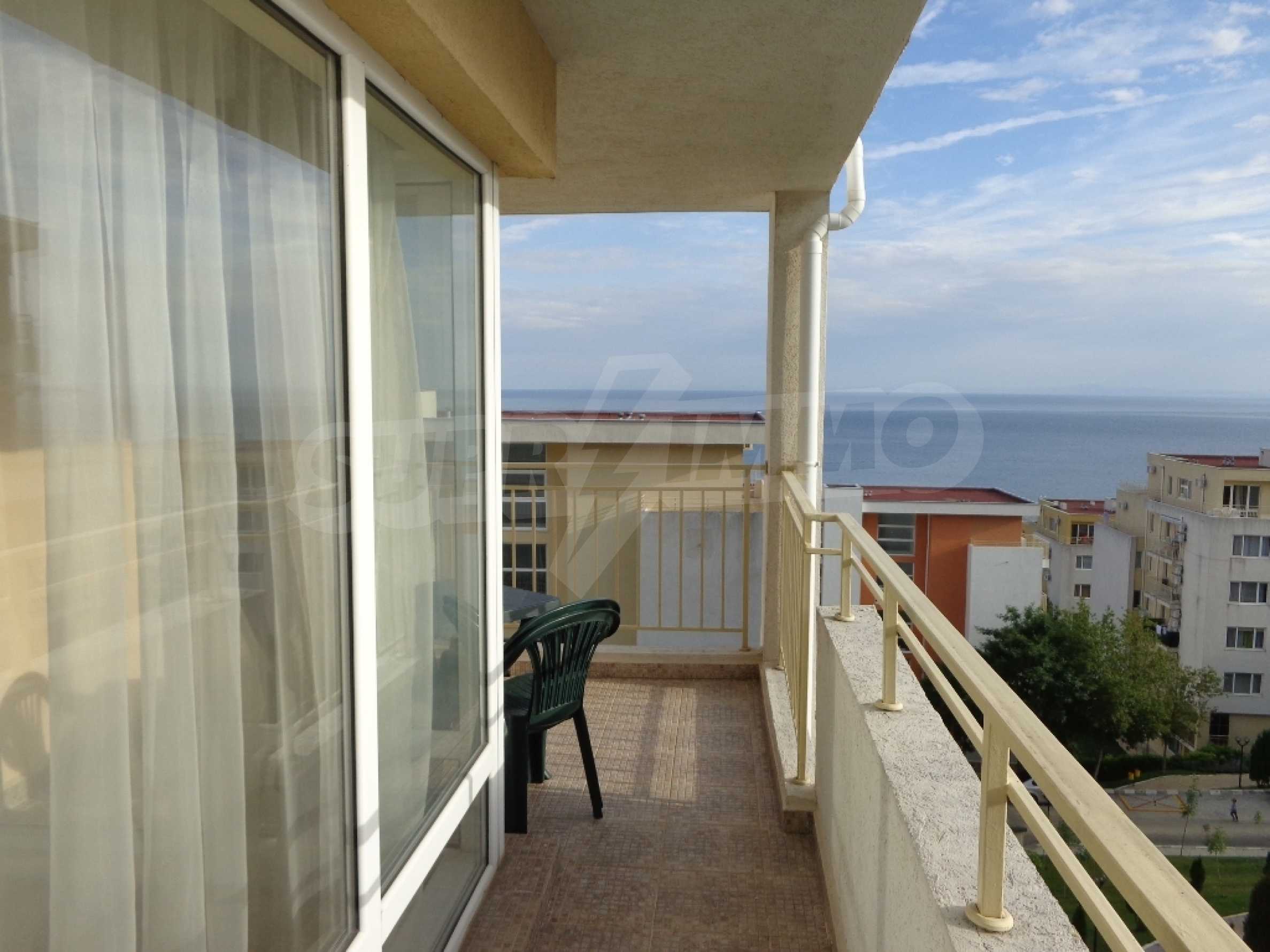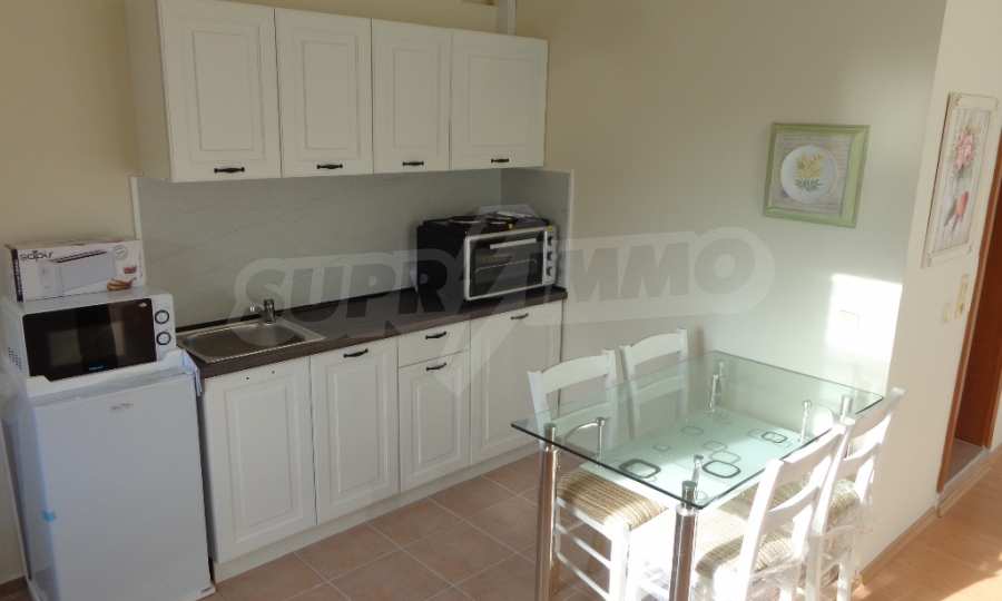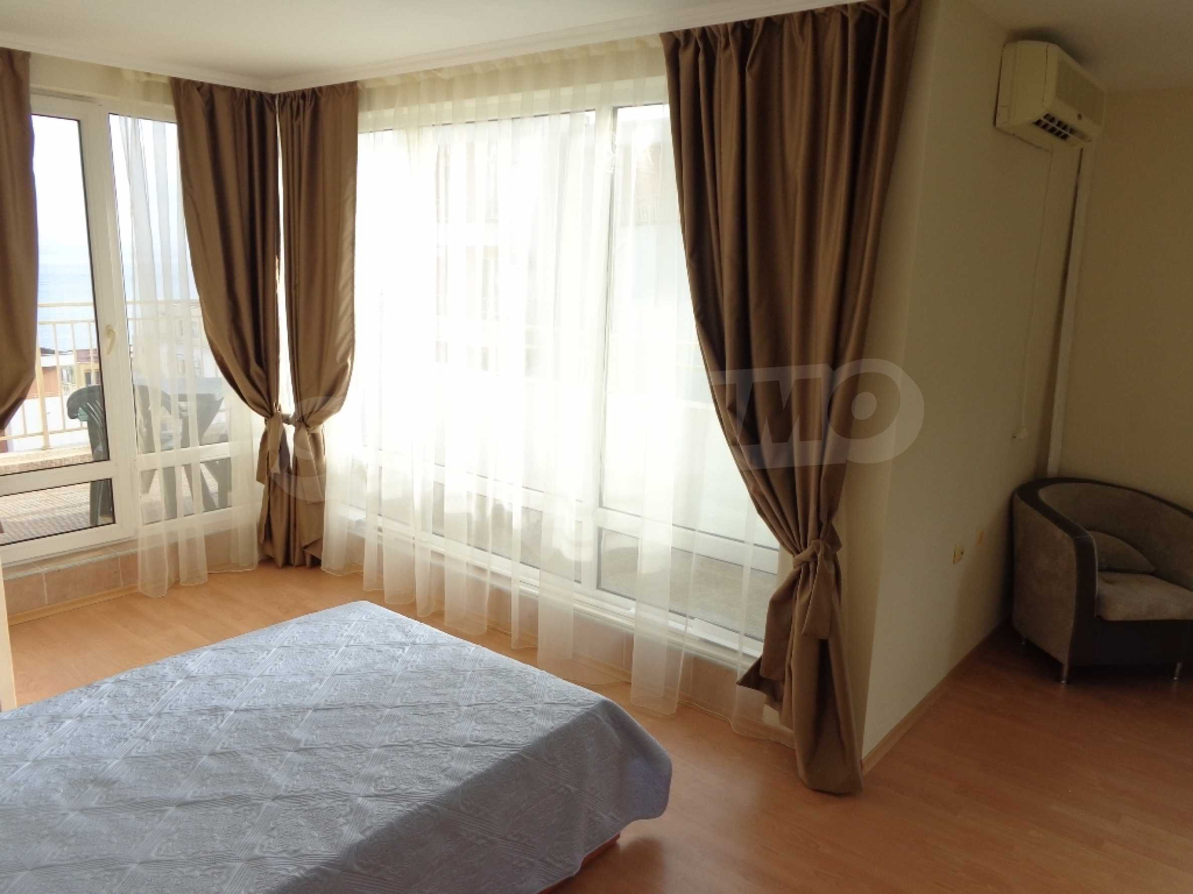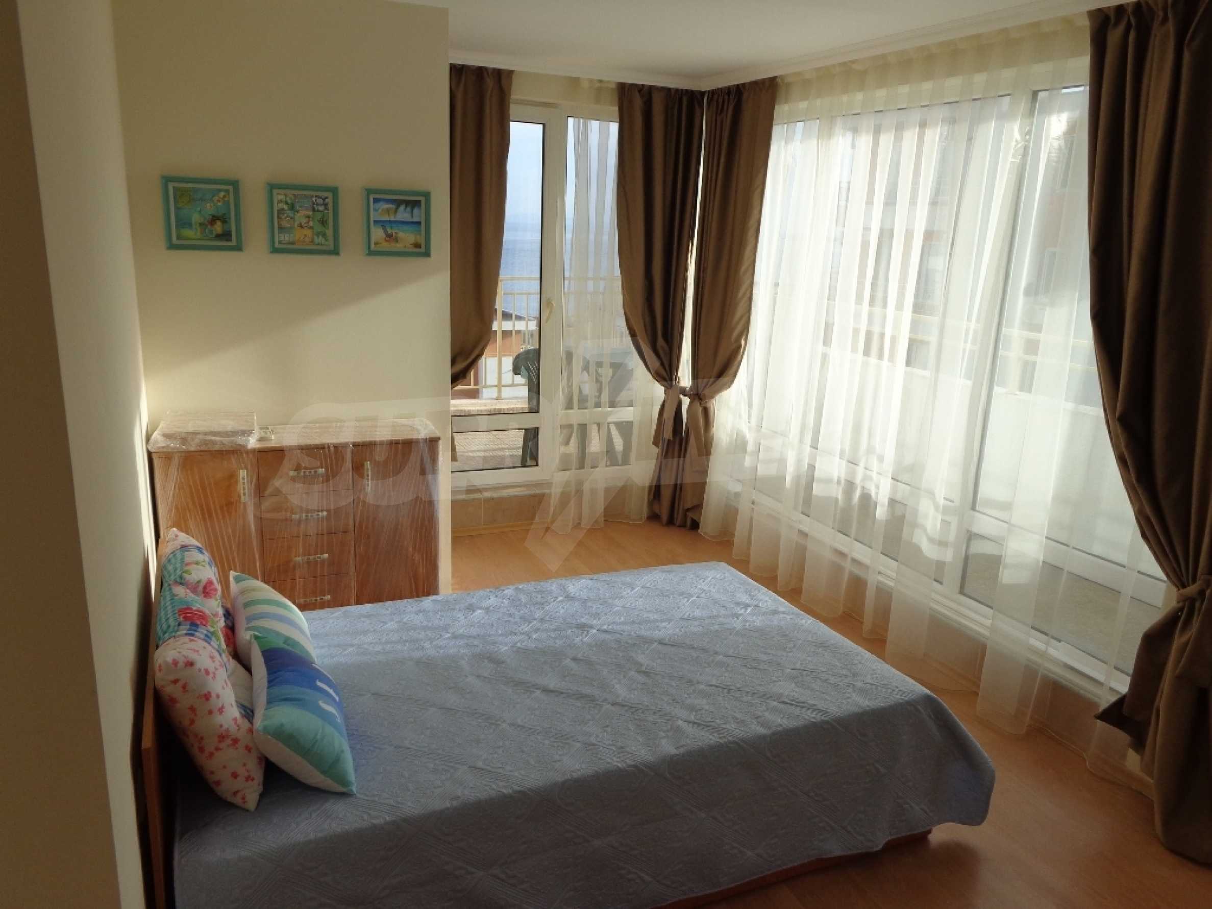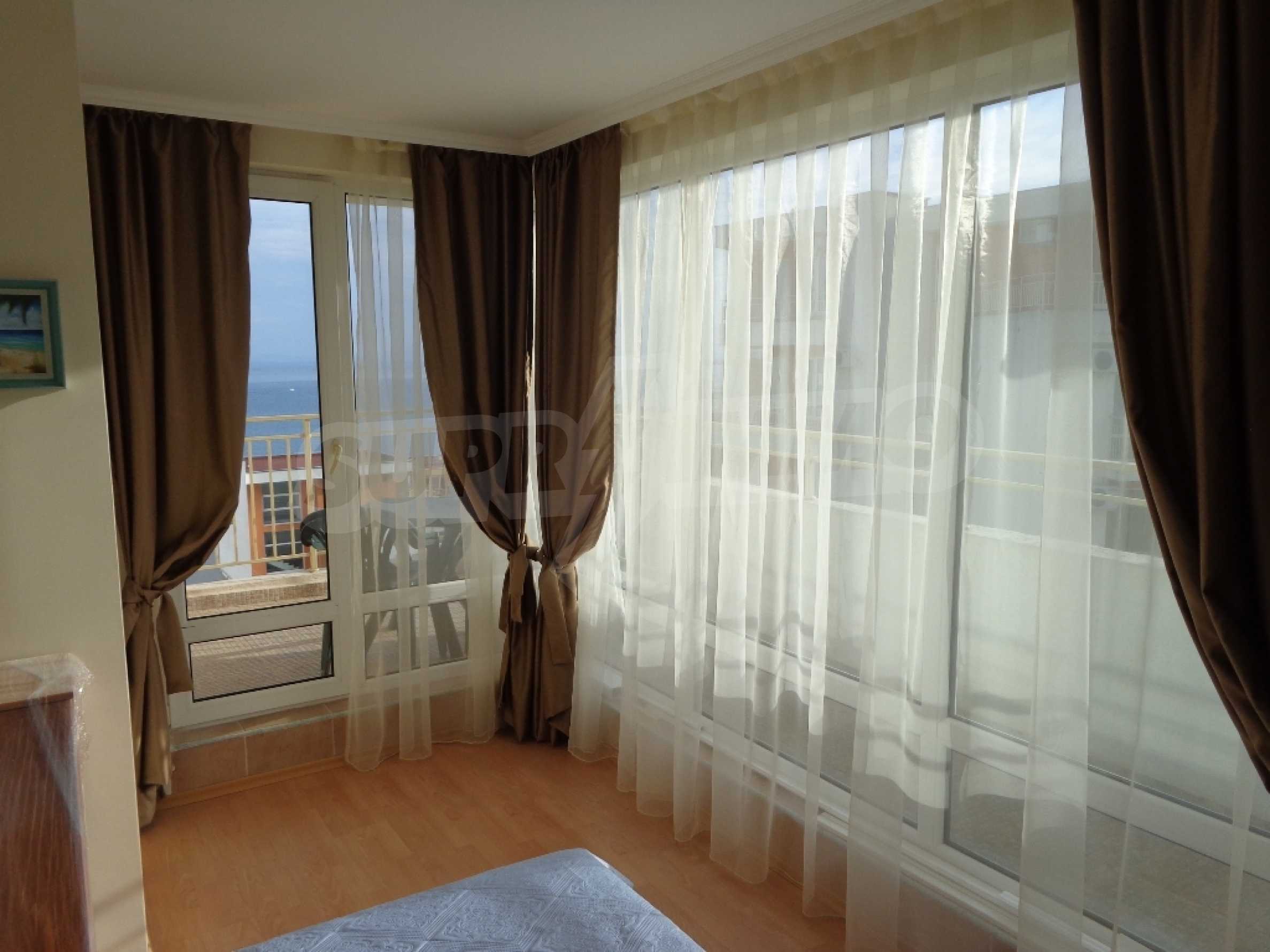 Sold! Finished documents for a transaction at a notary! We offer you a very spacious studio (net area 44 sq.m.) in the Crown Fort complex, located on the second line of the sea, directly next to the St. Vlas reserve. From the windows of the studio opens a beautiful panoramic view of the sea, the old Nessebar and St. Vlas. The studio is very cozy, furnished and equipped in “provance” style. It has a large terrace, ideal for a summer holiday as a place for relaxation, sunbathing, a dining area or a summer kitchen. breading and other features allow it). The cost of this alteration is 500 euros and is not included in the current cost of housing. According to the title deed, the apartment has apartment status!, The studio is equipped with absolute new furniture and appliances (some have not yet been unpacked). Installed high-quality kitchen from the natural array (the lower and upper row of cabinets). Also fully equipped, necessary in the daily and all household appliances, cups, plates, pots, etc., Located on the 5th of 6 floors. There is an elevator. The complex works year-round!