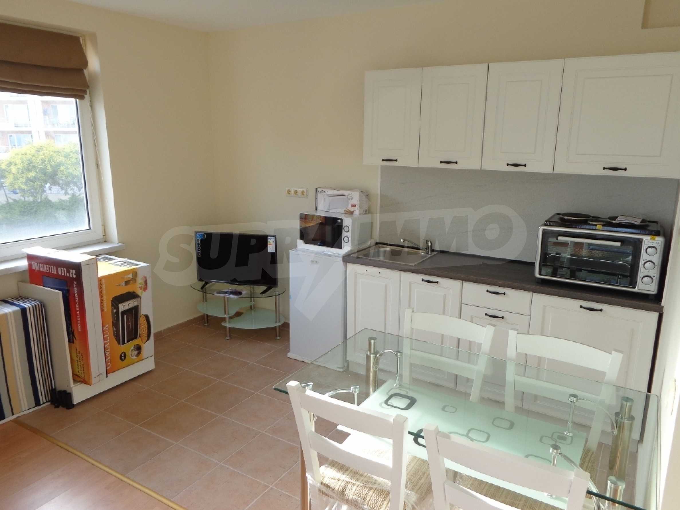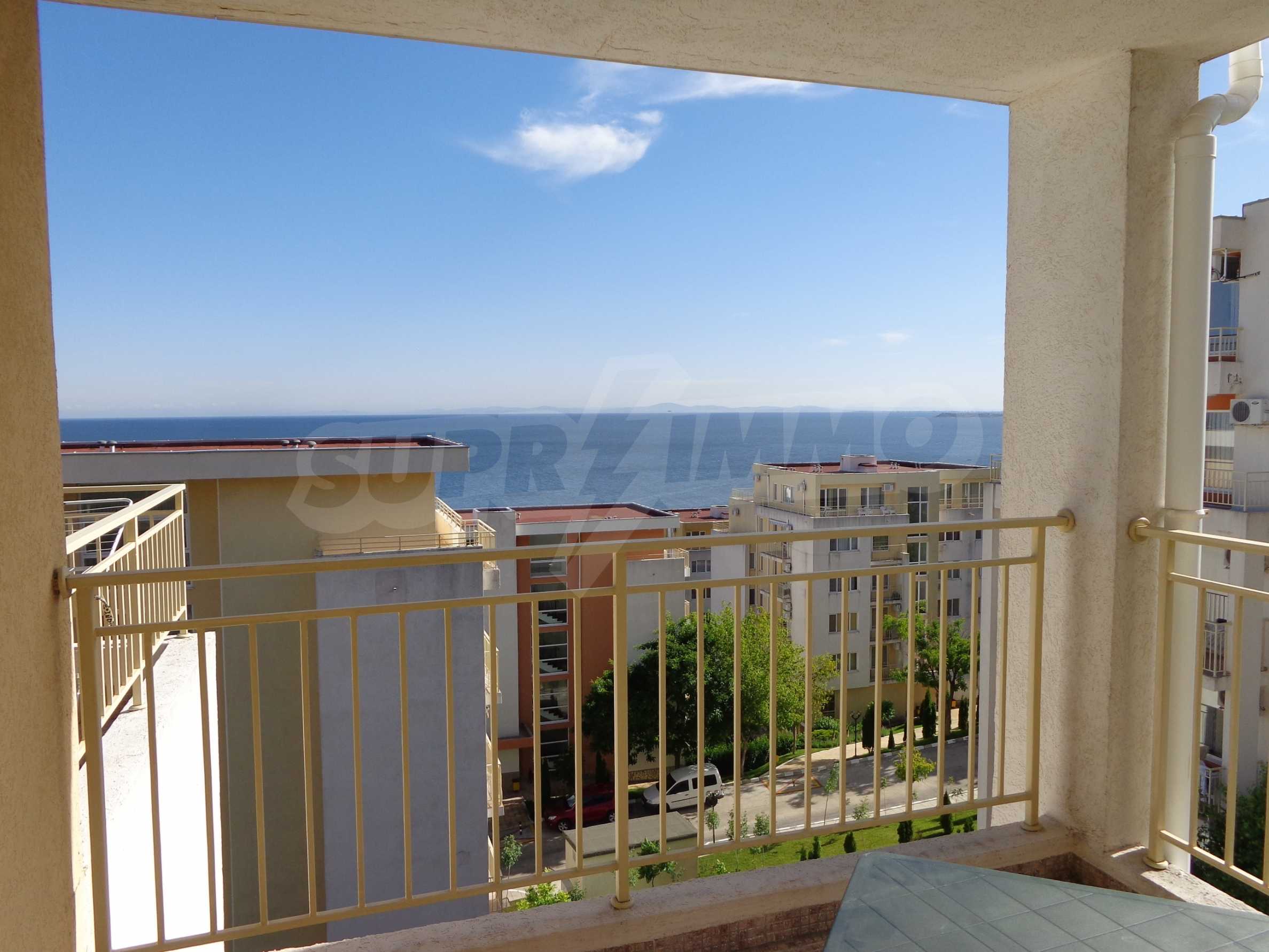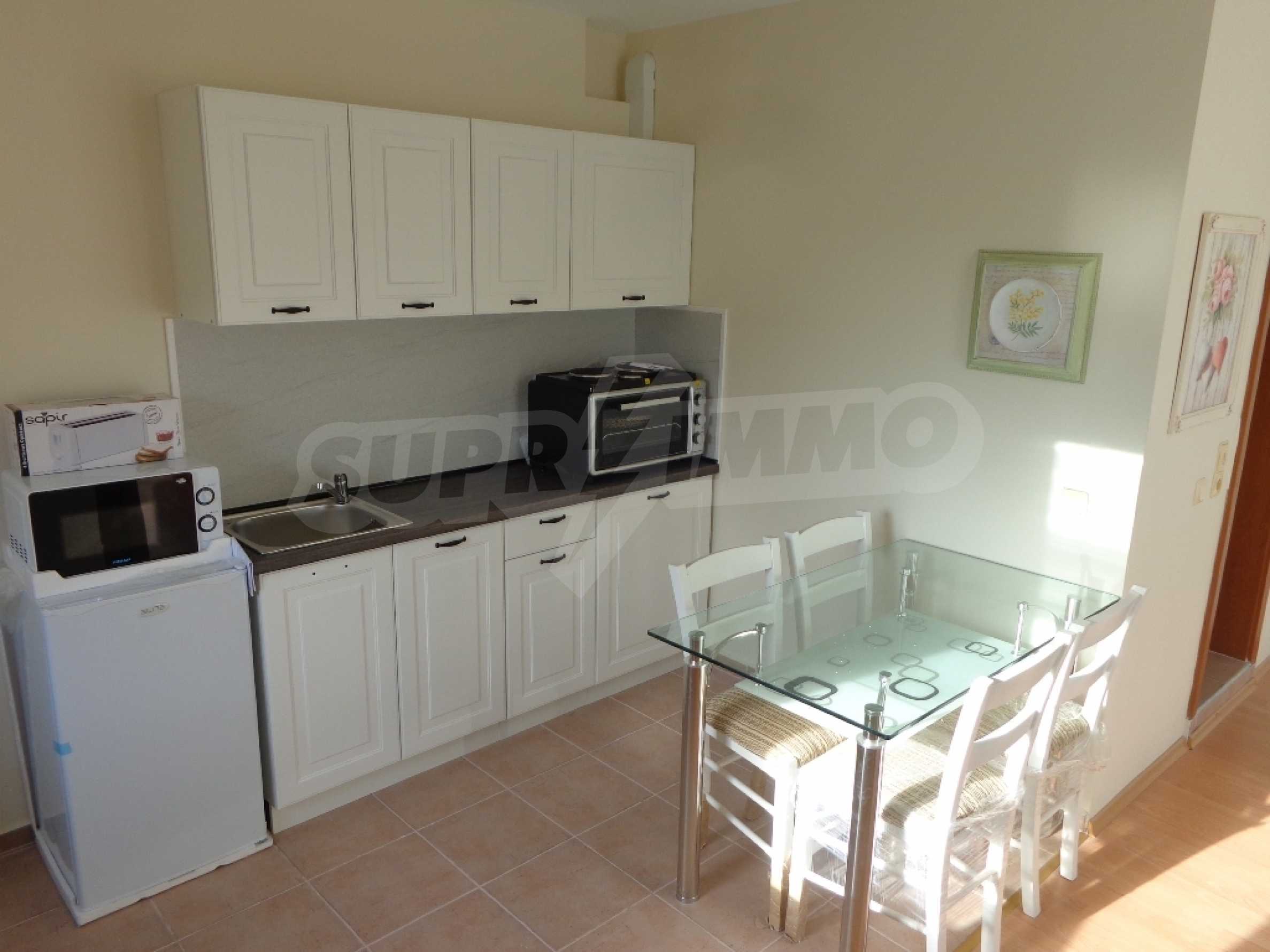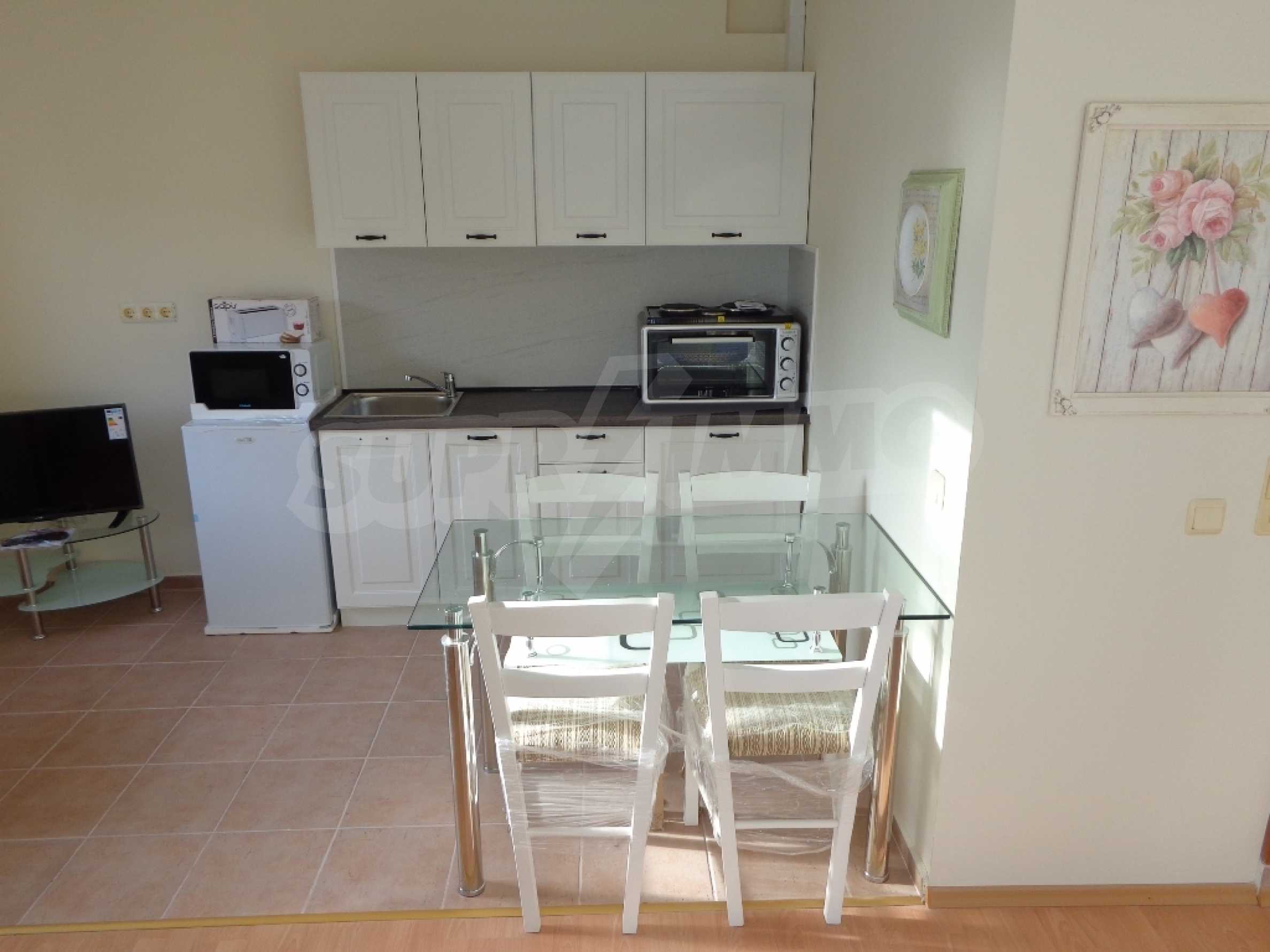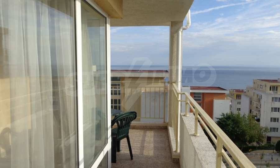 Sold! Finished documents for a transaction at a notary! We offer you a very spacious studio (net area 44 sq.m.) in the Crown Fort complex, located on the second line of the sea, directly next to the St. Vlas reserve. From the windows of the studio opens a beautiful panoramic view of the sea, the old Nessebar and St. Vlas. The studio is very cozy, furnished and equipped in “provance” style. It has a large terrace, ideal for a summer holiday as a place for relaxation, sunbathing, a dining area or a summer kitchen. breading and other features allow it). The cost of this alteration is 500 euros and is not included in the current cost of housing. According to the title deed, the apartment has apartment status!, The studio is equipped with absolute new furniture and appliances (some have not yet been unpacked). Installed high-quality kitchen from the natural array (the lower and upper row of cabinets). Also fully equipped, necessary in the daily and all household appliances, cups, plates, pots, etc., Located on the 5th of 6 floors. There is an elevator. The complex works year-round!