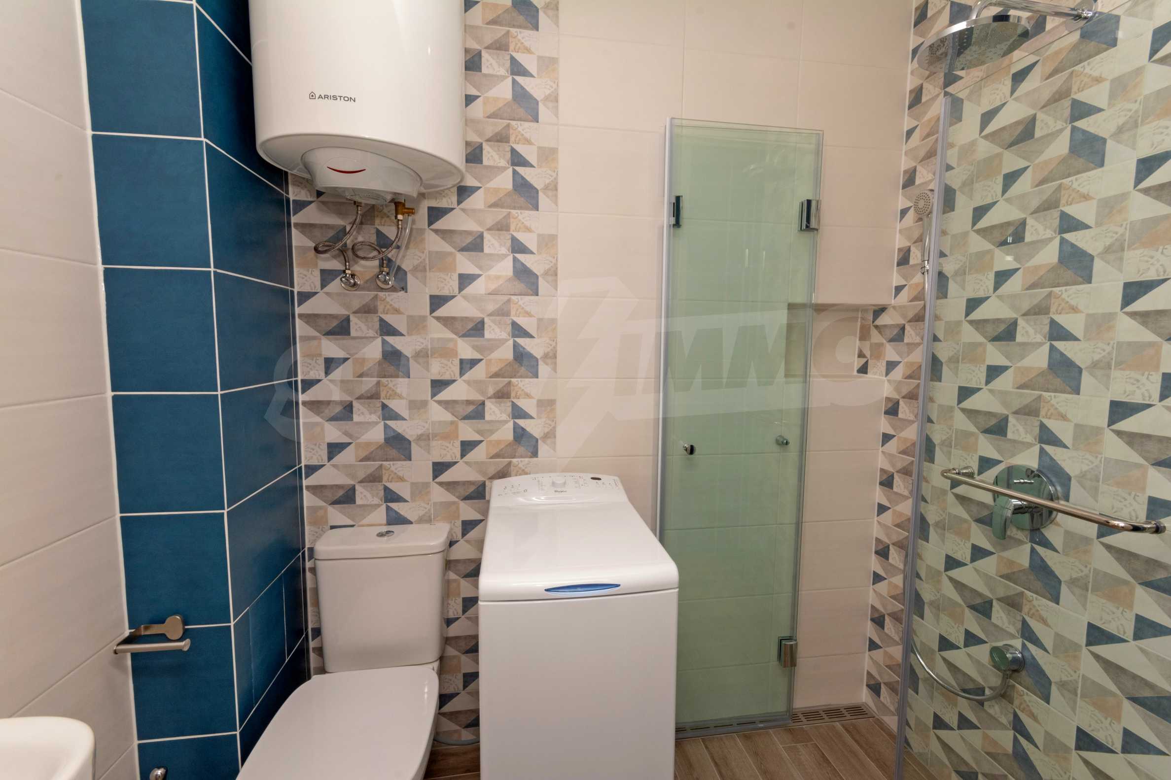 The apartment has a living room and a kitchenette, a bedroom, a terrace, a bathroom with a shower cabin and a toilet. The property is fully furnished and equipped with: