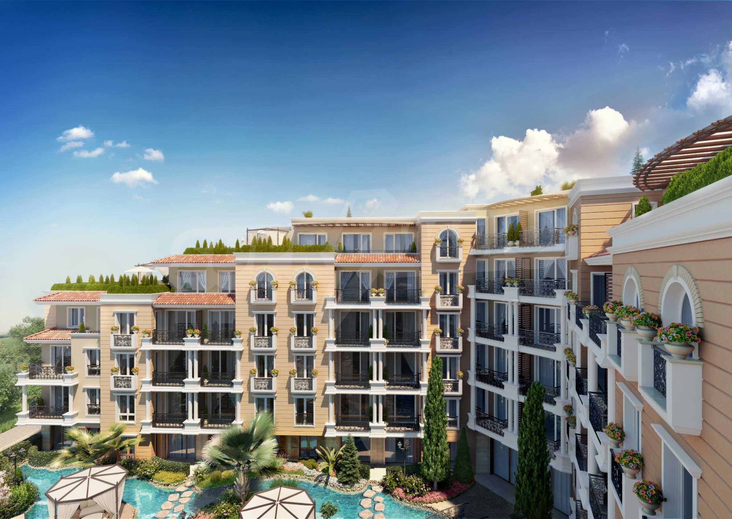 The project will stand out with stylish Mediterranean architecture combined with the latest technical innovations and contemporary materials: light and creamy shades on the fa?ade, natural stone in decoration, elegant facade lighting, suited color combination for better reflection of the sun's rays. The upper levels of the flat roof of the building will feature spacious terraces with beautiful landscaping and landscapes.