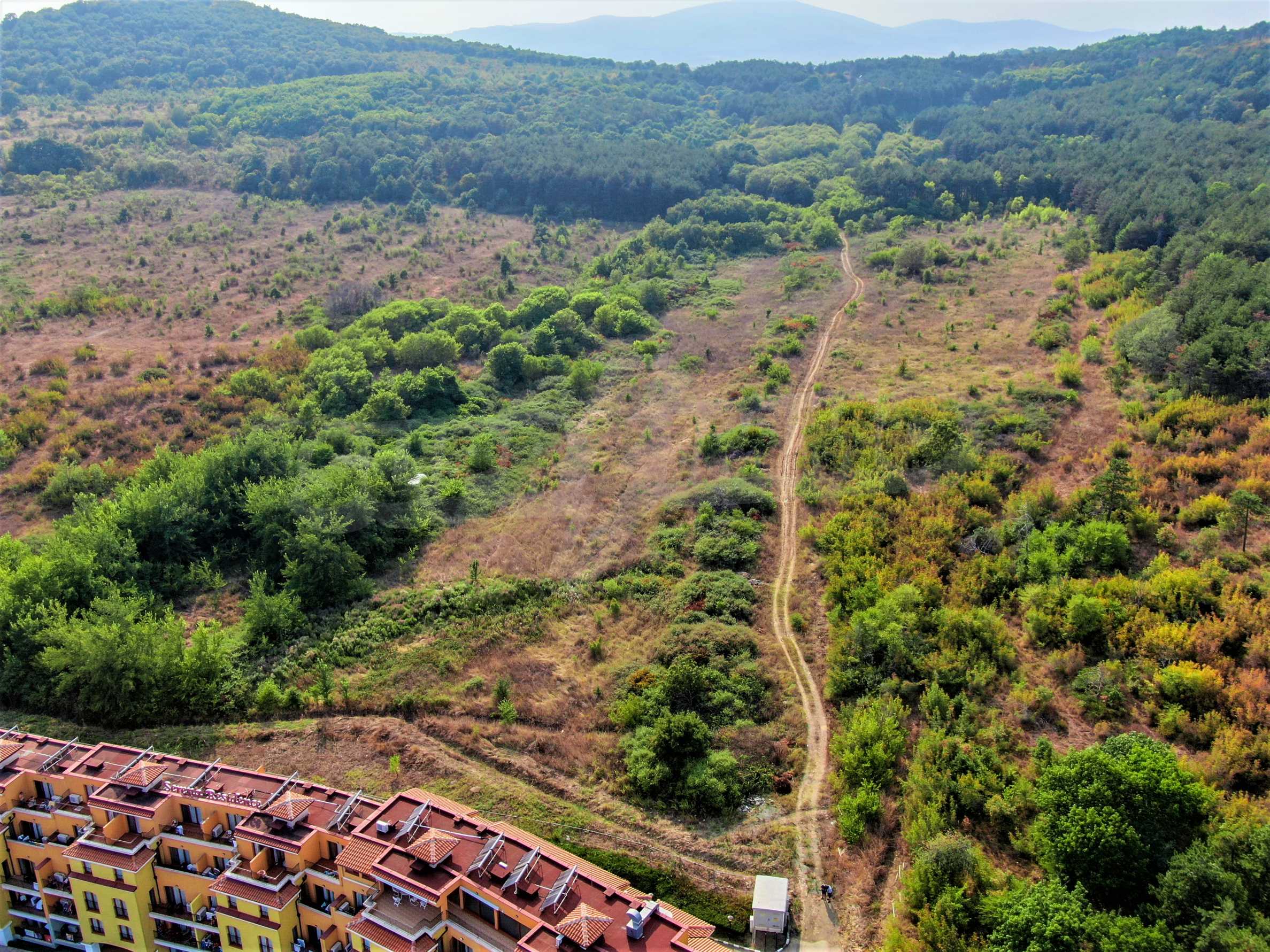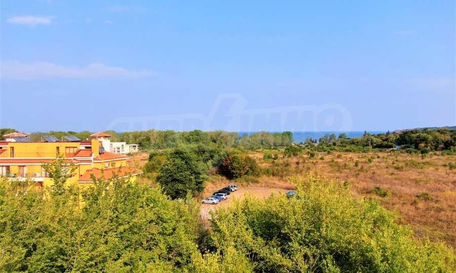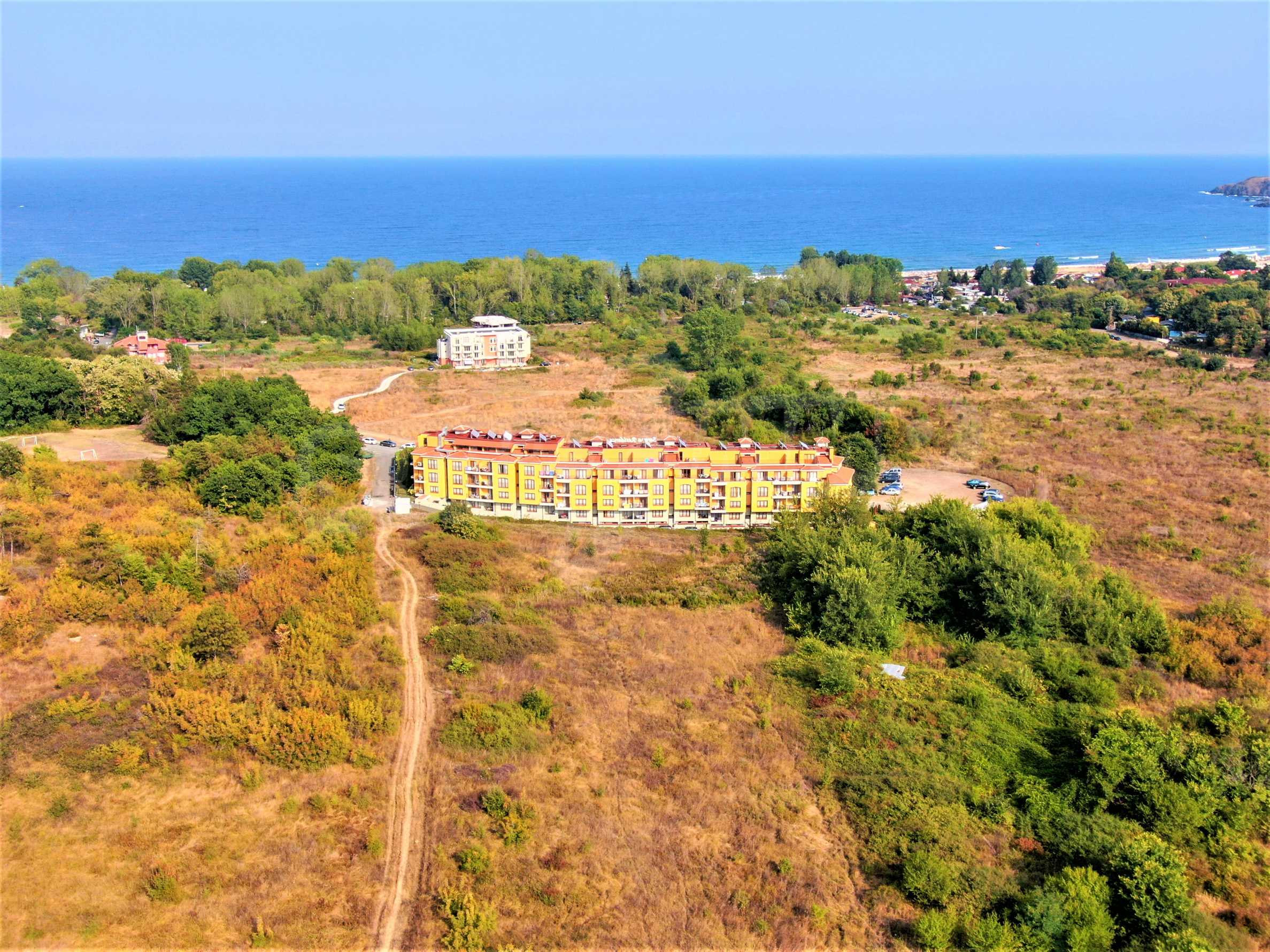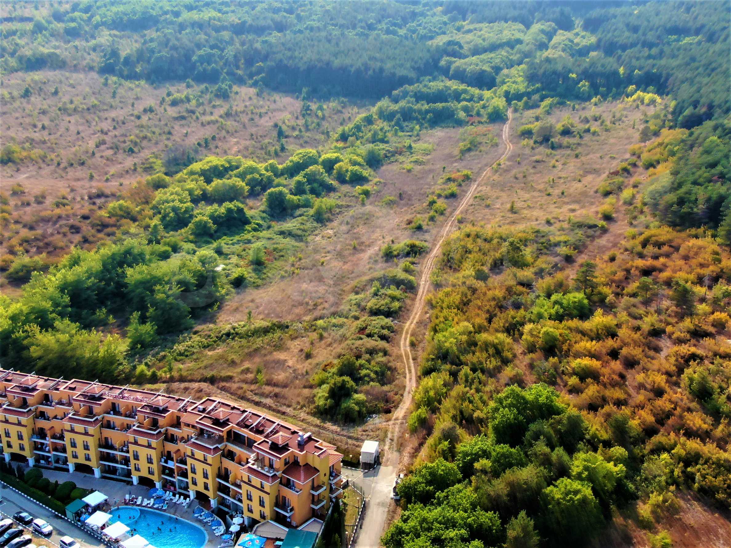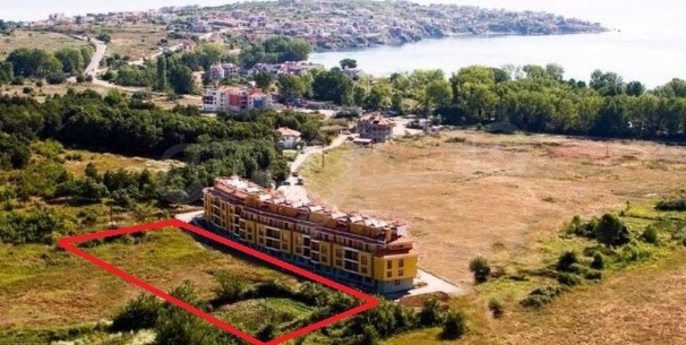 The offered plot is bordered by an asphalt road and a neighboring holiday complex of apartments.