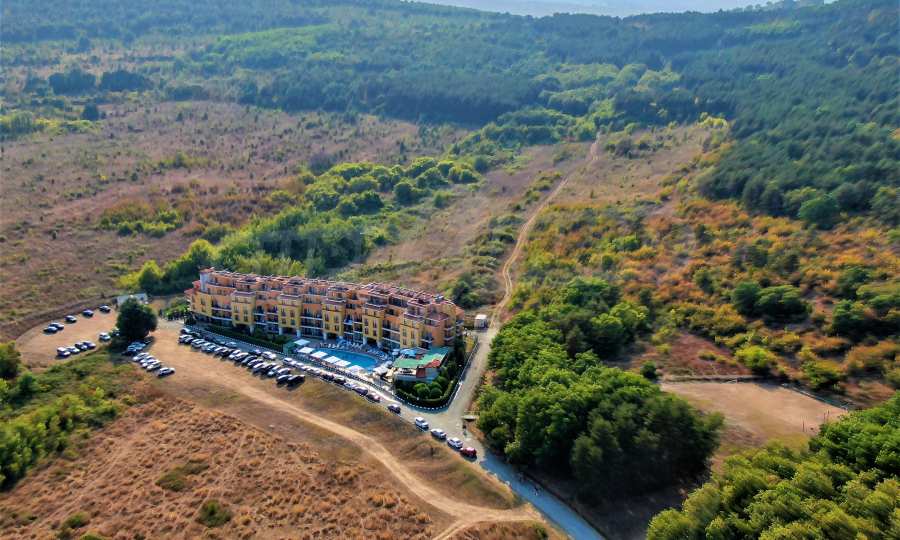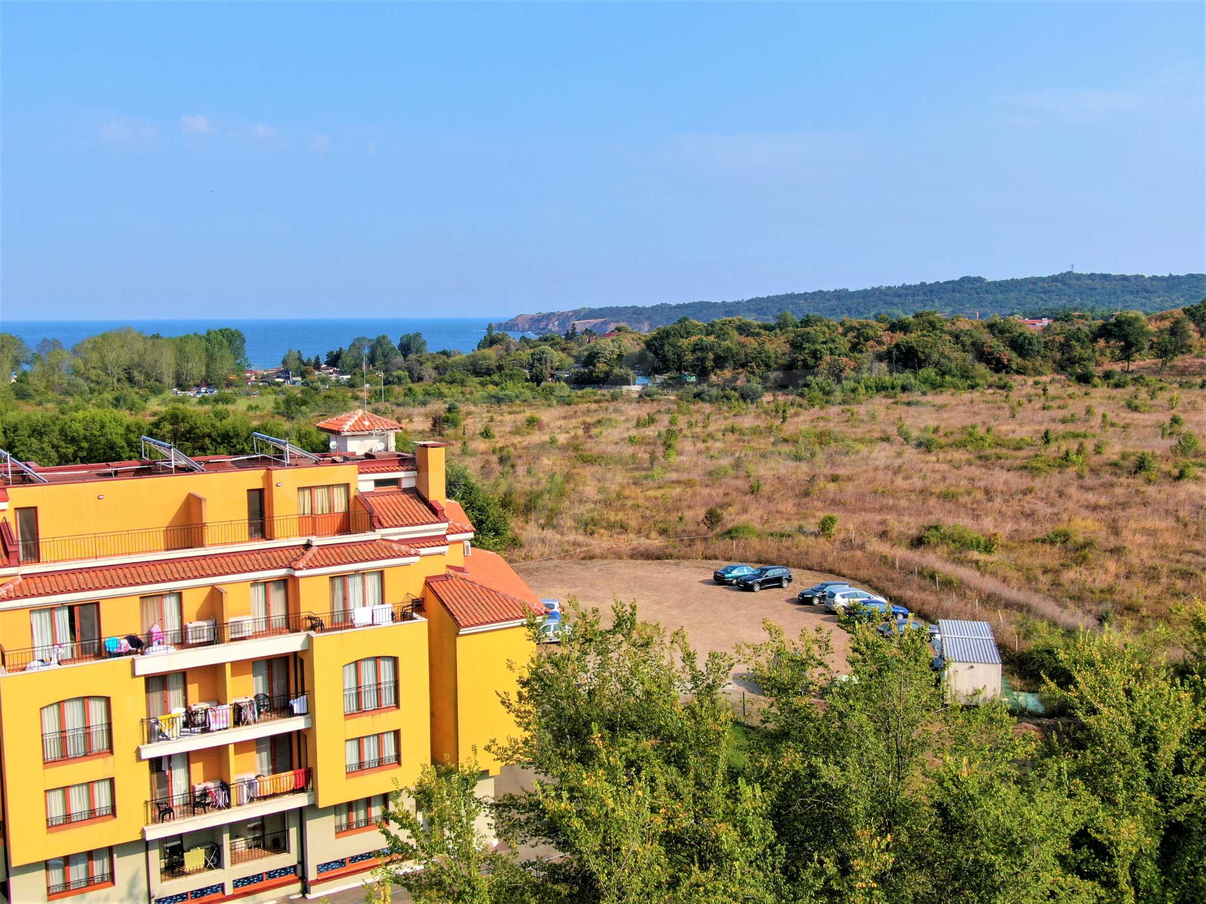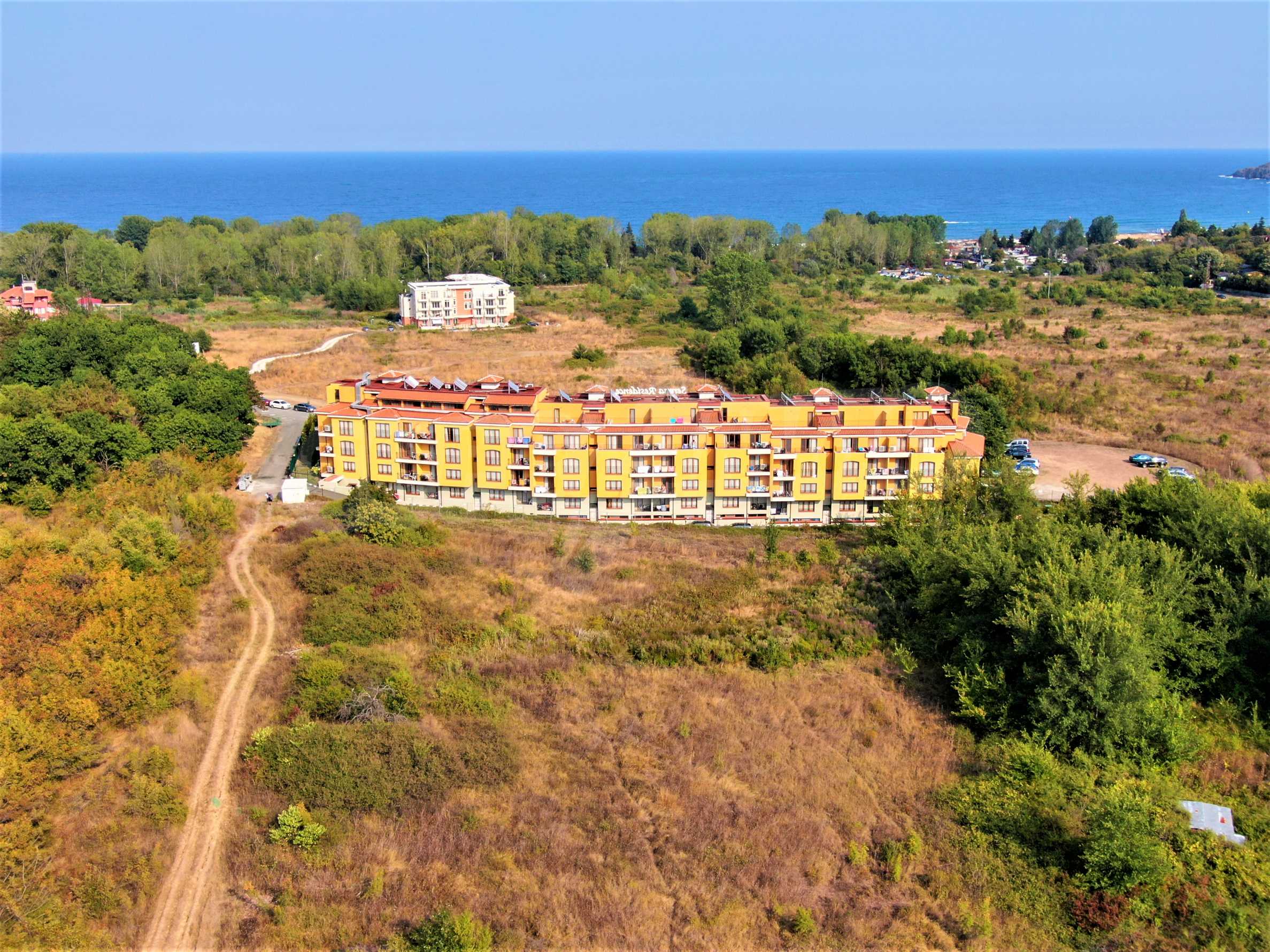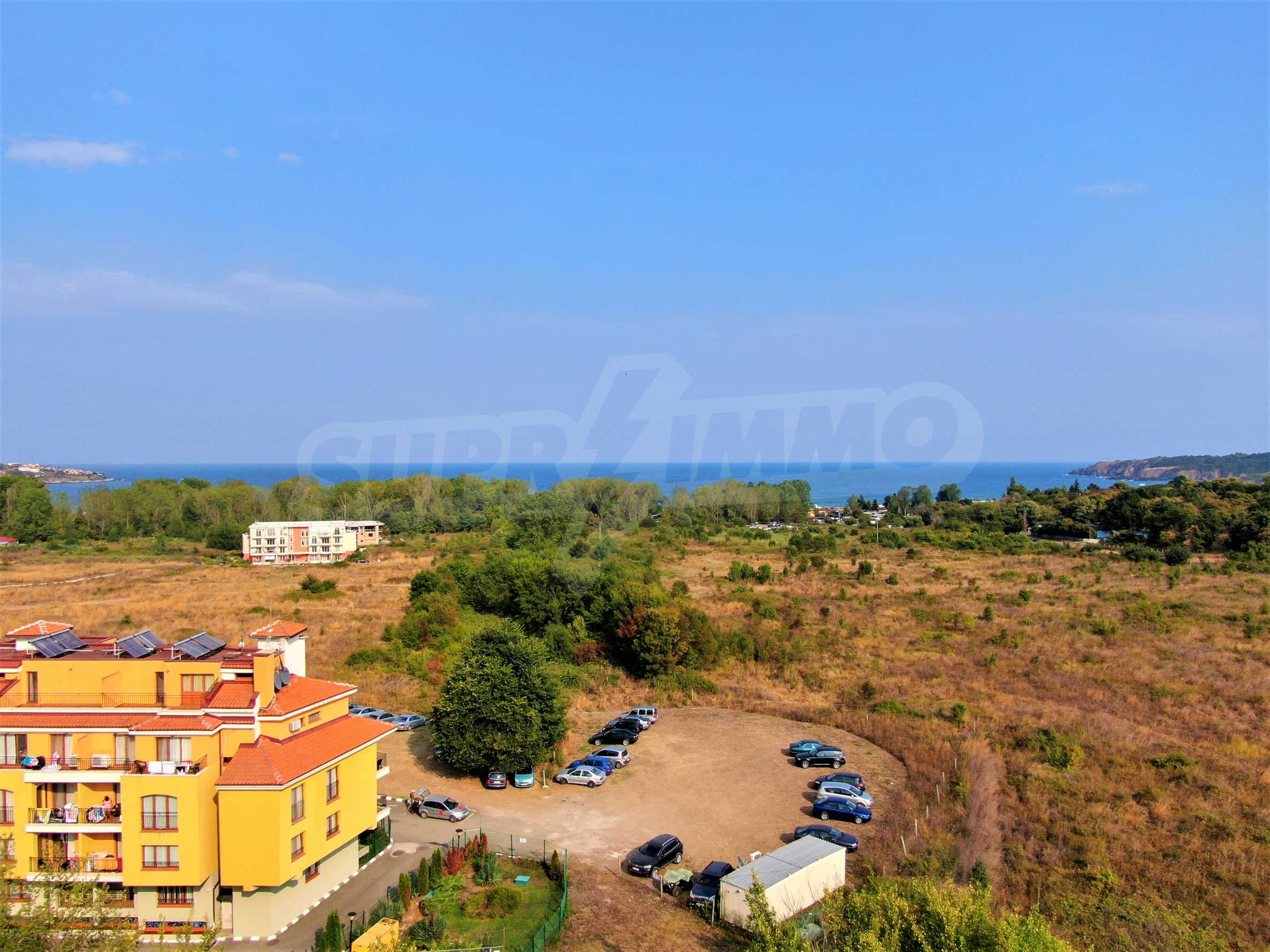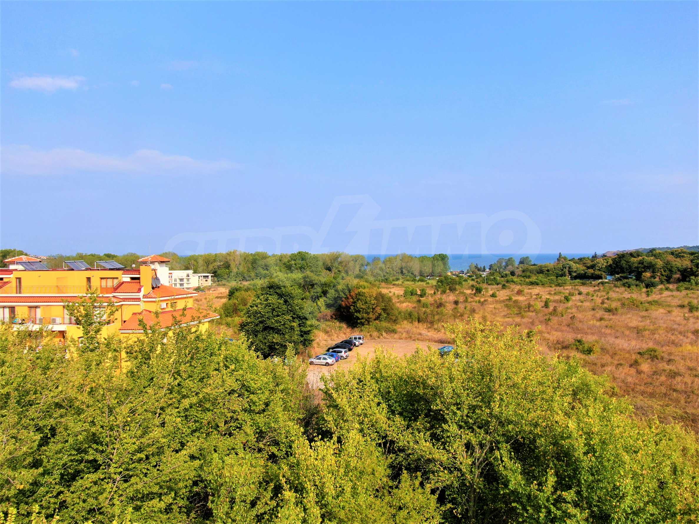 The offered plot is bordered by an asphalt road and a neighboring holiday complex of apartments.