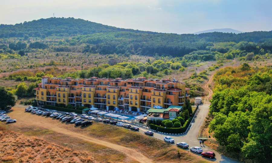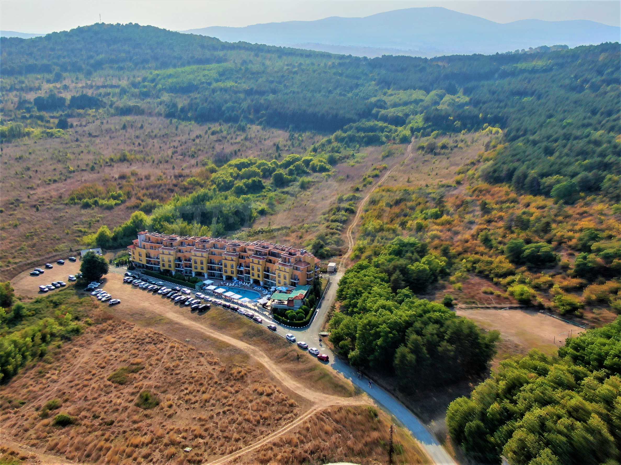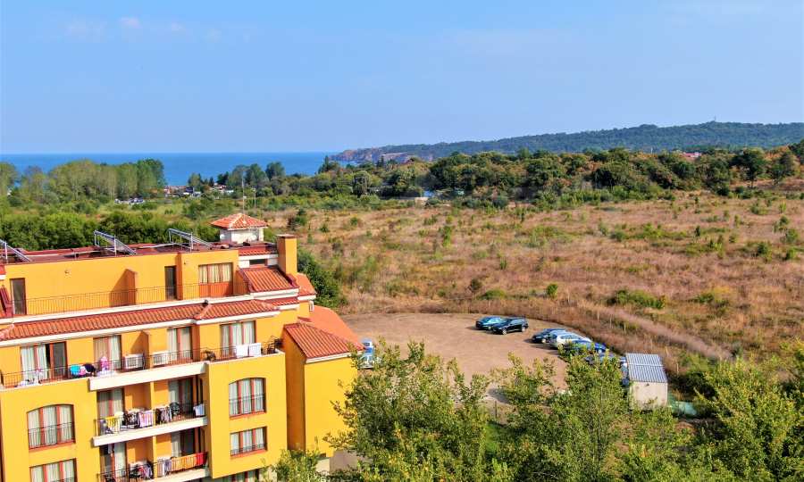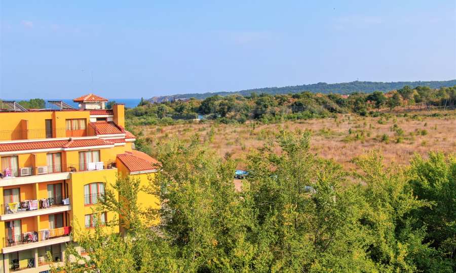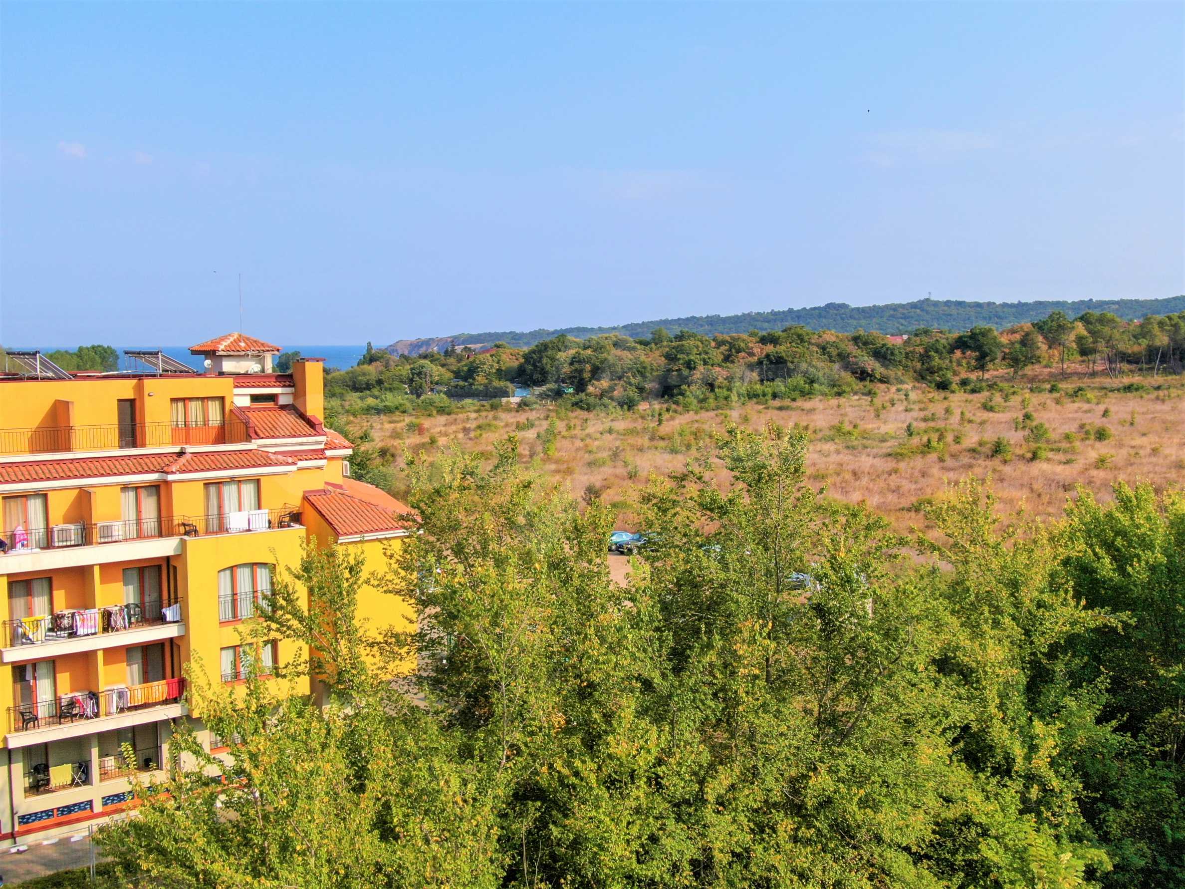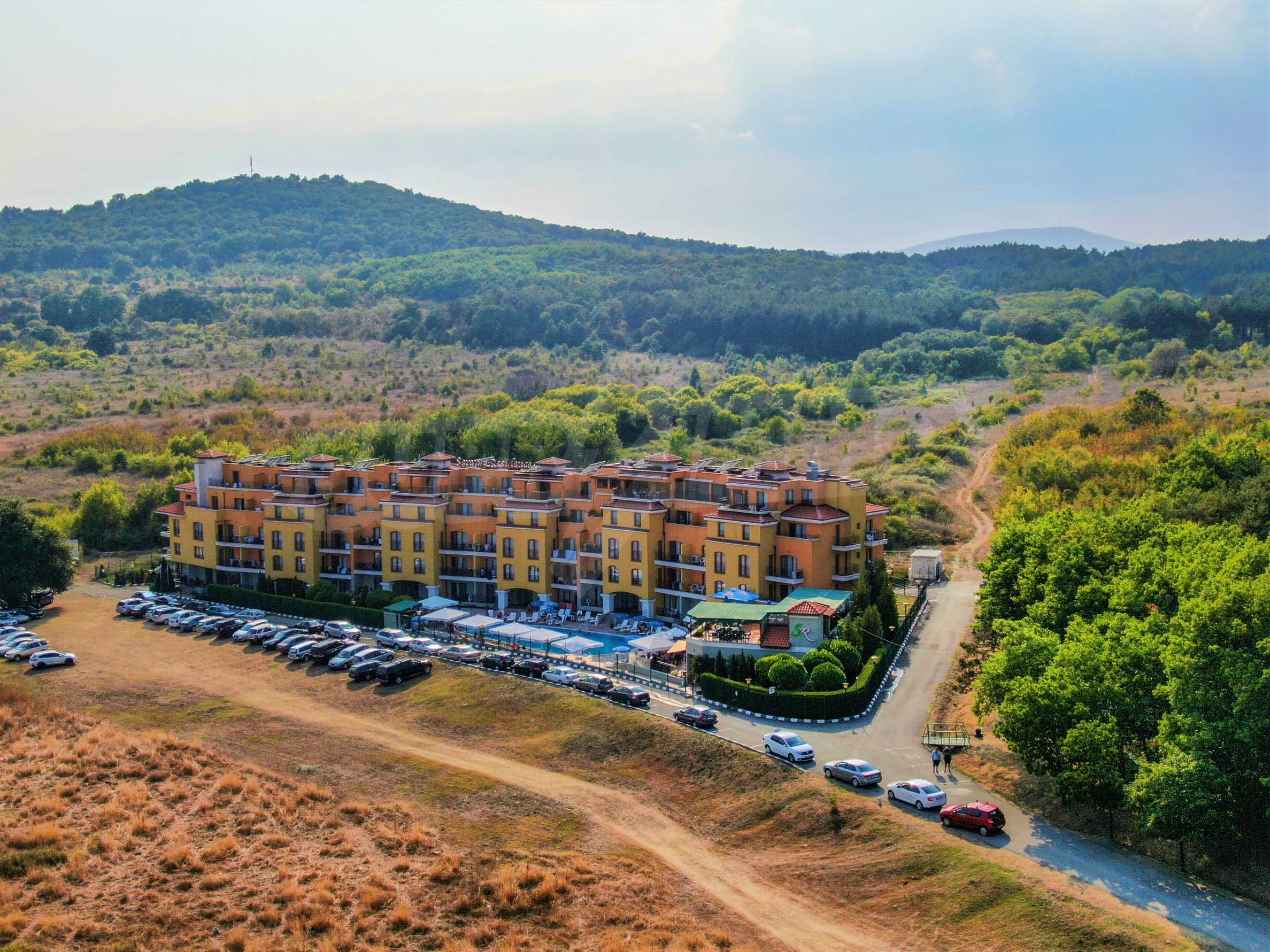 The offered plot is bordered by an asphalt road and a neighboring holiday complex of apartments.