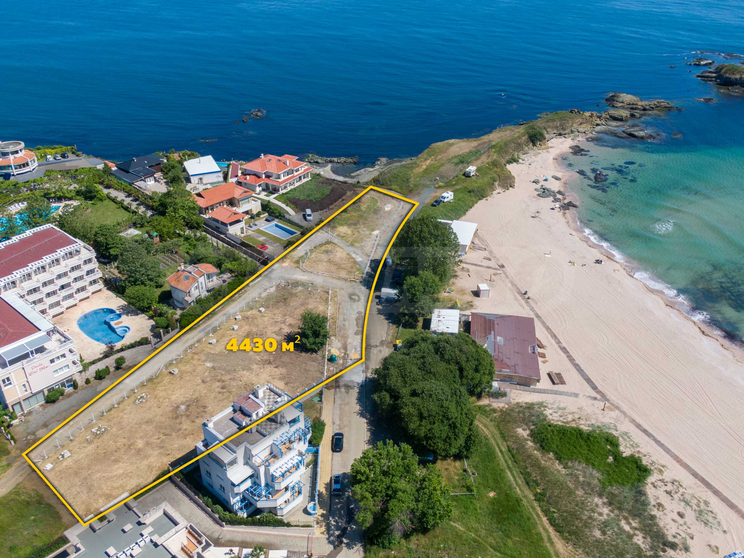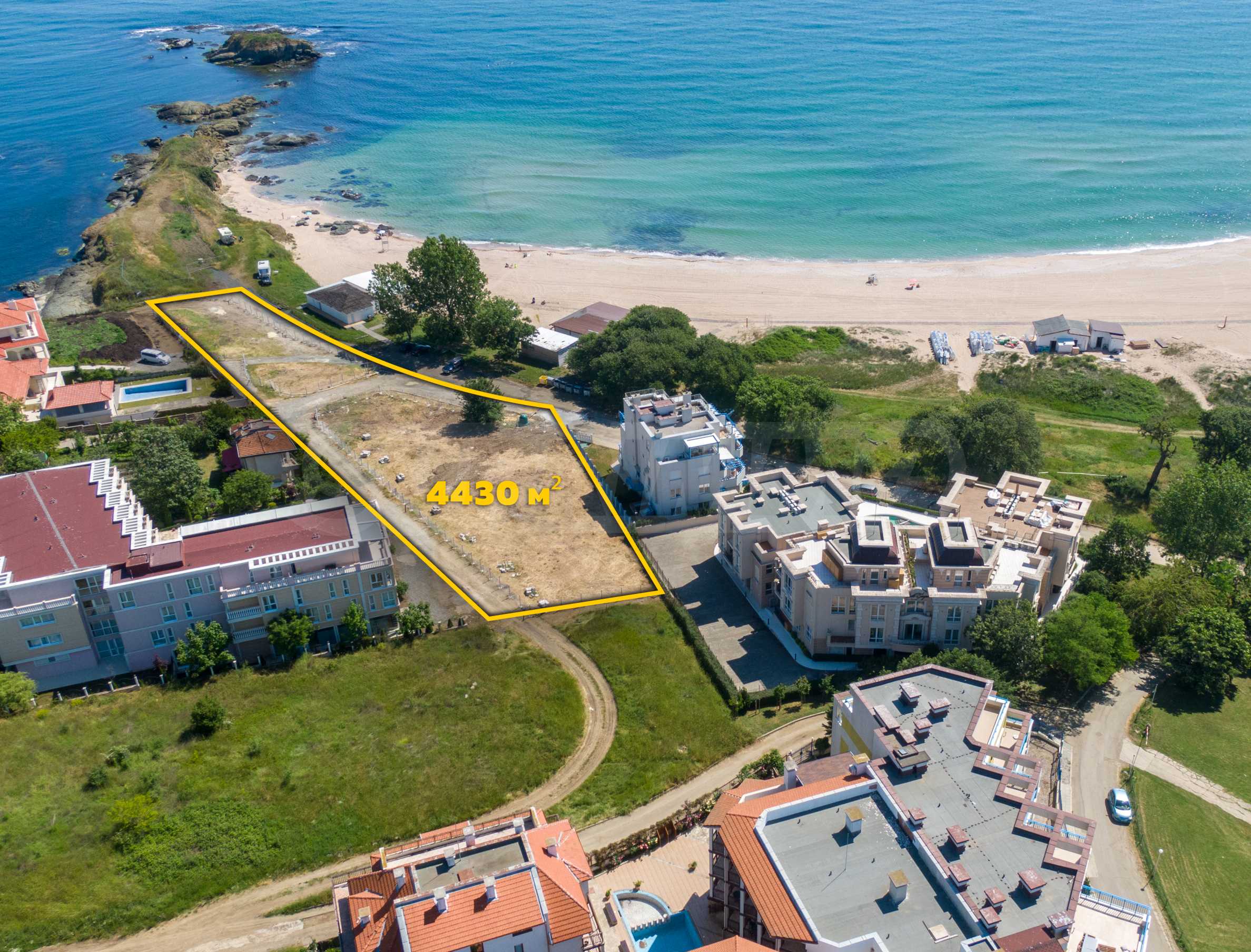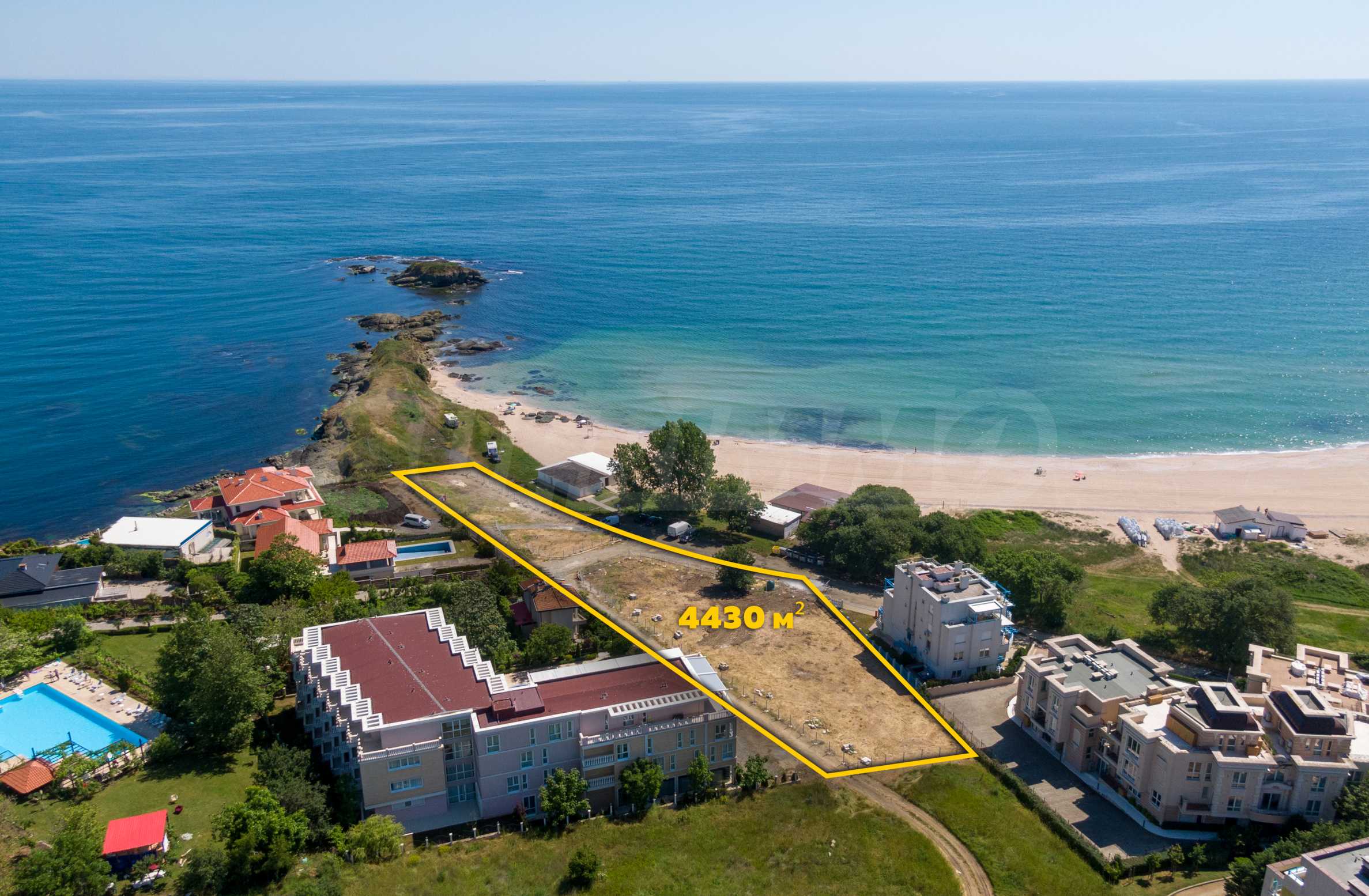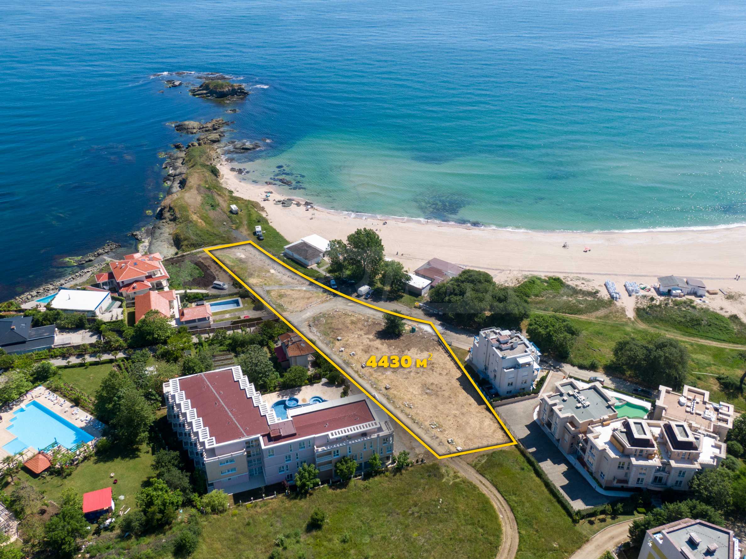 The plot has an area of 4431 sq.m. and occupies a strip with frontage on the beachfront, with a length of about 70 meters, with the last 1/3 of the plot passing on the second line behind the existing residential building. The property has frontal sea views over the beautiful bay of Lozenets and the picturesque rocky Ambelits Cape.