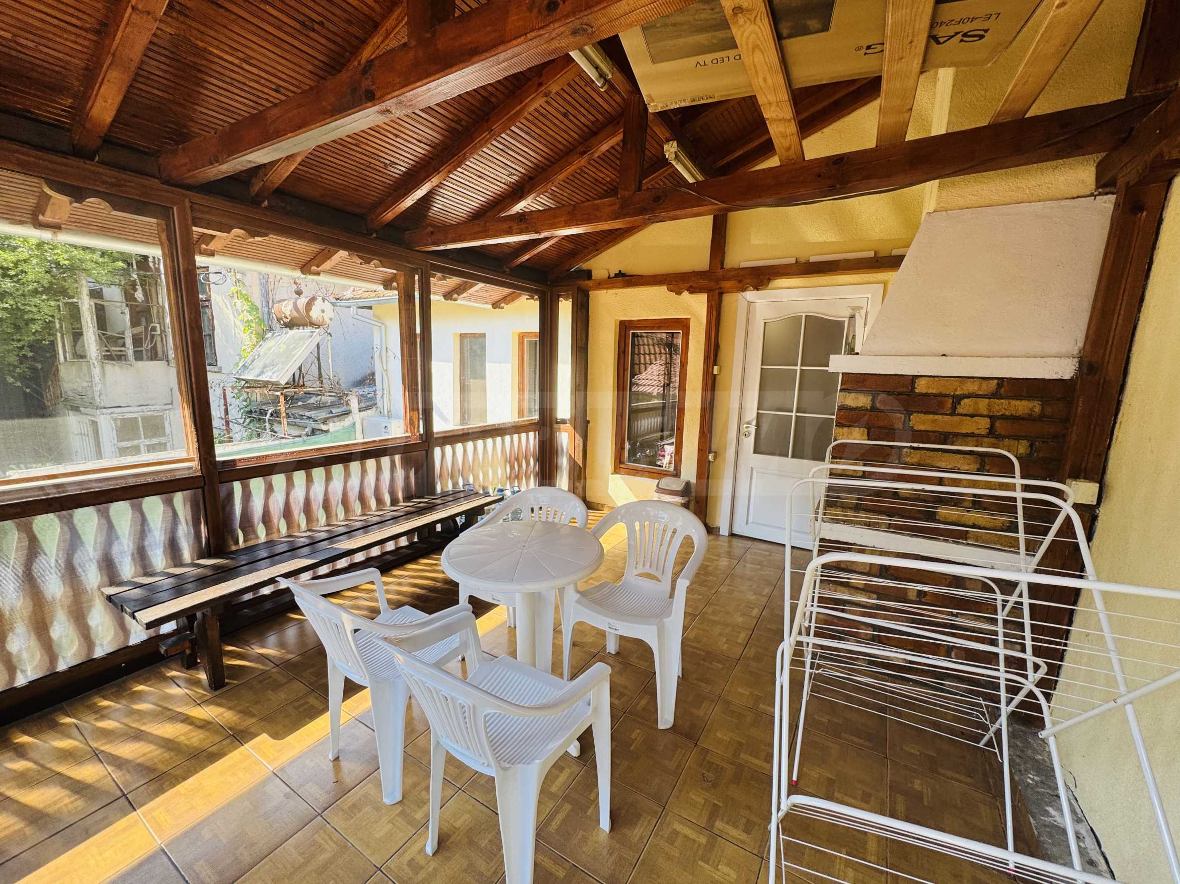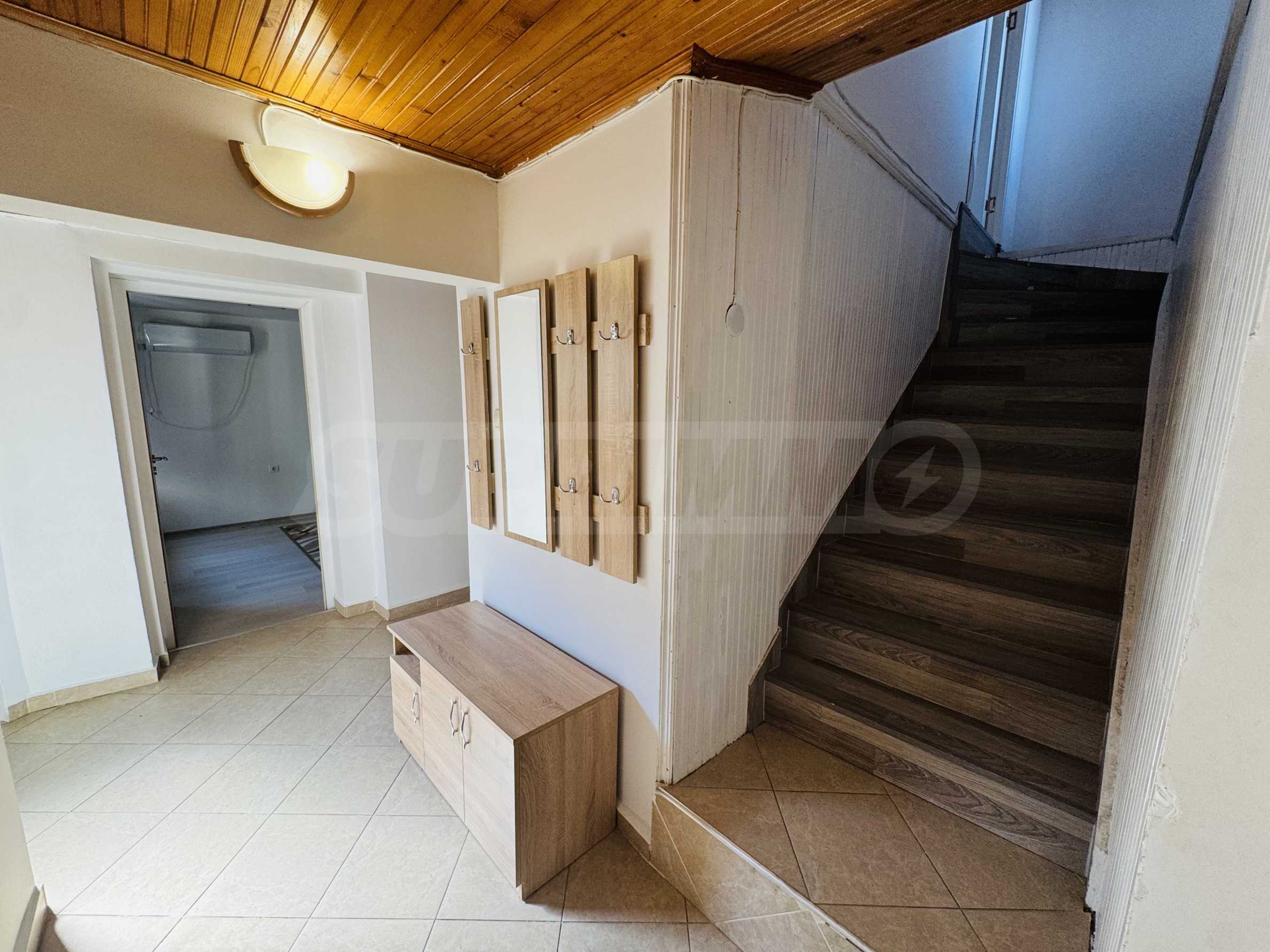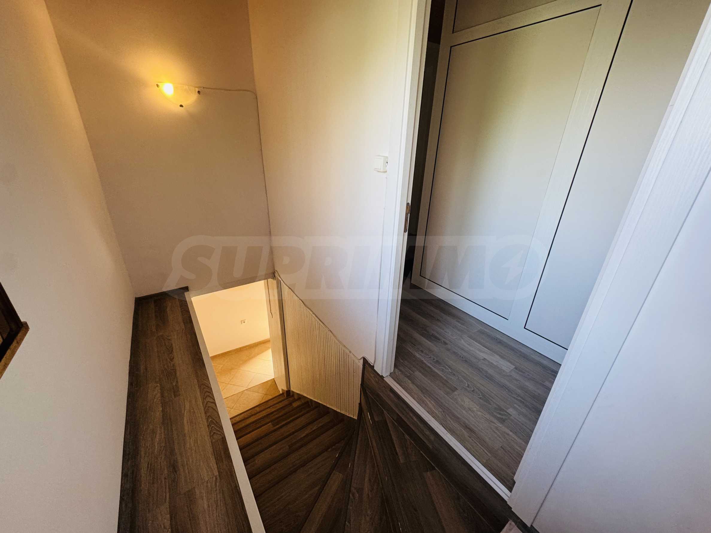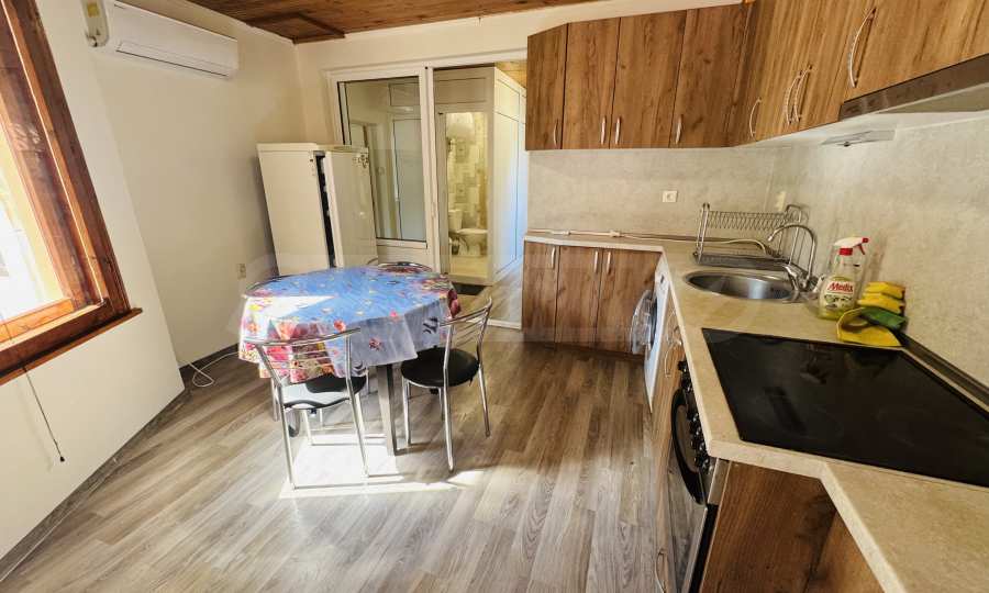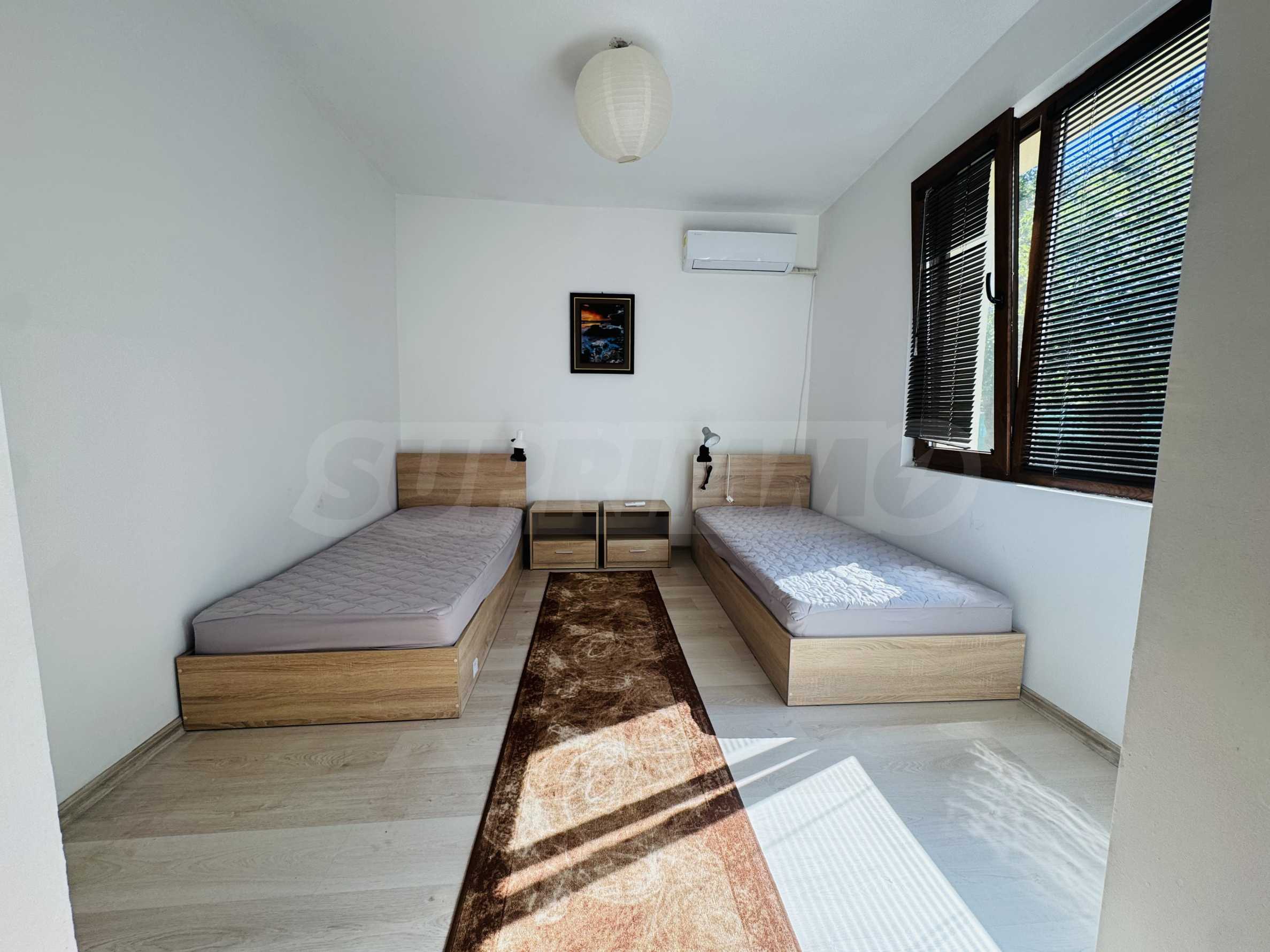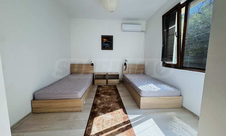 The property has a total area of 124 square meters with a total yard of 62 square meters, which has a common outdoor fountain for use. The first floor has two bedrooms - each fully furnished and with air conditioning, bathroom and toilet, and a separate storage room. On the second floor there is an entrance hall, bathroom with toilet, one large bedroom with three single beds, also fully furnished and air-conditioned, kitchen with living room, equipped with stove and screen, refrigerator with freezer, microwave, TV and washing machine. All electrical appliances are brand new, as are all the furnitures in the property. The house has a large and very sunny terrace with barbecue.