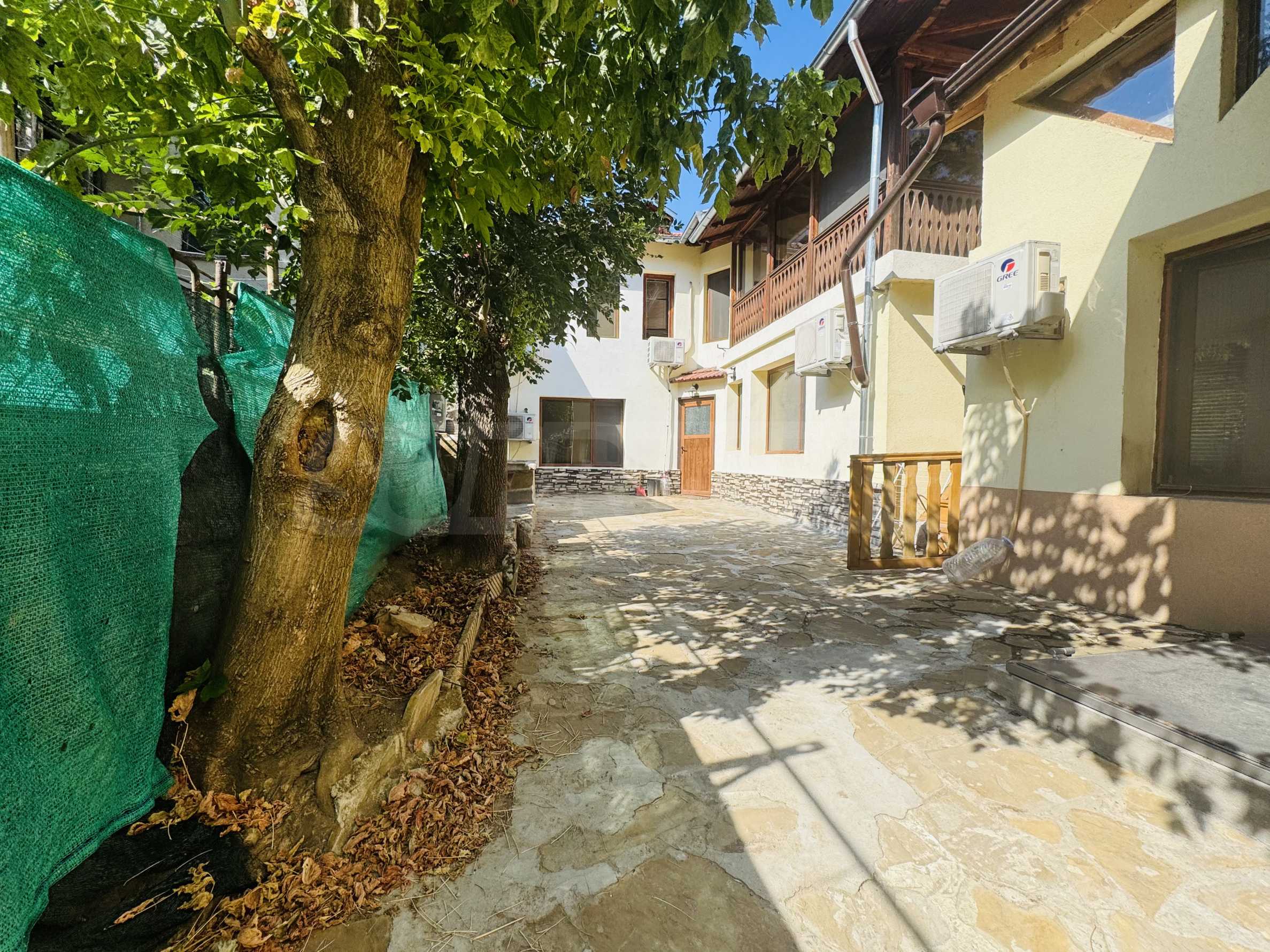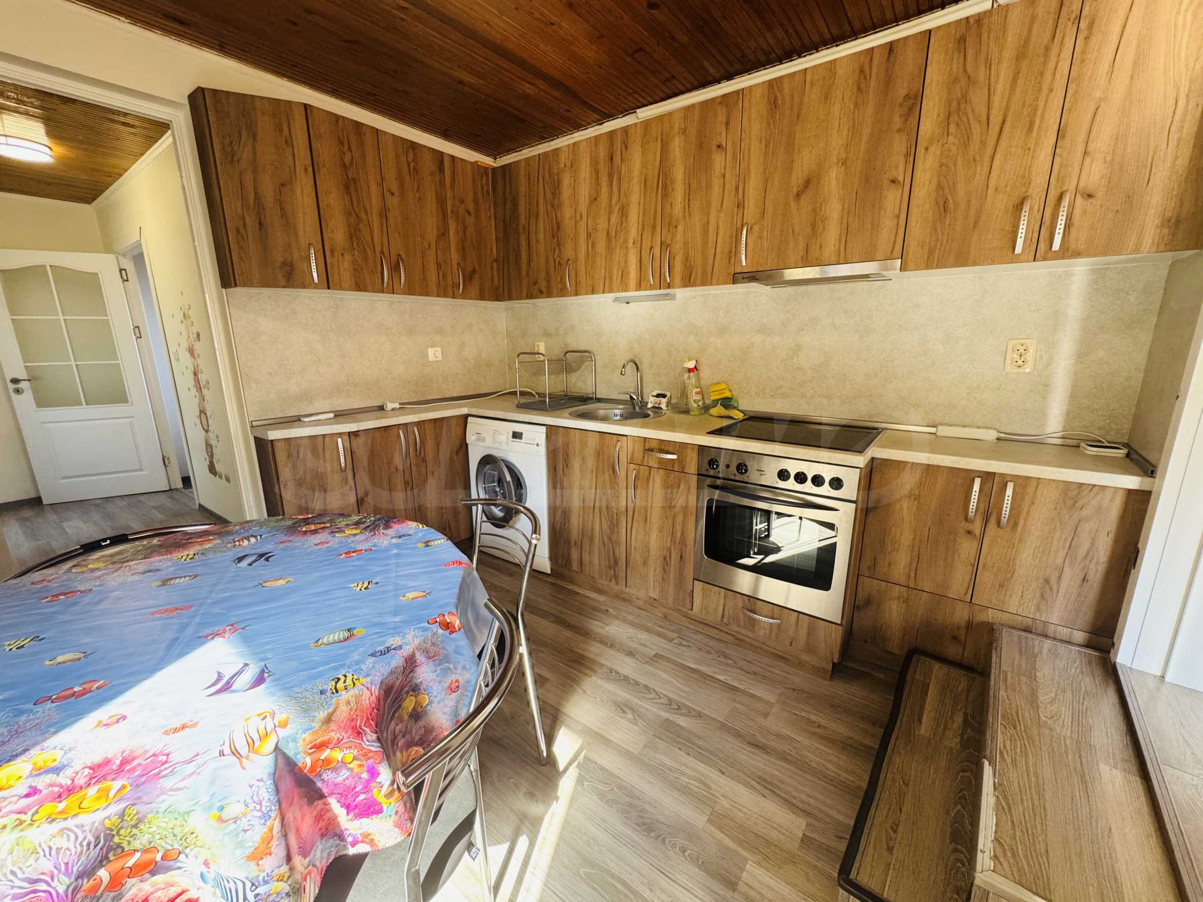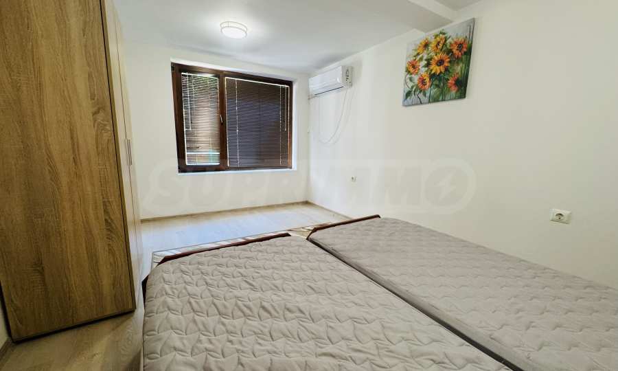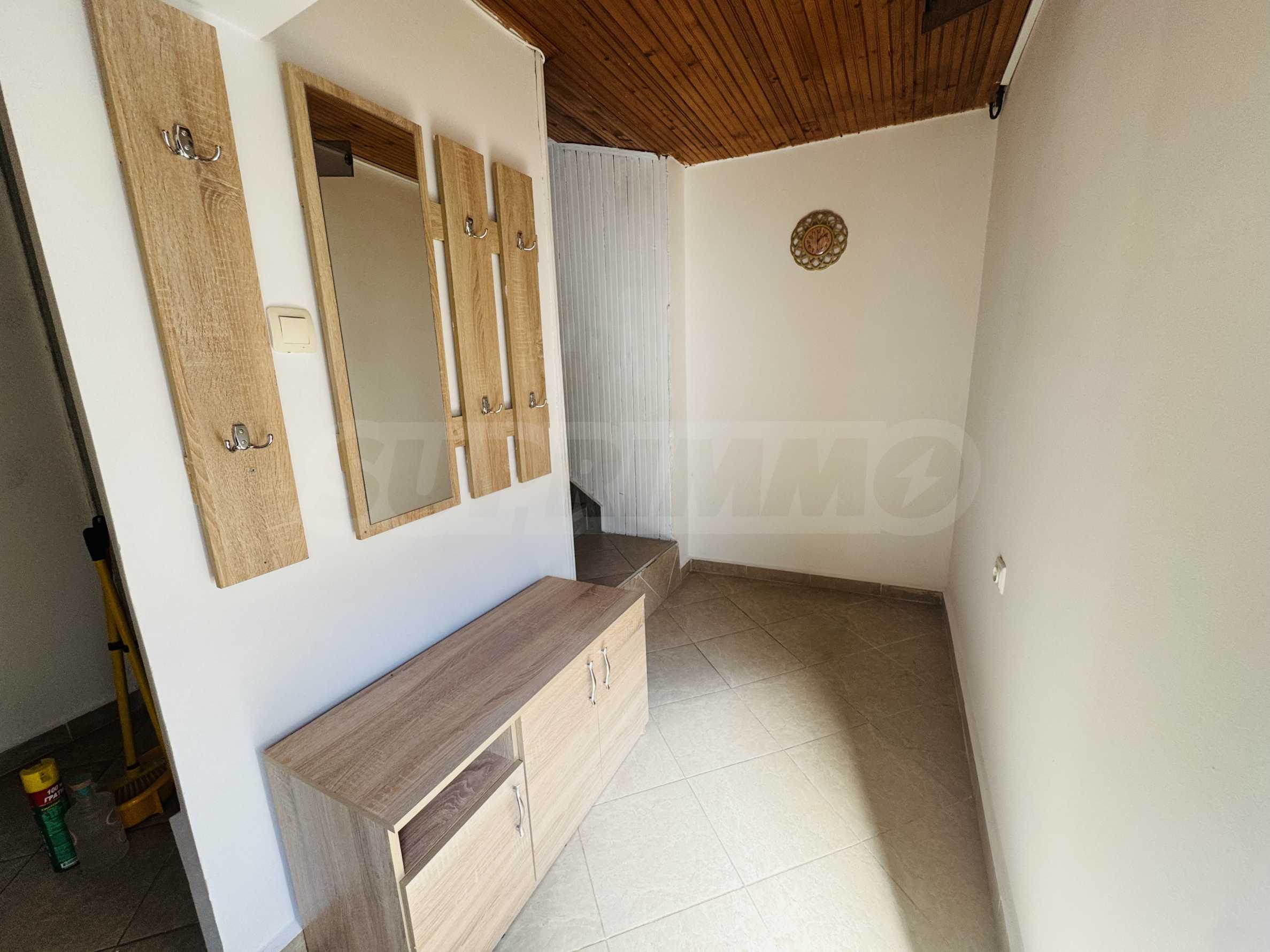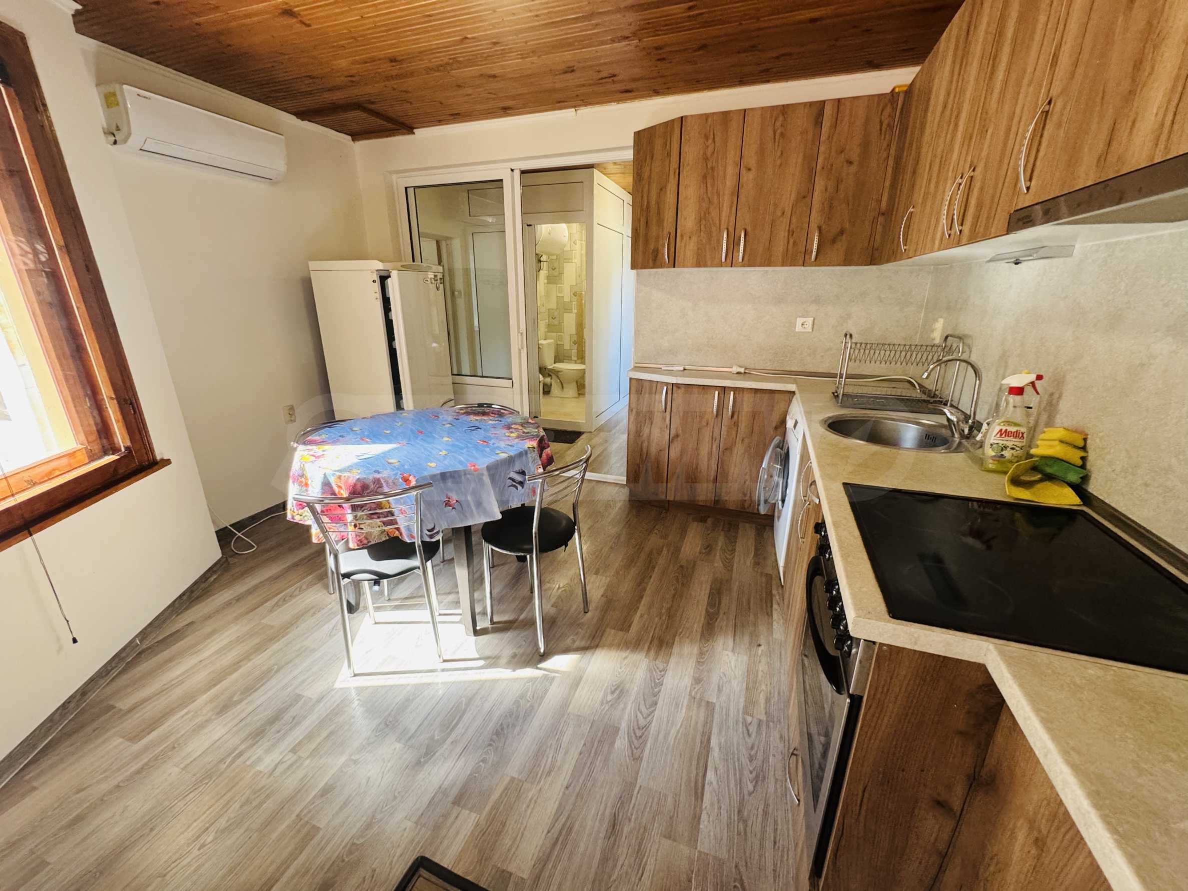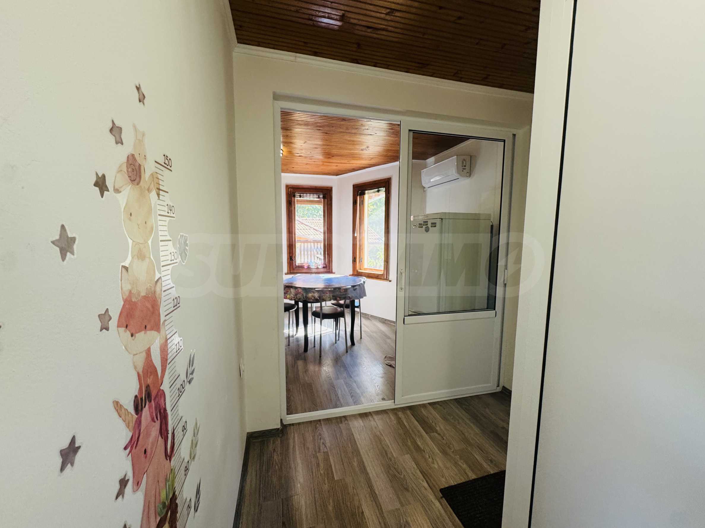 The property has a total area of 124 square meters with a total yard of 62 square meters, which has a common outdoor fountain for use. The first floor has two bedrooms - each fully furnished and with air conditioning, bathroom and toilet, and a separate storage room. On the second floor there is an entrance hall, bathroom with toilet, one large bedroom with three single beds, also fully furnished and air-conditioned, kitchen with living room, equipped with stove and screen, refrigerator with freezer, microwave, TV and washing machine. All electrical appliances are brand new, as are all the furnitures in the property. The house has a large and very sunny terrace with barbecue.