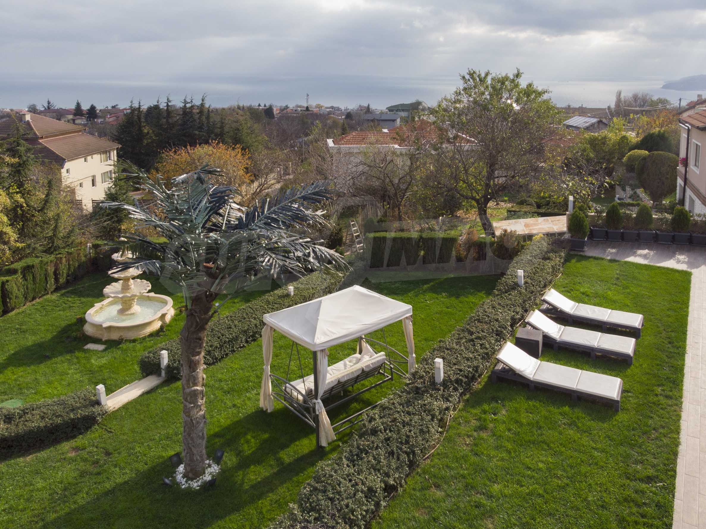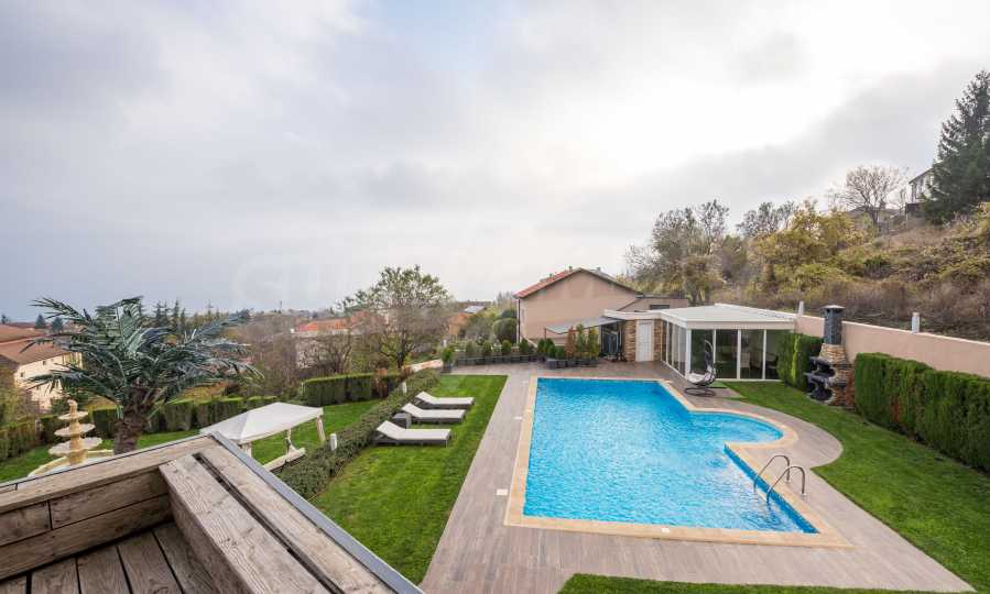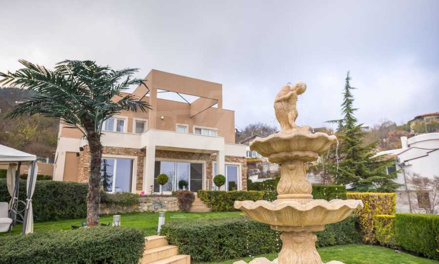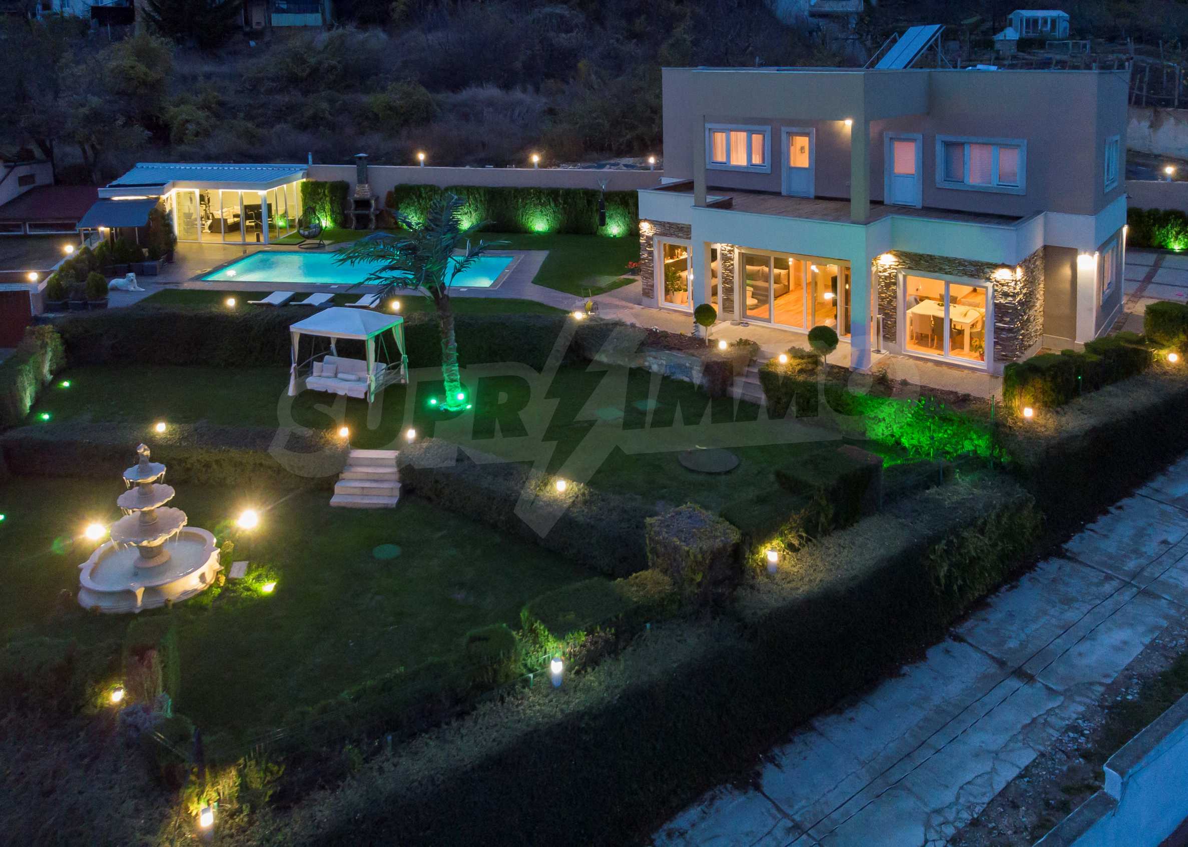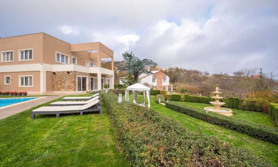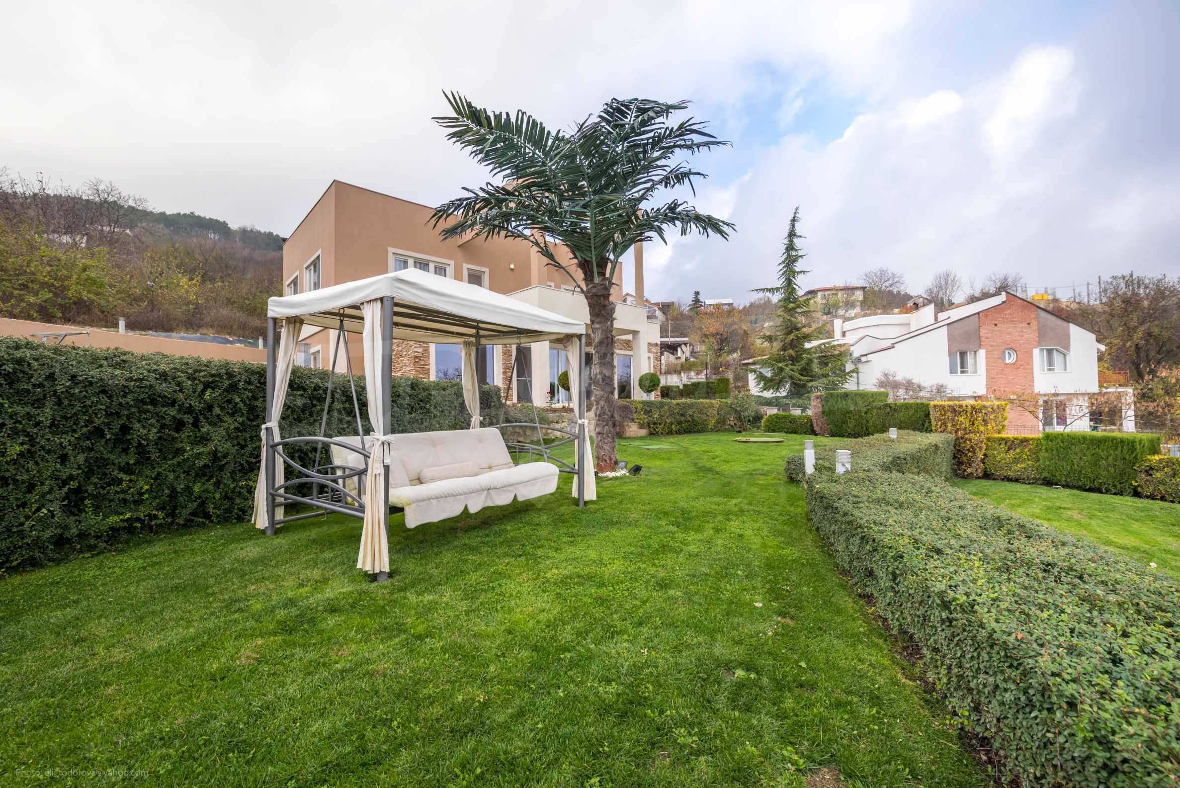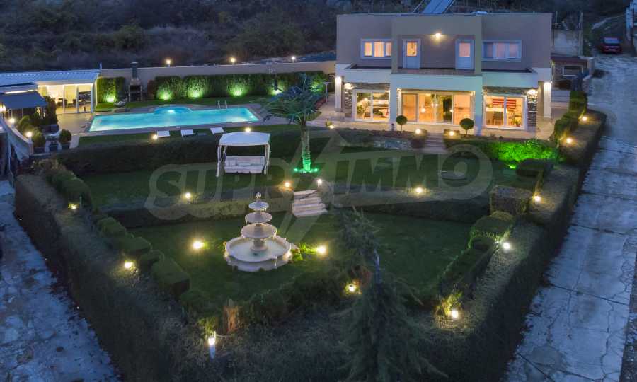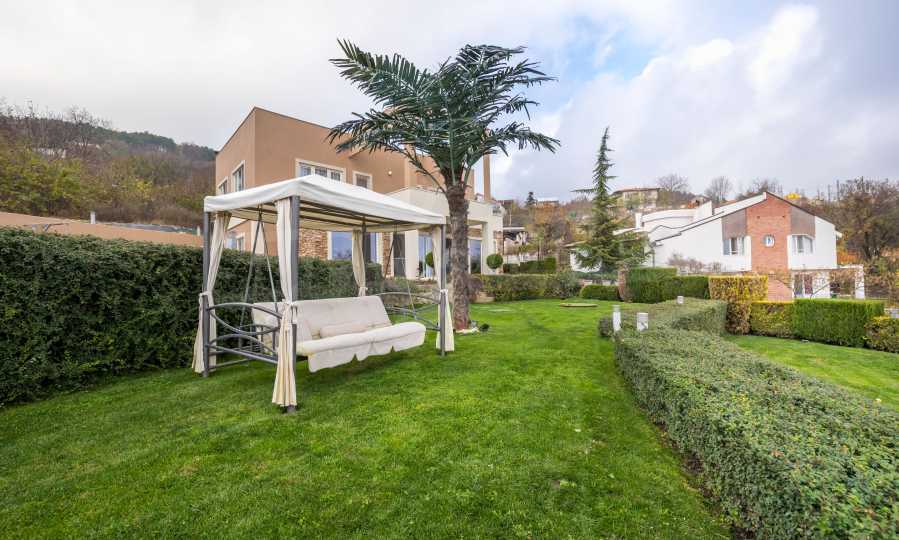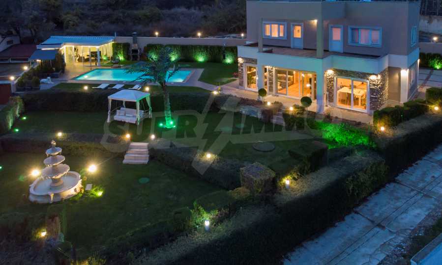 In the yard of the property on several levels are separate areas with a swimming pool with Jacuzzi / 80 cubic meters /, indoor summer kitchen, children's playground, fountain, sports area and parking with four parking spaces. Apart from the street access, there is a closed garage with an area of 120 square meters, which can accommodate six cars. For the convenience of the occupants and guests of the house, there is an outdoor bathroom with toilet and an outside shower by the pool. Near the pool there are sun loungers with umbrellas, as well as a sound central wireless system. The whole property is surrounded by a solid fence, stylishly designed garden and attractive lighting.