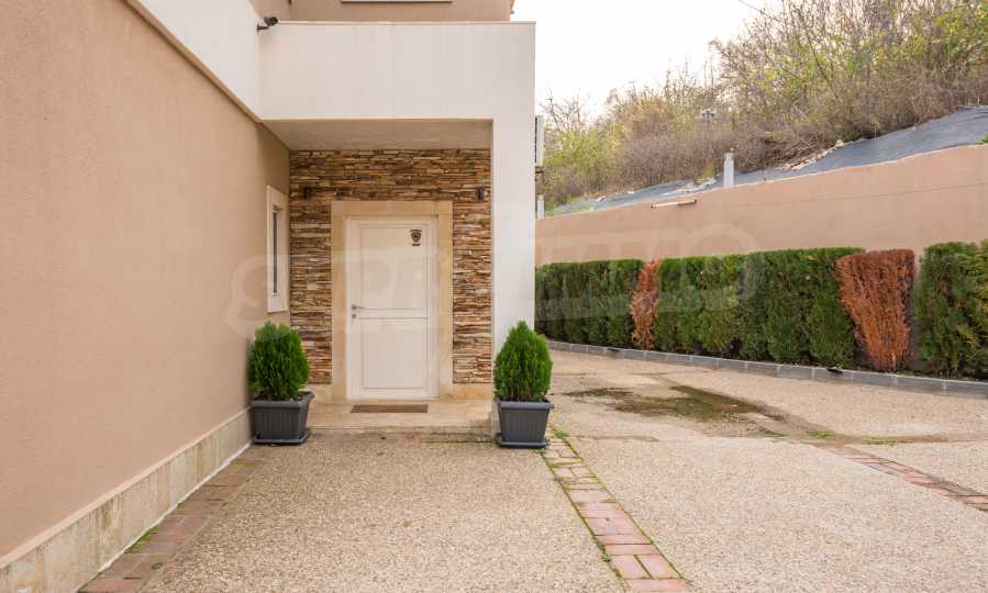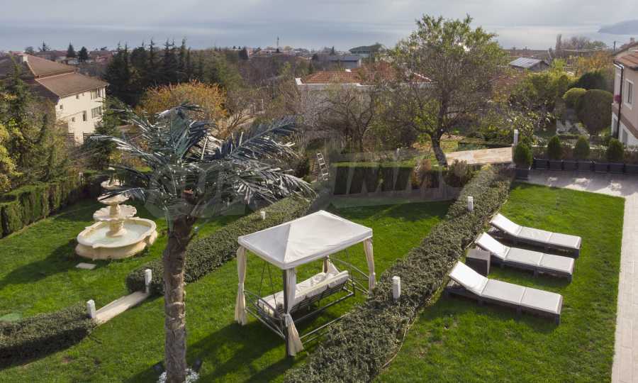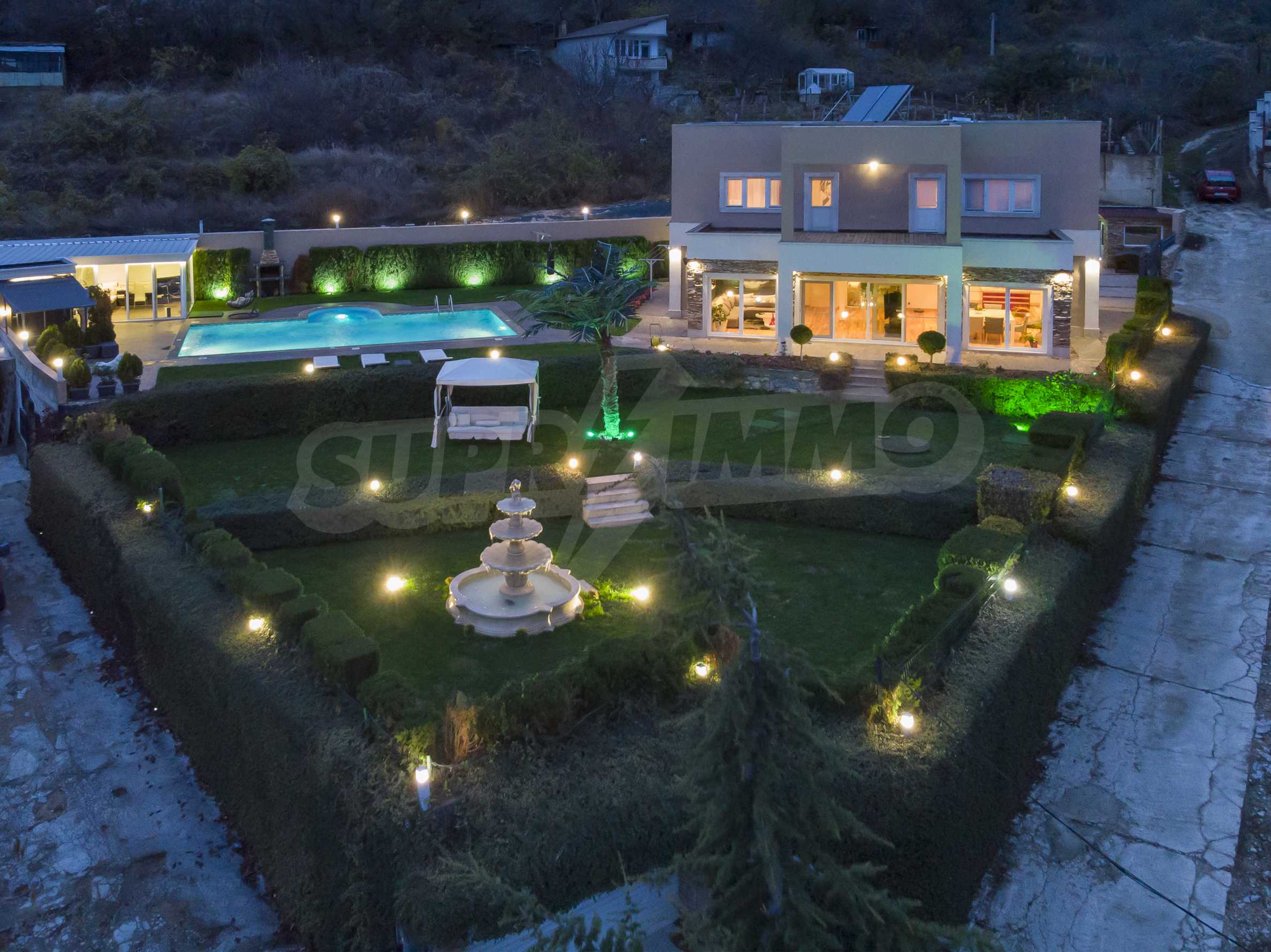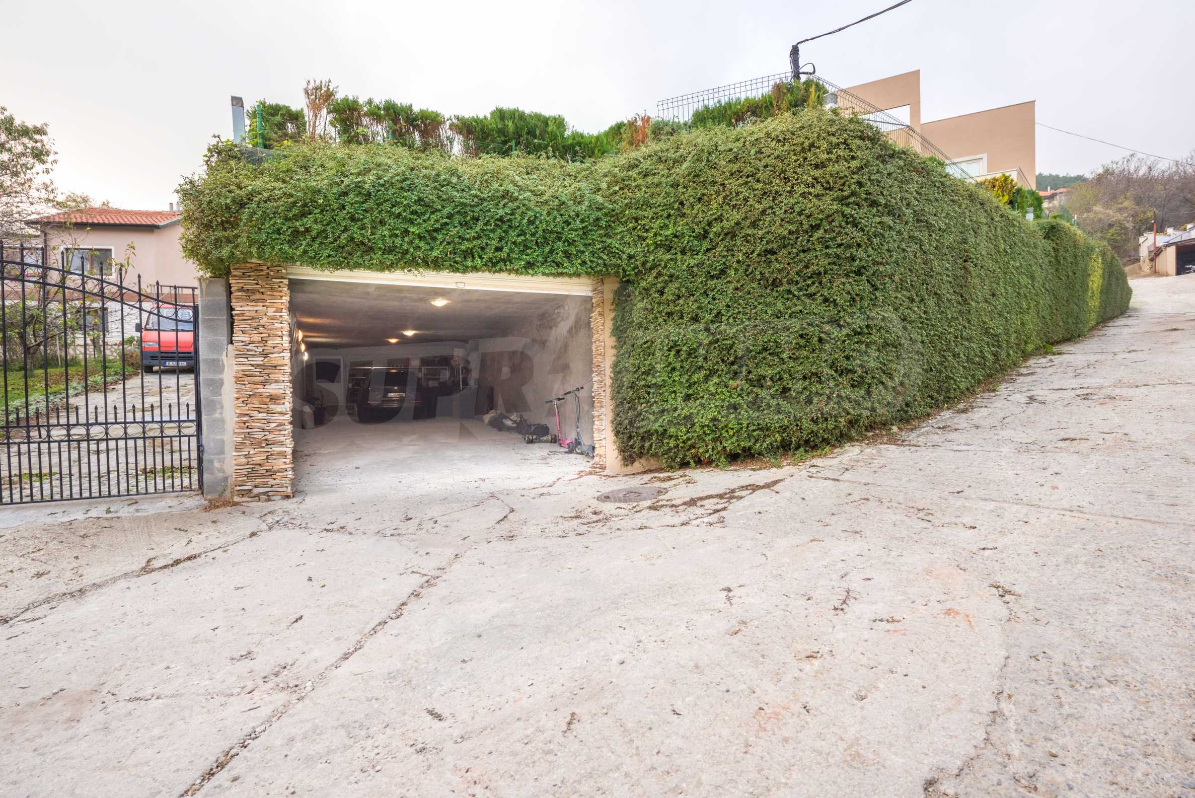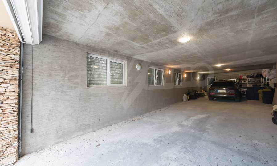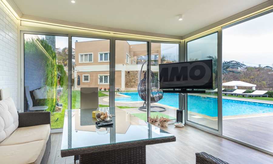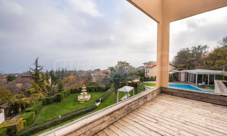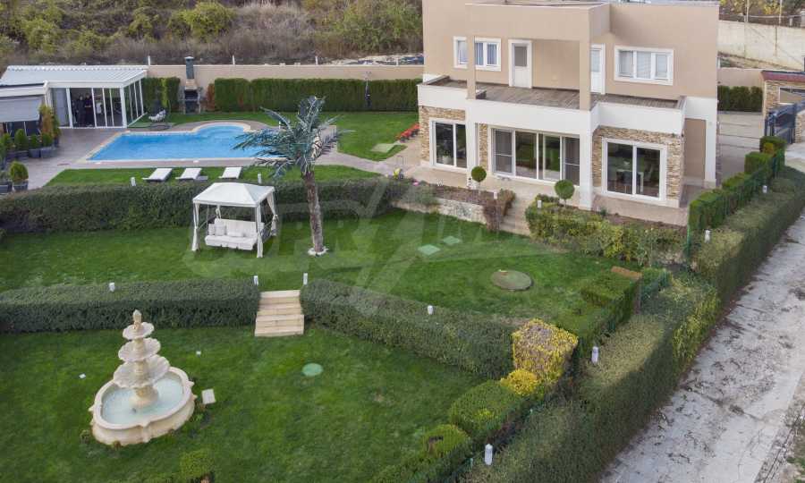 In the yard of the property on several levels are separate areas with a swimming pool with Jacuzzi / 80 cubic meters /, indoor summer kitchen, children's playground, fountain, sports area and parking with four parking spaces. Apart from the street access, there is a closed garage with an area of 120 square meters, which can accommodate six cars. For the convenience of the occupants and guests of the house, there is an outdoor bathroom with toilet and an outside shower by the pool. Near the pool there are sun loungers with umbrellas, as well as a sound central wireless system. The whole property is surrounded by a solid fence, stylishly designed garden and attractive lighting.
