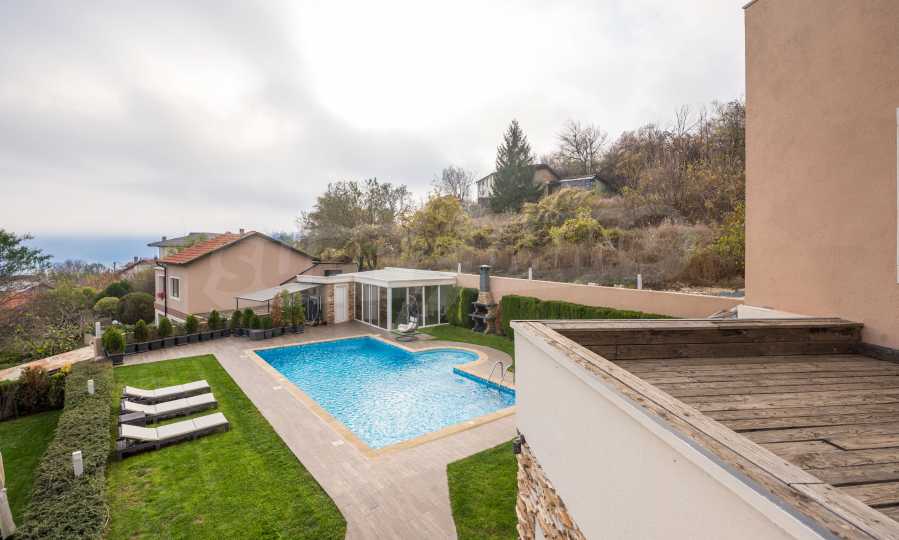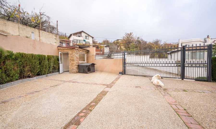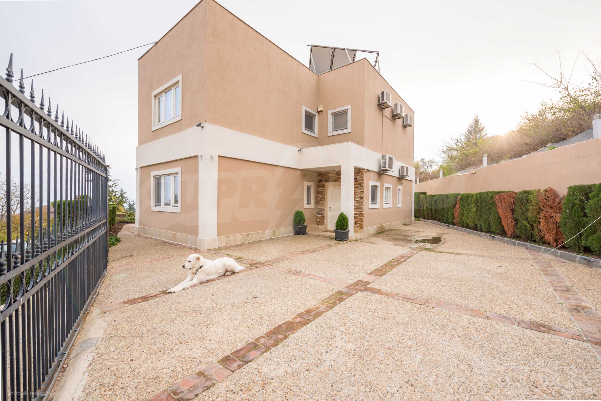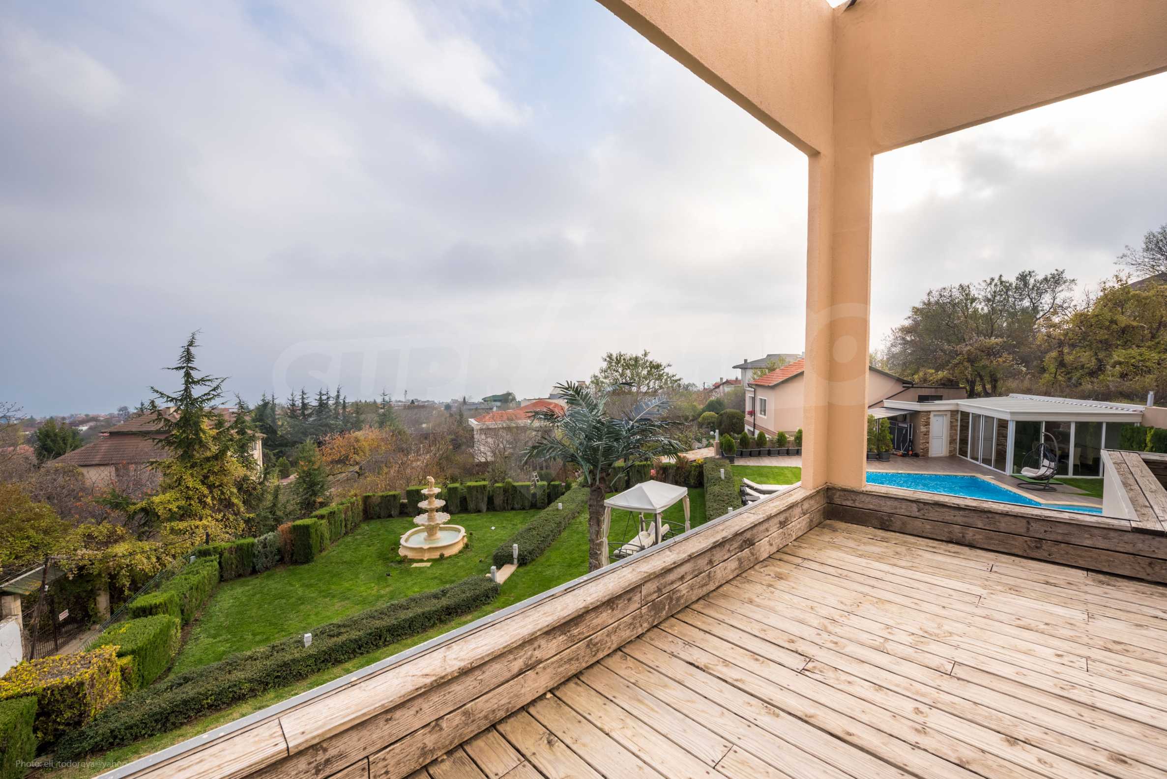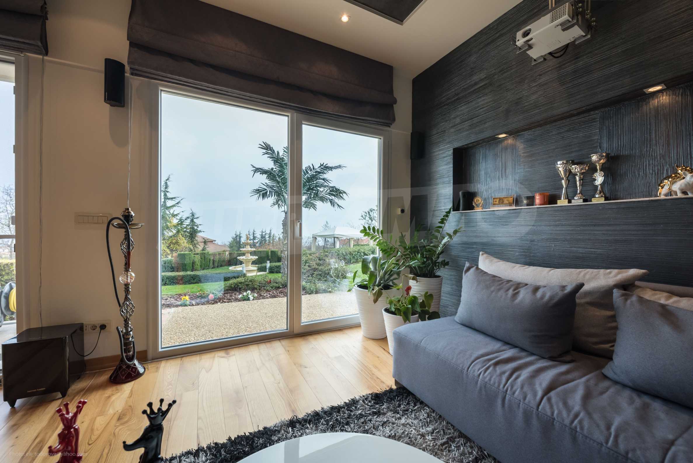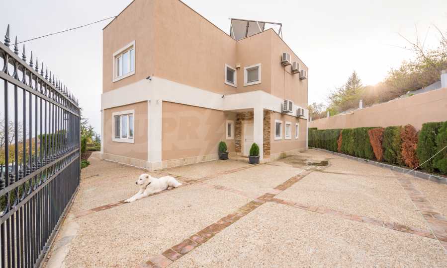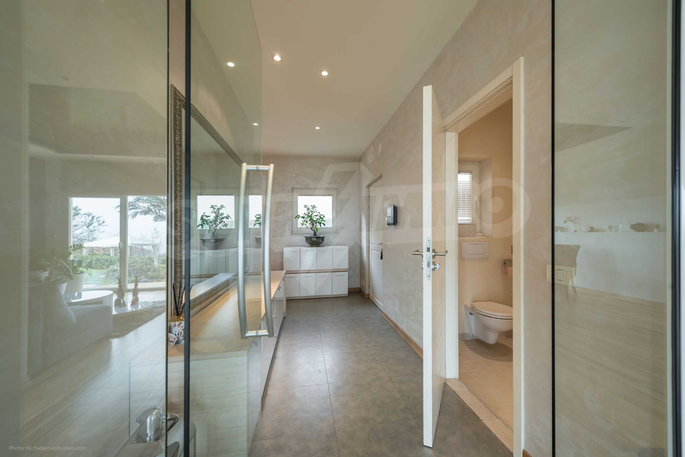In the yard of the property on several levels are separate areas with a swimming pool with Jacuzzi / 80 cubic meters /, indoor summer kitchen, children's playground, fountain, sports area and parking with four parking spaces. Apart from the street access, there is a closed garage with an area of 120 square meters, which can accommodate six cars. For the convenience of the occupants and guests of the house, there is an outdoor bathroom with toilet and an outside shower by the pool. Near the pool there are sun loungers with umbrellas, as well as a sound central wireless system. The whole property is surrounded by a solid fence, stylishly designed garden and attractive lighting.