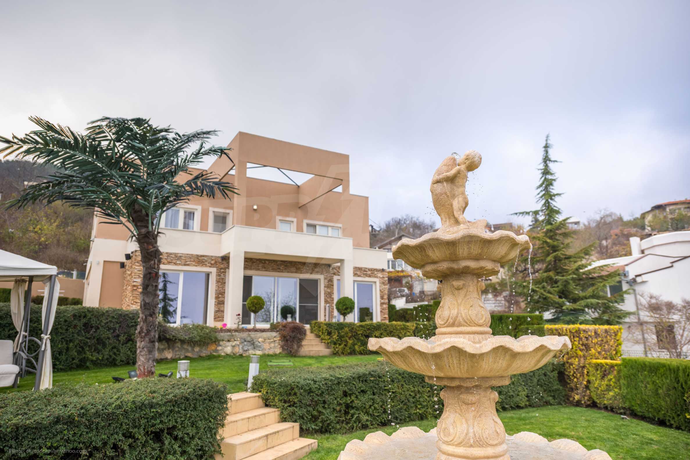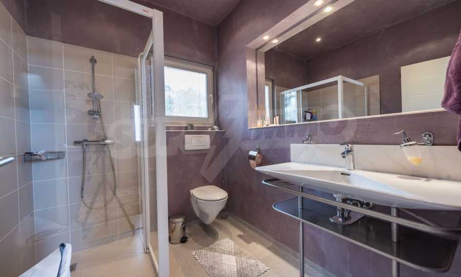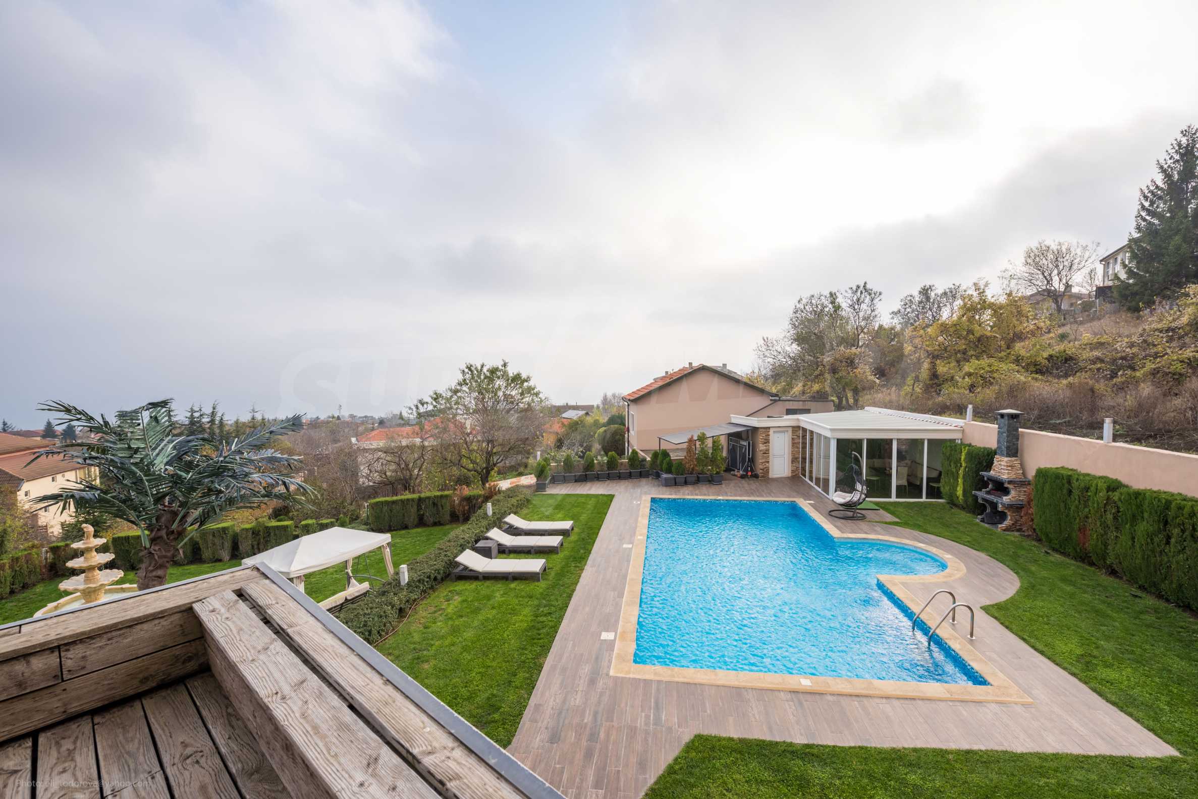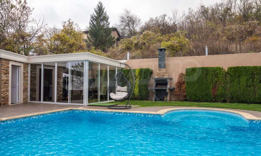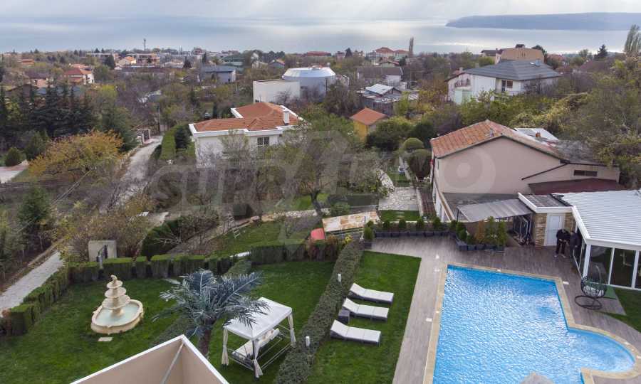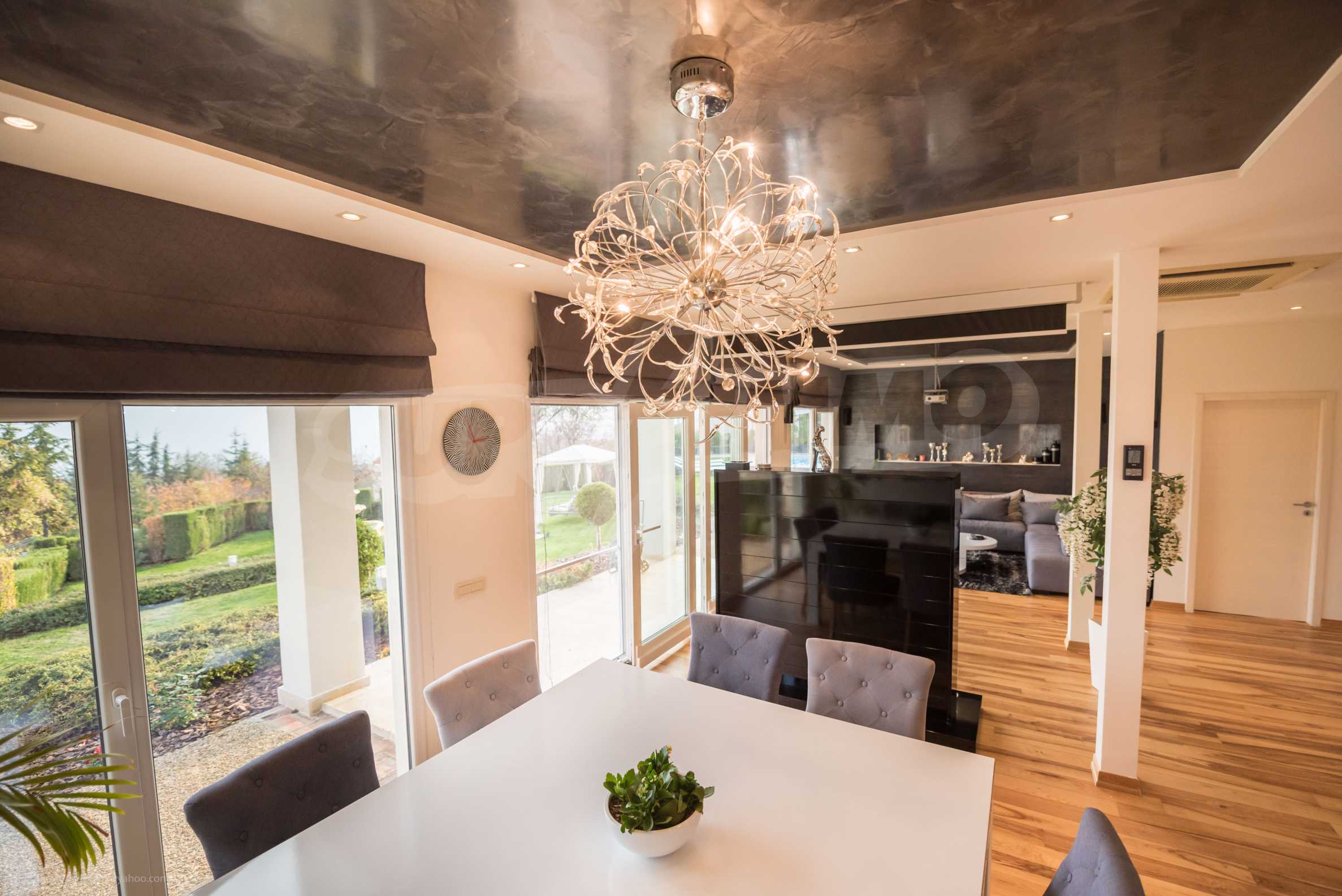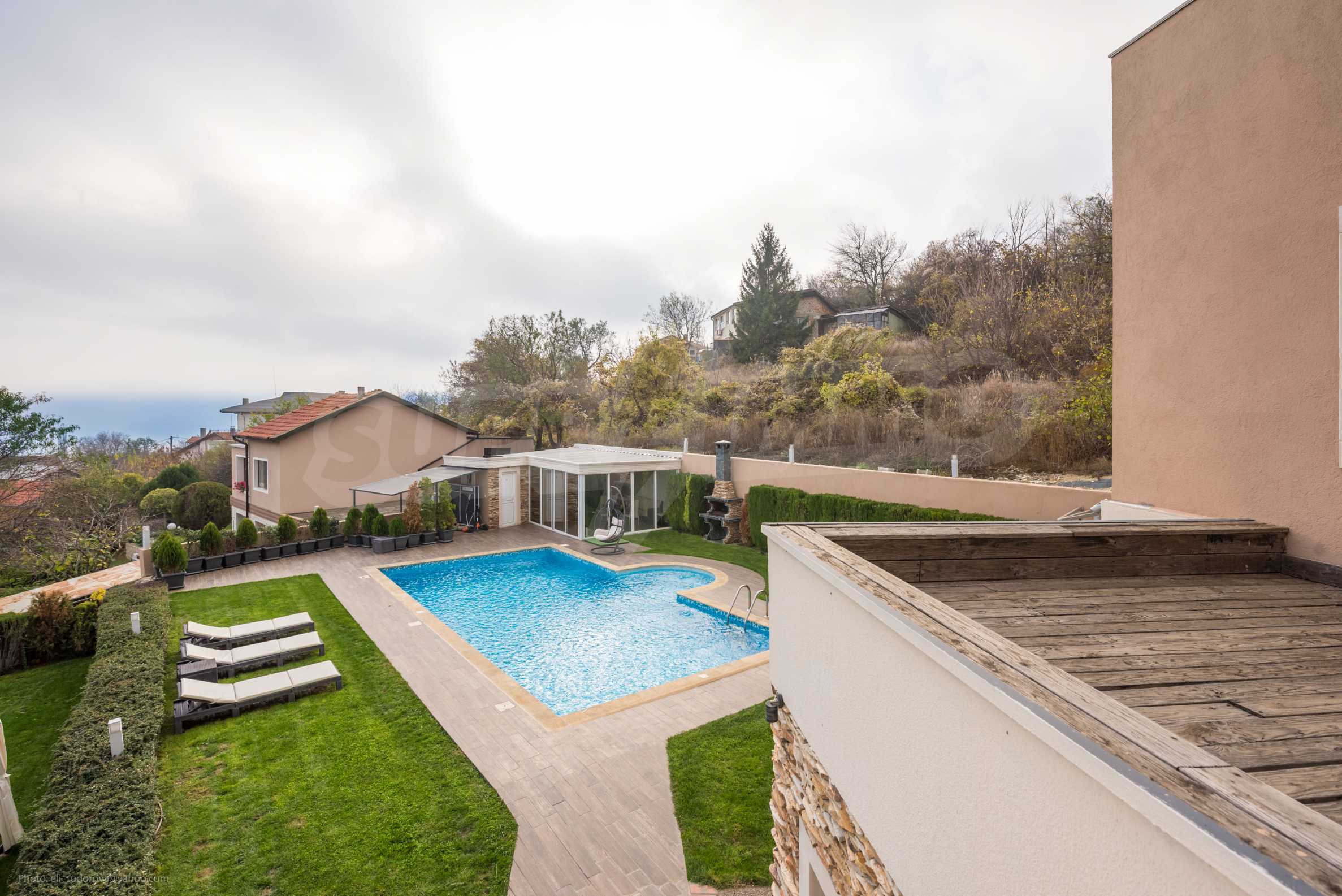 In the yard of the property on several levels are separate areas with a swimming pool with Jacuzzi / 80 cubic meters /, indoor summer kitchen, children's playground, fountain, sports area and parking with four parking spaces. Apart from the street access, there is a closed garage with an area of 120 square meters, which can accommodate six cars. For the convenience of the occupants and guests of the house, there is an outdoor bathroom with toilet and an outside shower by the pool. Near the pool there are sun loungers with umbrellas, as well as a sound central wireless system. The whole property is surrounded by a solid fence, stylishly designed garden and attractive lighting.