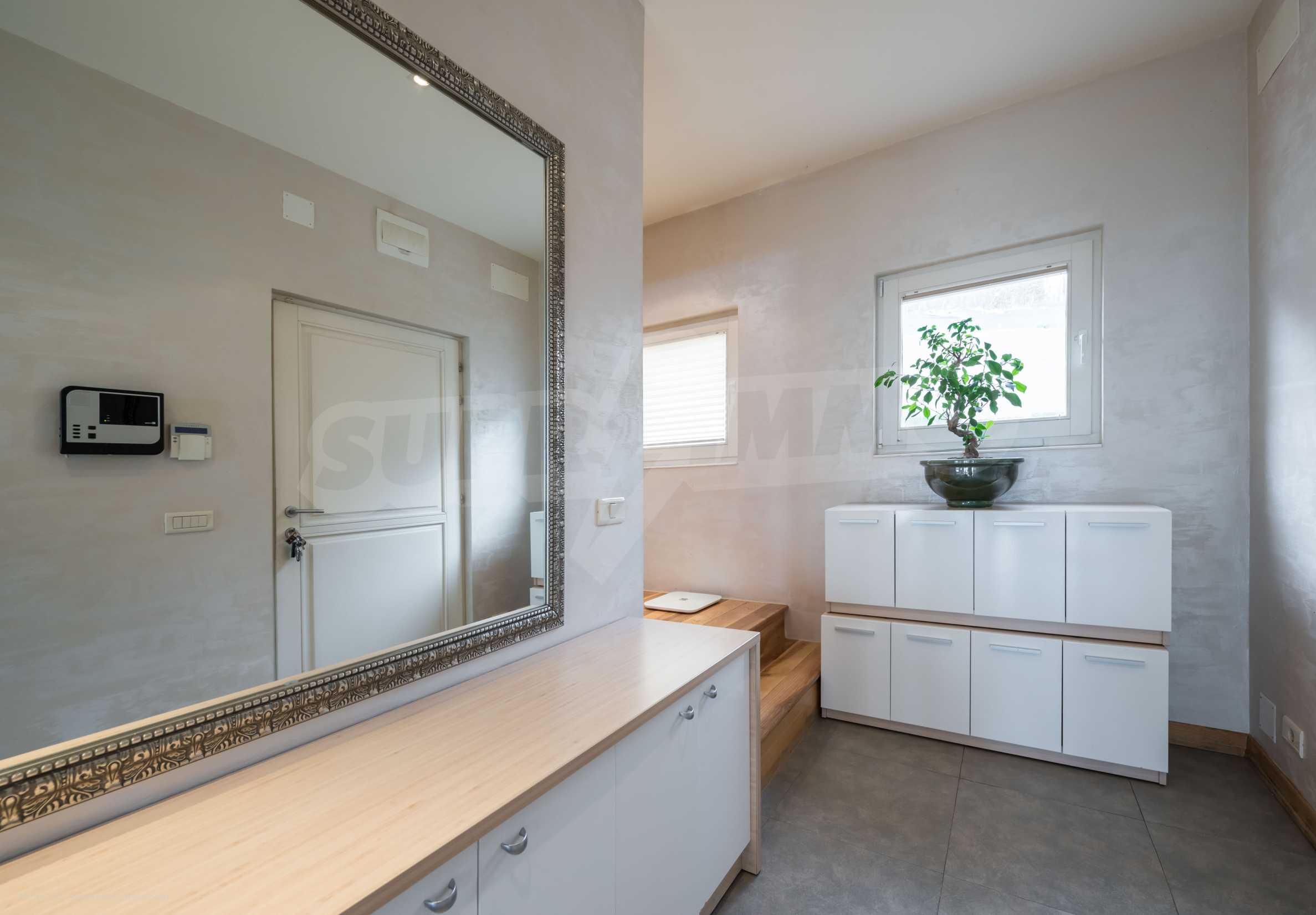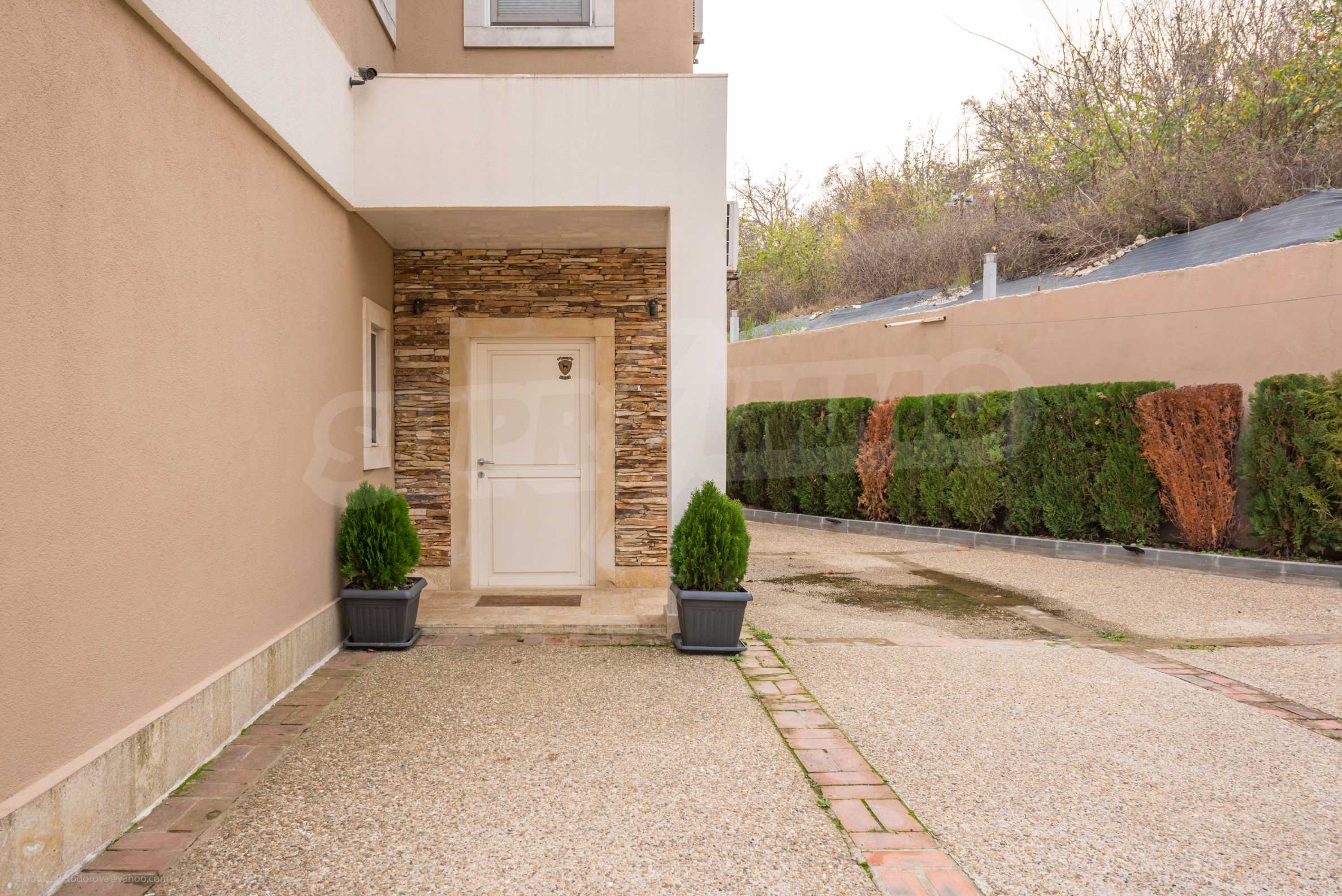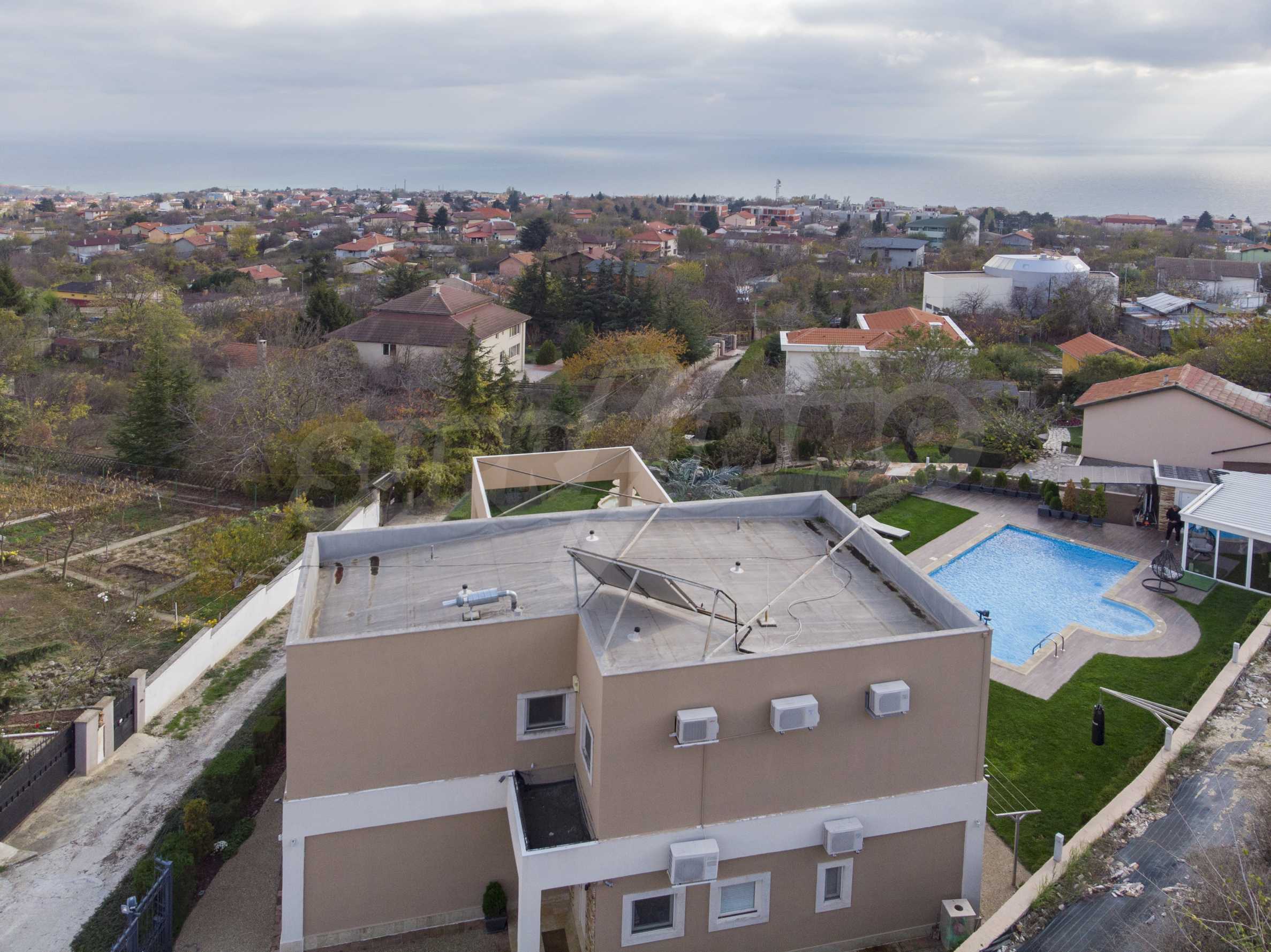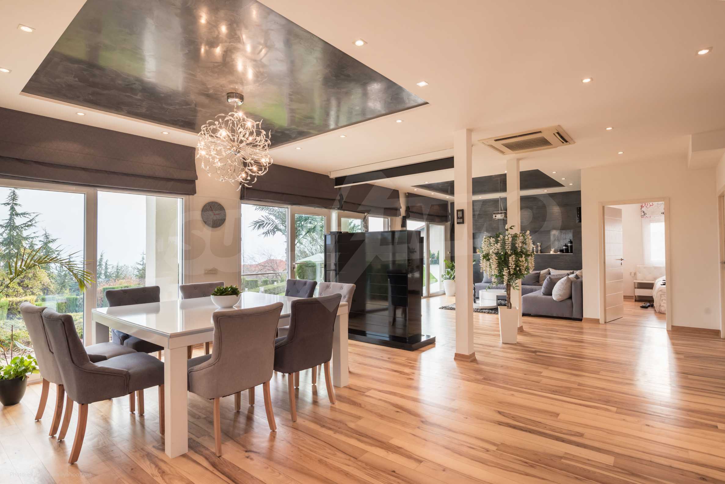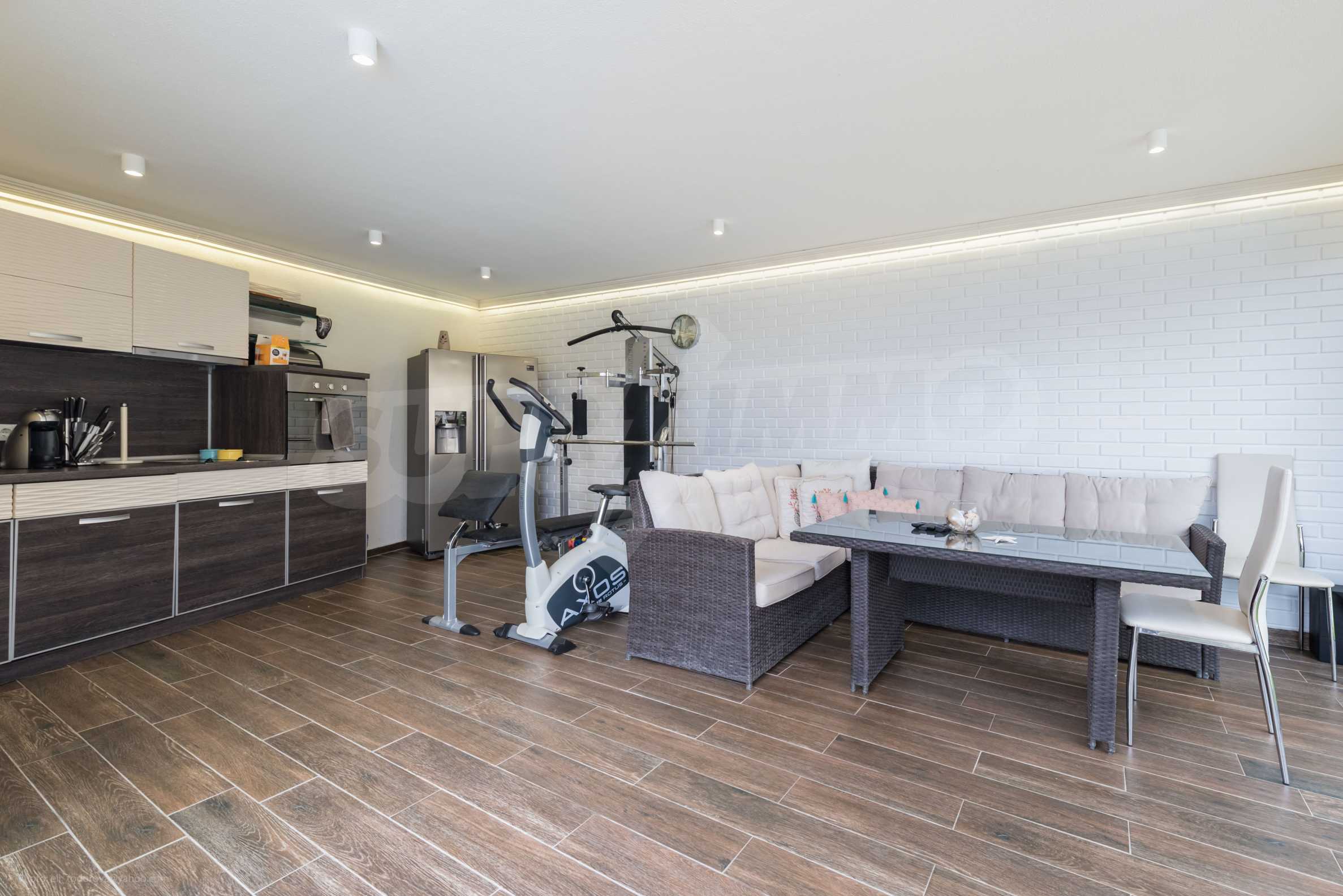 In the yard of the property on several levels are separate areas with a swimming pool with Jacuzzi / 80 cubic meters /, indoor summer kitchen, children's playground, fountain, sports area and parking with four parking spaces. Apart from the street access, there is a closed garage with an area of 120 square meters, which can accommodate six cars. For the convenience of the occupants and guests of the house, there is an outdoor bathroom with toilet and an outside shower by the pool. Near the pool there are sun loungers with umbrellas, as well as a sound central wireless system. The whole property is surrounded by a solid fence, stylishly designed garden and attractive lighting.