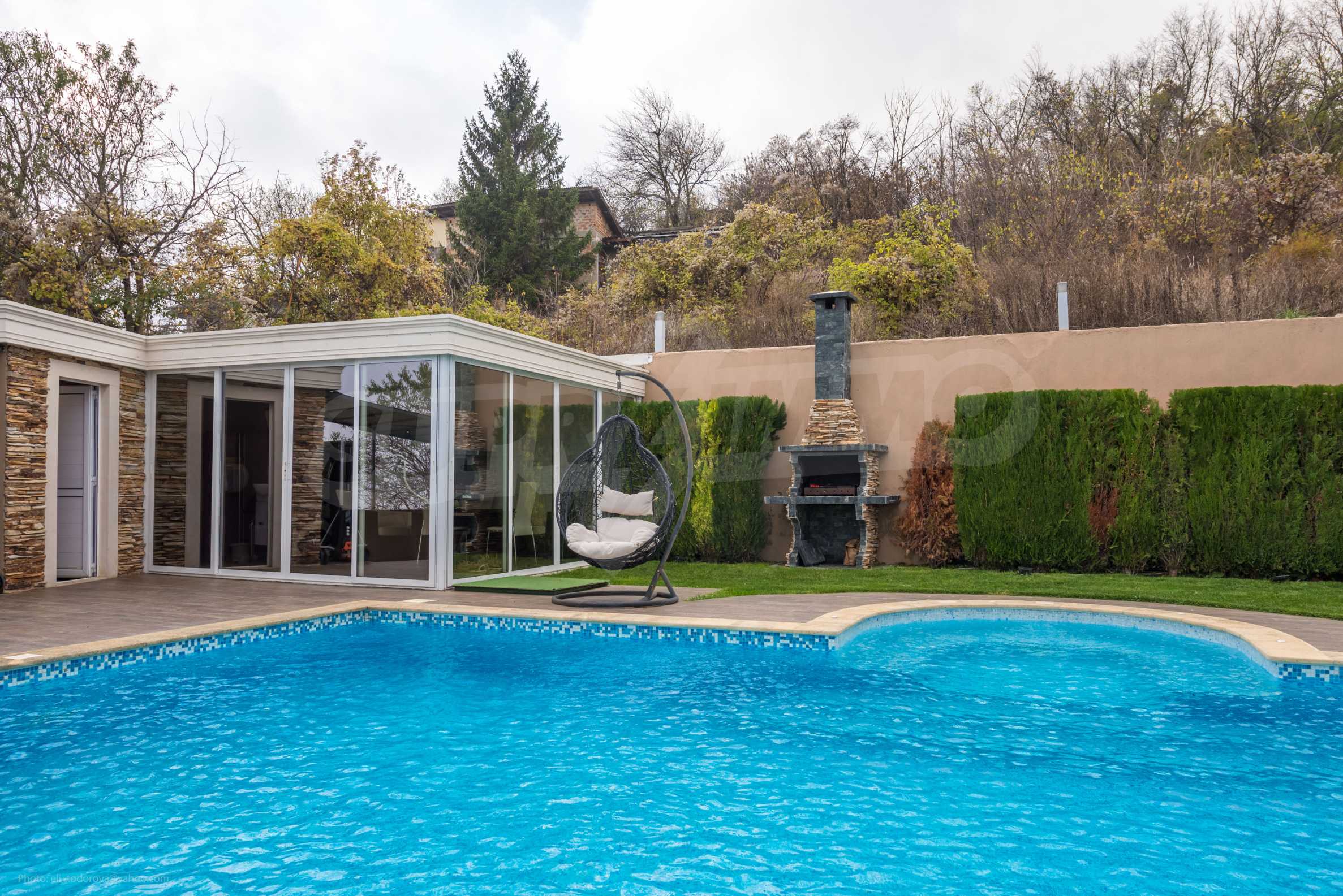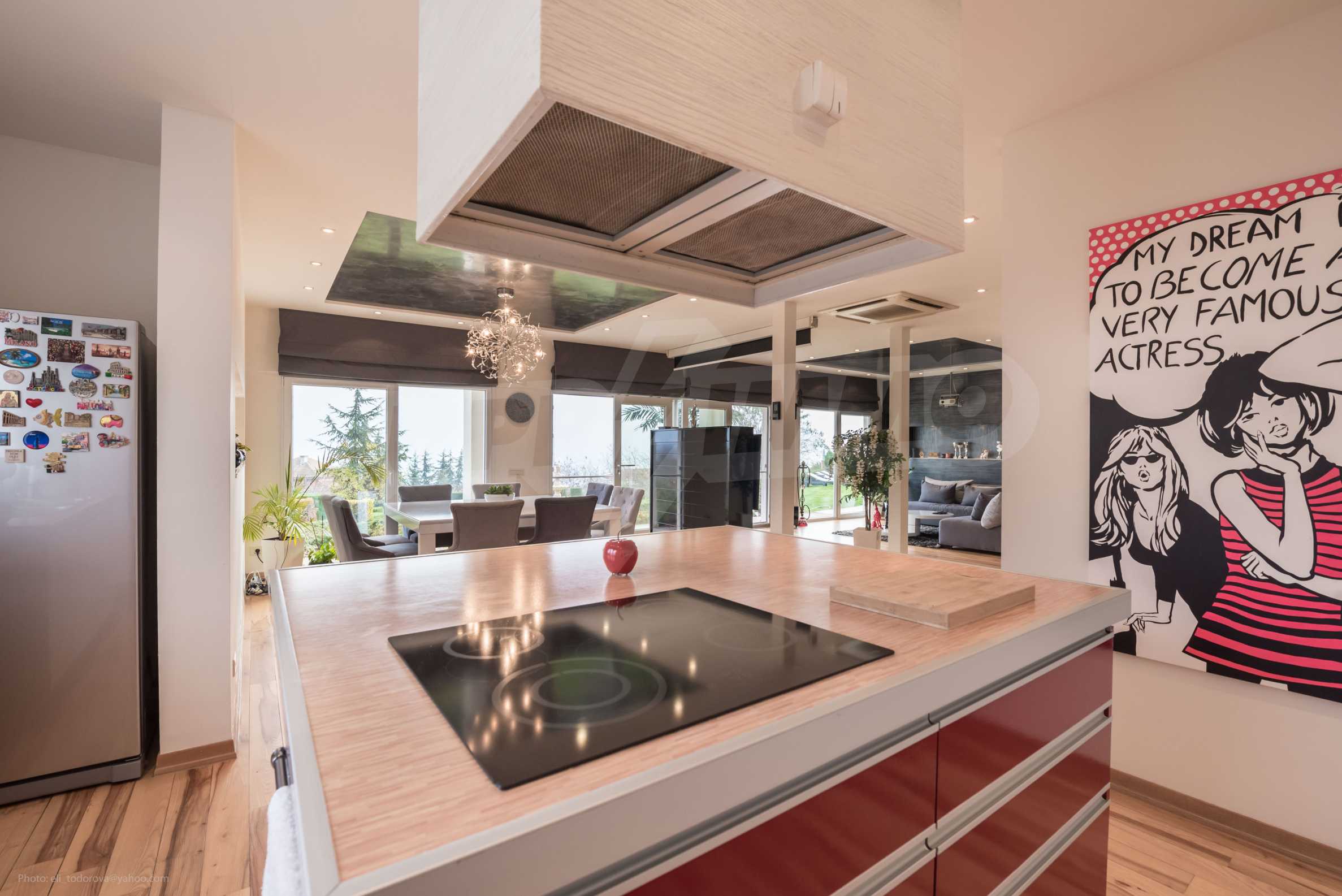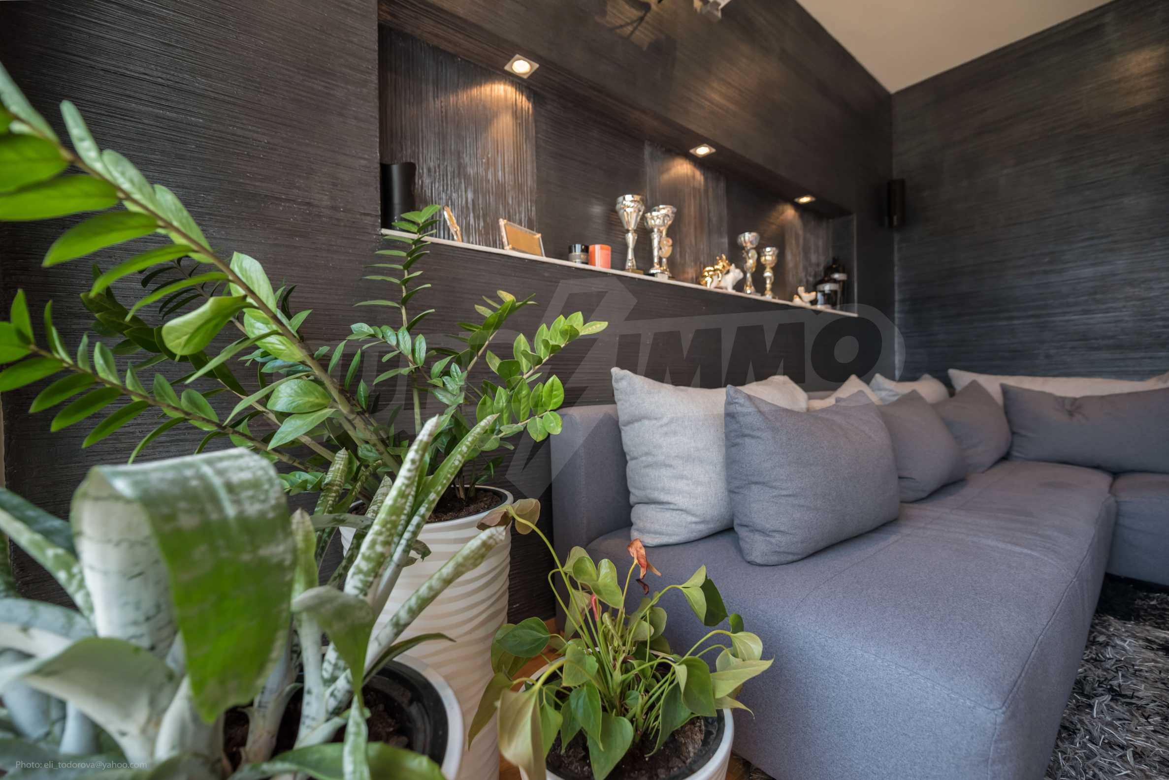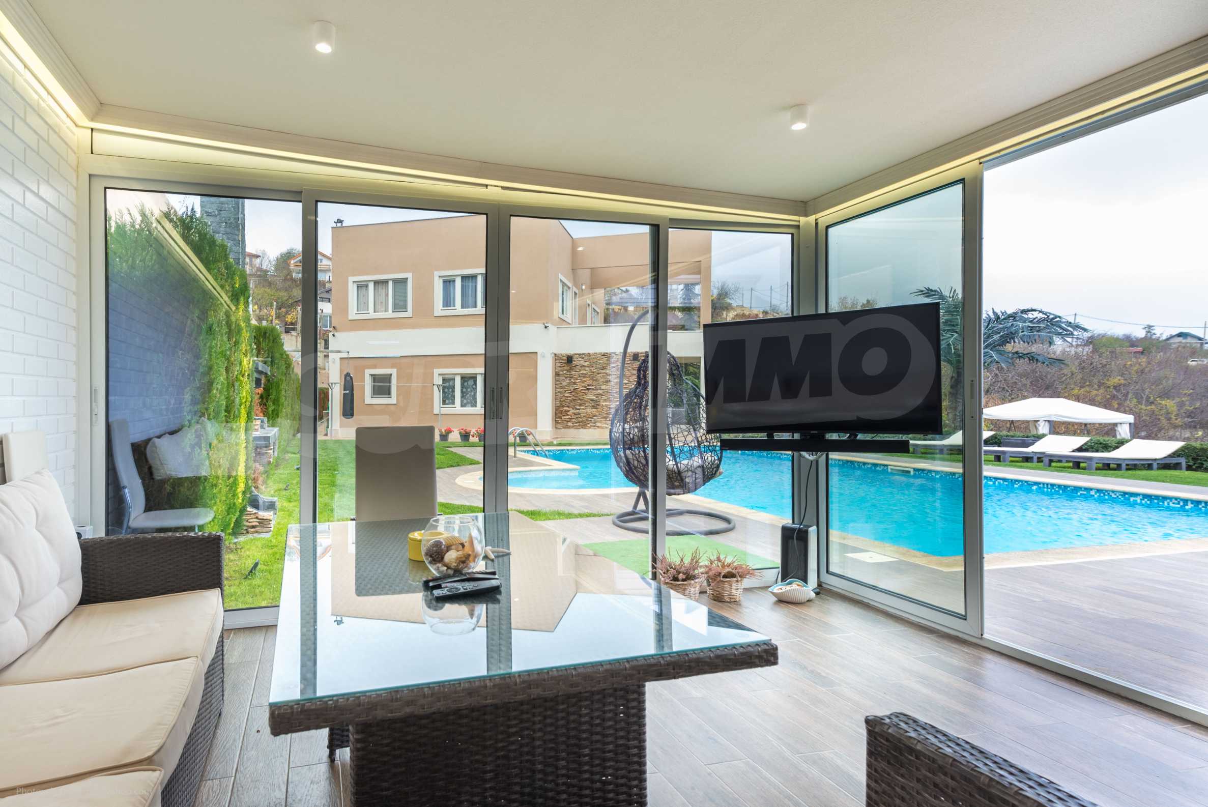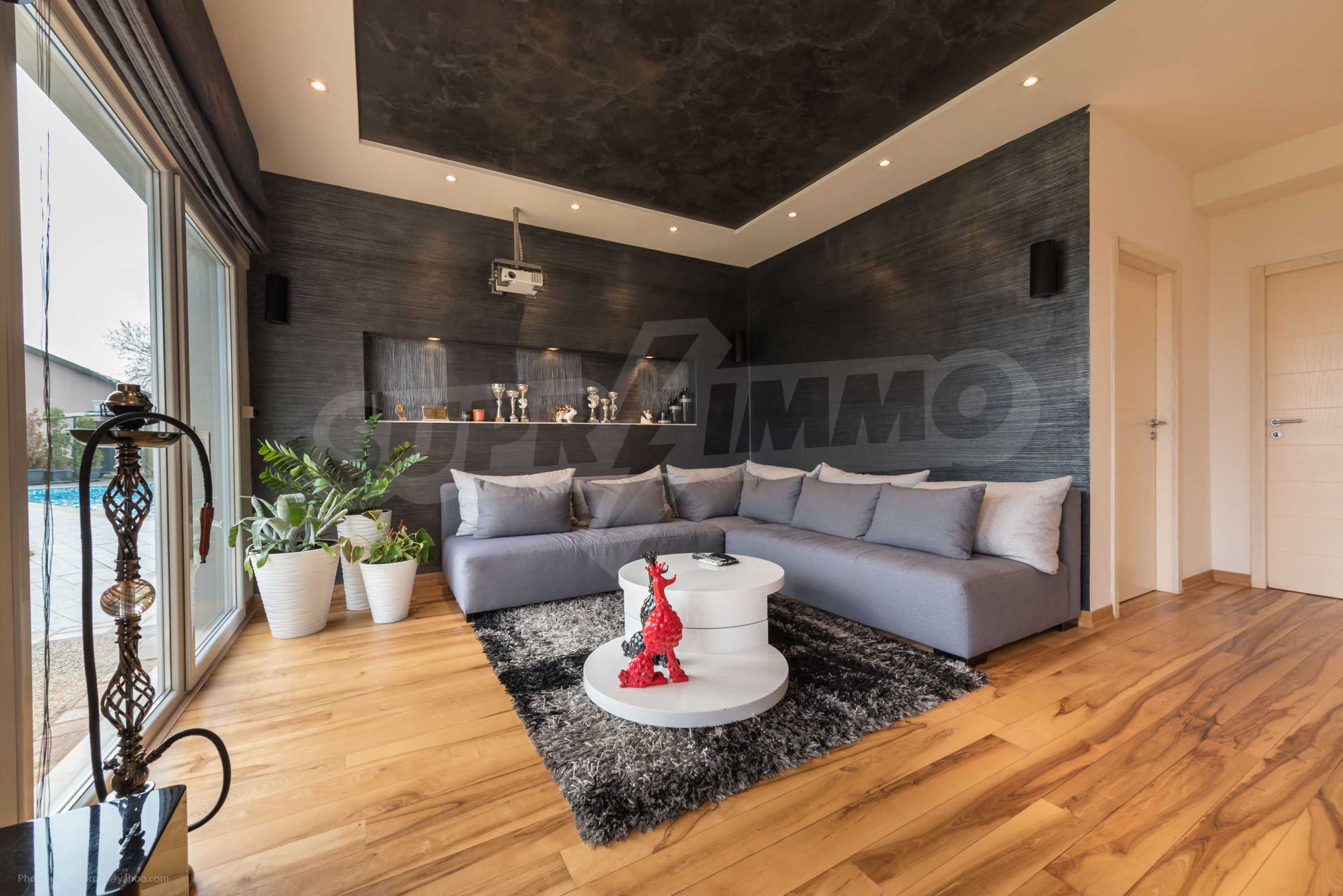 In the yard of the property on several levels are separate areas with a swimming pool with Jacuzzi / 80 cubic meters /, indoor summer kitchen, children's playground, fountain, sports area and parking with four parking spaces. Apart from the street access, there is a closed garage with an area of 120 square meters, which can accommodate six cars. For the convenience of the occupants and guests of the house, there is an outdoor bathroom with toilet and an outside shower by the pool. Near the pool there are sun loungers with umbrellas, as well as a sound central wireless system. The whole property is surrounded by a solid fence, stylishly designed garden and attractive lighting.