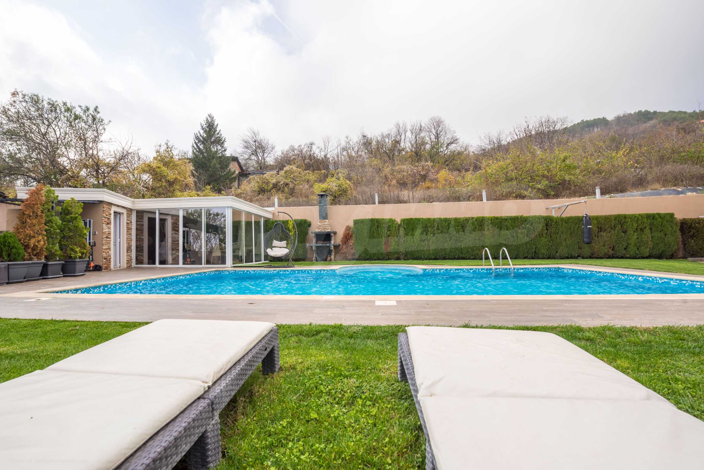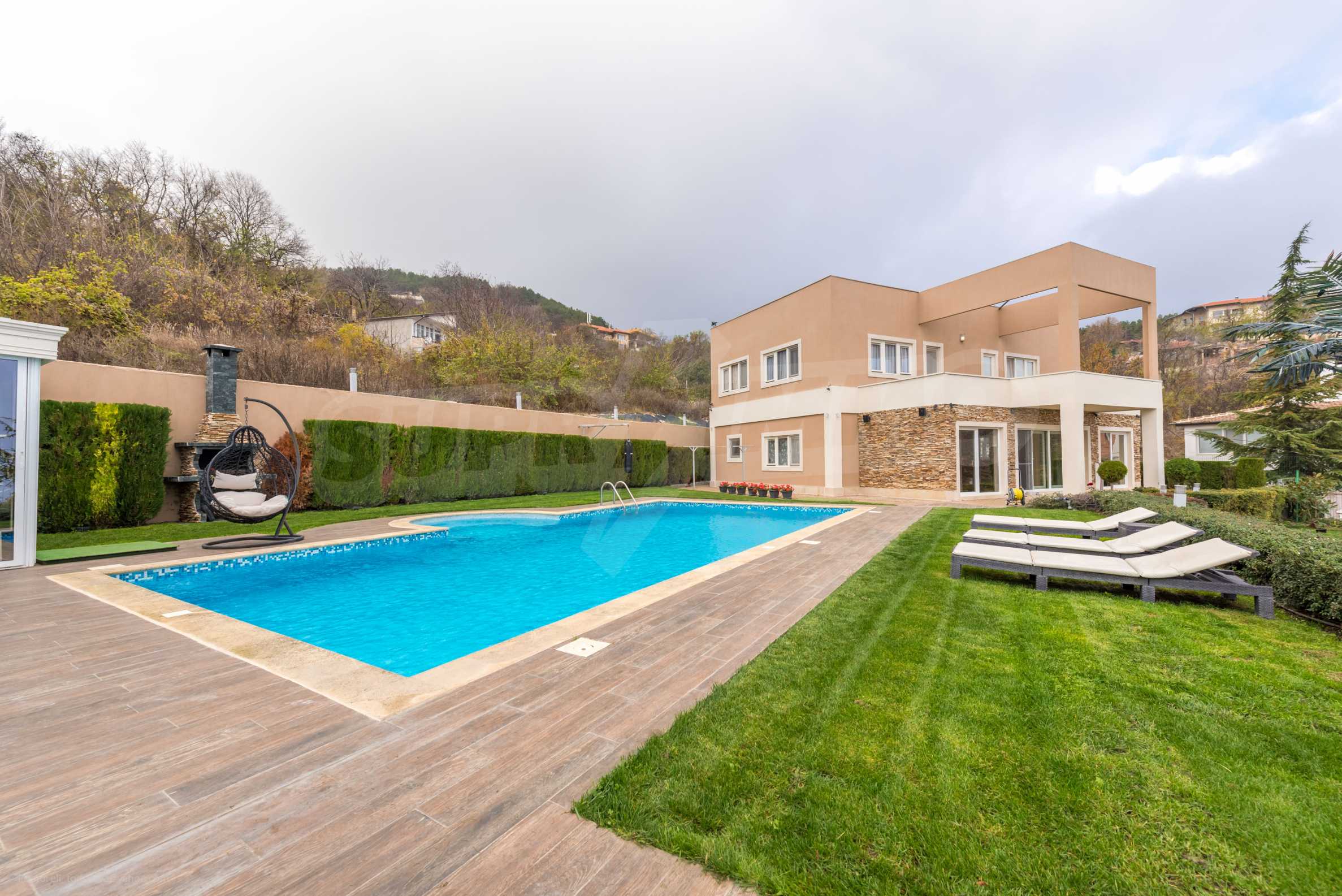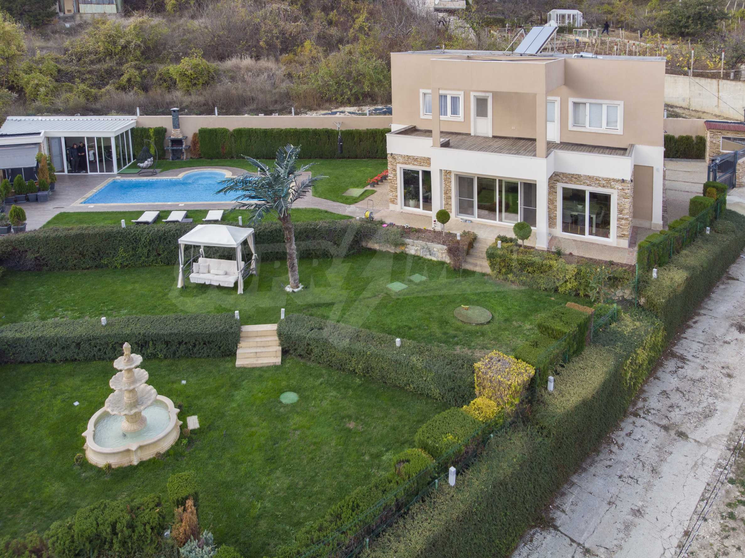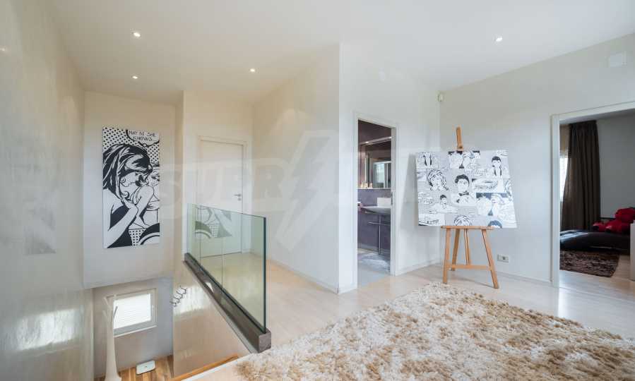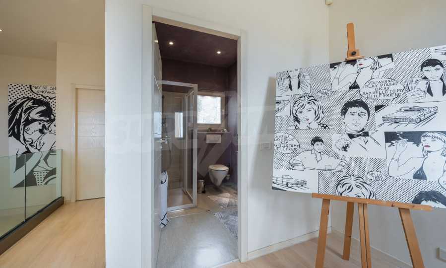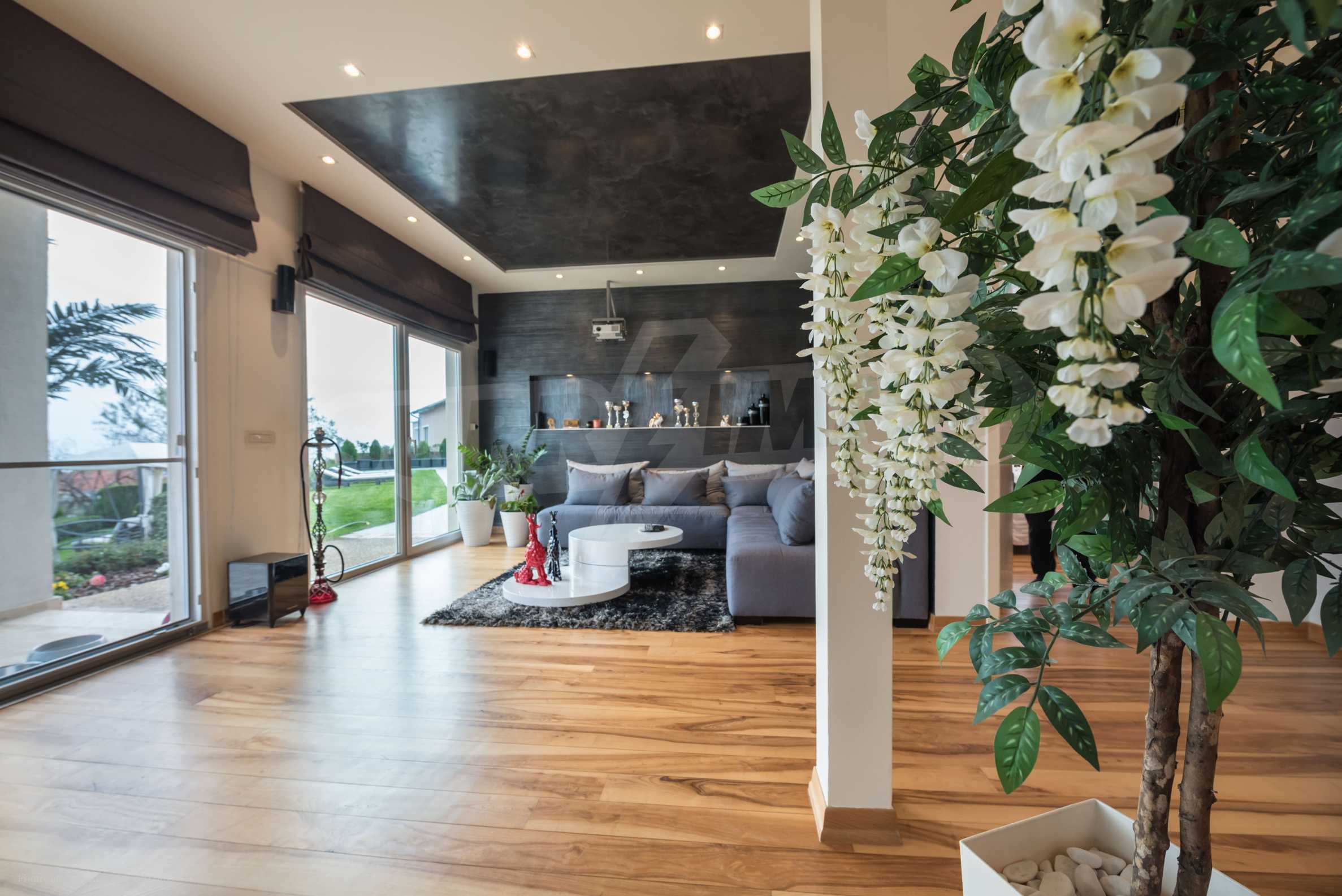 In the yard of the property on several levels are separate areas with a swimming pool with Jacuzzi / 80 cubic meters /, indoor summer kitchen, children's playground, fountain, sports area and parking with four parking spaces. Apart from the street access, there is a closed garage with an area of 120 square meters, which can accommodate six cars. For the convenience of the occupants and guests of the house, there is an outdoor bathroom with toilet and an outside shower by the pool. Near the pool there are sun loungers with umbrellas, as well as a sound central wireless system. The whole property is surrounded by a solid fence, stylishly designed garden and attractive lighting.