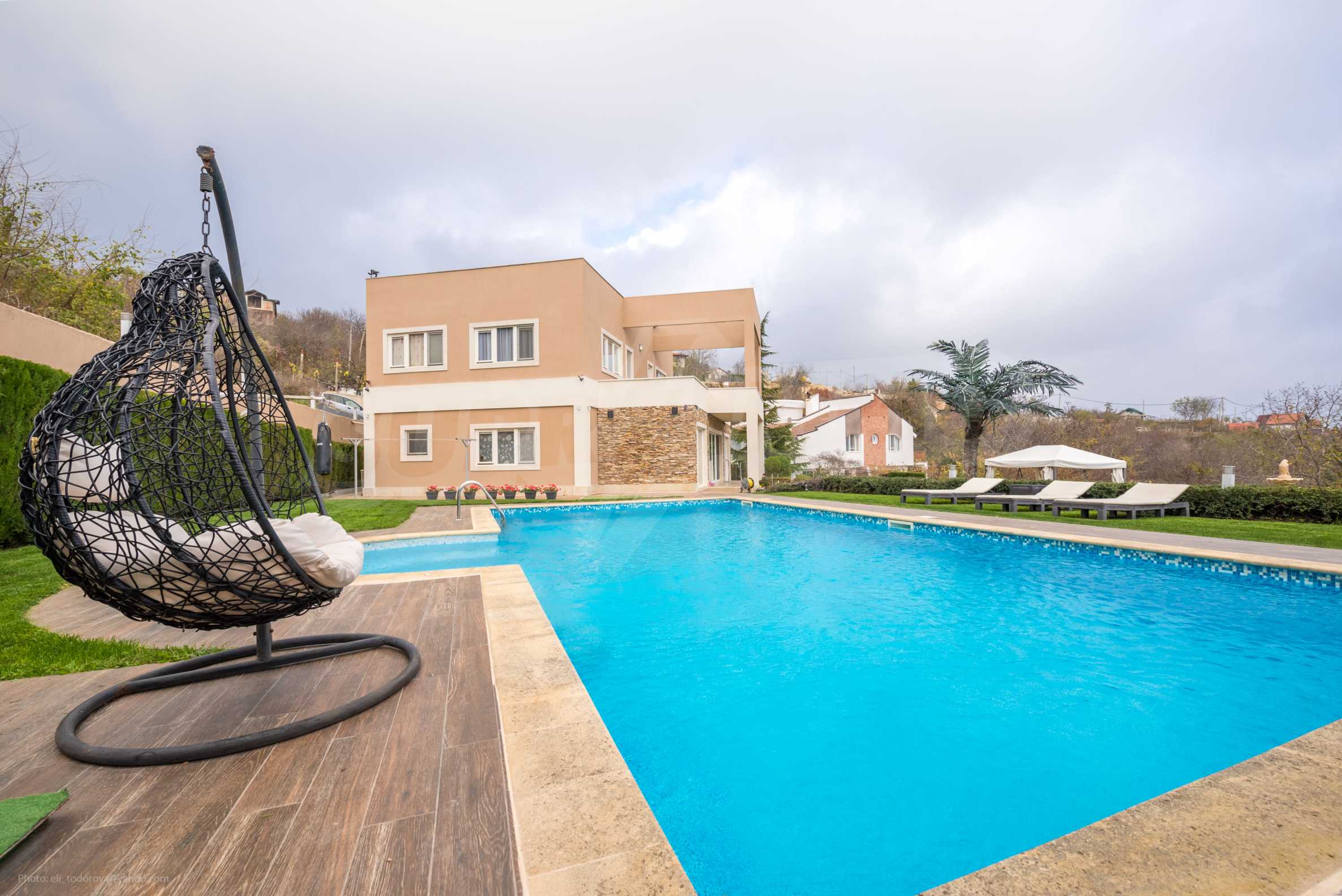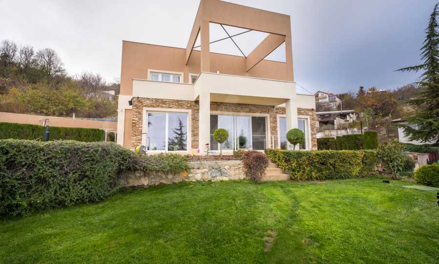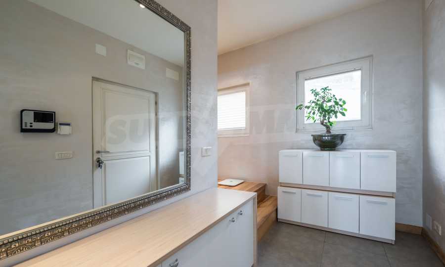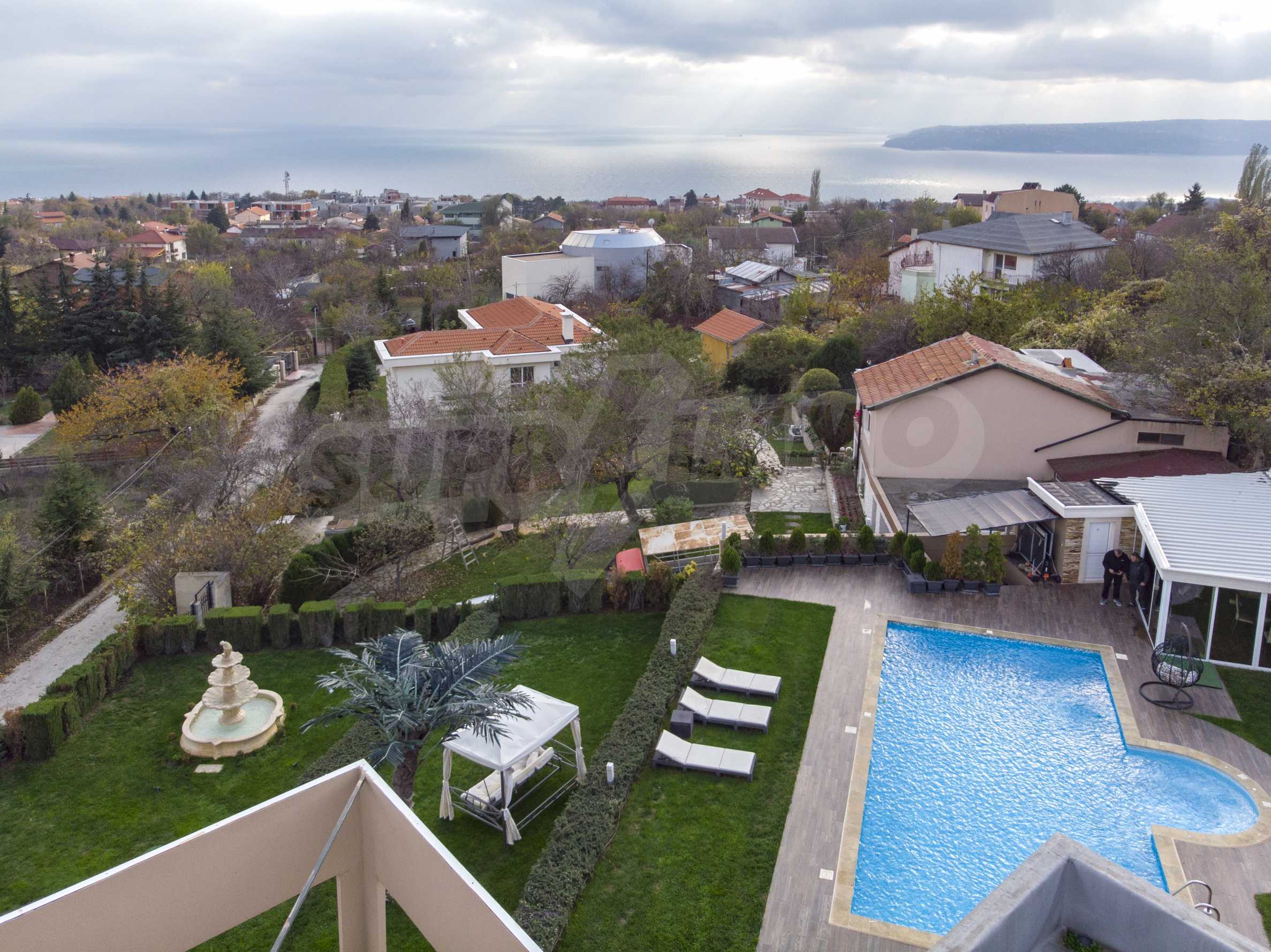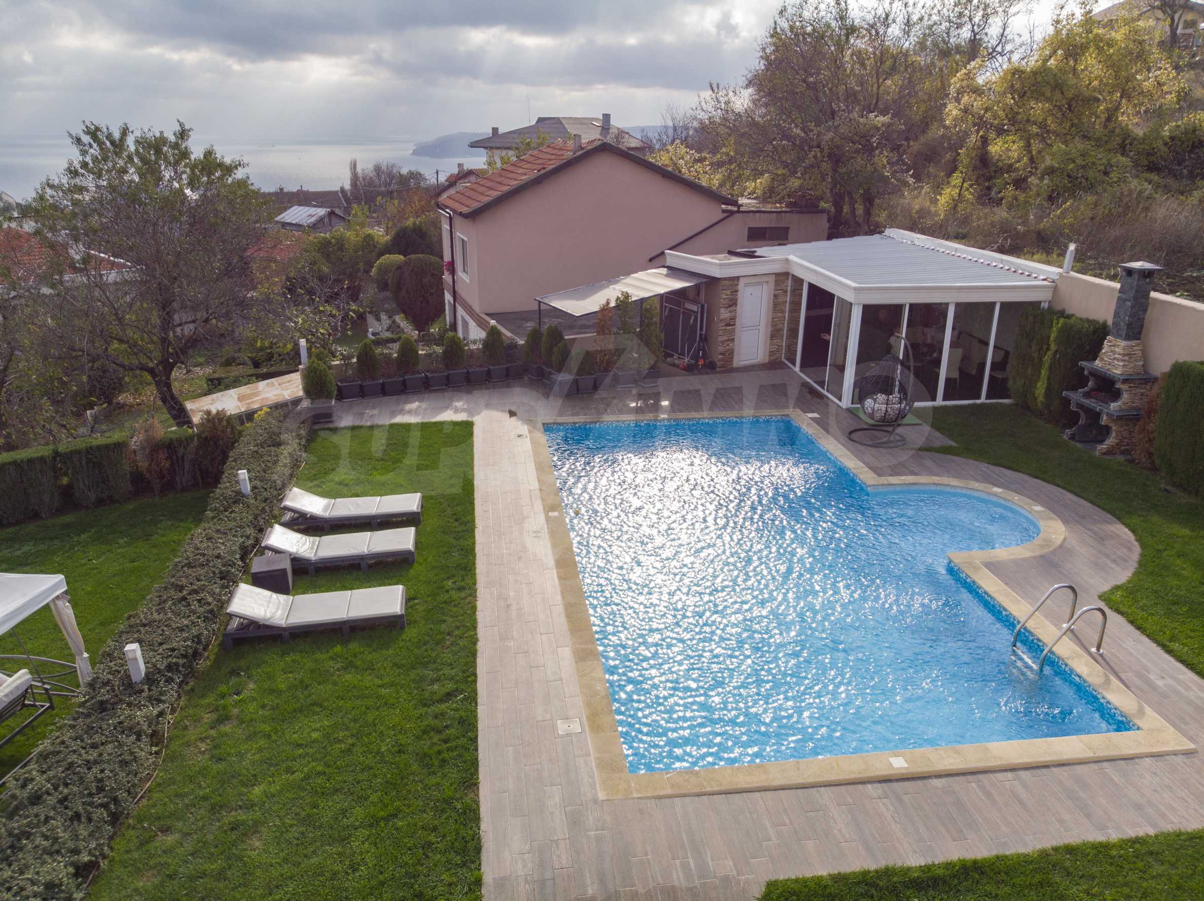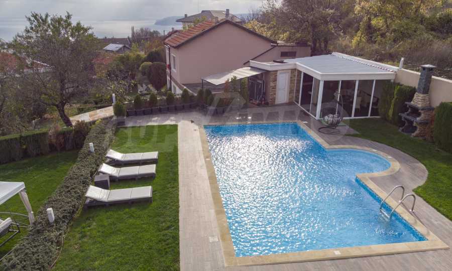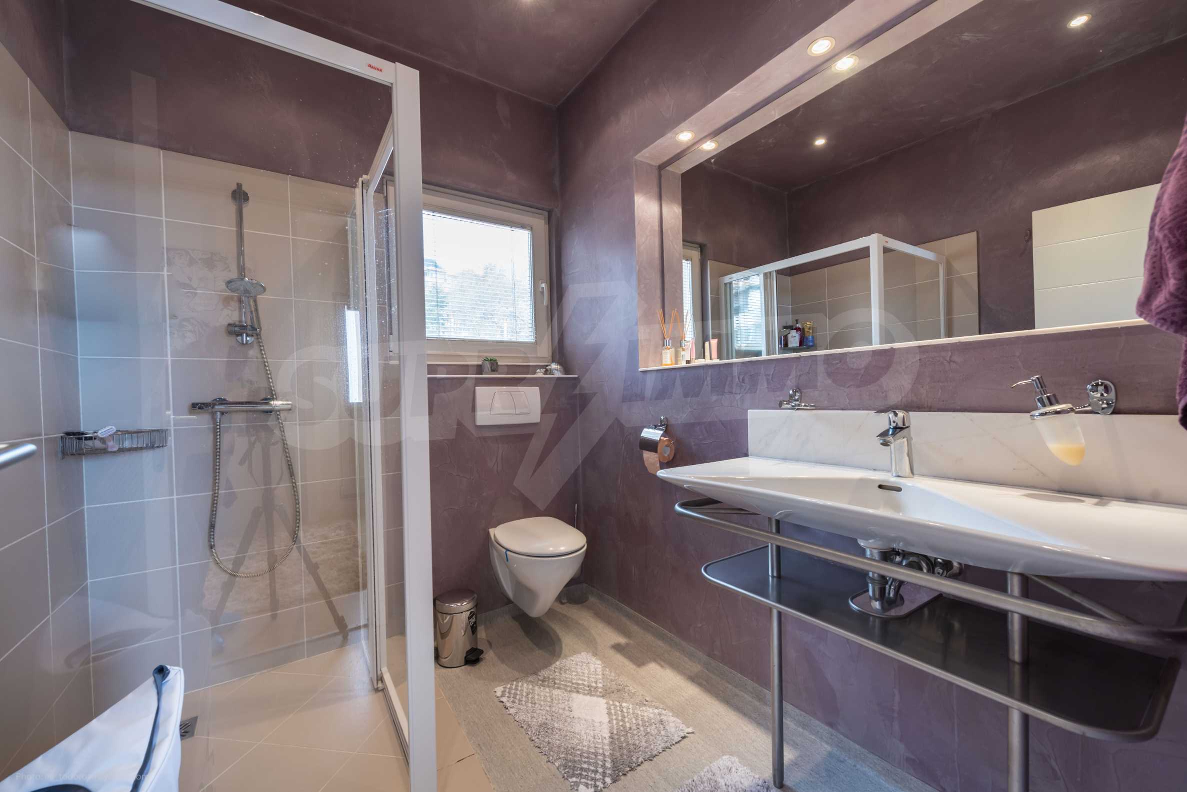 In the yard of the property on several levels are separate areas with a swimming pool with Jacuzzi / 80 cubic meters /, indoor summer kitchen, children's playground, fountain, sports area and parking with four parking spaces. Apart from the street access, there is a closed garage with an area of 120 square meters, which can accommodate six cars. For the convenience of the occupants and guests of the house, there is an outdoor bathroom with toilet and an outside shower by the pool. Near the pool there are sun loungers with umbrellas, as well as a sound central wireless system. The whole property is surrounded by a solid fence, stylishly designed garden and attractive lighting.