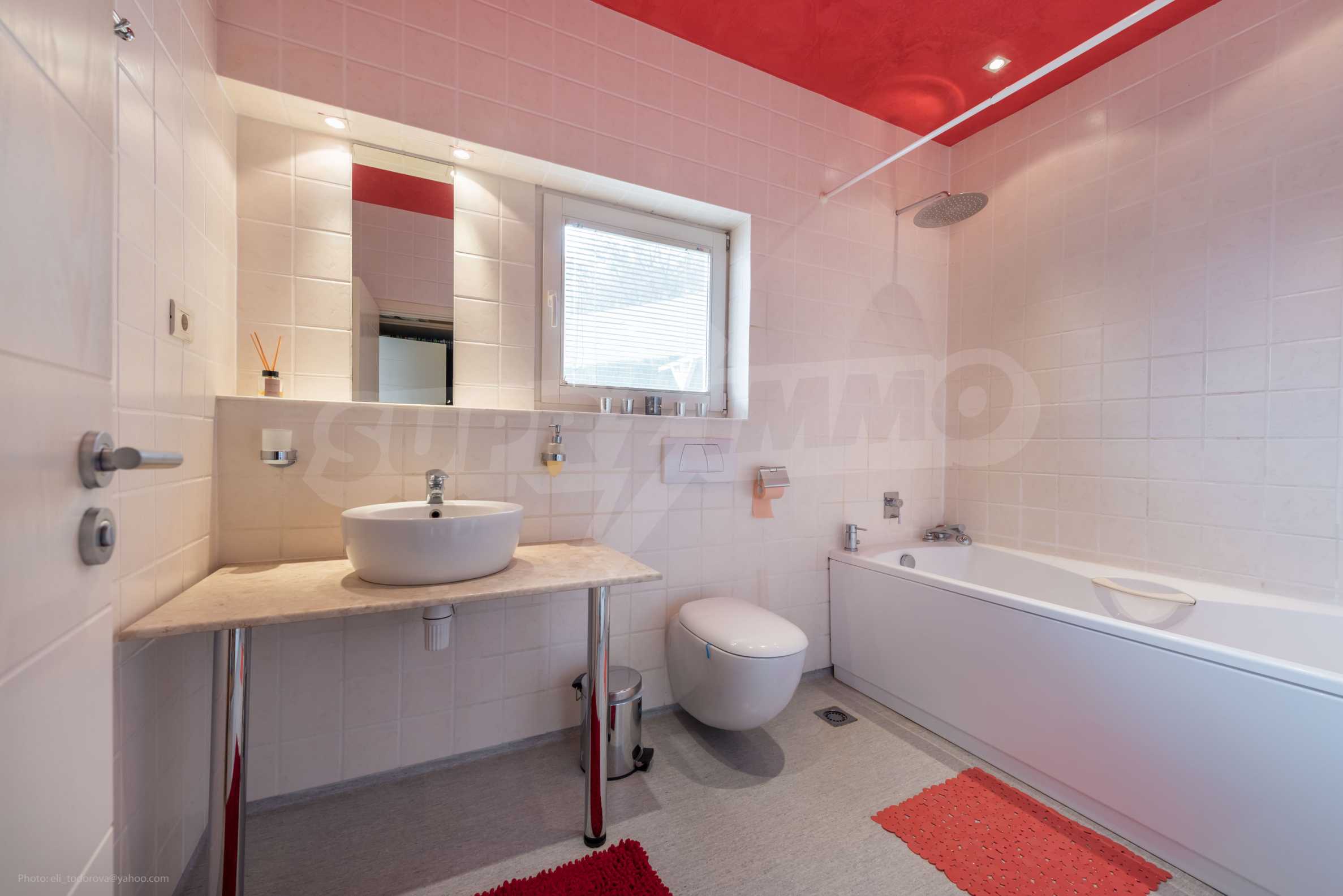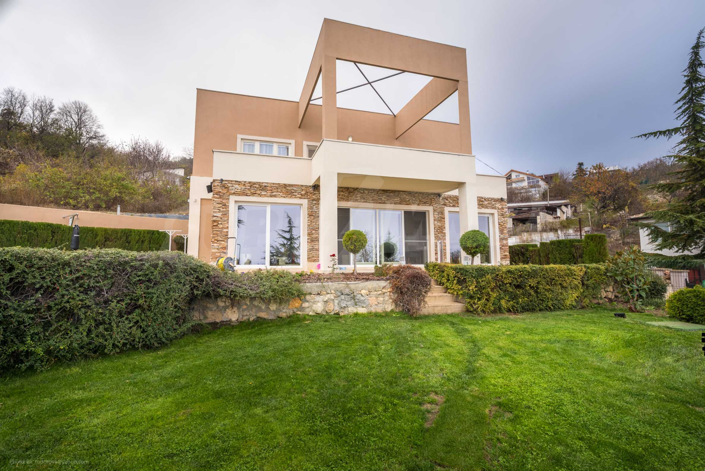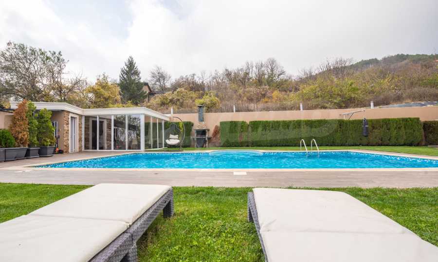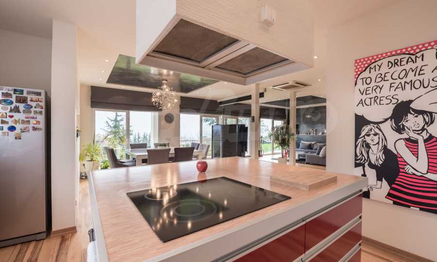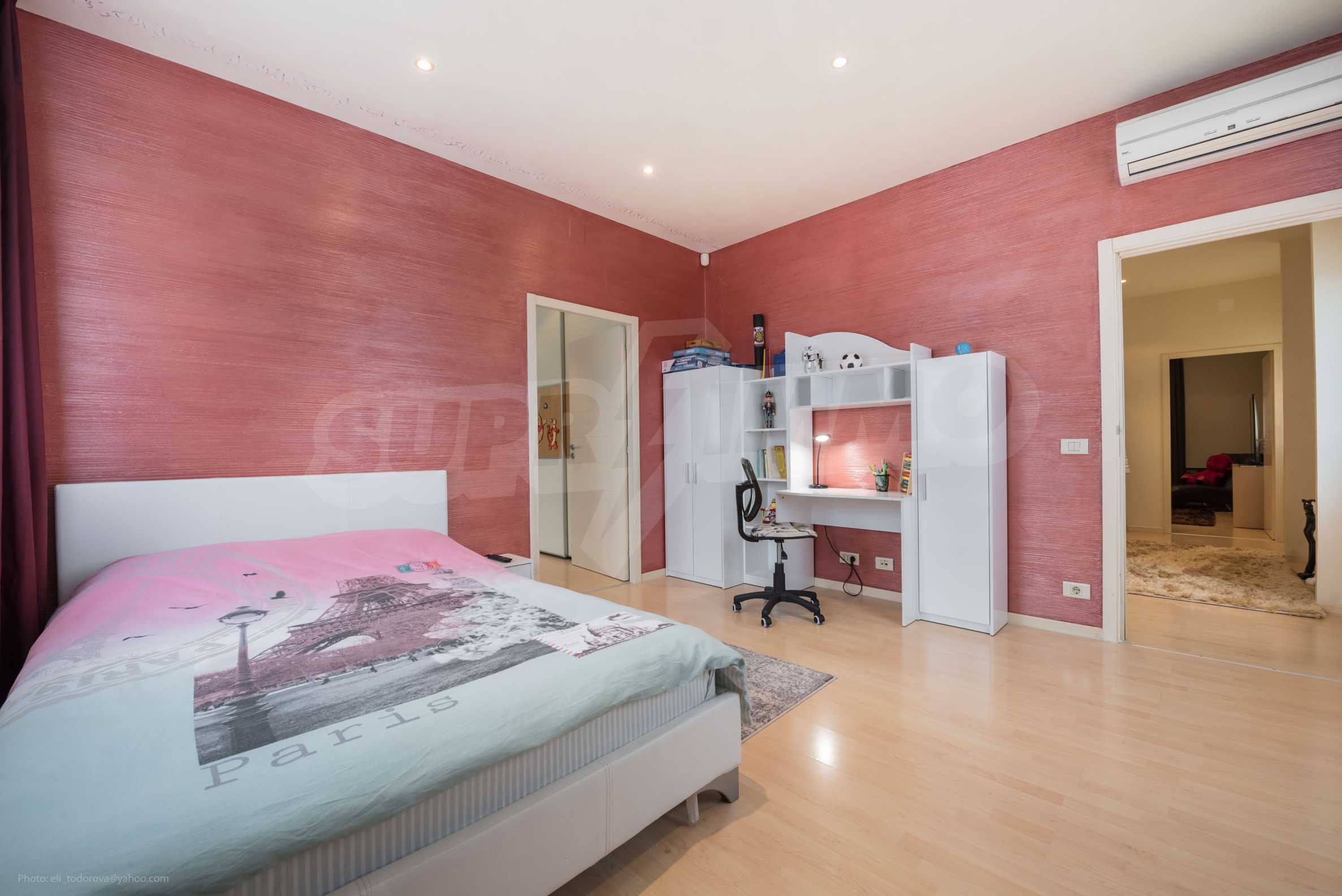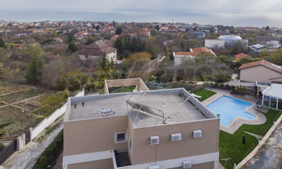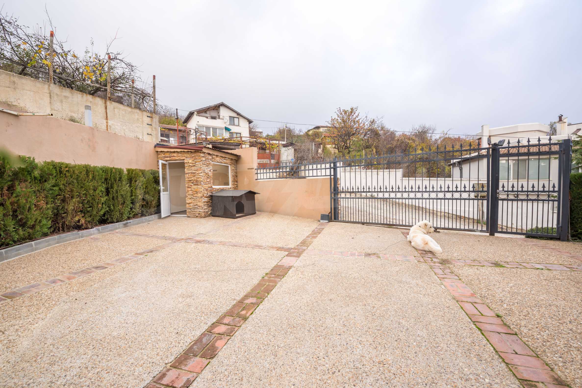 In the yard of the property on several levels are separate areas with a swimming pool with Jacuzzi / 80 cubic meters /, indoor summer kitchen, children's playground, fountain, sports area and parking with four parking spaces. Apart from the street access, there is a closed garage with an area of 120 square meters, which can accommodate six cars. For the convenience of the occupants and guests of the house, there is an outdoor bathroom with toilet and an outside shower by the pool. Near the pool there are sun loungers with umbrellas, as well as a sound central wireless system. The whole property is surrounded by a solid fence, stylishly designed garden and attractive lighting.