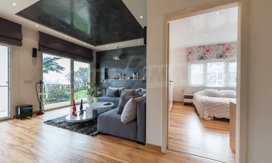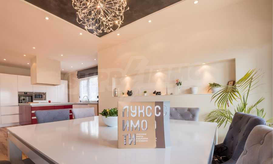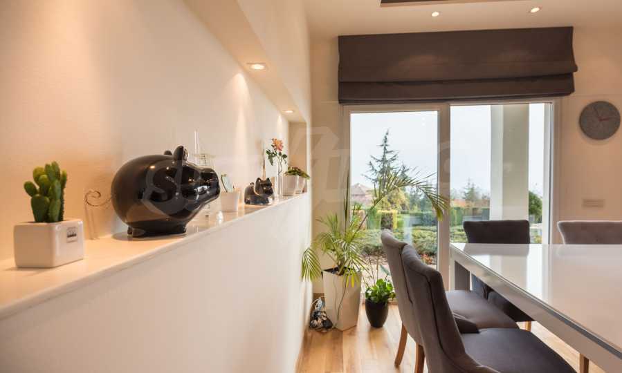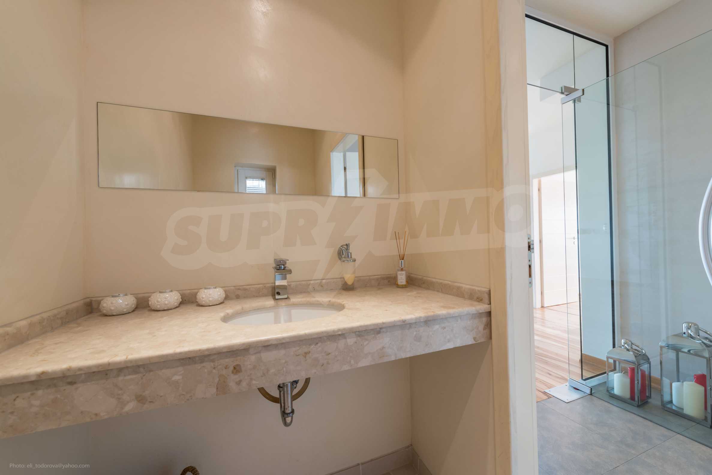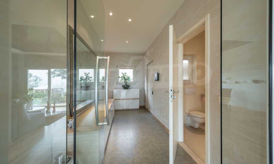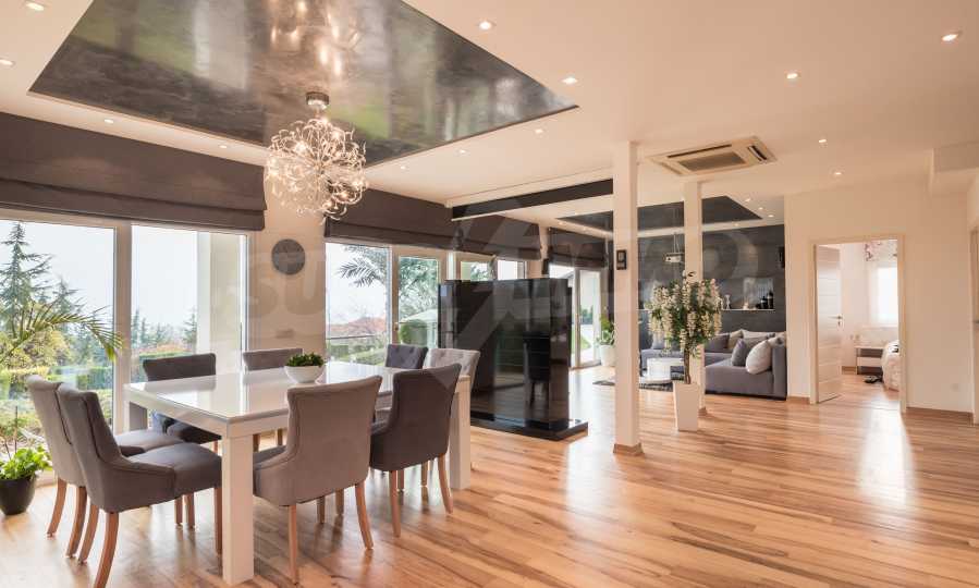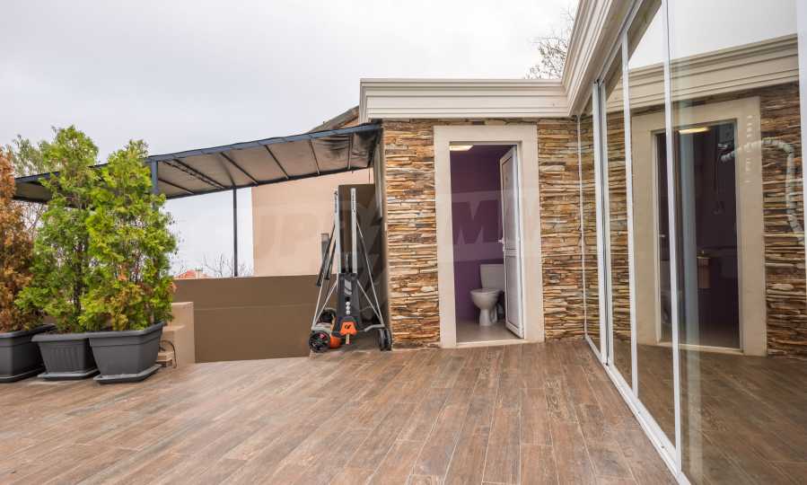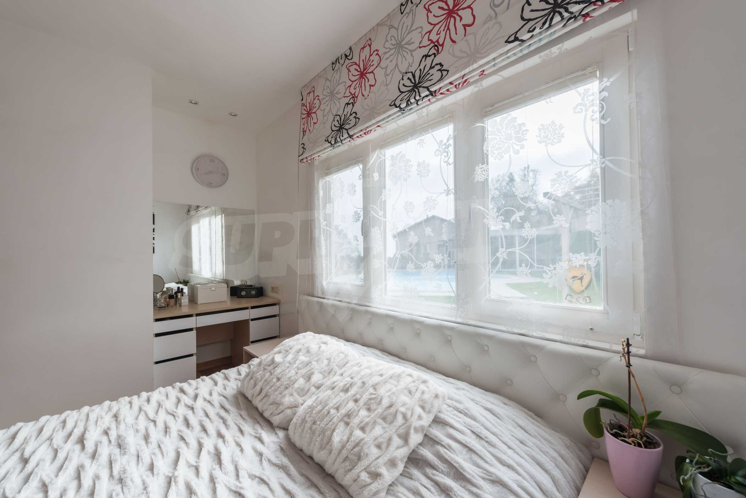 In the yard of the property on several levels are separate areas with a swimming pool with Jacuzzi / 80 cubic meters /, indoor summer kitchen, children's playground, fountain, sports area and parking with four parking spaces. Apart from the street access, there is a closed garage with an area of 120 square meters, which can accommodate six cars. For the convenience of the occupants and guests of the house, there is an outdoor bathroom with toilet and an outside shower by the pool. Near the pool there are sun loungers with umbrellas, as well as a sound central wireless system. The whole property is surrounded by a solid fence, stylishly designed garden and attractive lighting.
