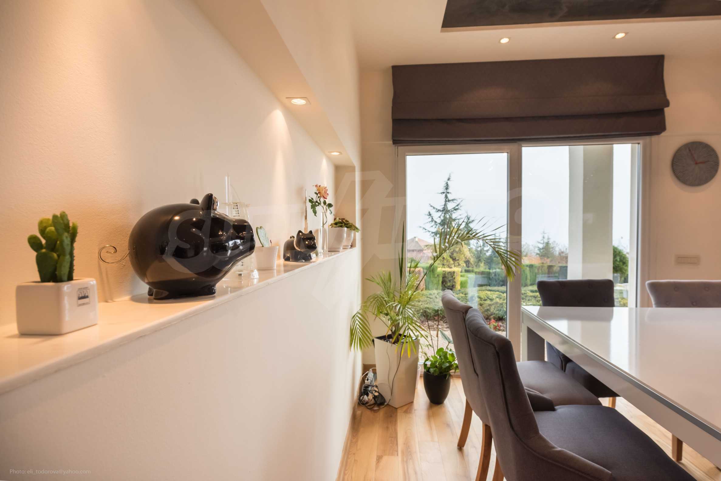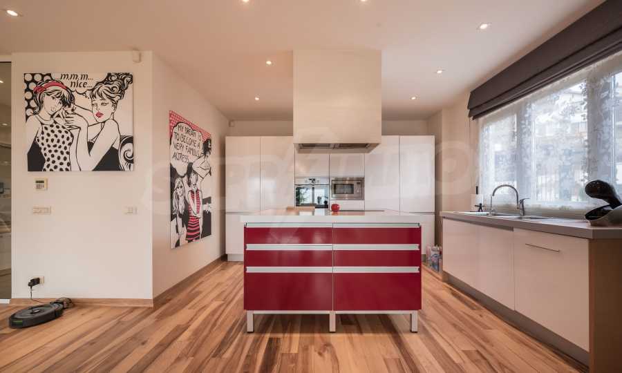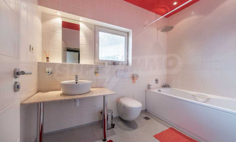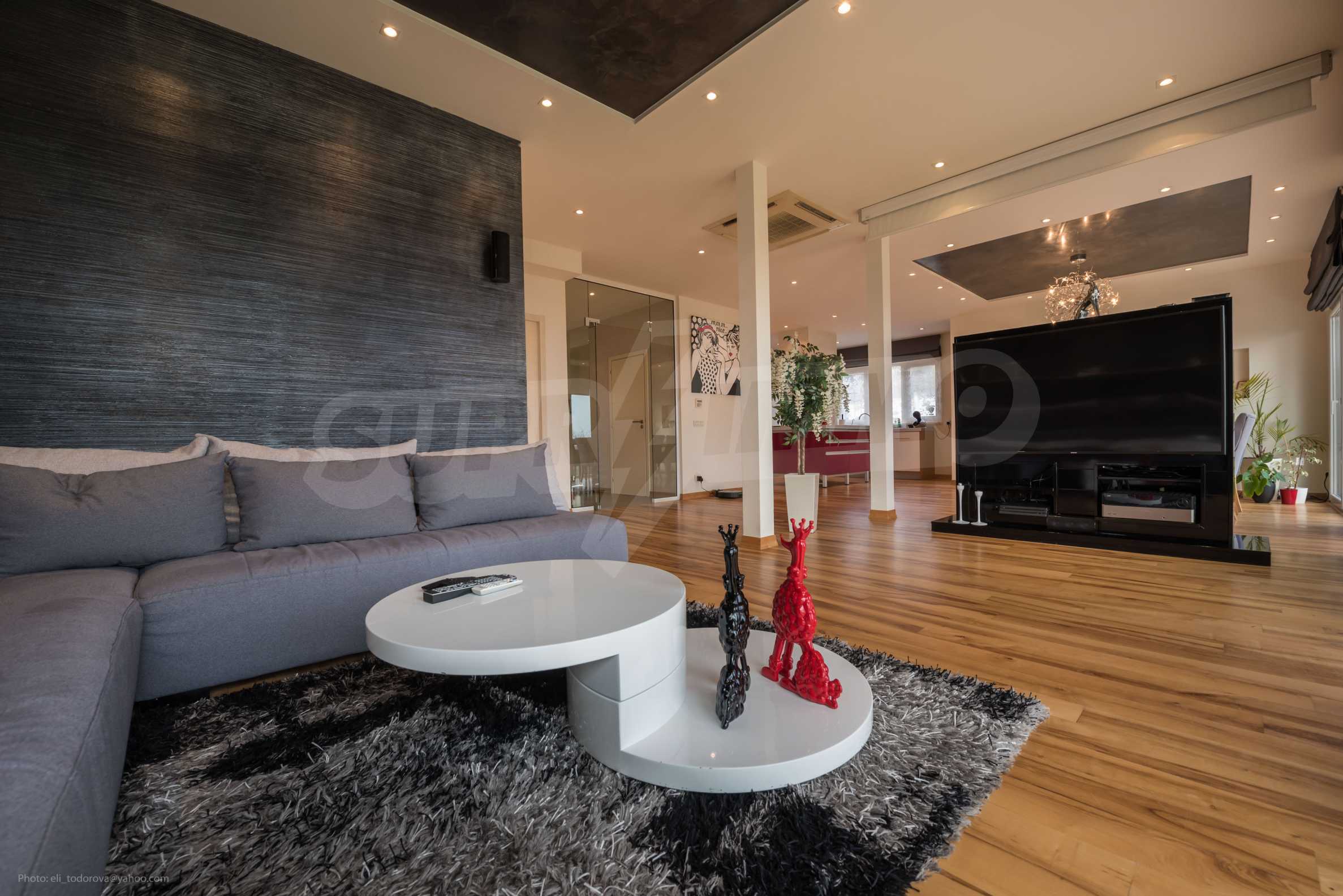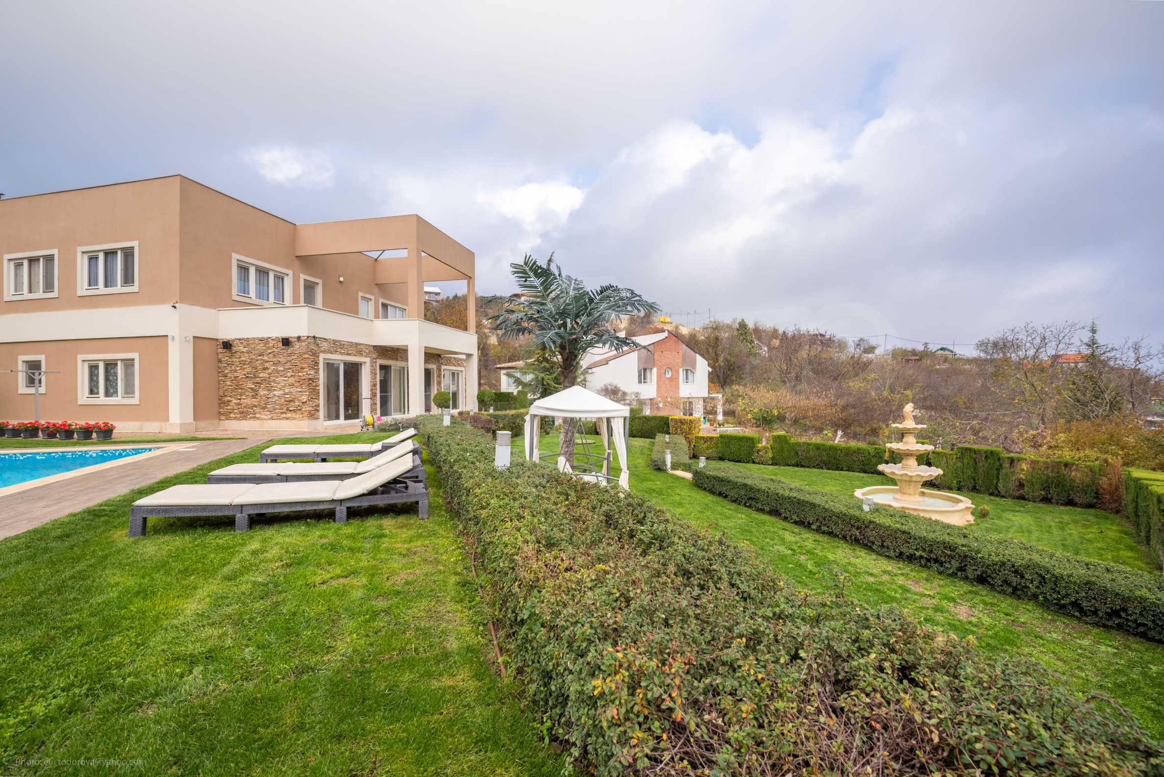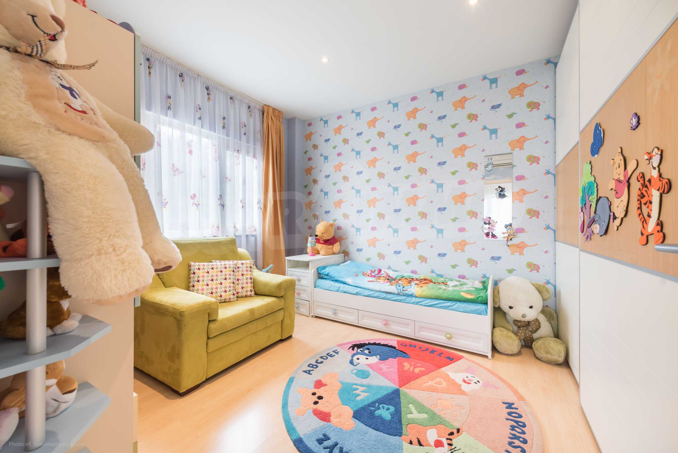 In the yard of the property on several levels are separate areas with a swimming pool with Jacuzzi / 80 cubic meters /, indoor summer kitchen, children's playground, fountain, sports area and parking with four parking spaces. Apart from the street access, there is a closed garage with an area of 120 square meters, which can accommodate six cars. For the convenience of the occupants and guests of the house, there is an outdoor bathroom with toilet and an outside shower by the pool. Near the pool there are sun loungers with umbrellas, as well as a sound central wireless system. The whole property is surrounded by a solid fence, stylishly designed garden and attractive lighting.