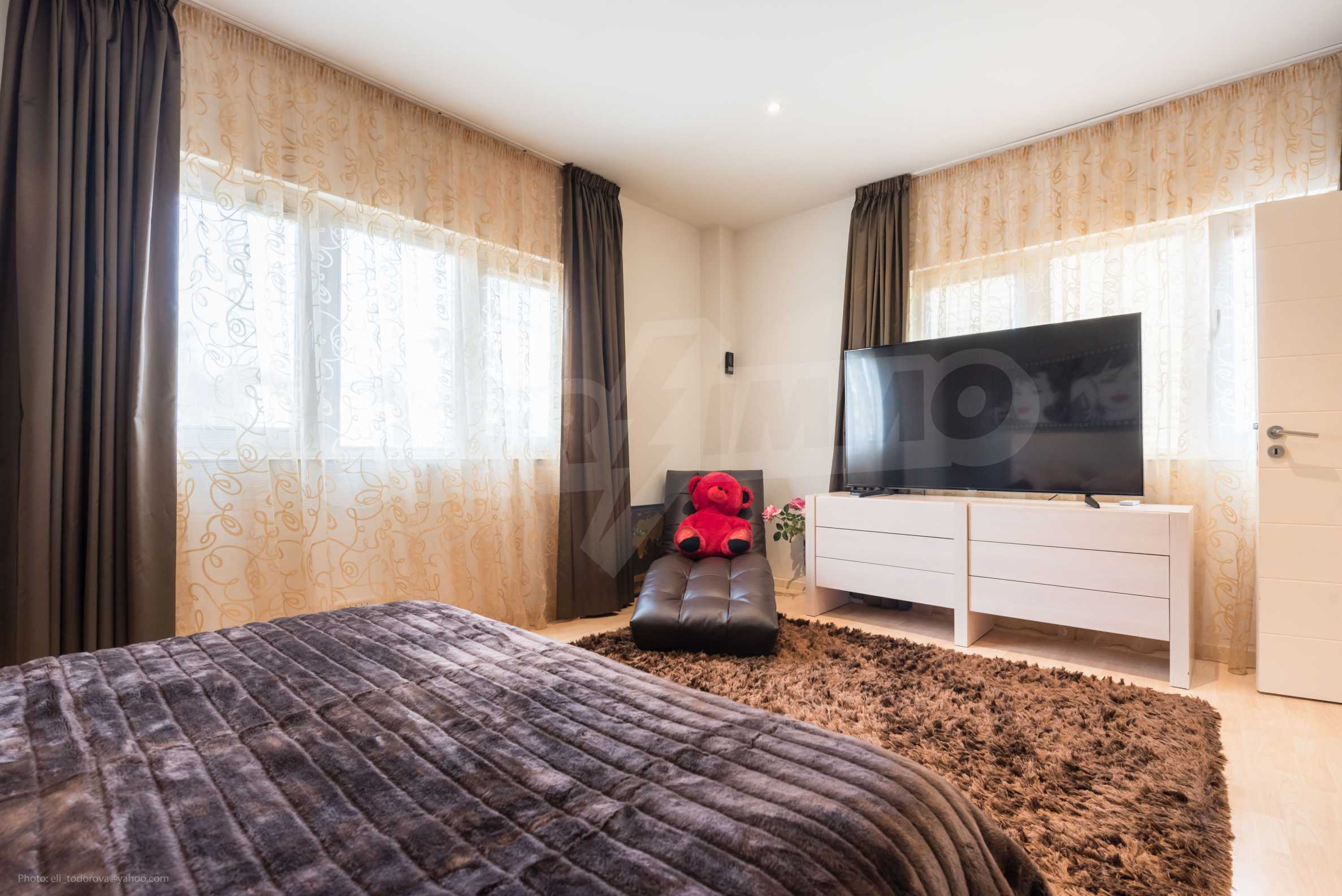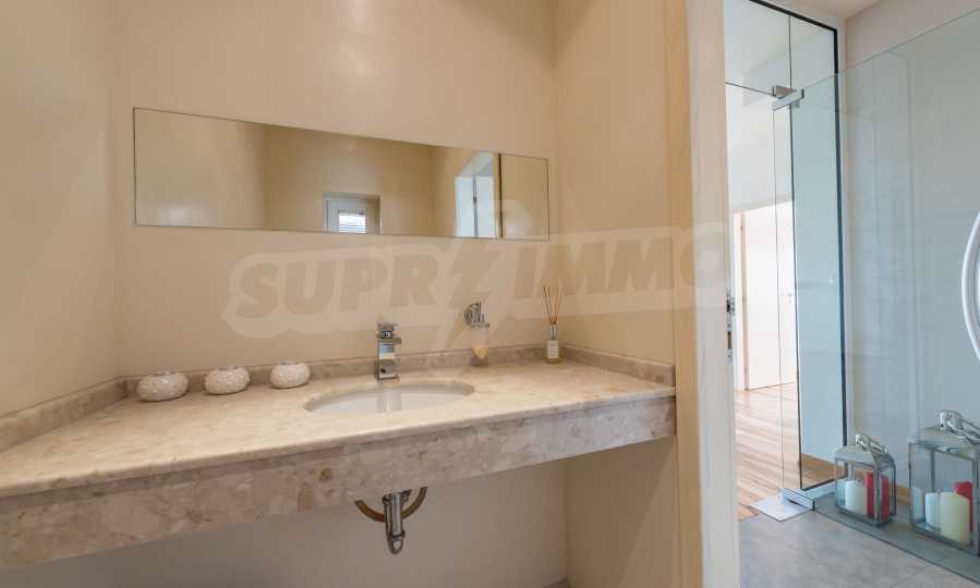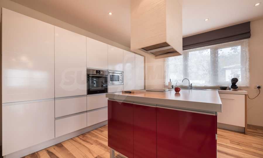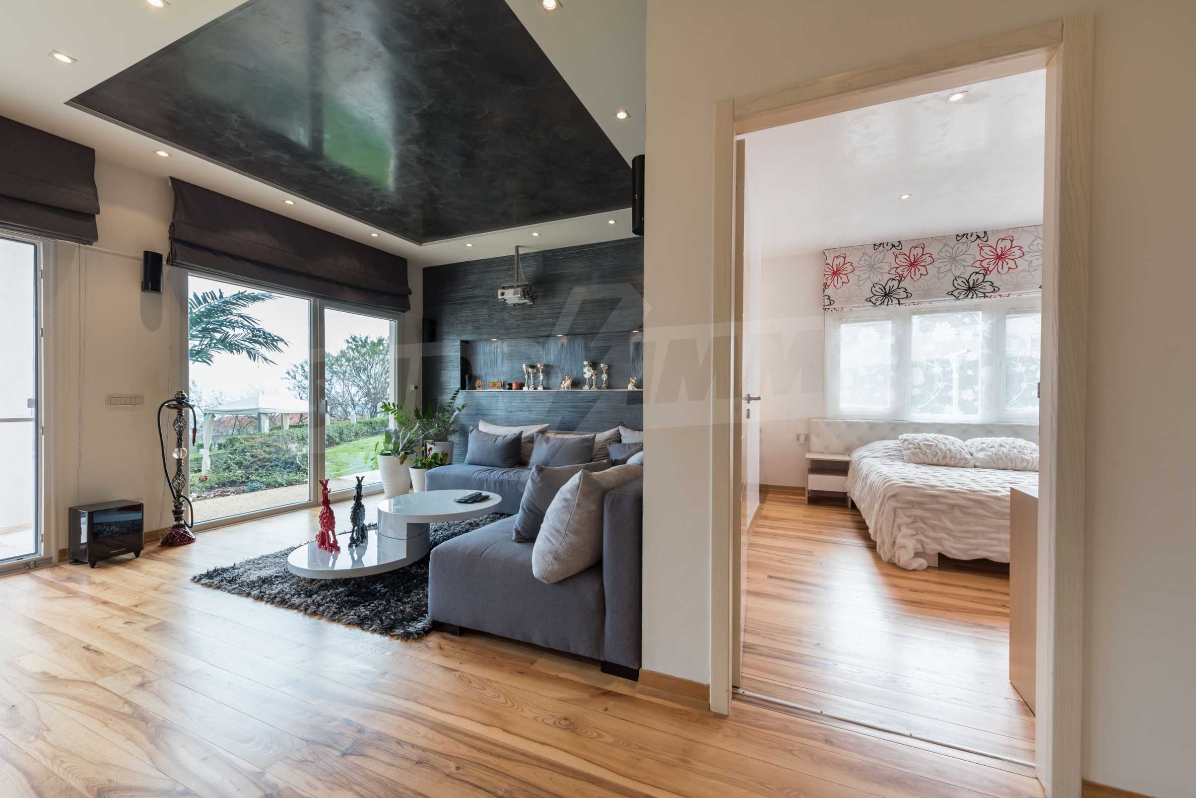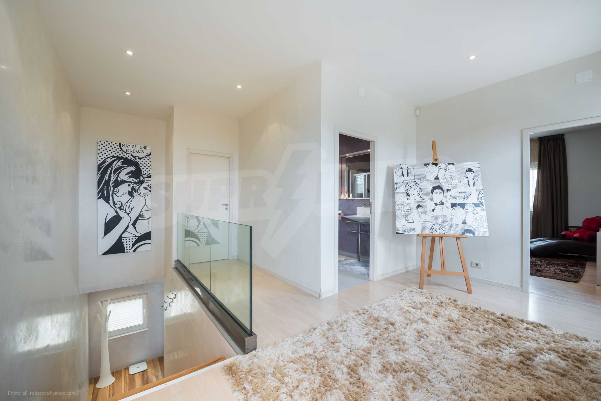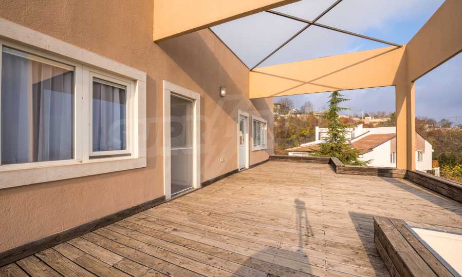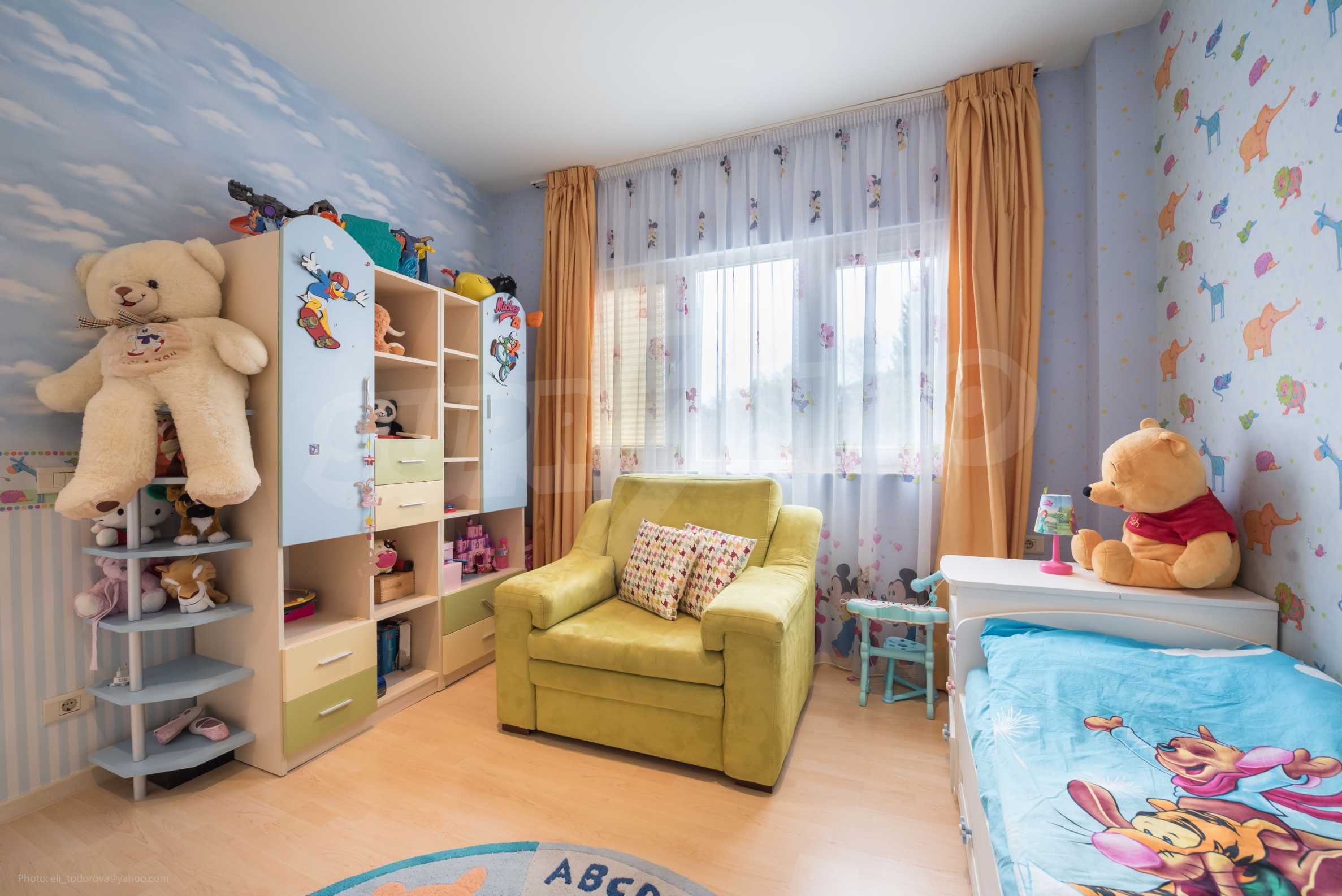 In the yard of the property on several levels are separate areas with a swimming pool with Jacuzzi / 80 cubic meters /, indoor summer kitchen, children's playground, fountain, sports area and parking with four parking spaces. Apart from the street access, there is a closed garage with an area of 120 square meters, which can accommodate six cars. For the convenience of the occupants and guests of the house, there is an outdoor bathroom with toilet and an outside shower by the pool. Near the pool there are sun loungers with umbrellas, as well as a sound central wireless system. The whole property is surrounded by a solid fence, stylishly designed garden and attractive lighting.