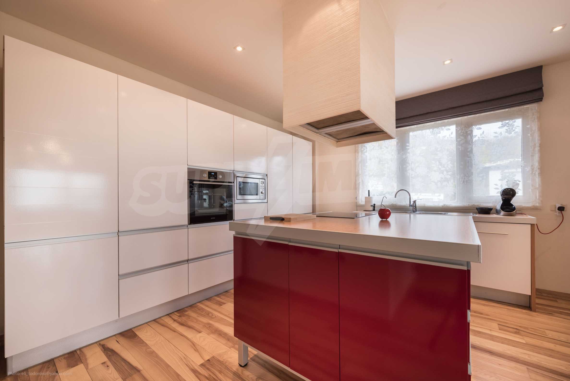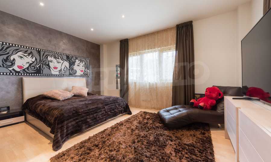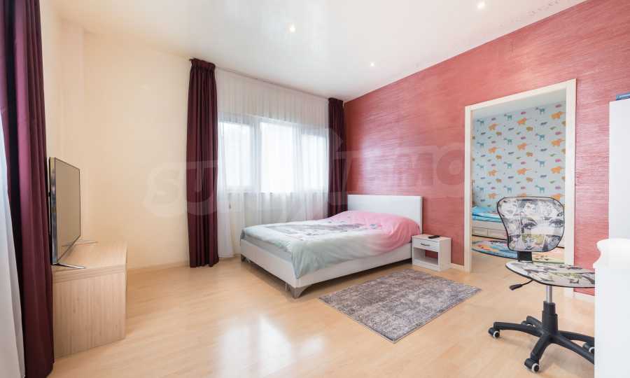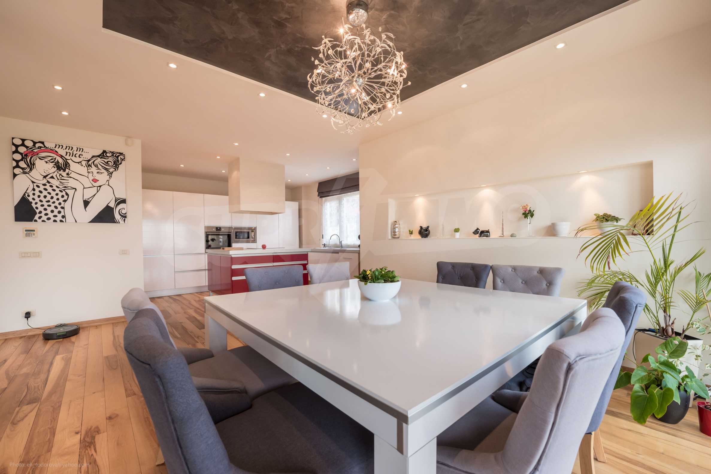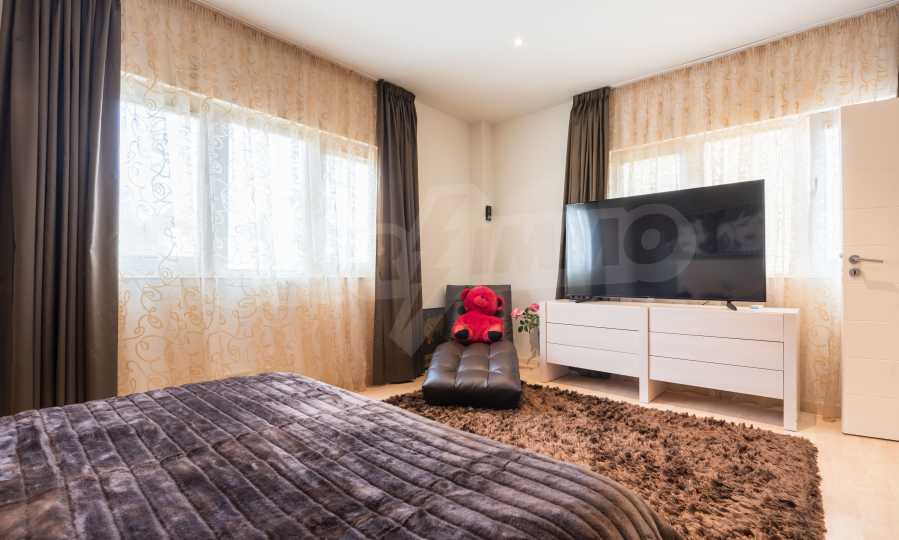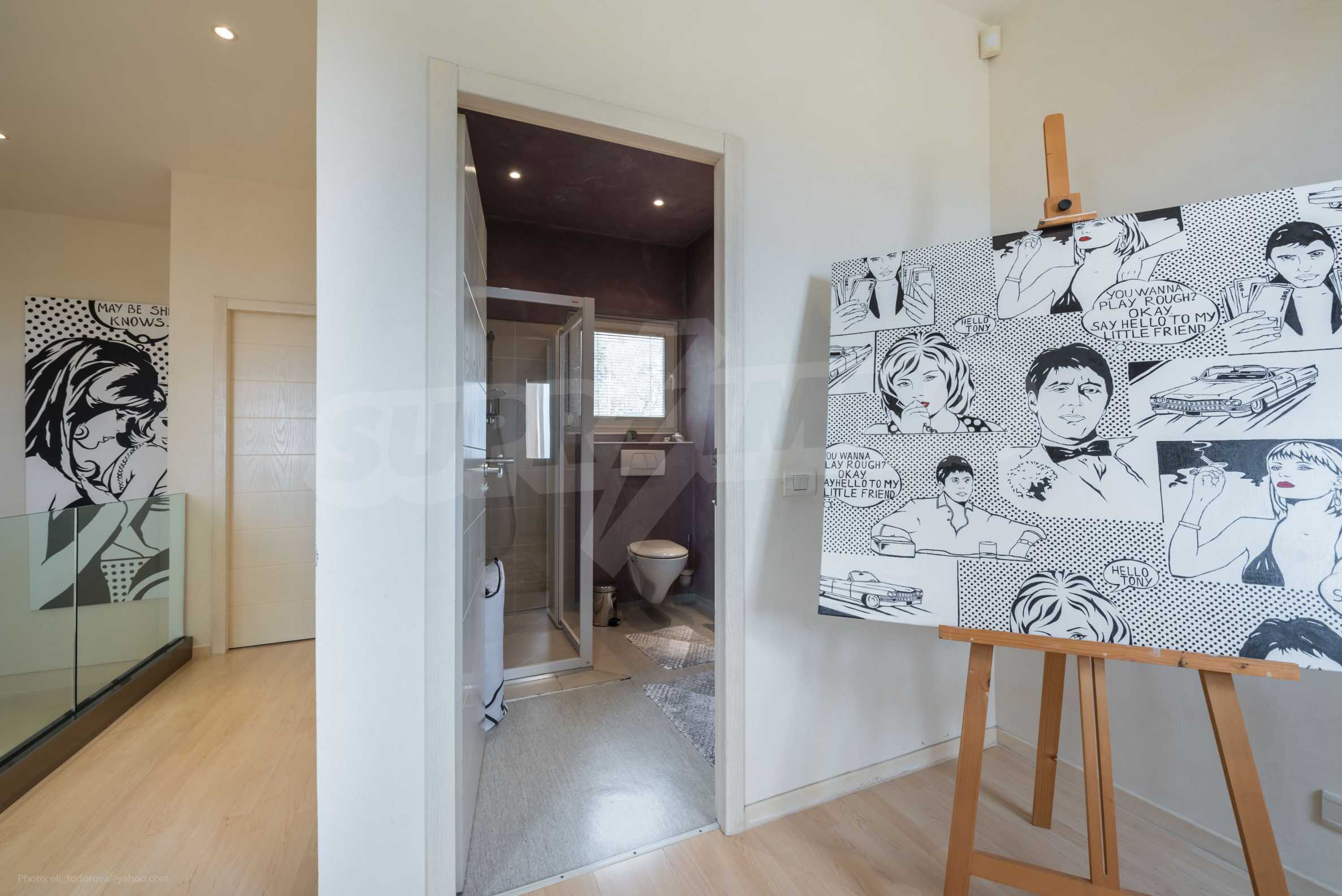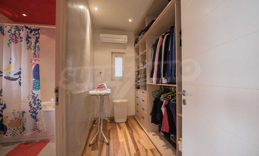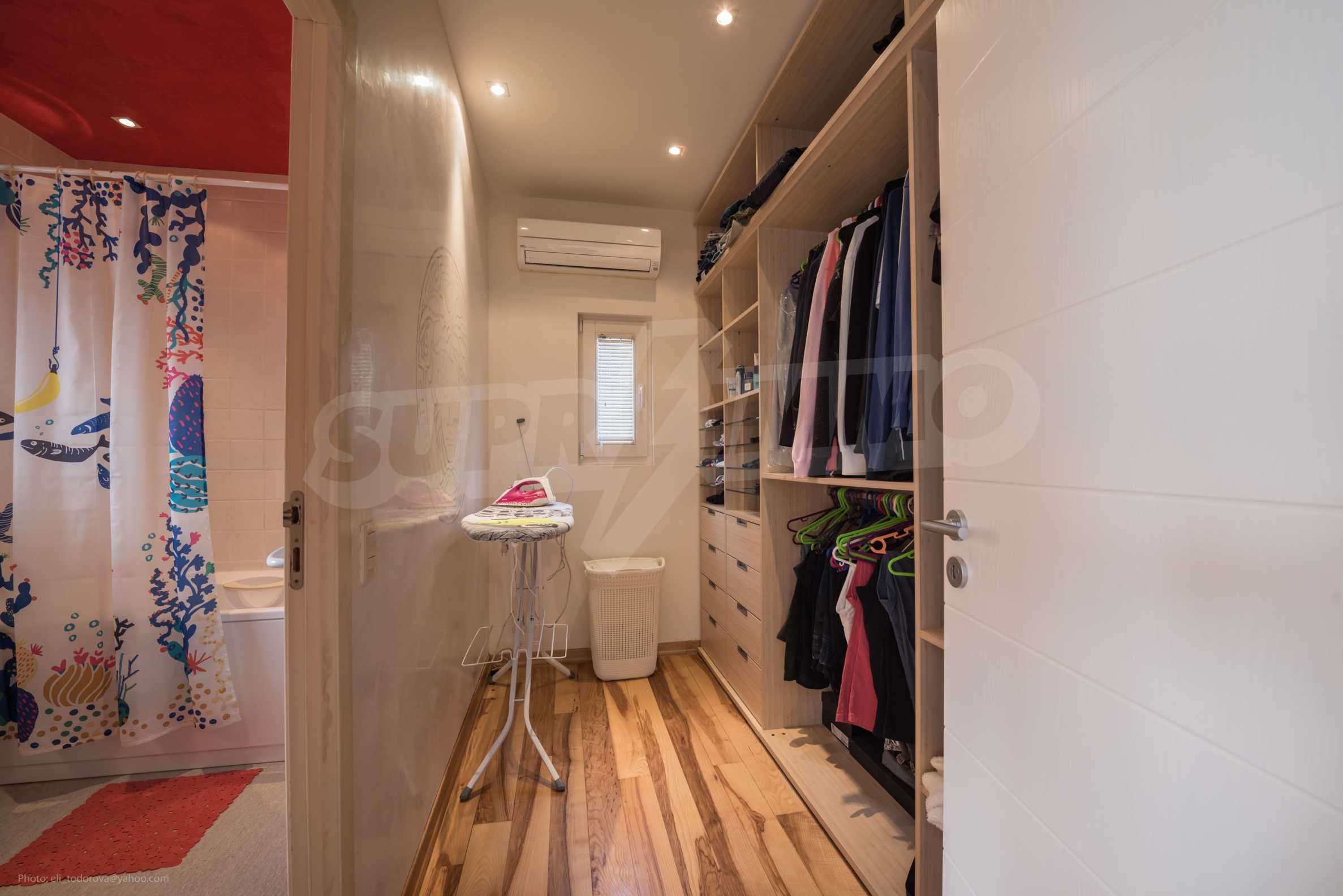 In the yard of the property on several levels are separate areas with a swimming pool with Jacuzzi / 80 cubic meters /, indoor summer kitchen, children's playground, fountain, sports area and parking with four parking spaces. Apart from the street access, there is a closed garage with an area of 120 square meters, which can accommodate six cars. For the convenience of the occupants and guests of the house, there is an outdoor bathroom with toilet and an outside shower by the pool. Near the pool there are sun loungers with umbrellas, as well as a sound central wireless system. The whole property is surrounded by a solid fence, stylishly designed garden and attractive lighting.