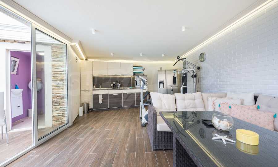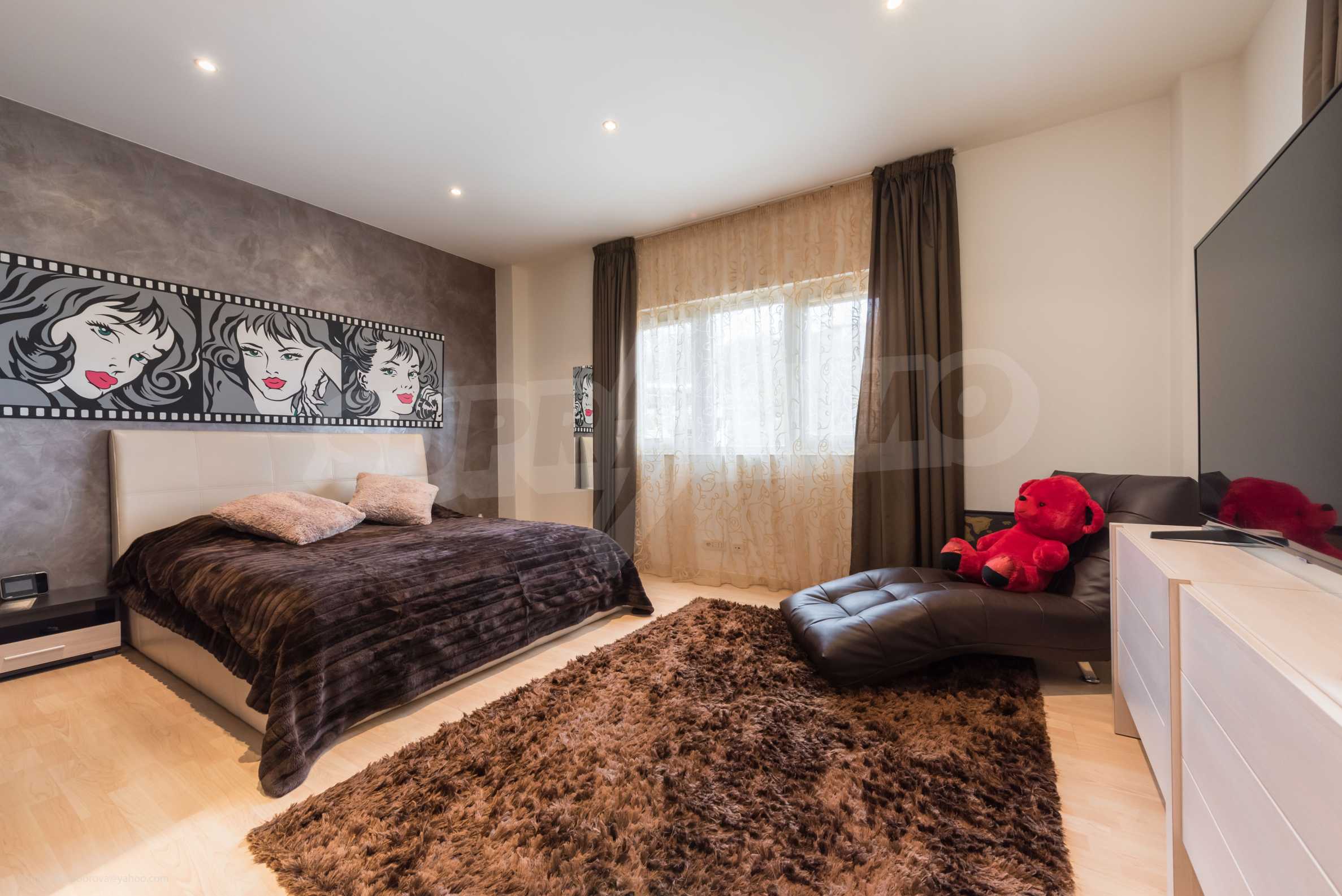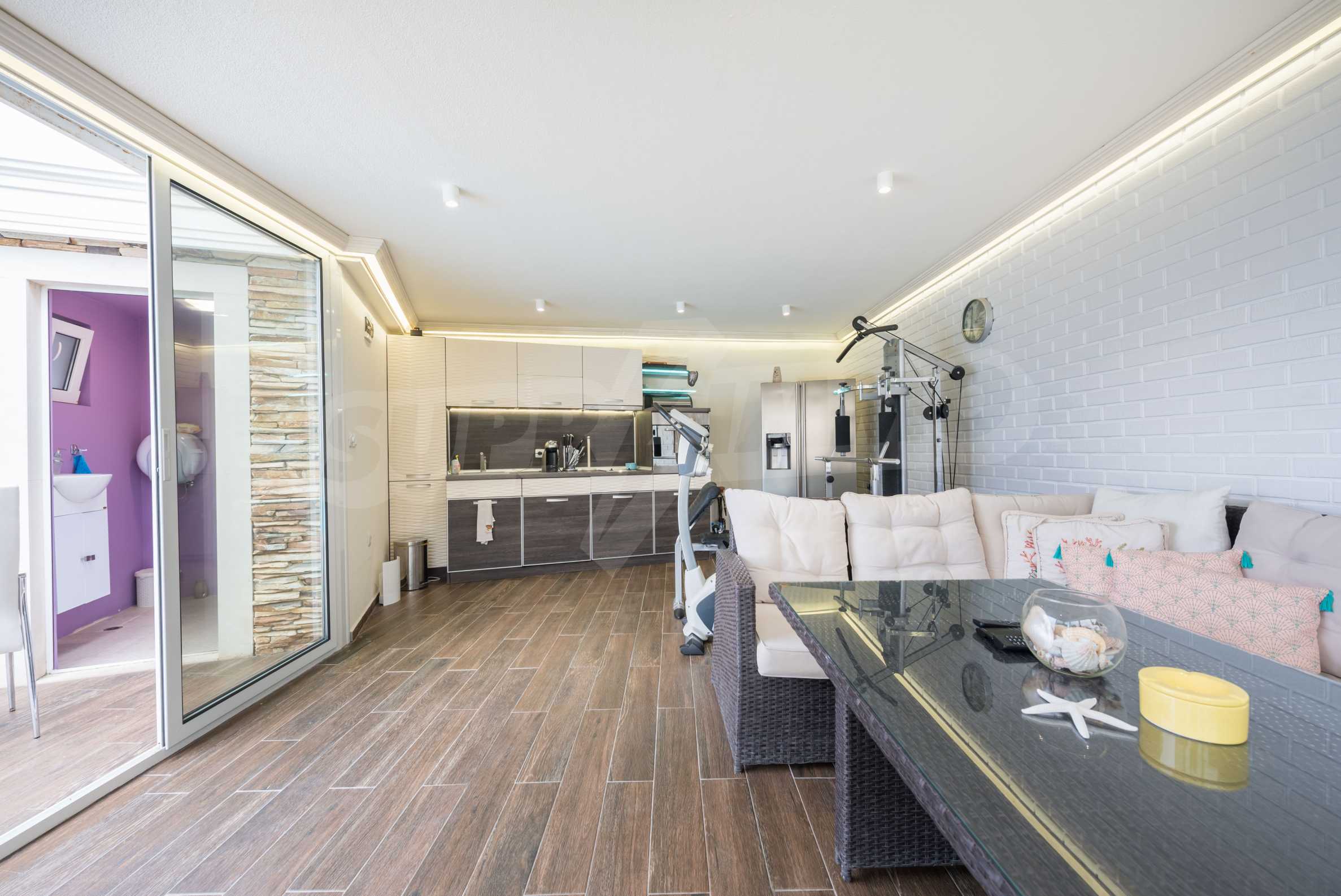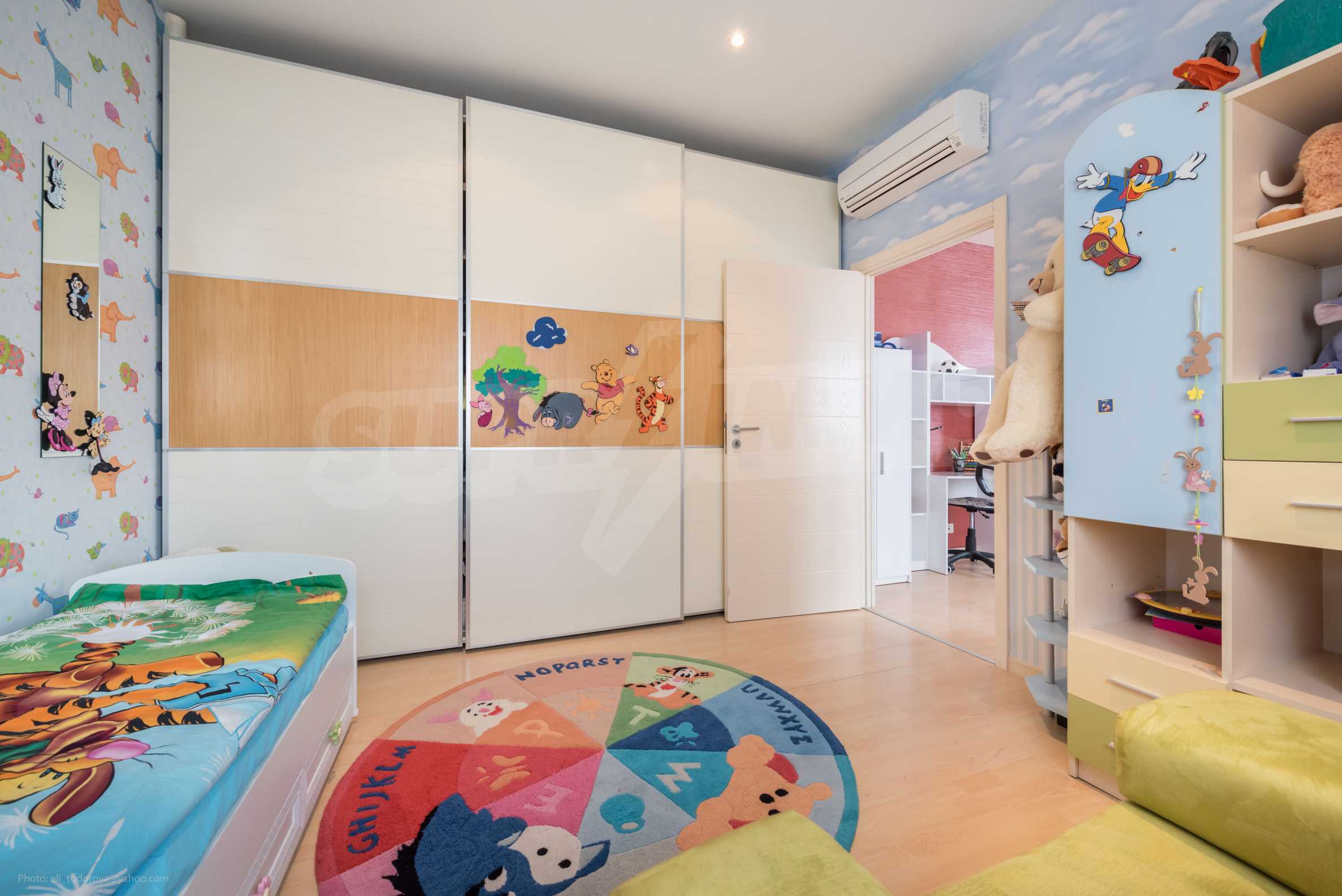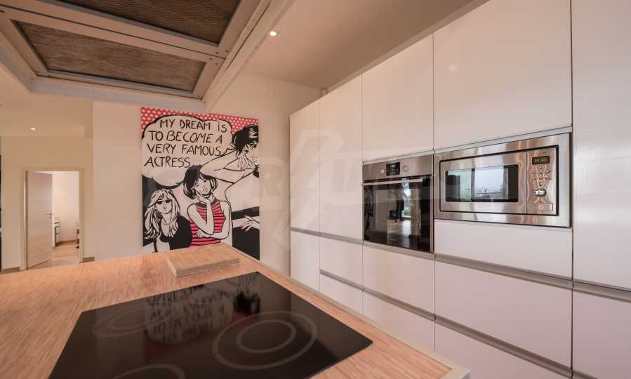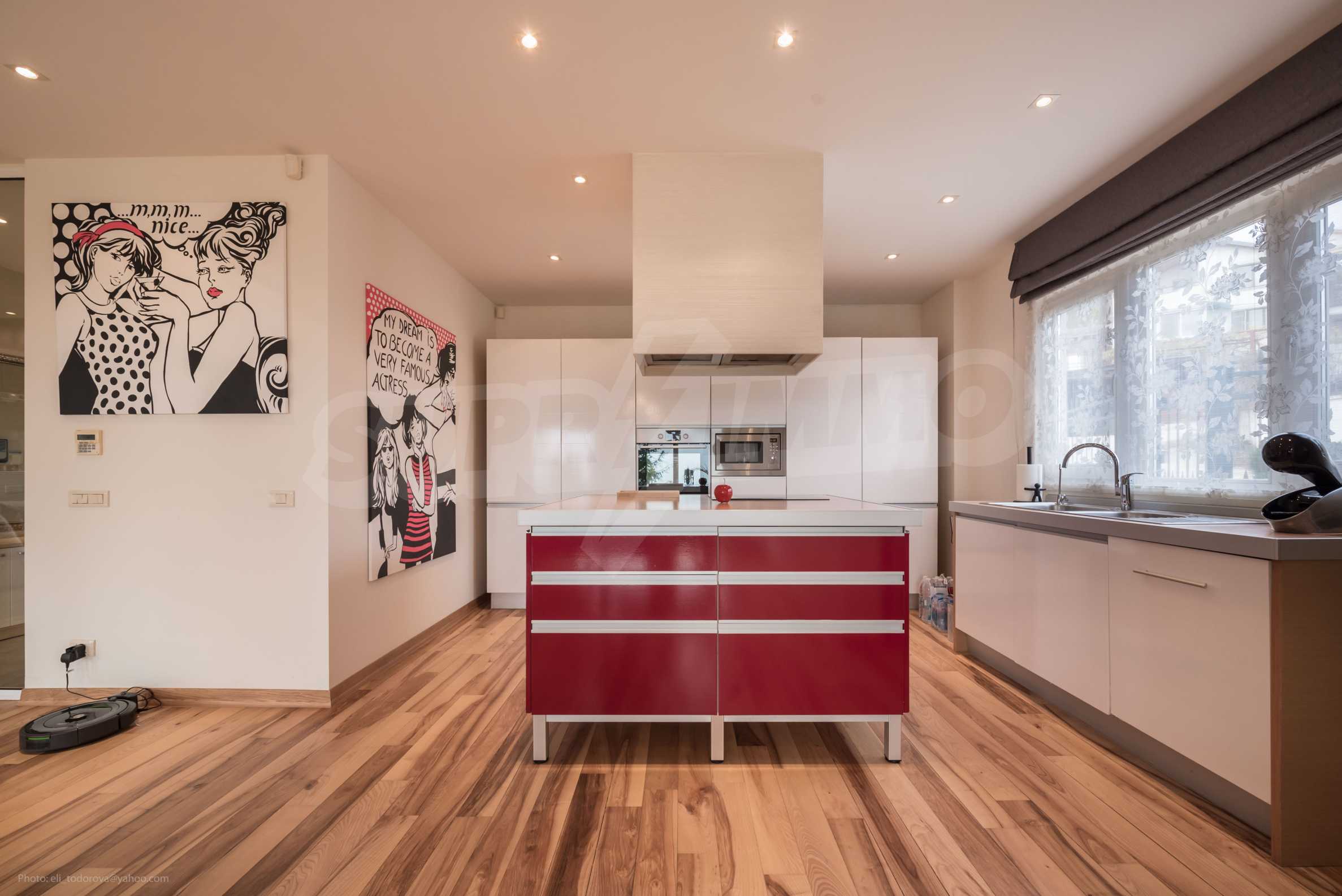 In the yard of the property on several levels are separate areas with a swimming pool with Jacuzzi / 80 cubic meters /, indoor summer kitchen, children's playground, fountain, sports area and parking with four parking spaces. Apart from the street access, there is a closed garage with an area of 120 square meters, which can accommodate six cars. For the convenience of the occupants and guests of the house, there is an outdoor bathroom with toilet and an outside shower by the pool. Near the pool there are sun loungers with umbrellas, as well as a sound central wireless system. The whole property is surrounded by a solid fence, stylishly designed garden and attractive lighting.