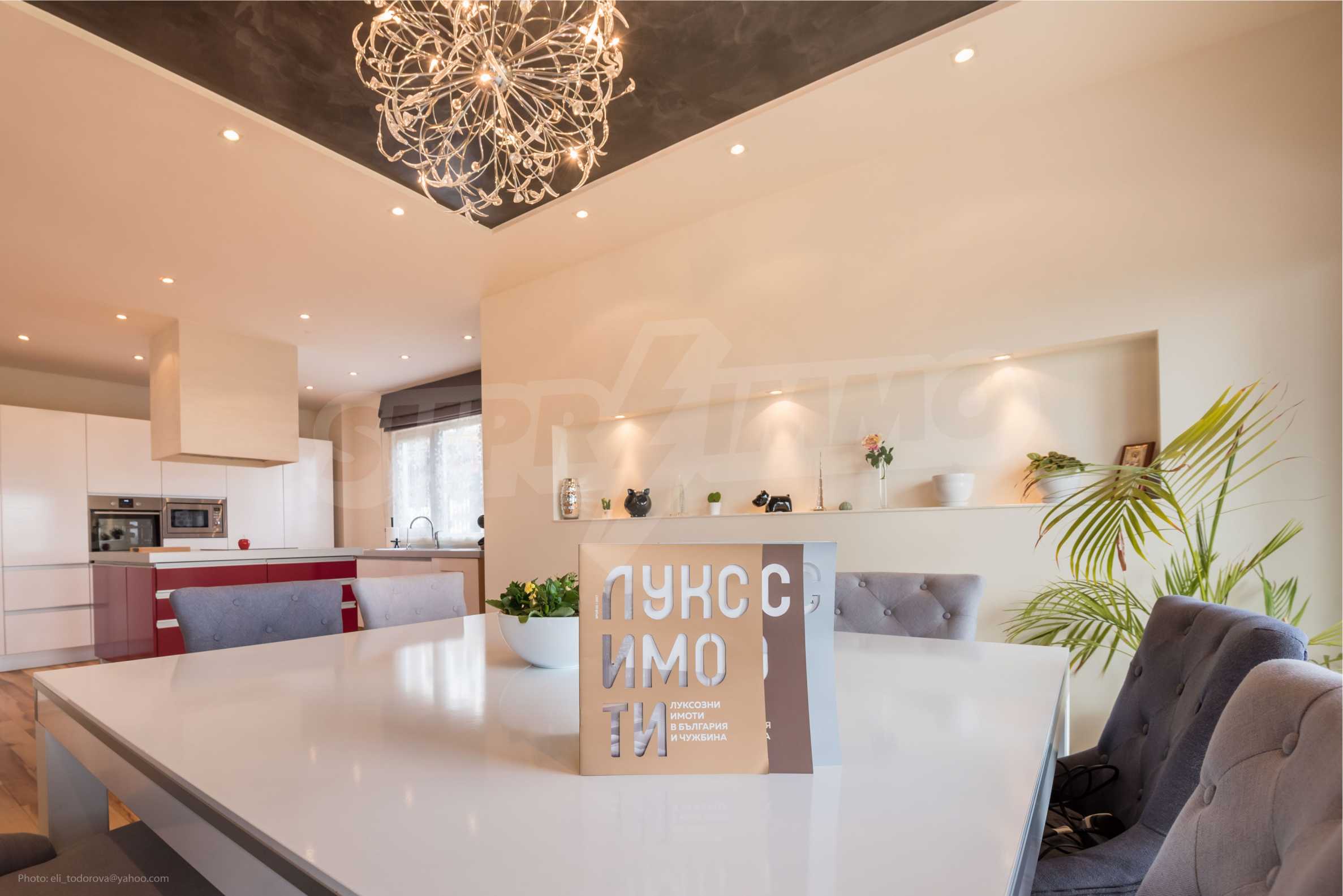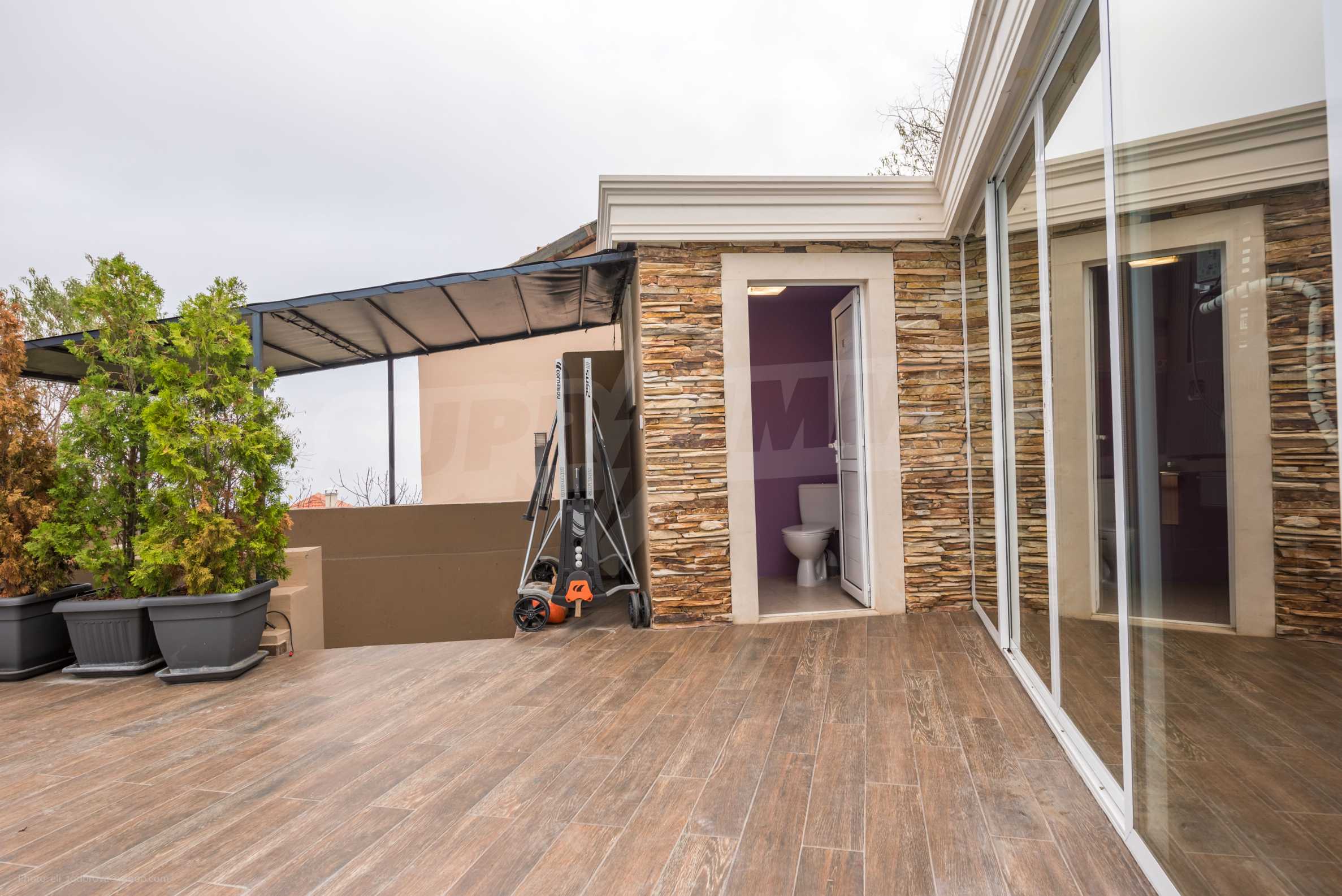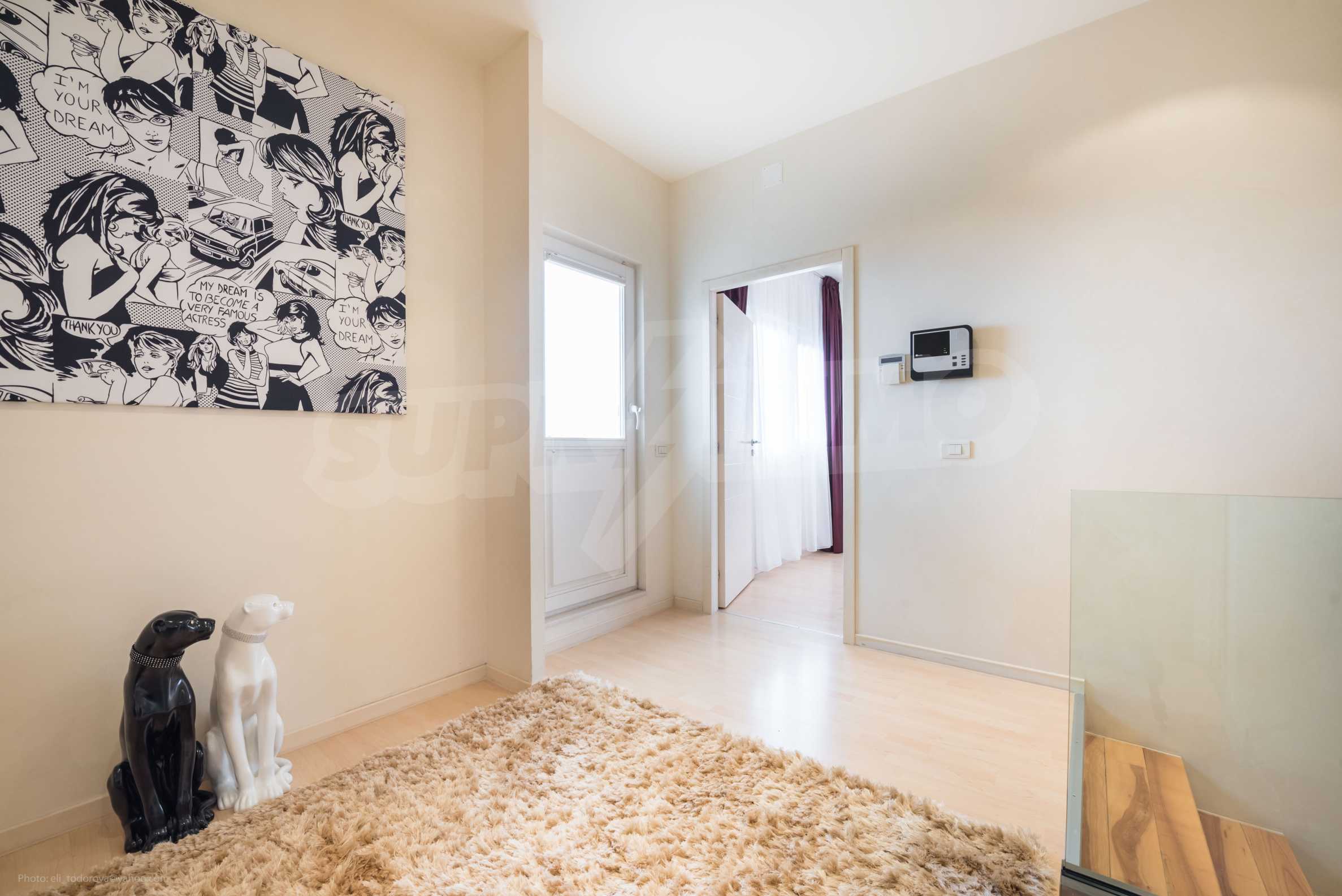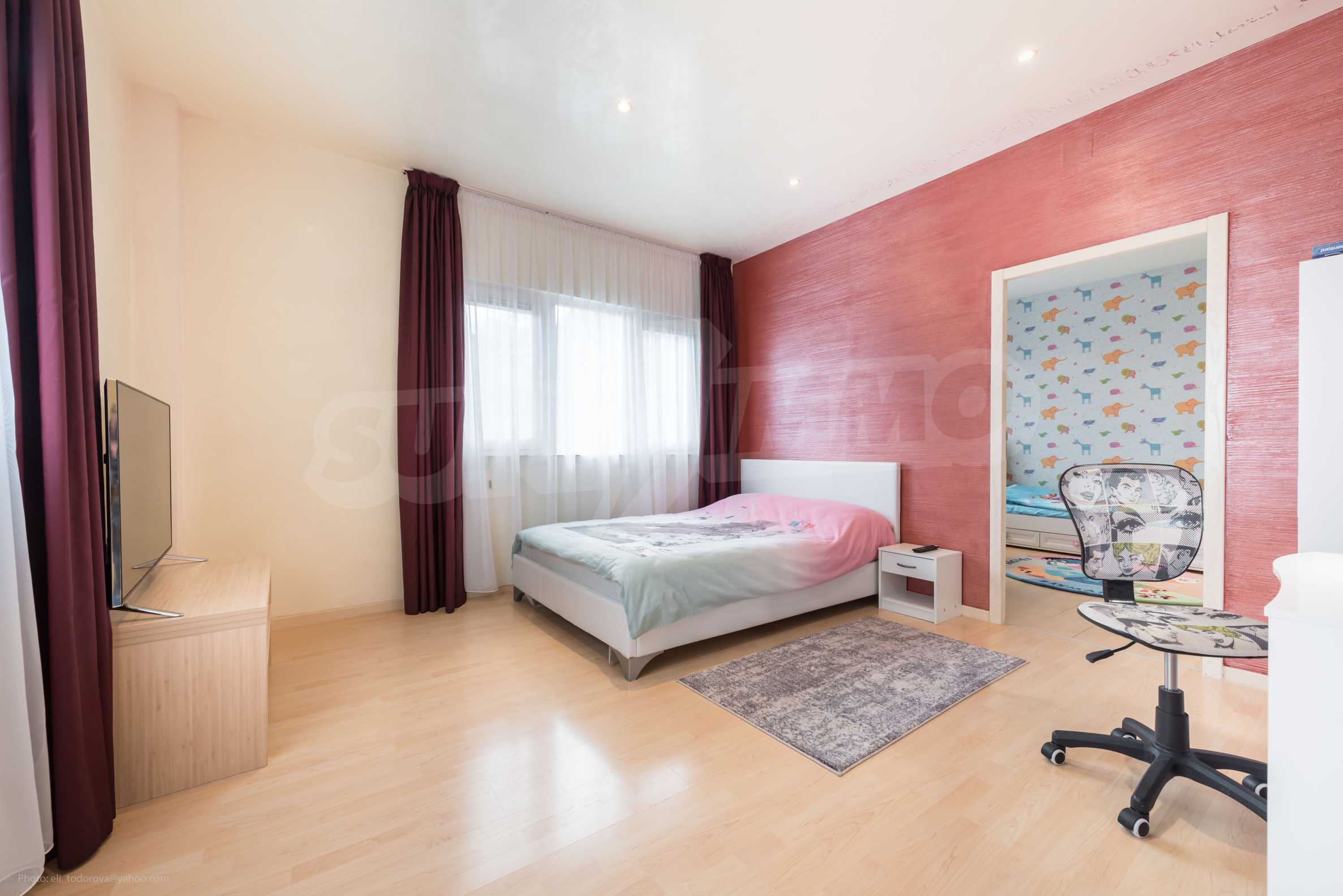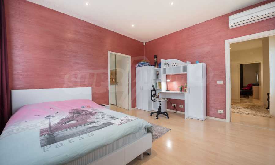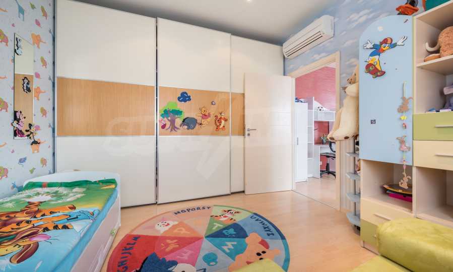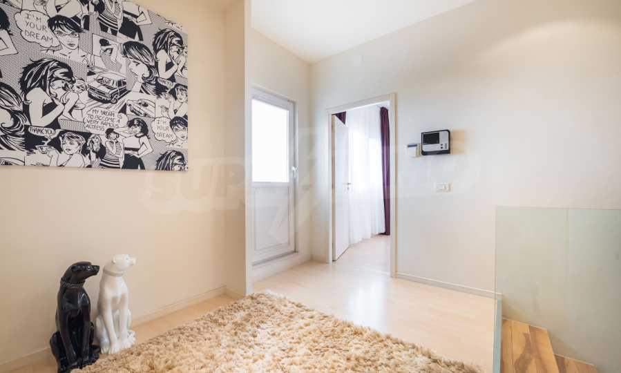 In the yard of the property on several levels are separate areas with a swimming pool with Jacuzzi / 80 cubic meters /, indoor summer kitchen, children's playground, fountain, sports area and parking with four parking spaces. Apart from the street access, there is a closed garage with an area of 120 square meters, which can accommodate six cars. For the convenience of the occupants and guests of the house, there is an outdoor bathroom with toilet and an outside shower by the pool. Near the pool there are sun loungers with umbrellas, as well as a sound central wireless system. The whole property is surrounded by a solid fence, stylishly designed garden and attractive lighting.