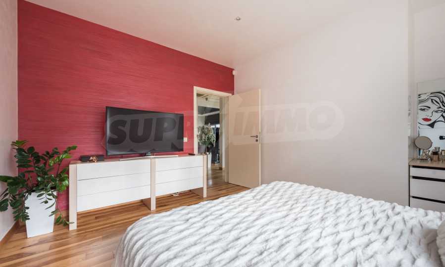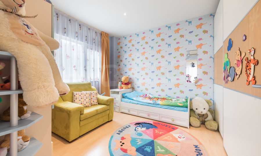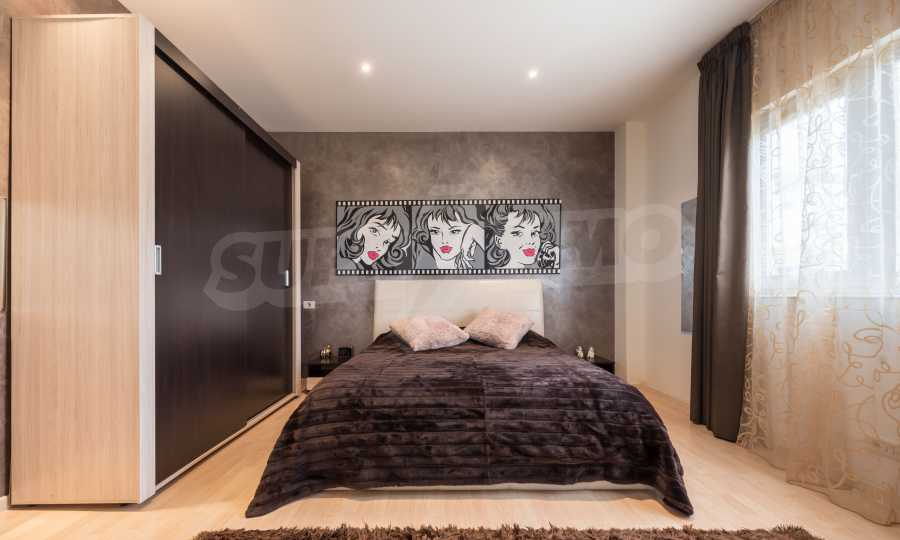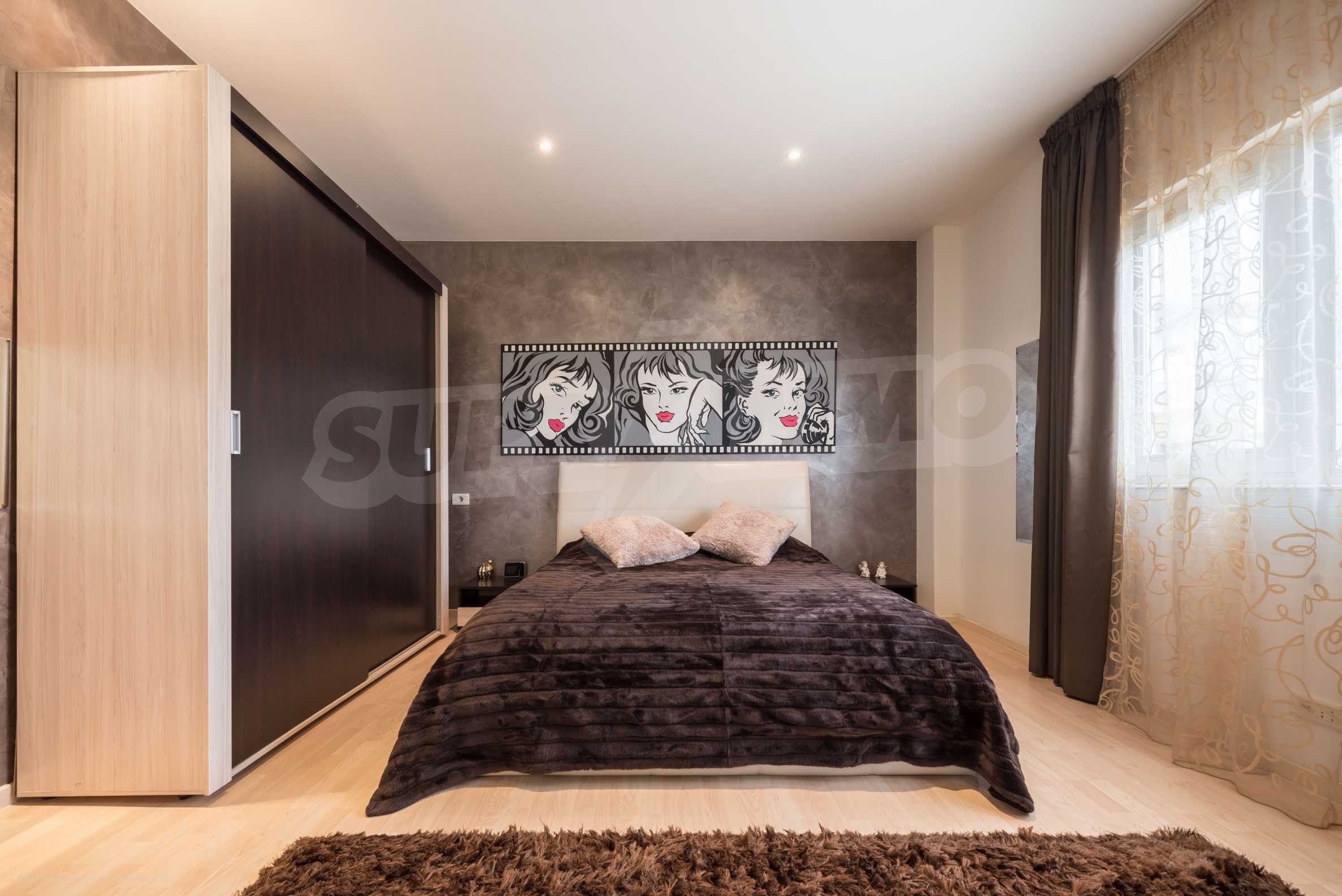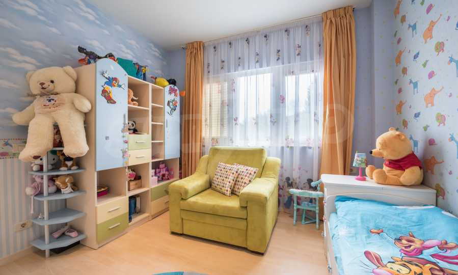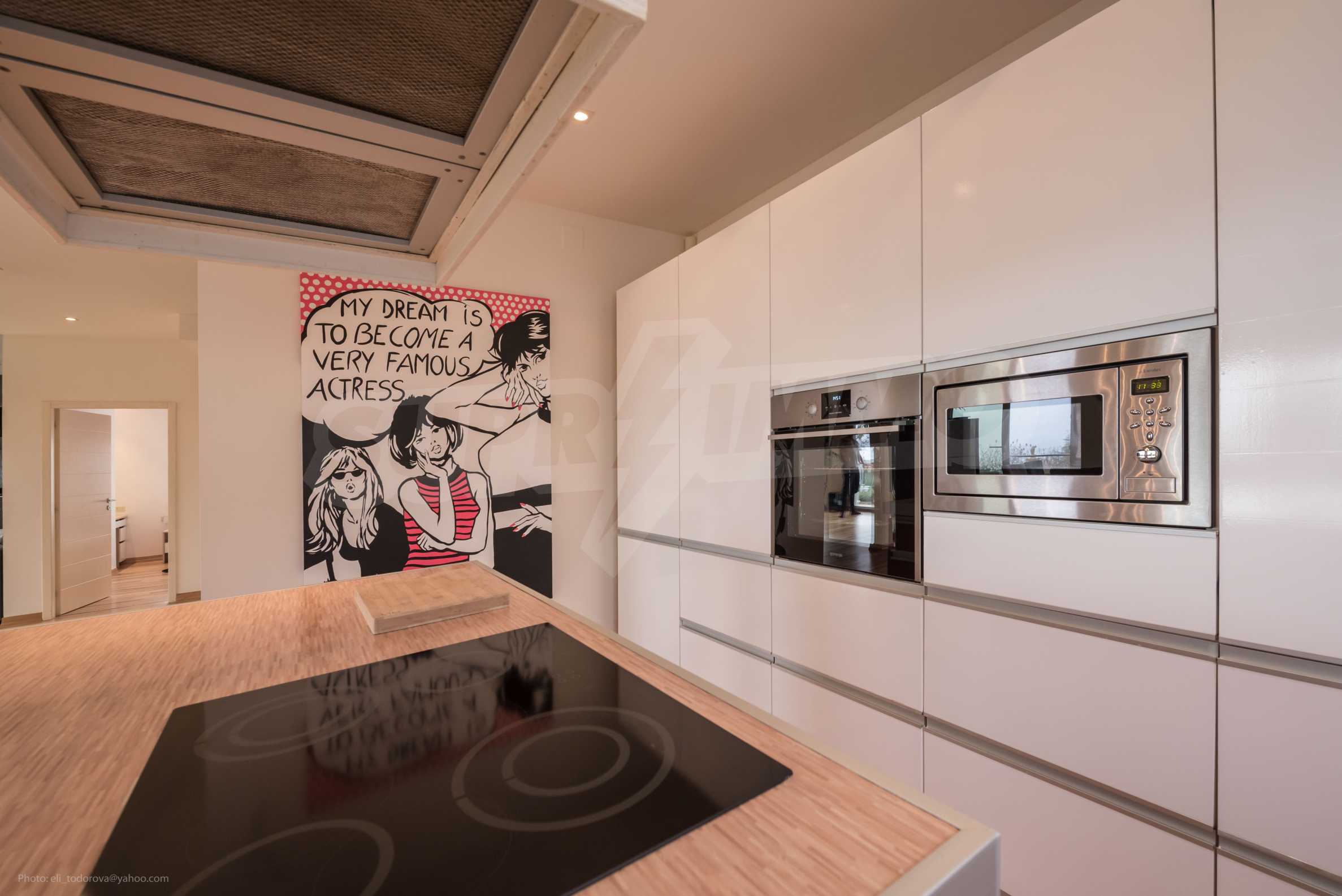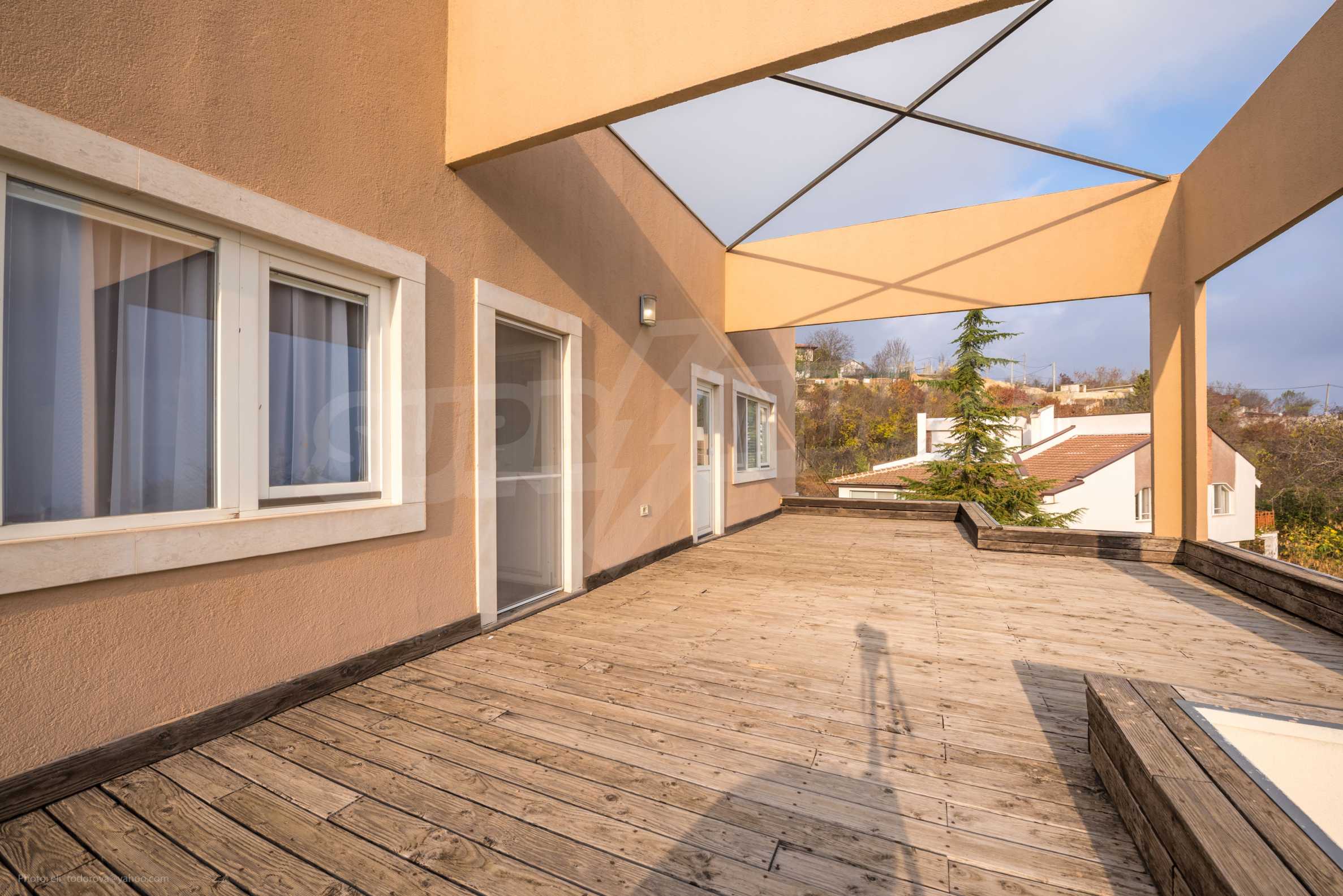 In the yard of the property on several levels are separate areas with a swimming pool with Jacuzzi / 80 cubic meters /, indoor summer kitchen, children's playground, fountain, sports area and parking with four parking spaces. Apart from the street access, there is a closed garage with an area of 120 square meters, which can accommodate six cars. For the convenience of the occupants and guests of the house, there is an outdoor bathroom with toilet and an outside shower by the pool. Near the pool there are sun loungers with umbrellas, as well as a sound central wireless system. The whole property is surrounded by a solid fence, stylishly designed garden and attractive lighting.