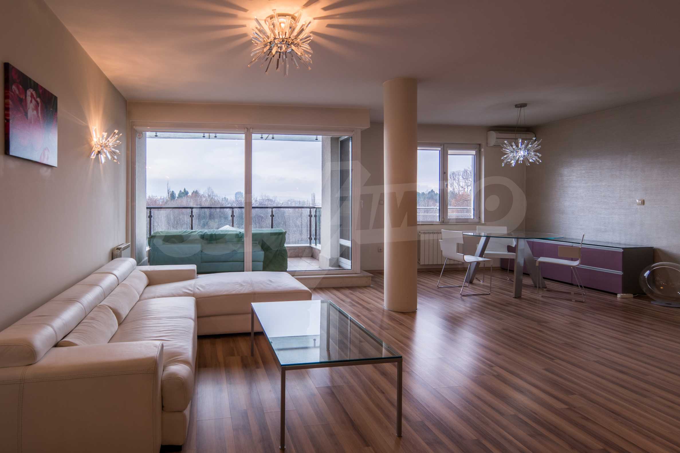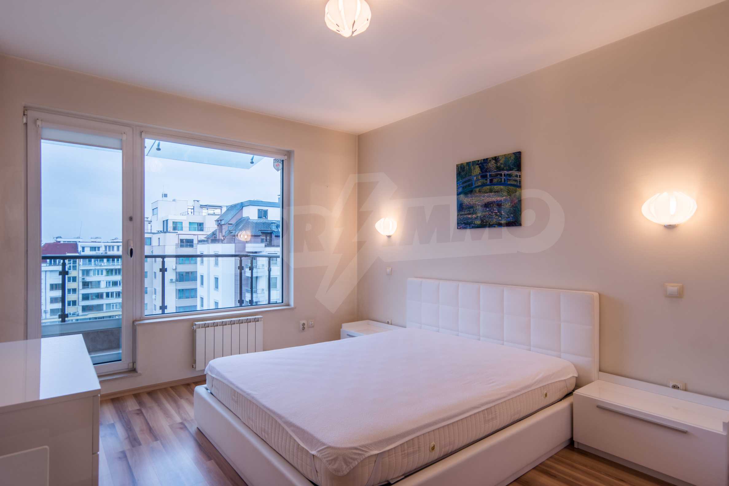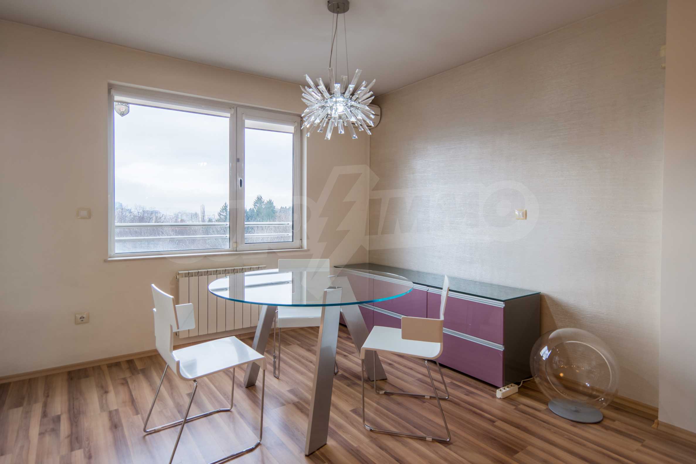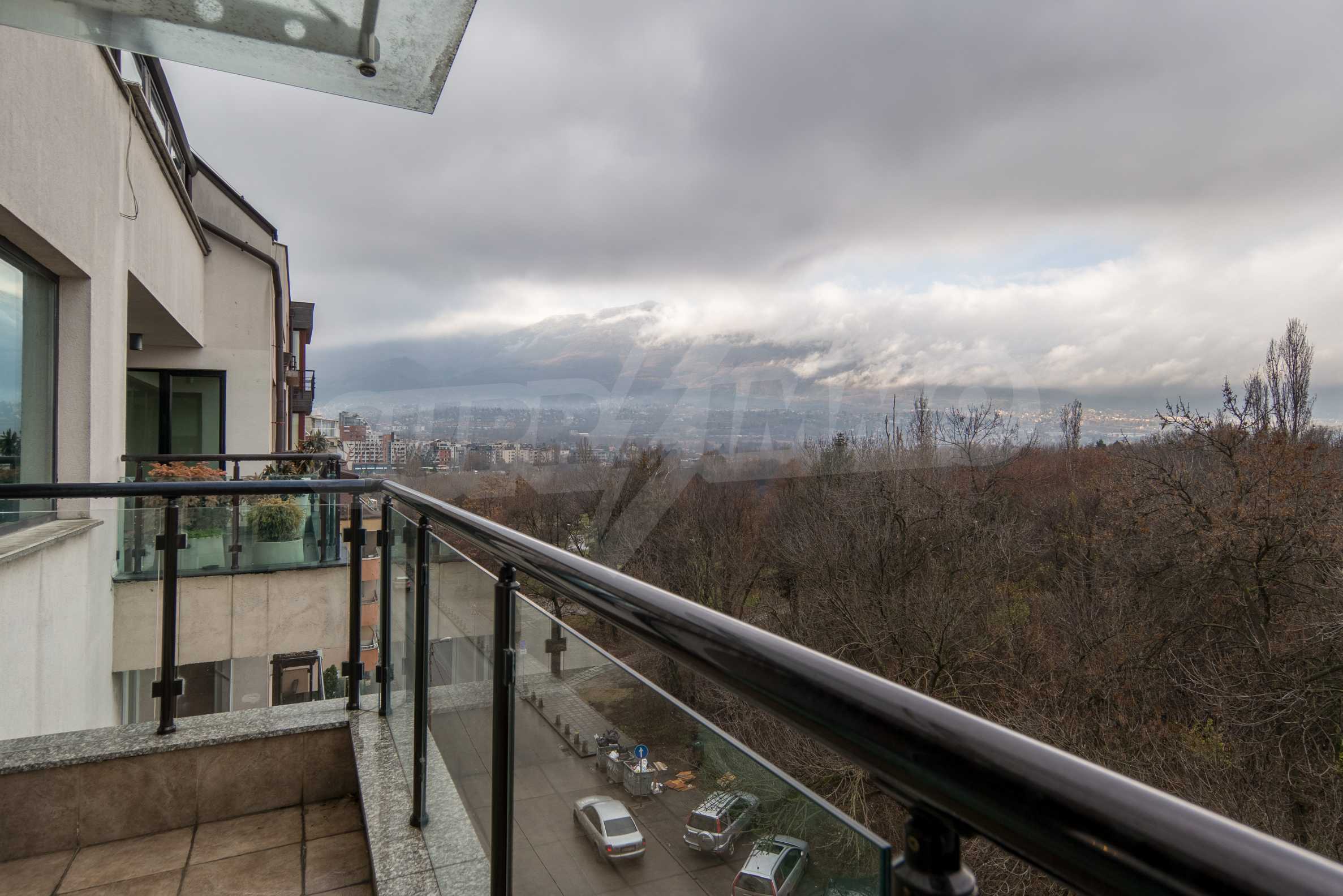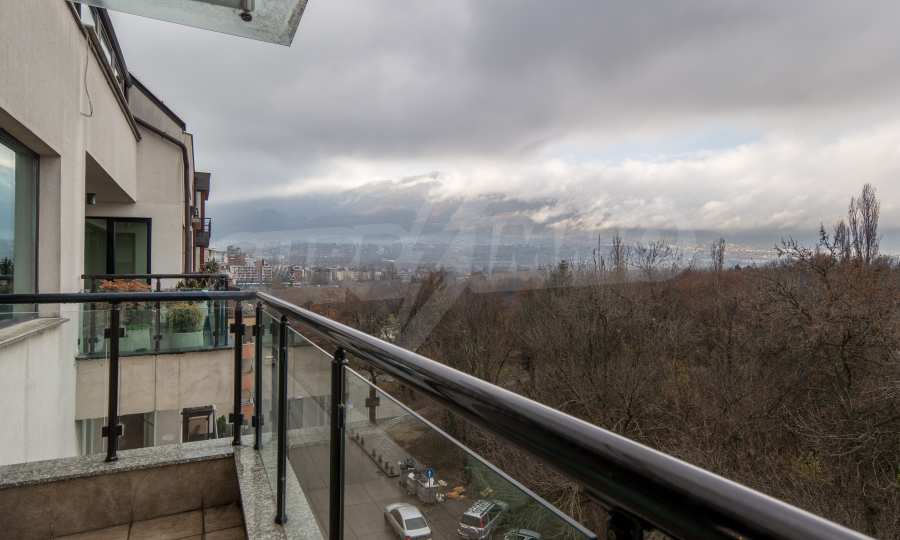 The apartment has an area of 134 m2 and has the following layout: a spacious living room with dining area and kitchenette equipped with everything needed for the tenants' comfort; a spacious terrace with sofas with spectacular views of South Park and Vitosha, a master bedroom with bath and toilet; second bedroom with terrace, bathroom with toilet.