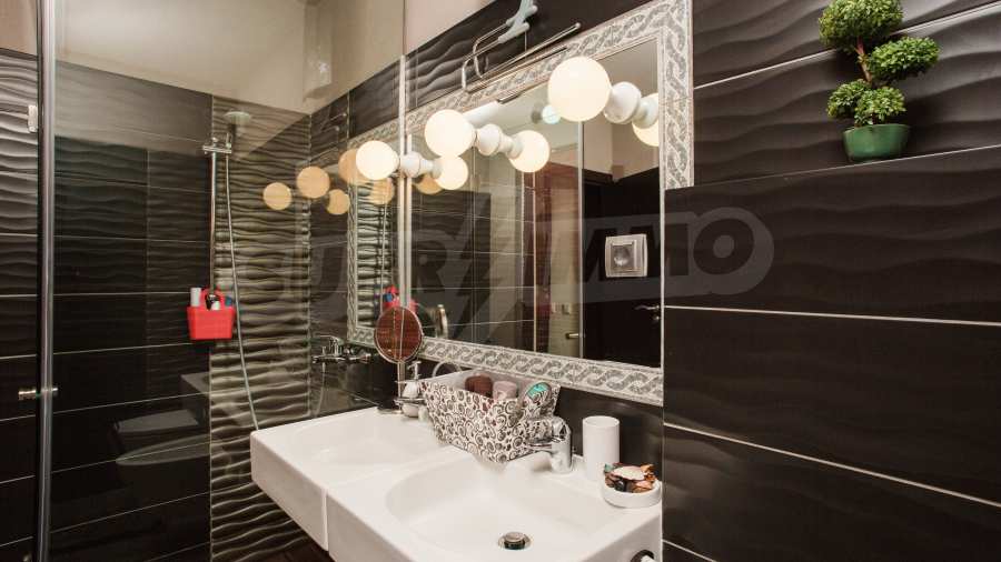• Баня и тоалетна: интериорни врати водонепроницаеми; полу - секретна ключалка; напълно покрити с керамични плочки, на светли цветове; таваните са боядисани с водоустойчива бяла боя латекс;