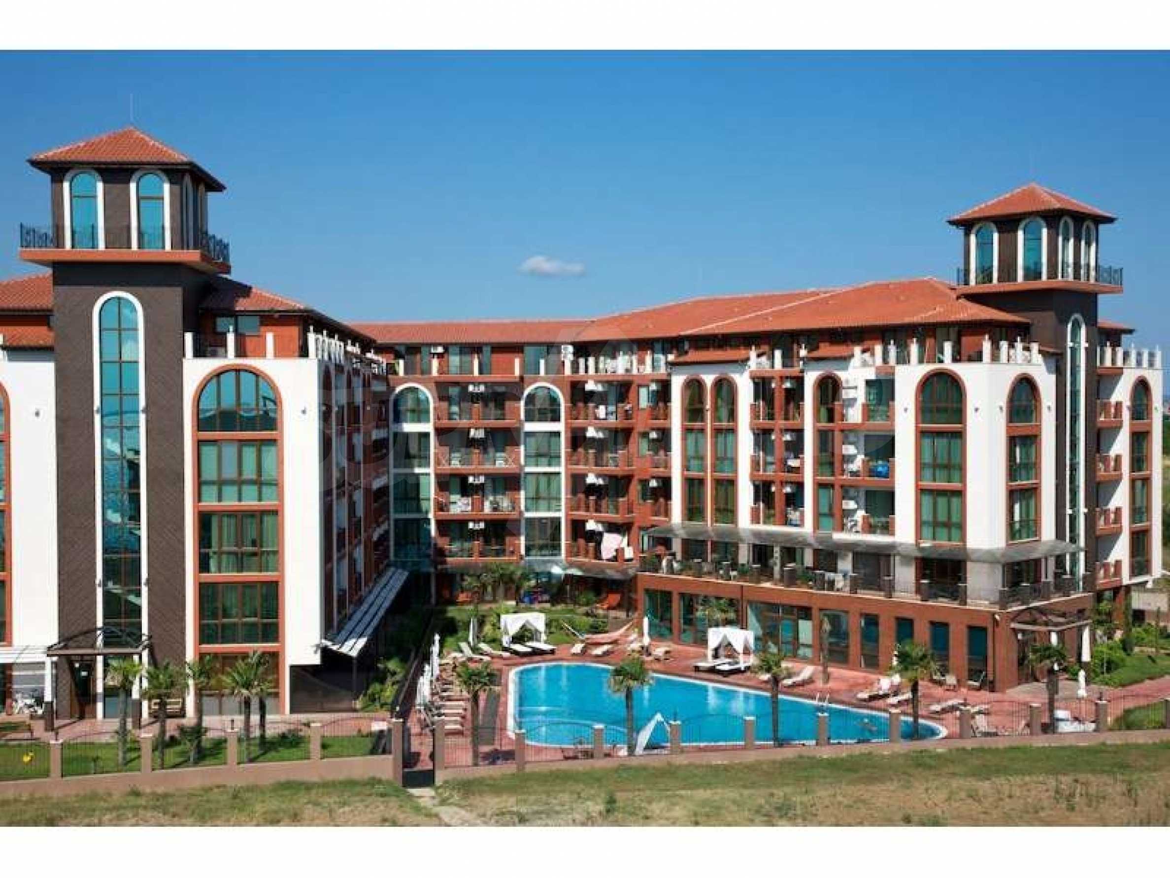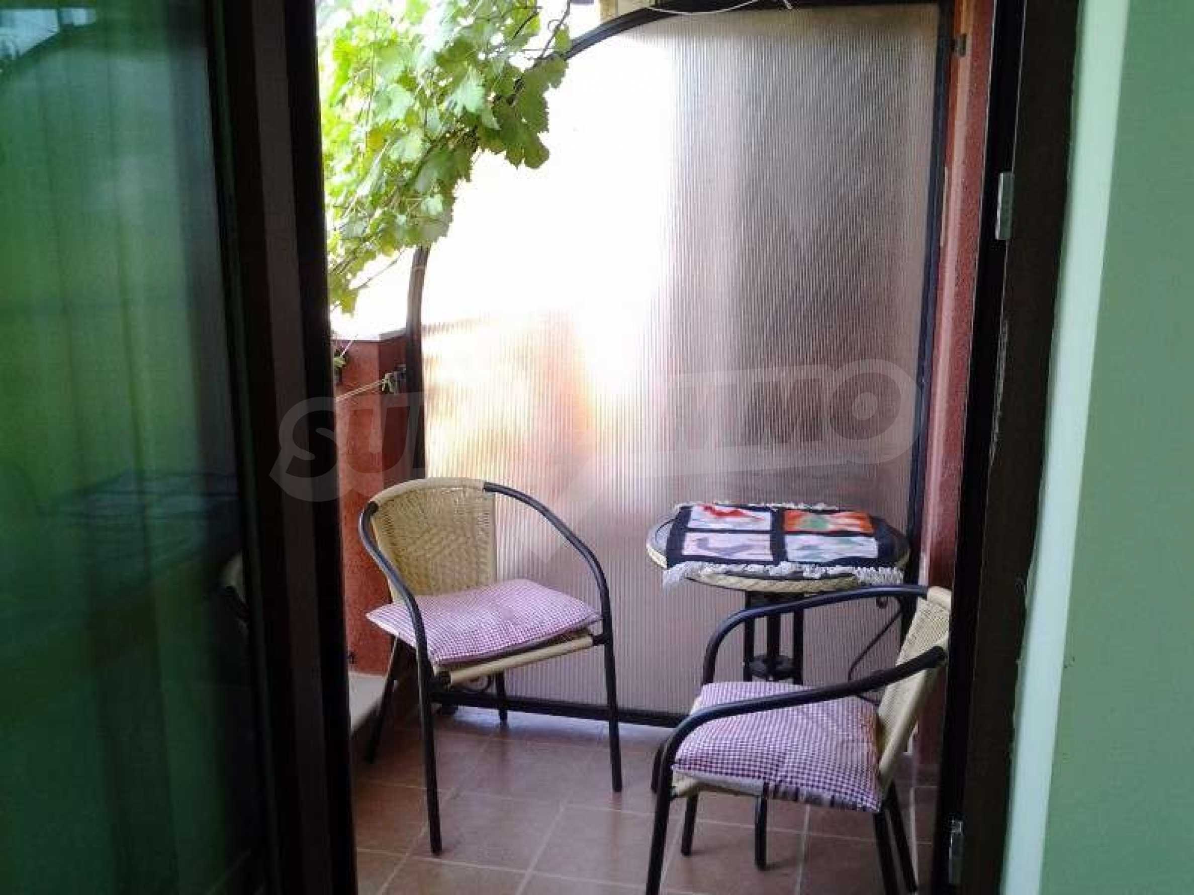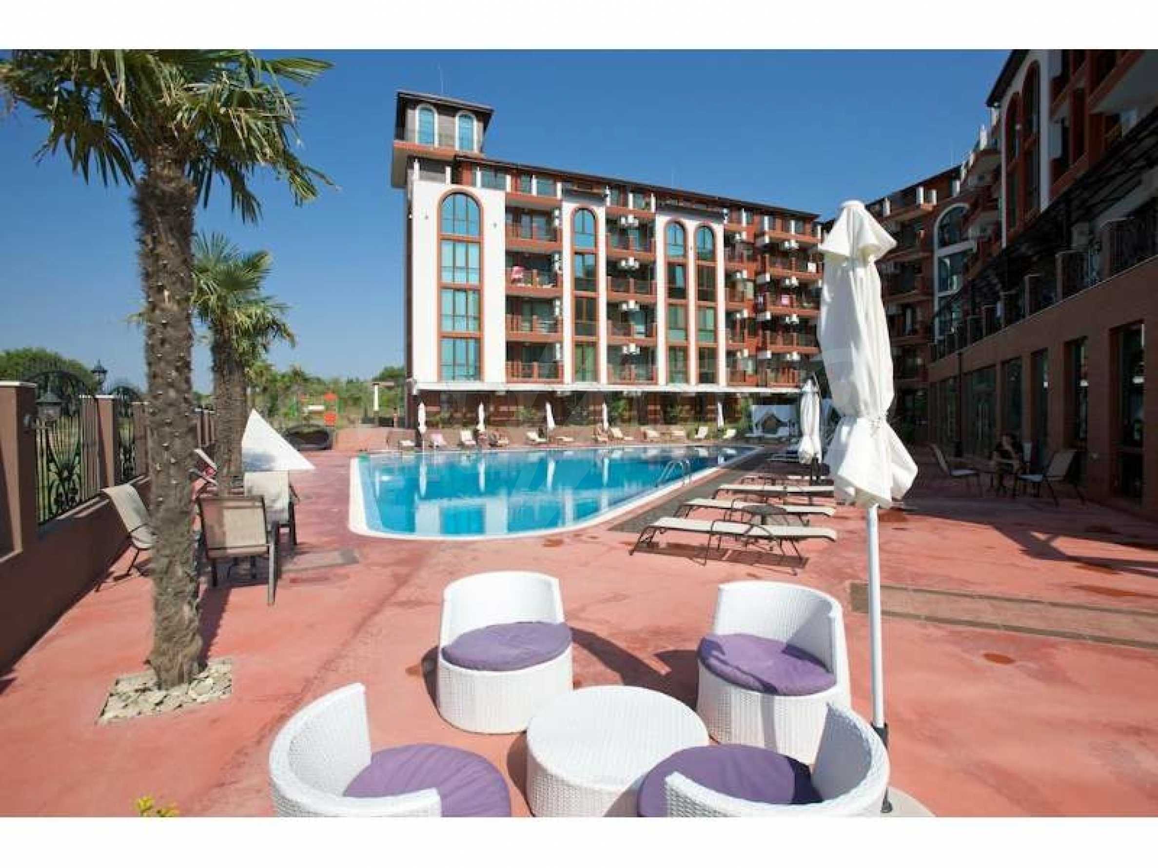 Studio for sale in Chateau Del Marina in Nessebar. The complex is located on the first line to the beach. The total area of the studio is 47,85 sq.m. and is for sale furnished and equipped with everything you need, air conditioning, cable TV, Internet and security system. The terrace has a partial sea view. beach, offers its guests an outdoor swimming pool with sun loungers and children's section, reception, lobby bar, playground, parking, 24-hour security. Maintenance fee - 10 euro \ /sq.m.
