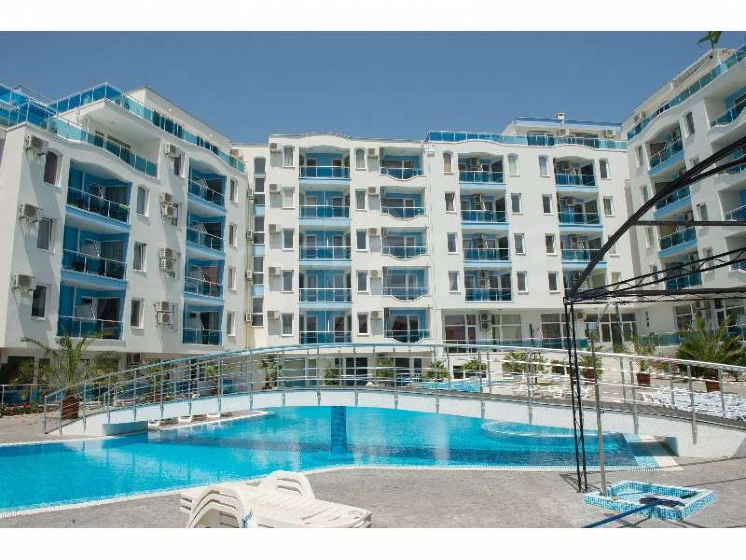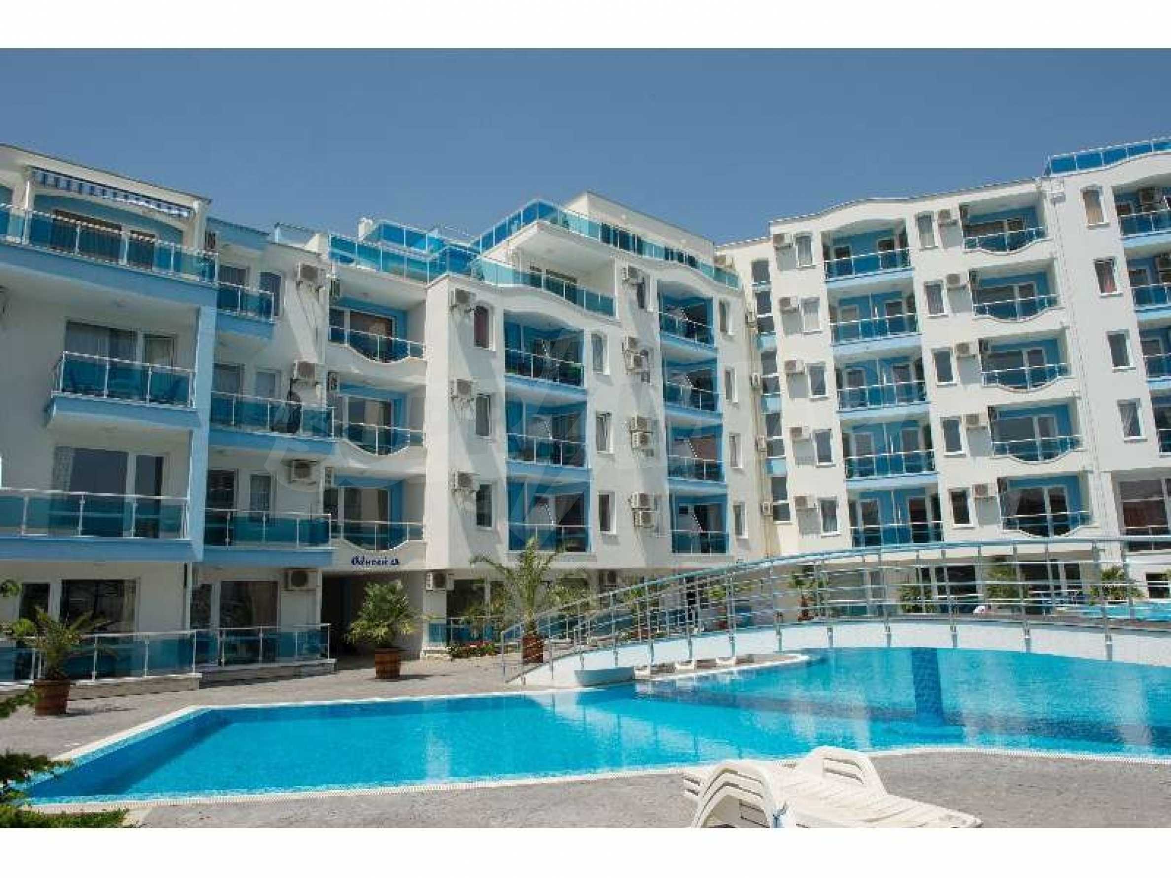 Studio for sale in Odyssey Complex, Nessebar. Area - 31 m2, basement, furnished. Odyssey Complex is located about 150 m from the beach in Kokalu area. The complex has 24-hour security and video surveillance. On the territory there are three swimming pools, a shop, a restaurant, a fitness room, a spa center with baths and jacuzzi, a playground, parking. Maintenance fee - 8 EUR / m2 per year.