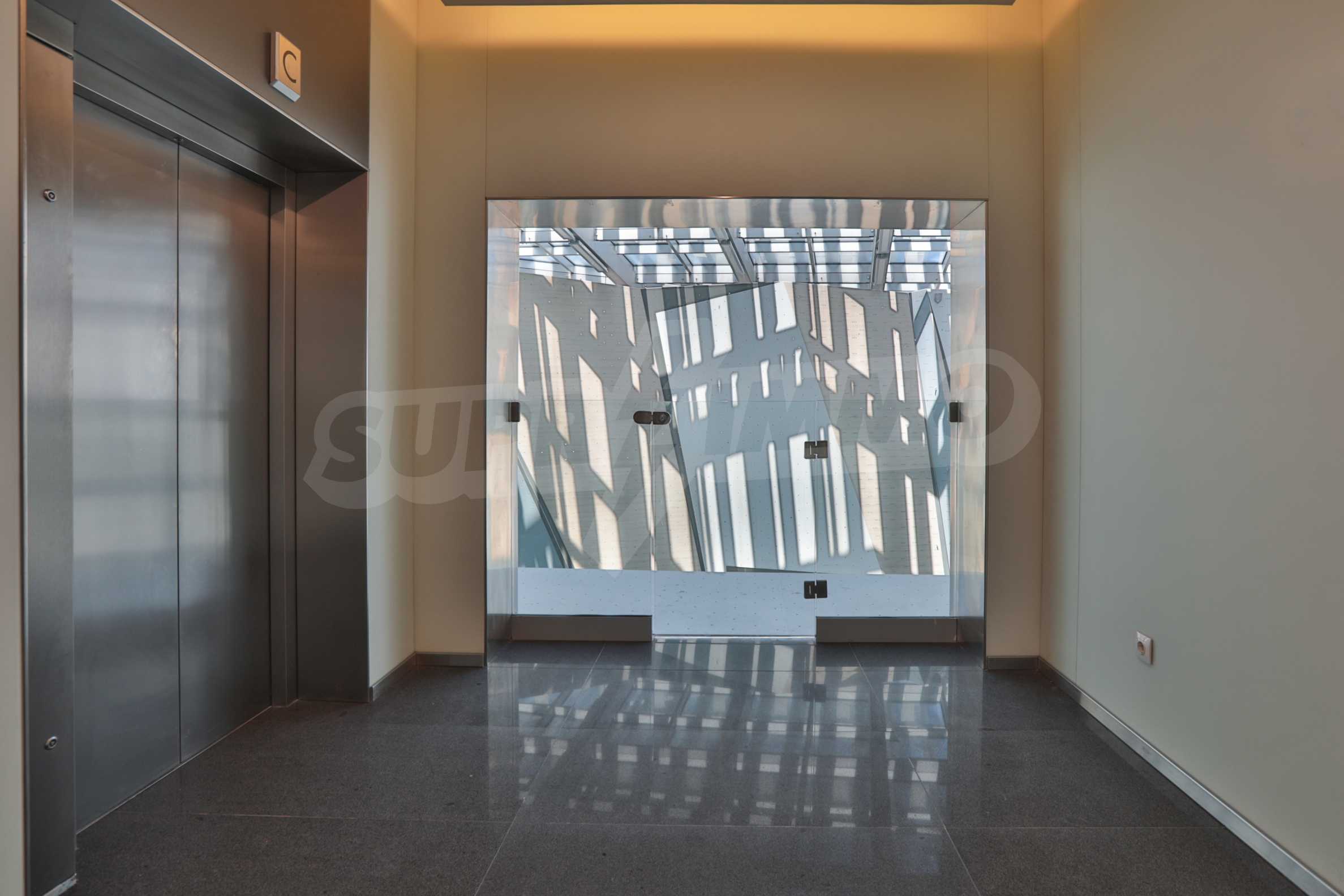 • Facade – high-quality profile system made of Schuco glass and aluminum profiles with an extremely low heat transfer coefficient, maximum level of sun protection, high natural light transmission, low reflection - 16% - 19%. Equipped with internal blinds for sun protection. There are also openable windows.