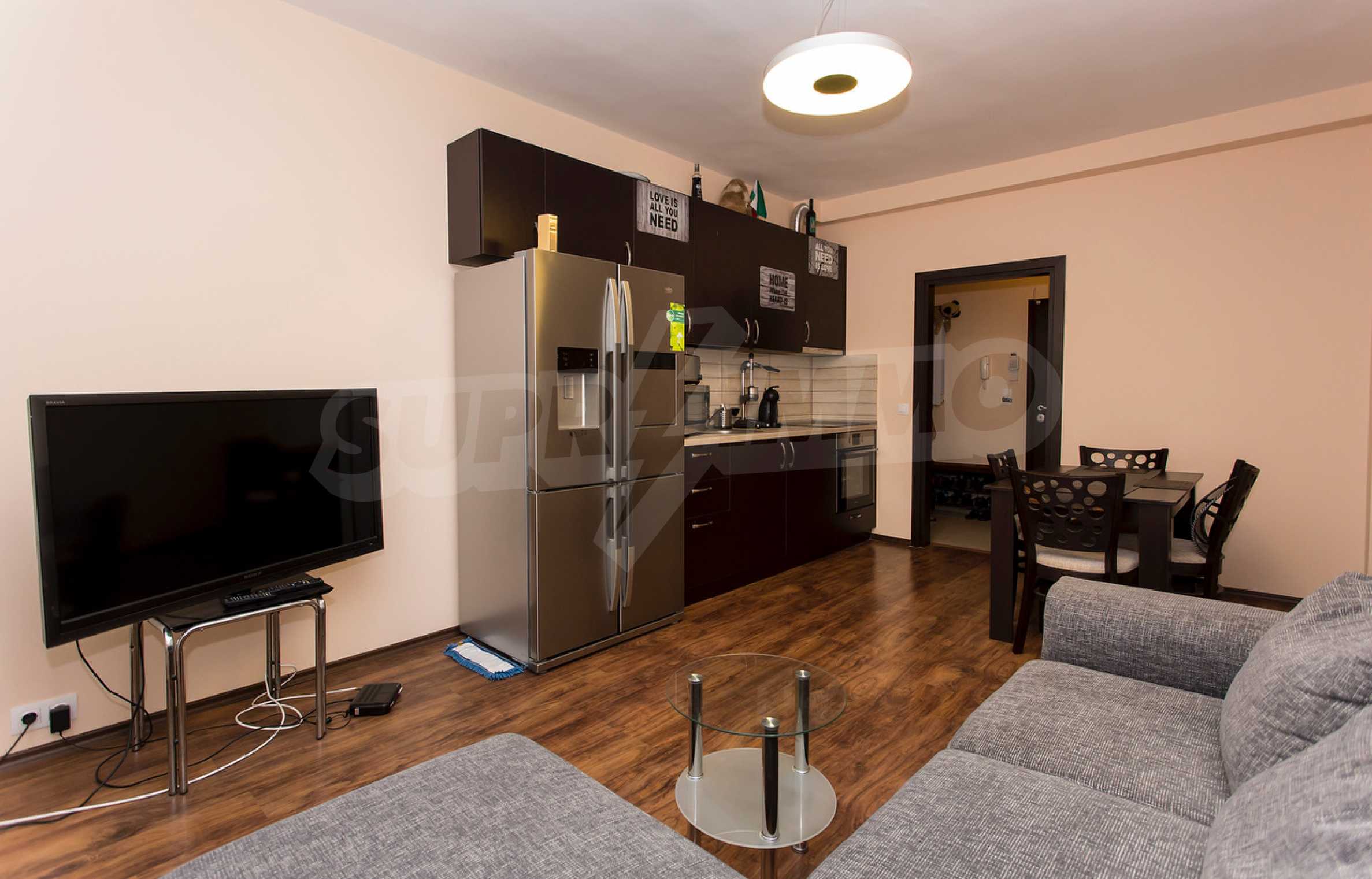 The apartment is fully furnished - living room with sofa bed and table, large TV, kitchenette with refrigerator, cabinets, stove, large table with four chairs, 2 bedrooms with double beds and a large wardrobe. The bathroom has a bathtub.