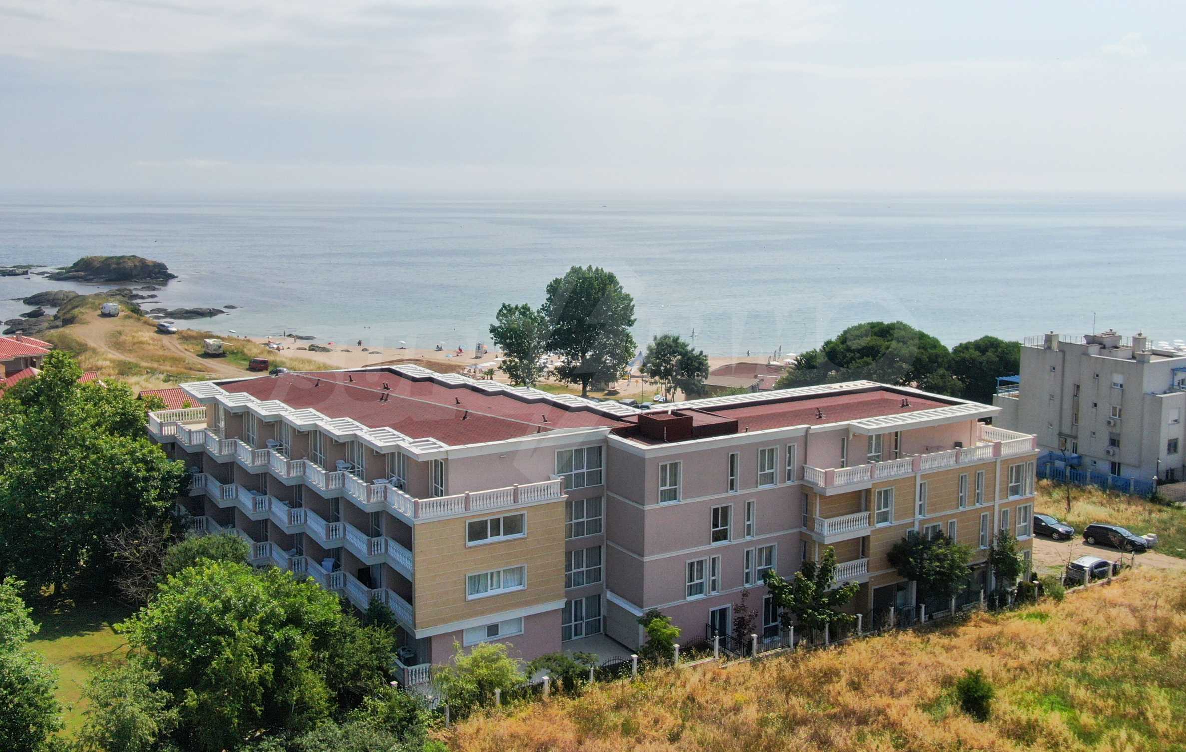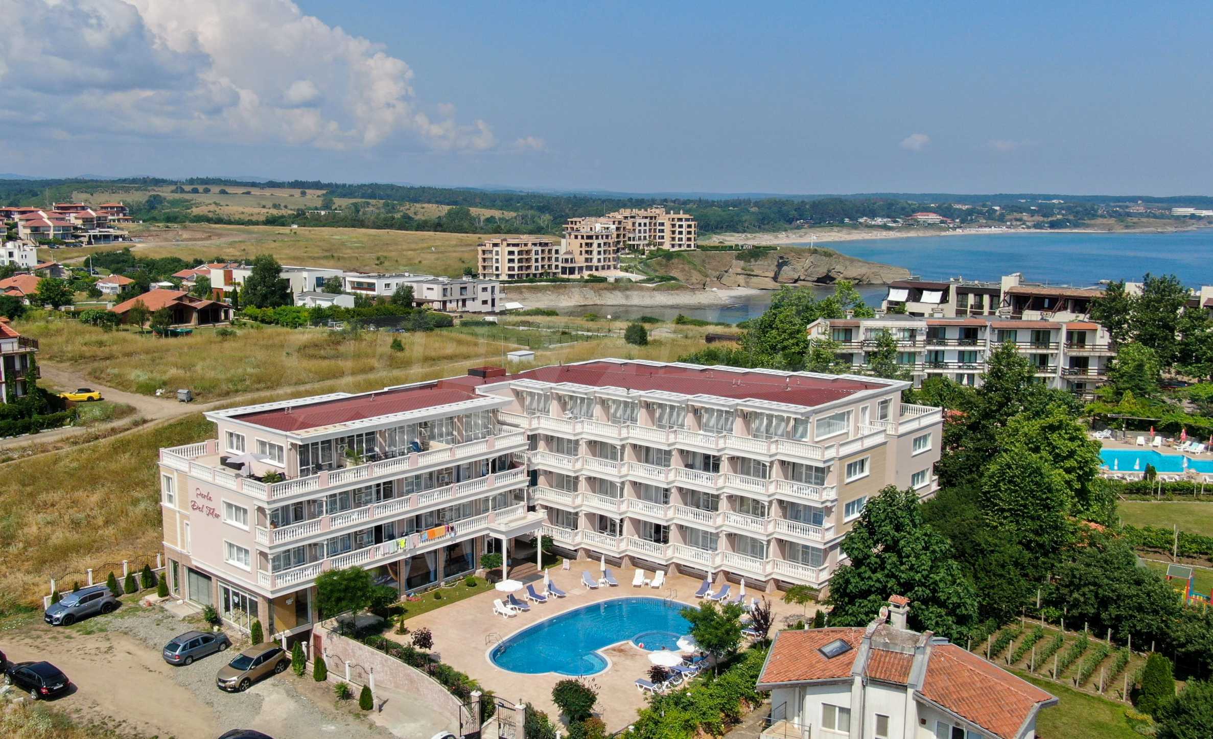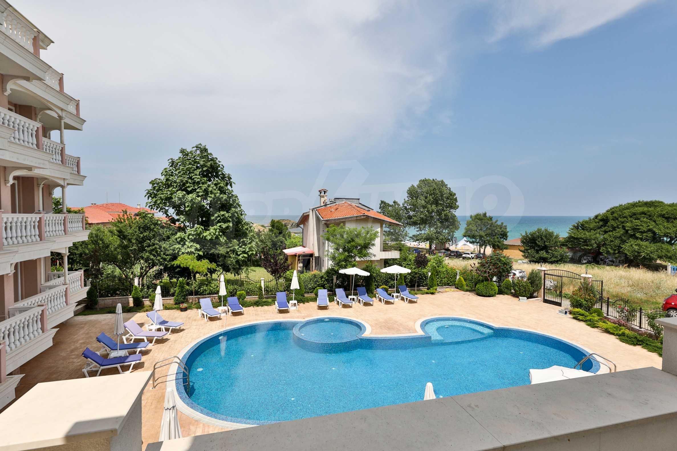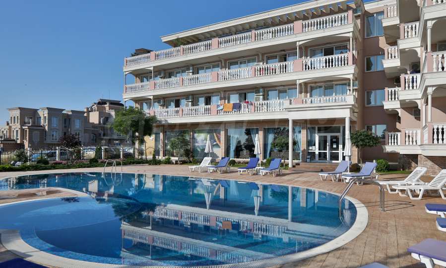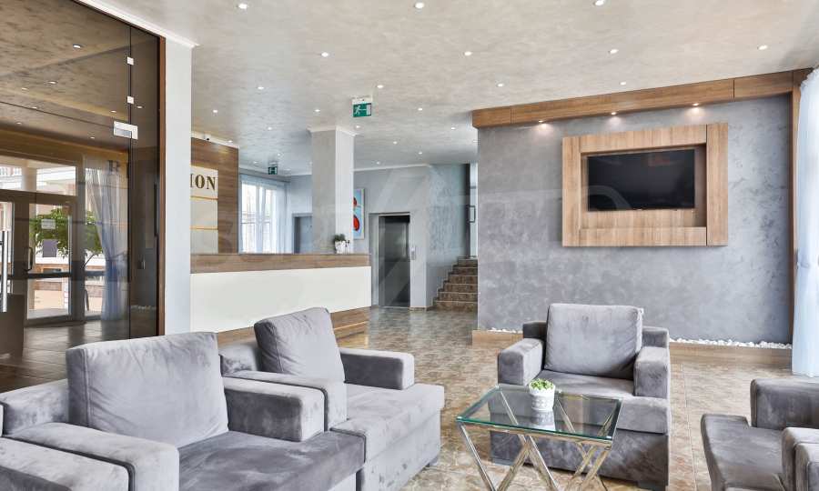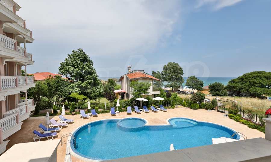 The building stands out for its sophisticated and elegant architecture, with spacious terraces with balustrades. It is oriented towards the sea coast and offers incredible views of the sea and the beach. There are all the necessary amenities for a pleasant vacation on the territory: swimming pool, underground parking and restaurant, security, video surveillance and reception.