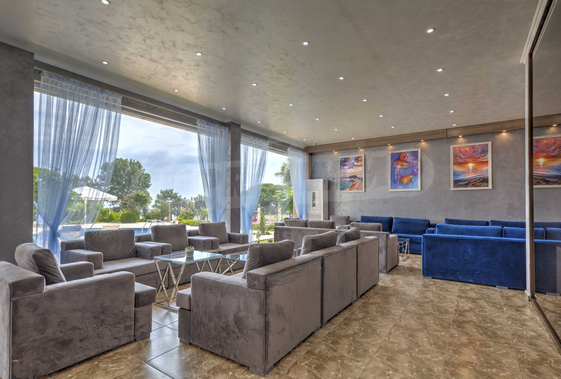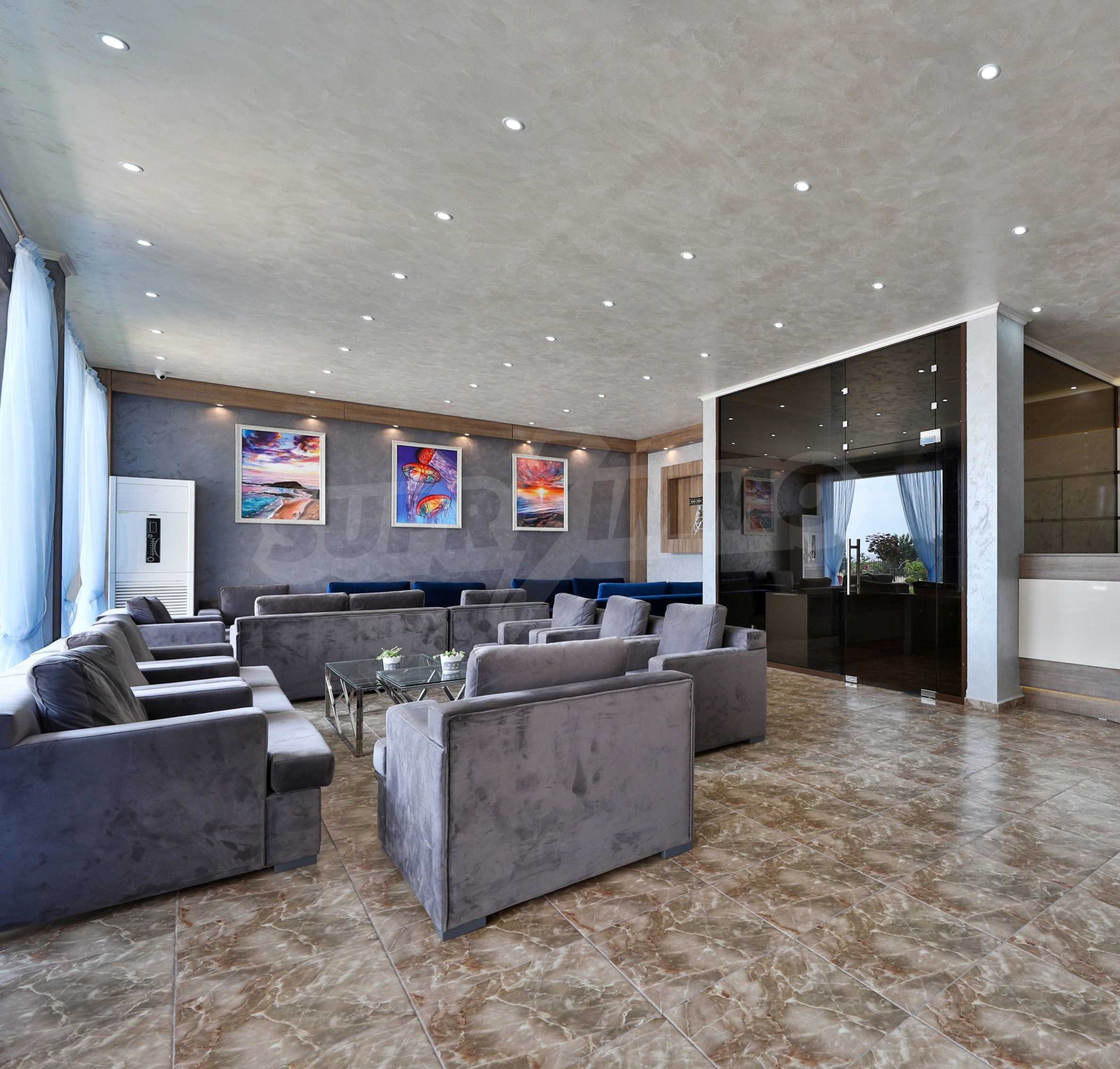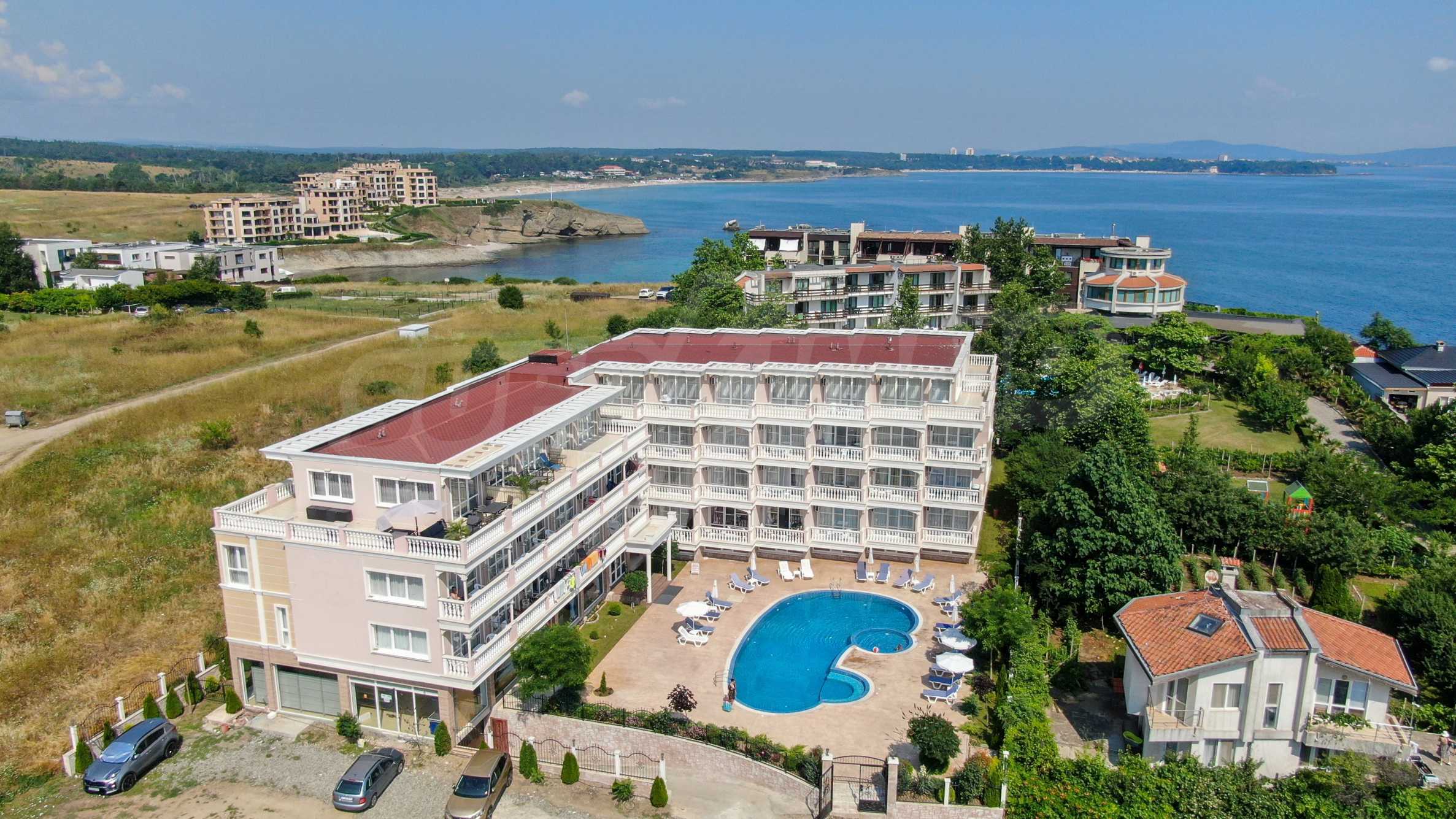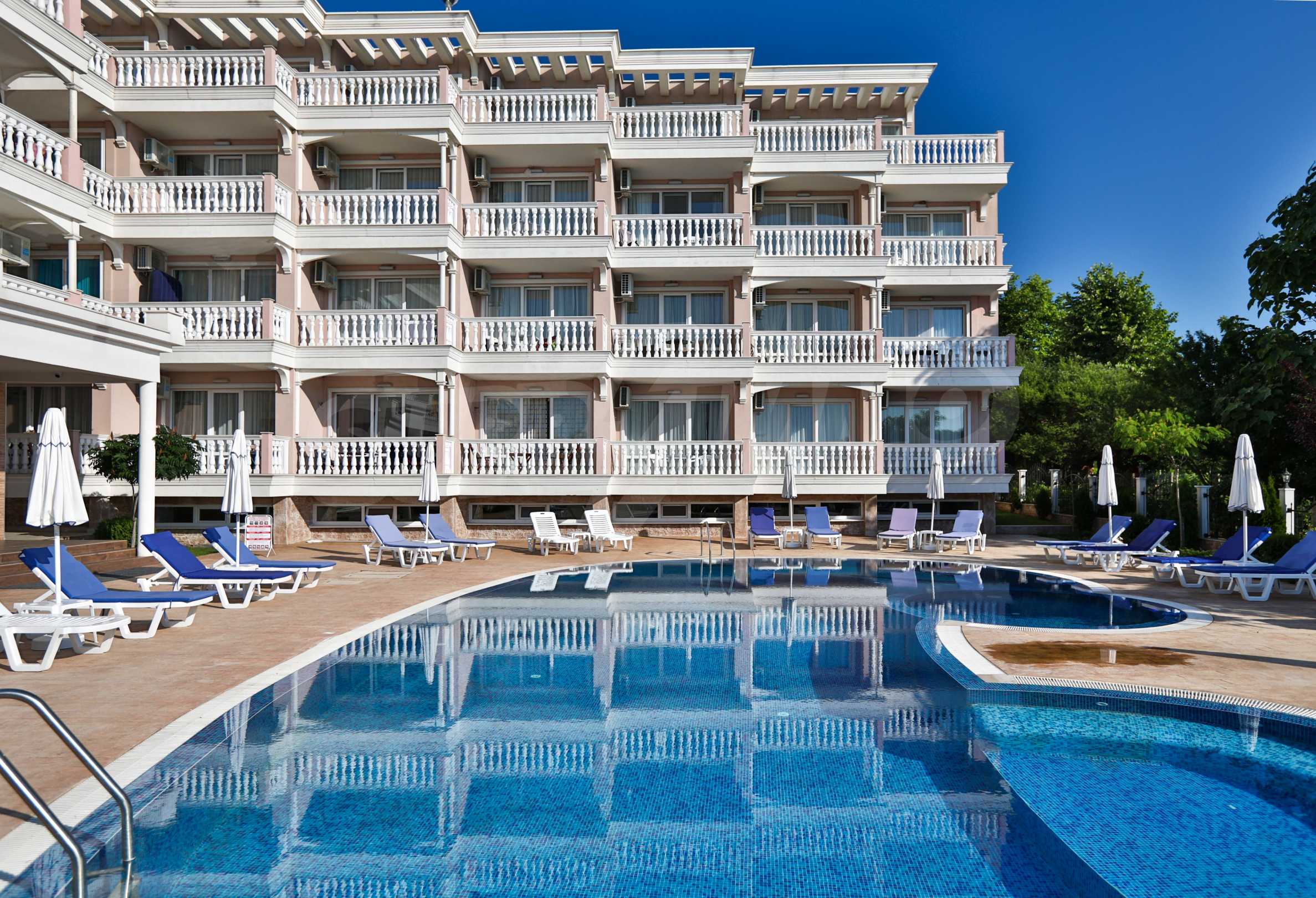 The building stands out for its sophisticated and elegant architecture, with spacious terraces with balustrades. It is oriented towards the sea coast and offers incredible views of the sea and the beach. There are all the necessary amenities for a pleasant vacation on the territory: swimming pool, underground parking and restaurant, security, video surveillance and reception.