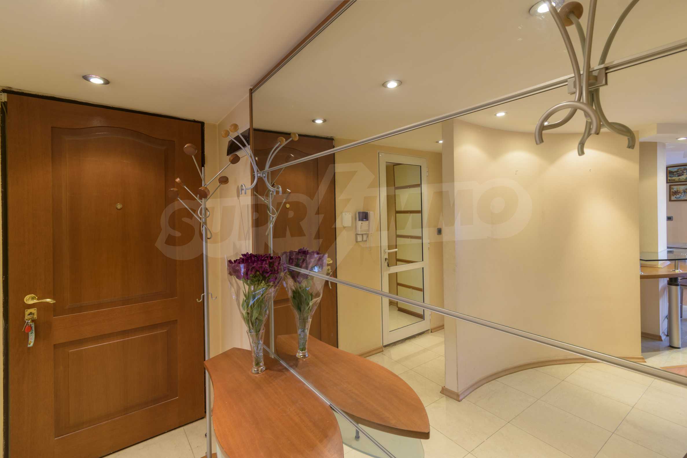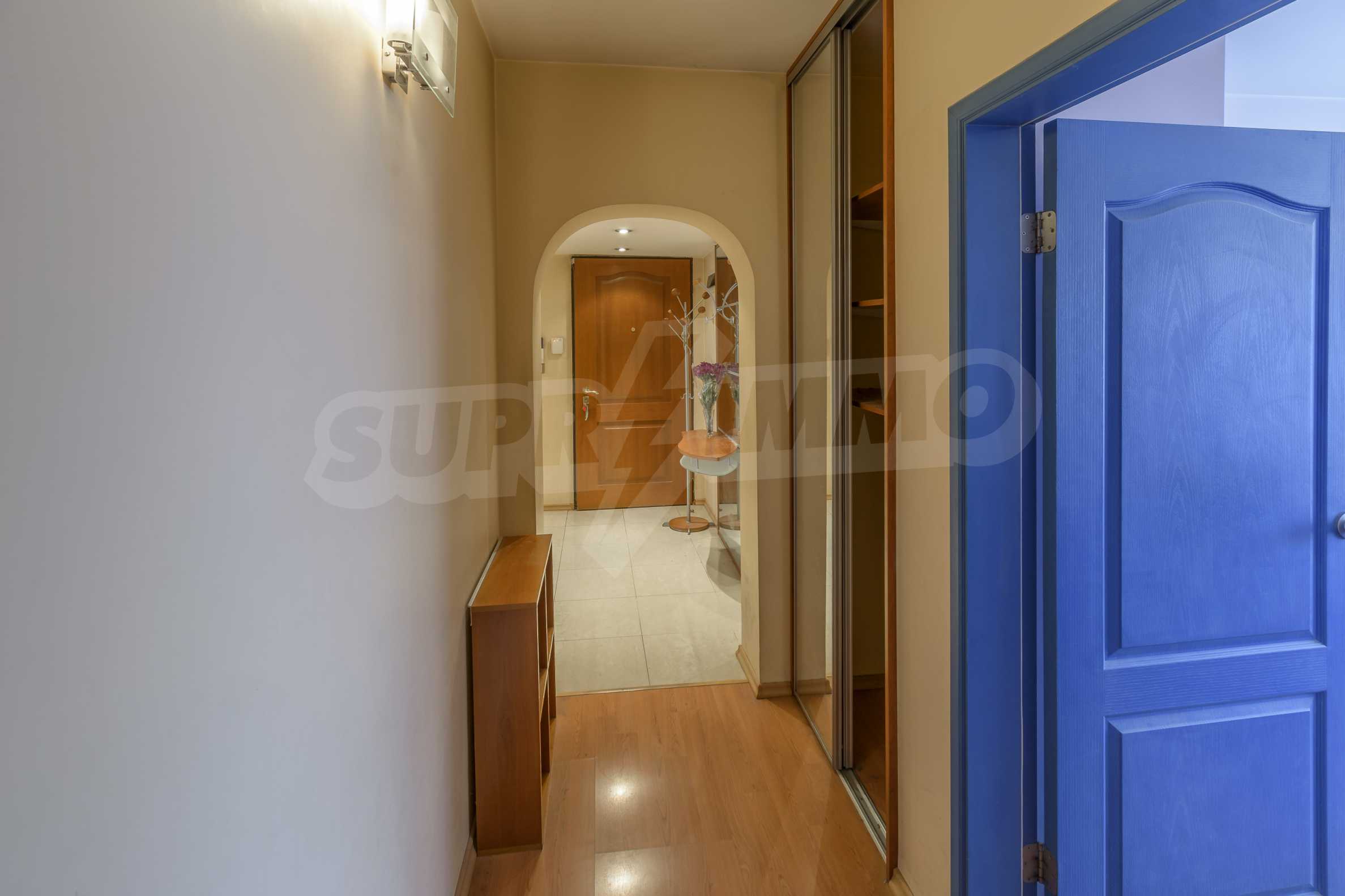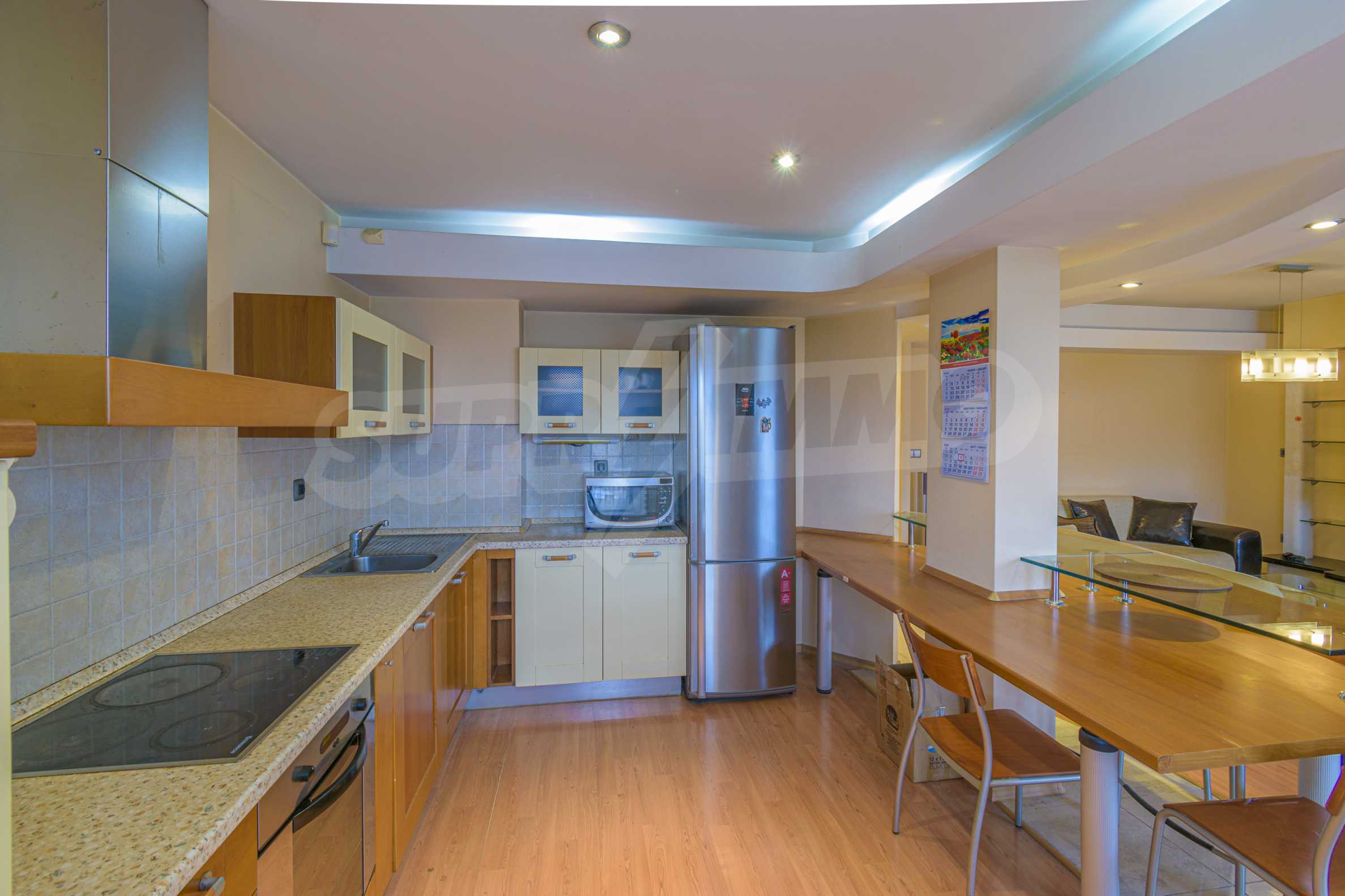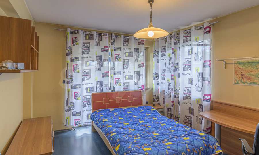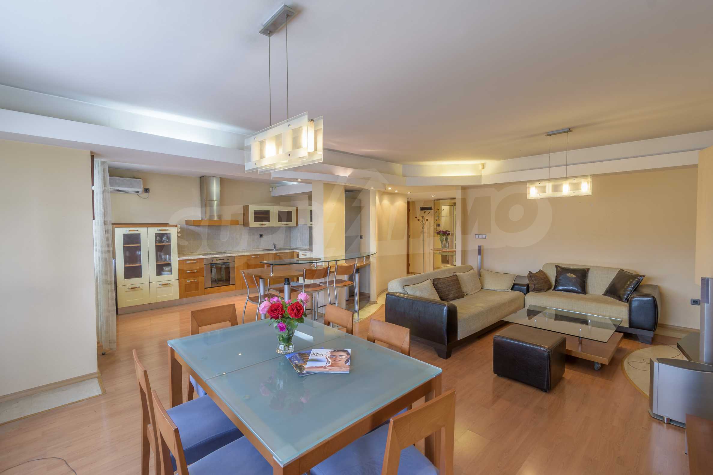 The apartment is spacious and has the following functional layout: entrance hall, kitchen and living room with balconies, guest toilet, master bedroom with closet and private bathroom, two separate bedrooms / children's / with balconies, bathroom with toilet. The living room has a working fireplace.
