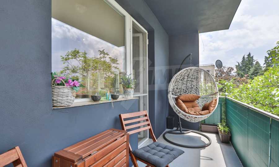 We are pleased to present this magnificent three-bedroom apartment for sale in Iztok district, furnished according to a design project. The property is located in a massive brick building from the mid-sixties, on the third floor (one apartment per floor), facing south-west-east.