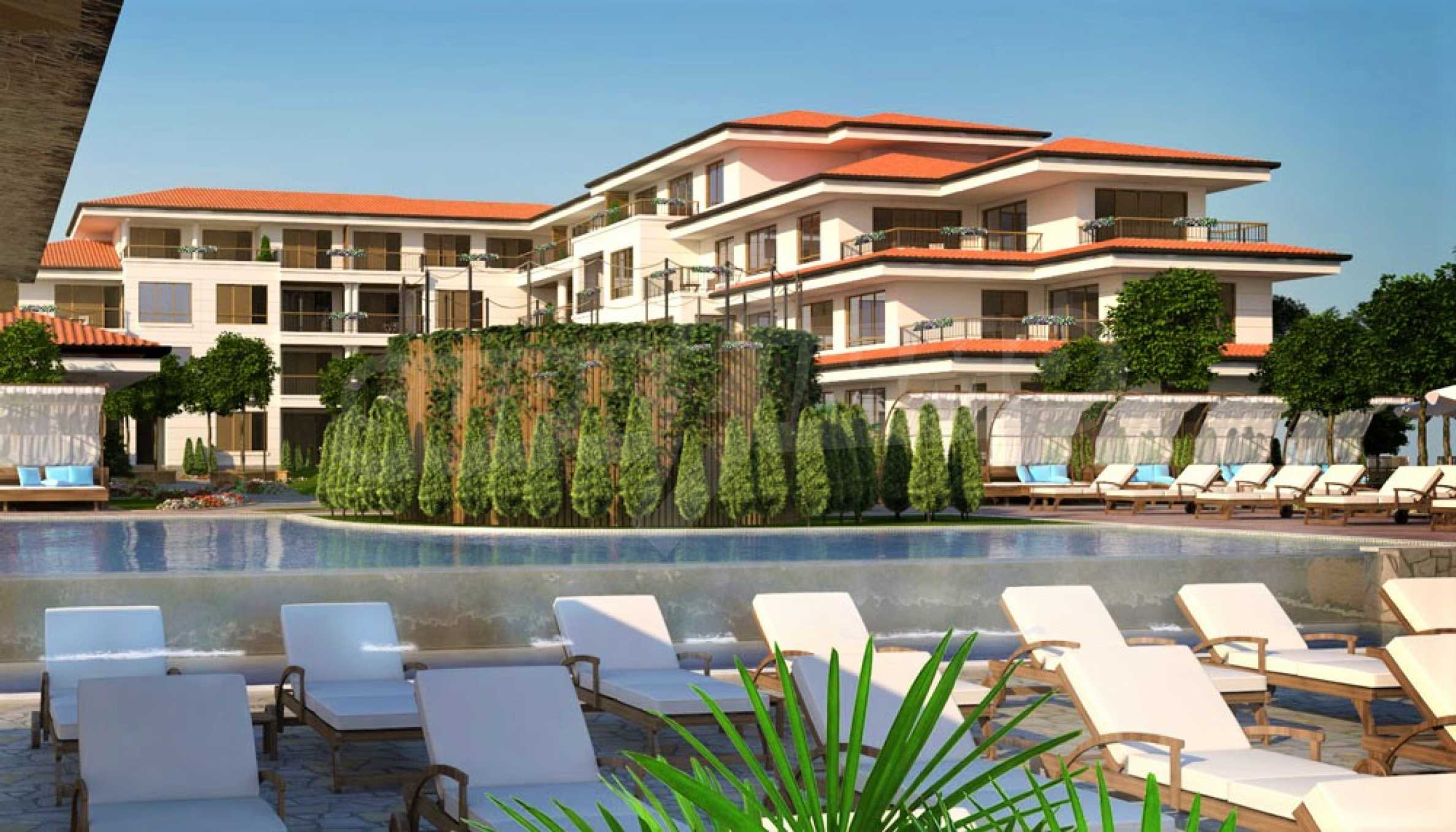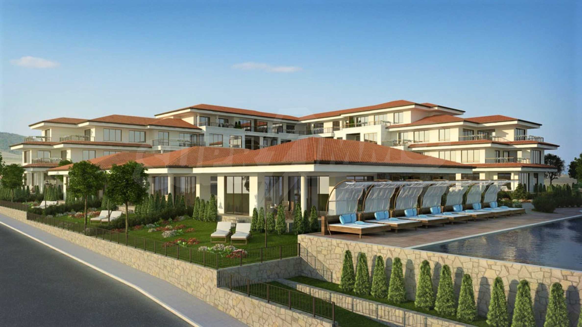 We also offer properties for sale - one and two bedroom apartments, quality finished "turnkey", without furniture. The floor plans are in line with the latest trends in a modern building. All apartments and villas are spacious and bright, with southeastern exposure and plenty of sunlight, with many balconies overlooking the sea. The main architectural idea in the design of the complex - to discover the stunning panoramic sea view of the area. The living rooms and bedrooms have floor-to-ceiling windows.