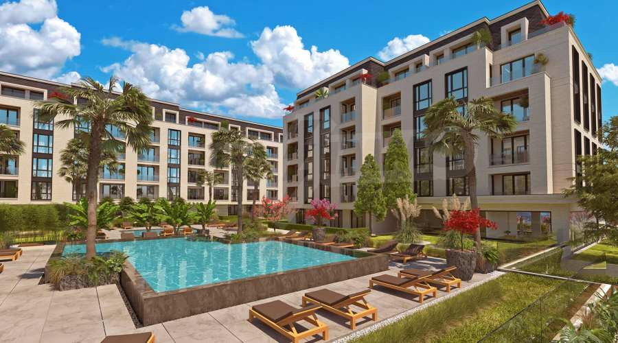 The complex itself consists of 4 six-storey residential buildings with underground parking, park areas, outdoor pools and playgrounds, access control and 24 hour video surveillance.