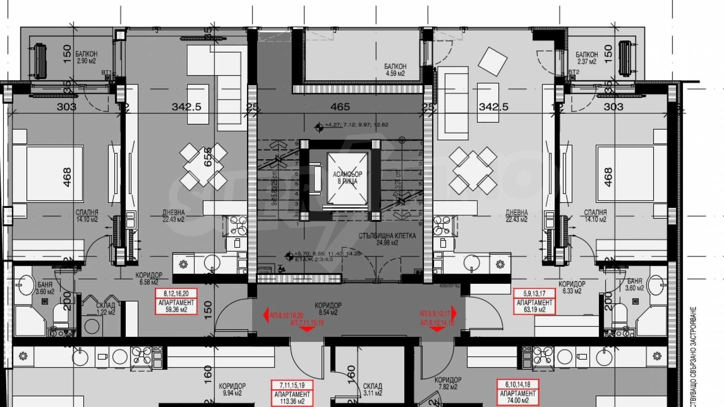 The building has 6 floors, with one underground level and has only 24 luxury apartments with one, two or three bedrooms / after unification /. There are only 4 apartments on each floor. On the ground floor there are warehouses, garages and parking spaces. There are parking spaces in the basement and the backyard is ennobled with vegetation.