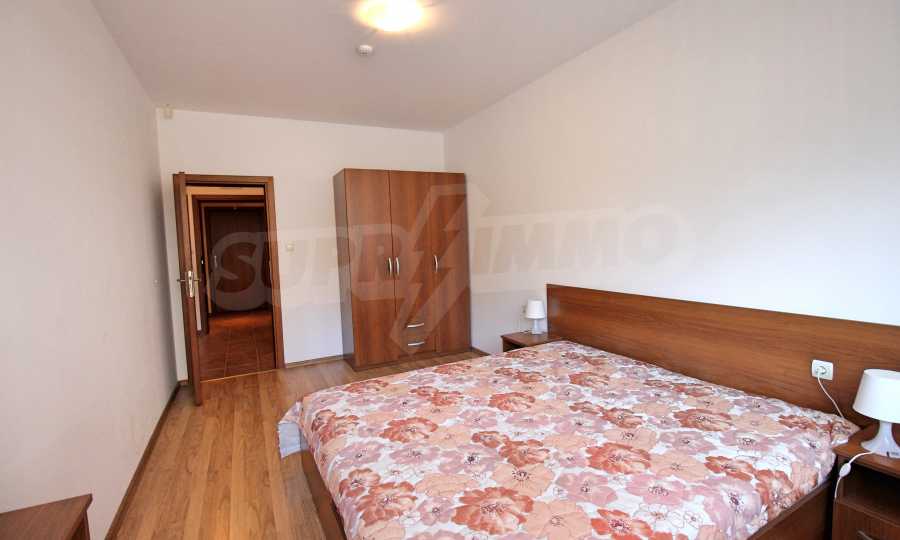 We are glad to present this fully furnished apartment with south-east exposure in the ski resort Borovets. The one-bedroom apartment is located on the first floor with a total area of 87.96 sq.m., distributed between an entrance hall, a living room with a kitchenette, bedroom, a bathroom with a tub, and two balconies. The rooms are finished with walls - latex, floor - laminate in the rooms and granite in the hallway, windows - wooden. The furniture and equipment include a sink, cabinets, refrigerator, stove, table with 4 chairs (kitchen); sofa, coffee table, 2 stools, TV, TV cabinet (living room); double bed, two bedside tables, wardrobe (bedroom); bath, sink with mirror (bathroom with toilet). The apartment is wired for internet and cable TV. The heating is with electric convectors.