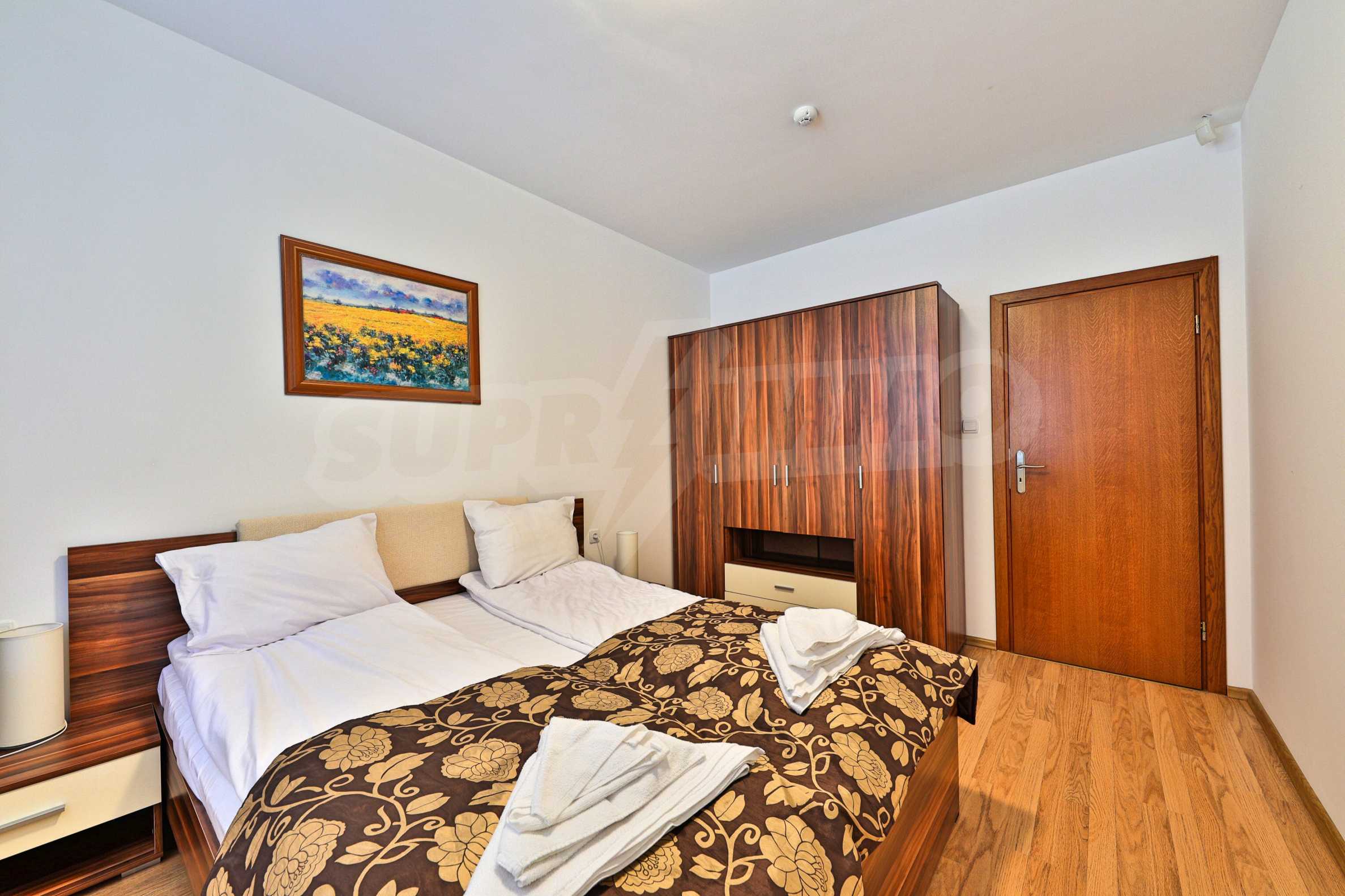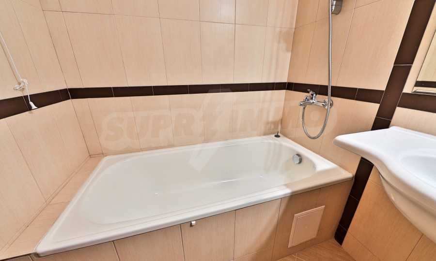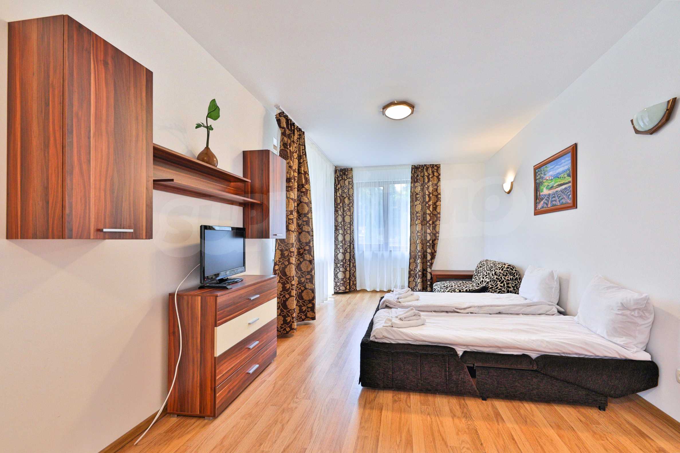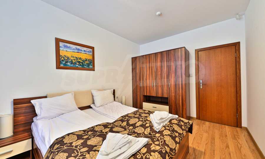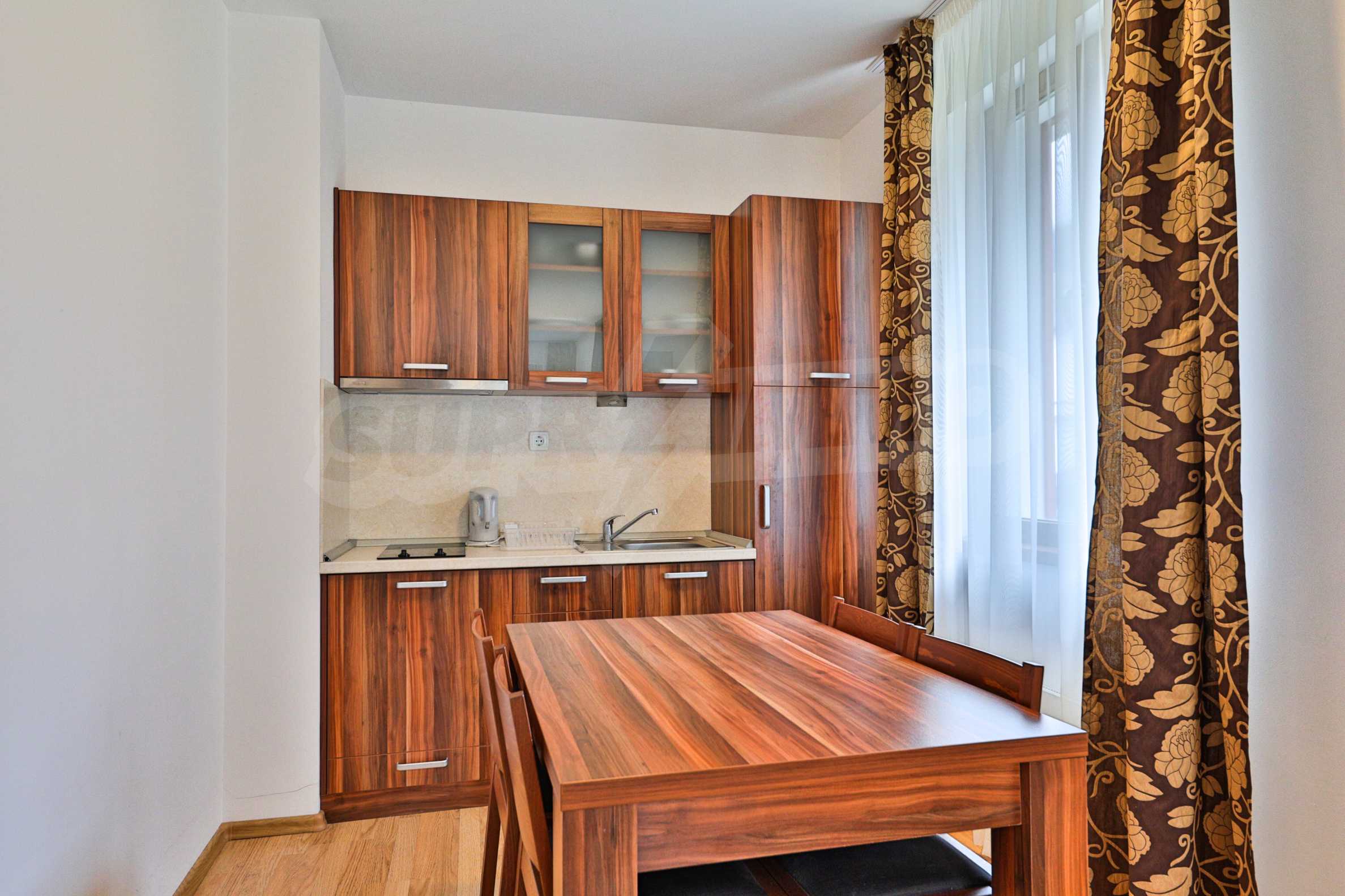 We are glad to present this fully furnished apartment with south-west exposure in the ski resort Borovets. The one-bedroom apartment is located on the first floor with a total area of 79.04 sq.m., distributed between an entrance hall, a living room with a kitchenette, bedroom, a bathroom with a tub, and a balcony. The rooms are finished with walls - latex, floor - laminate in the rooms and granite in the hallway, PVC window frames. The furniture and equipment include a sink, cabinets, refrigerator, stove, table with 4 chairs (kitchen); sofa, coffee table, 2 stools, TV, TV cabinet (living room); double bed, two bedside tables, wardrobe (bedroom); bath, sink with mirror (bathroom with toilet). The apartment is wired for internet and cable TV. The heating is with electric convectors.