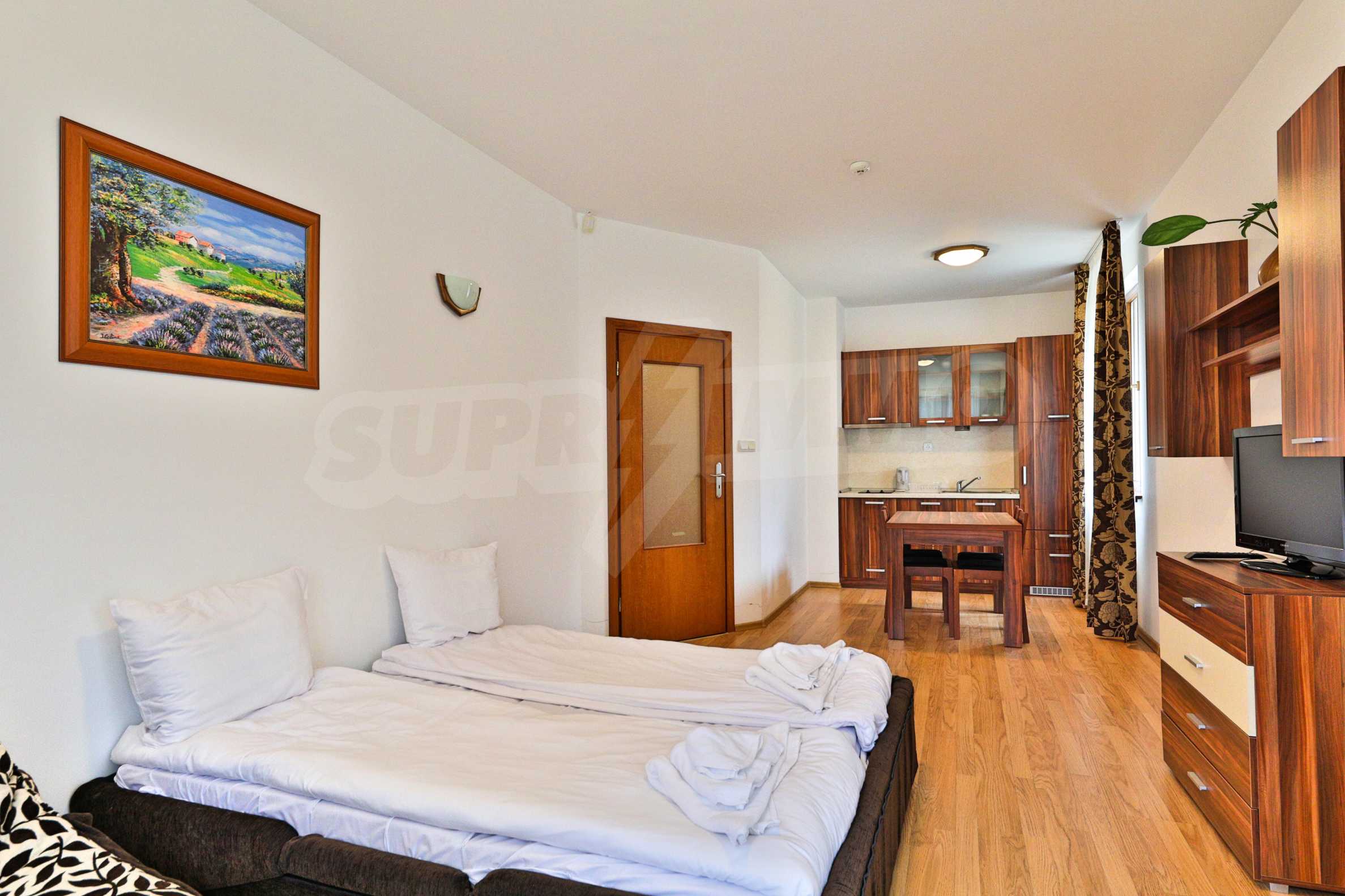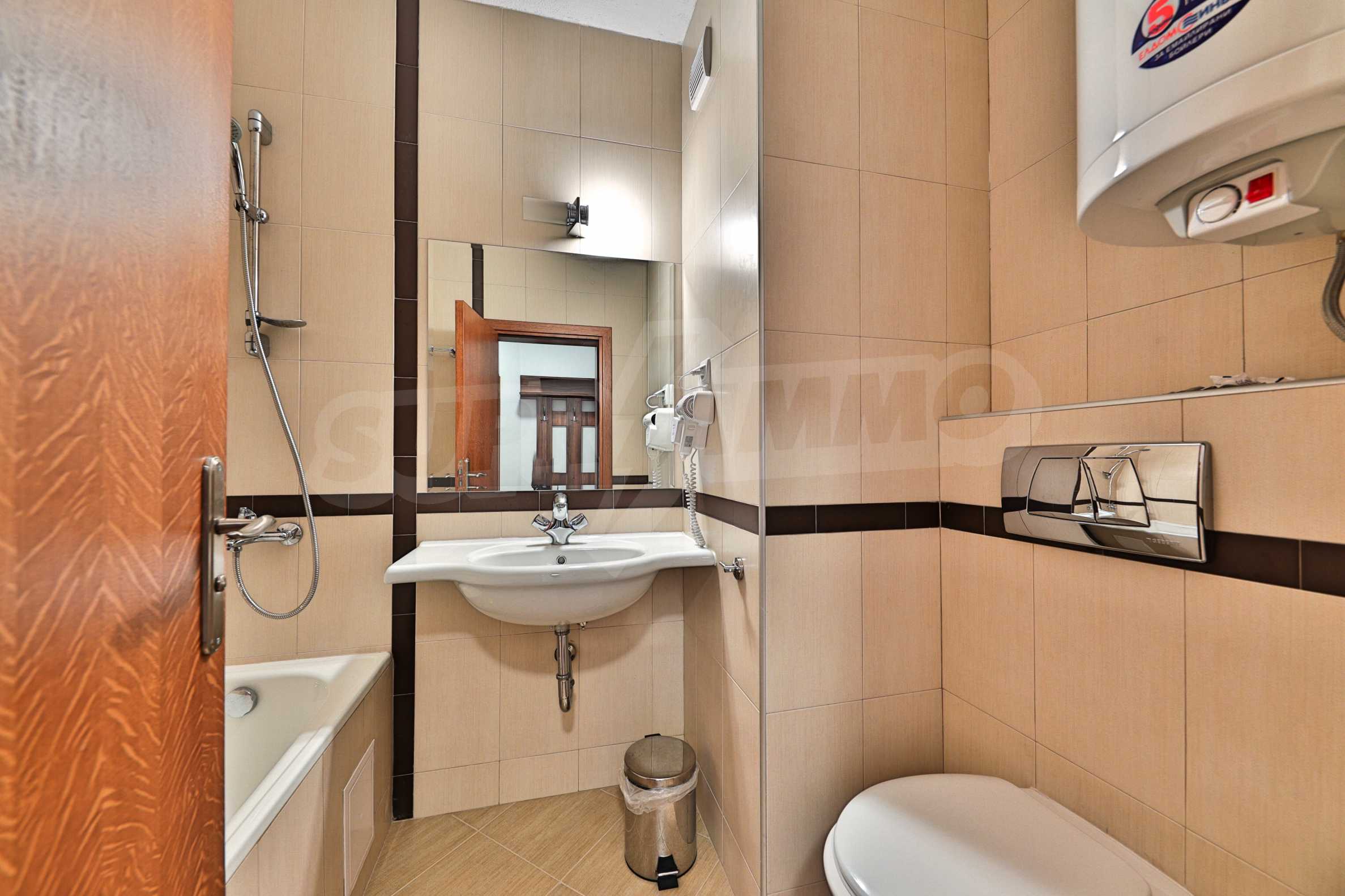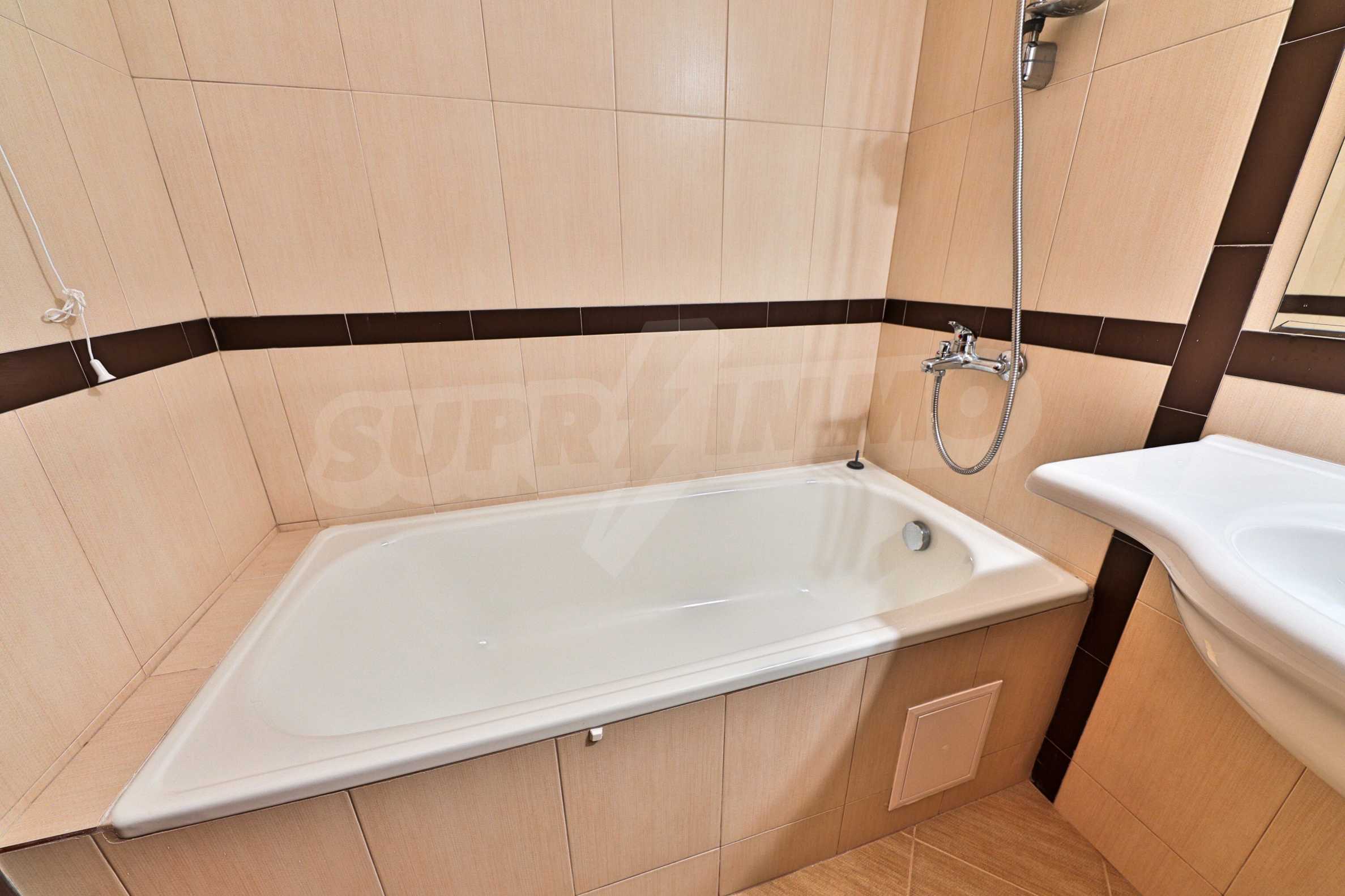 We are glad to present this fully furnished apartment with south-west exposure in the ski resort Borovets. The one-bedroom apartment is located on the first floor with a total area of 79.04 sq.m., distributed between an entrance hall, a living room with a kitchenette, bedroom, a bathroom with a tub, and a balcony. The rooms are finished with walls - latex, floor - laminate in the rooms and granite in the hallway, PVC window frames. The furniture and equipment include a sink, cabinets, refrigerator, stove, table with 4 chairs (kitchen); sofa, coffee table, 2 stools, TV, TV cabinet (living room); double bed, two bedside tables, wardrobe (bedroom); bath, sink with mirror (bathroom with toilet). The apartment is wired for internet and cable TV. The heating is with electric convectors.