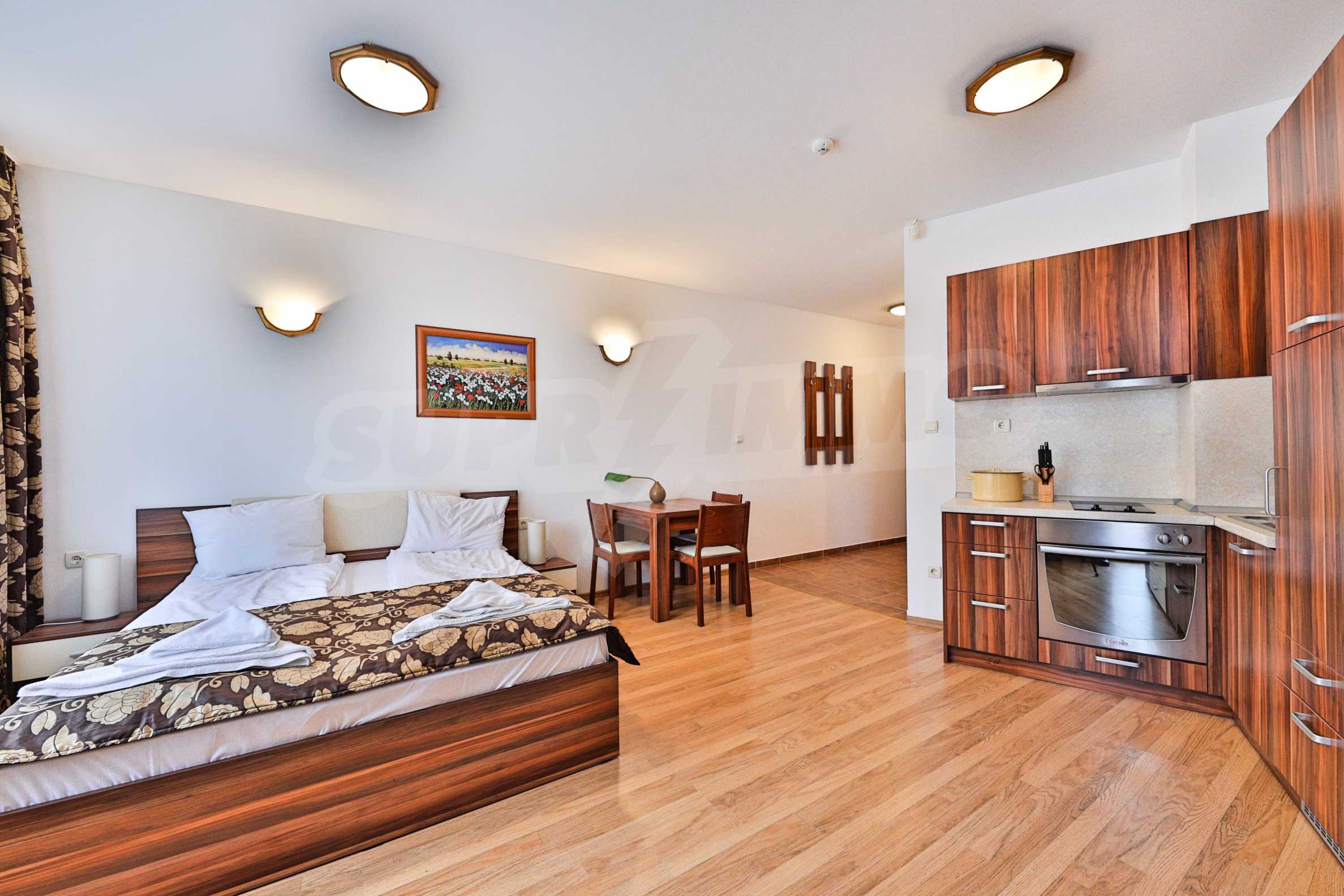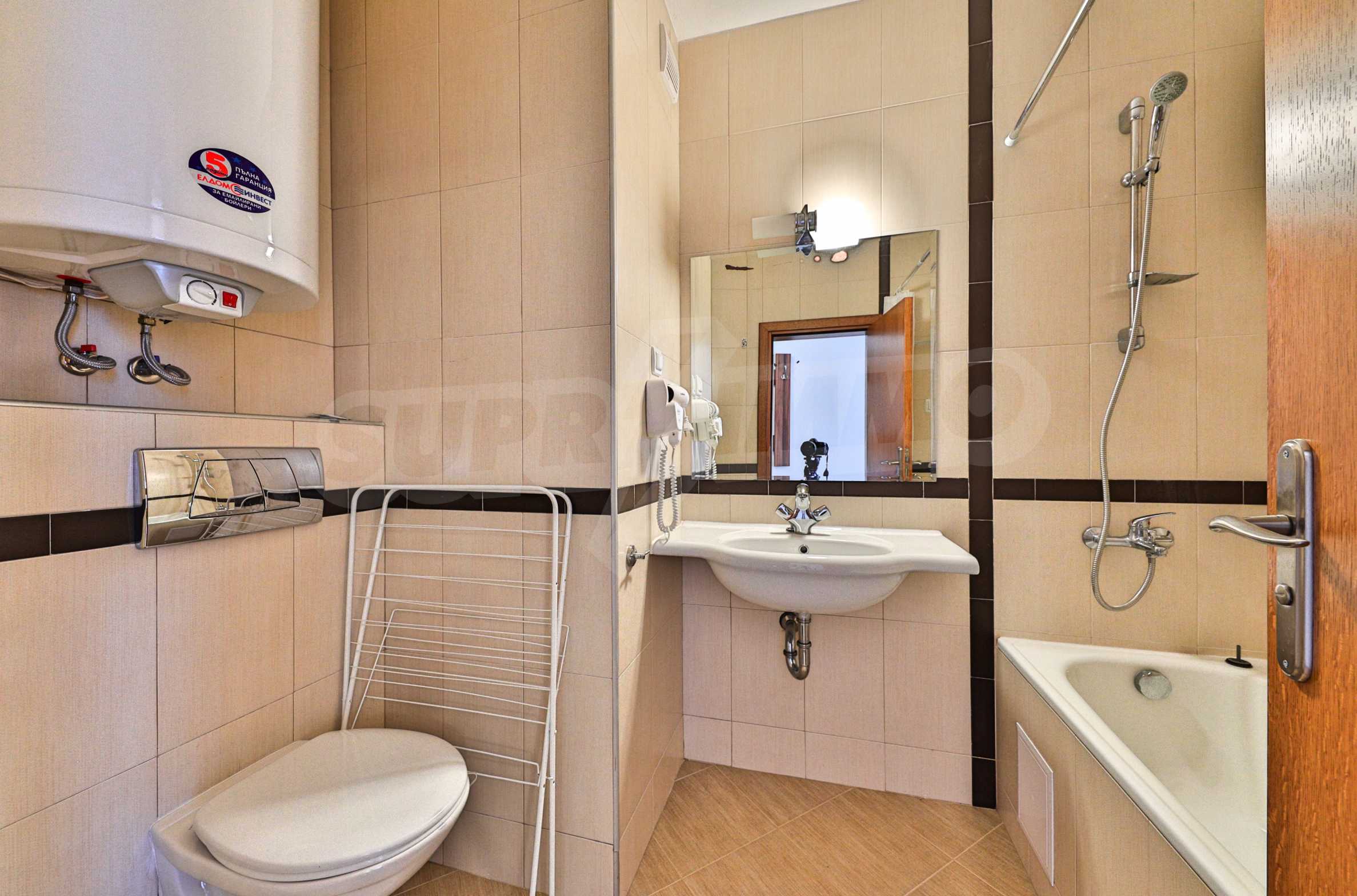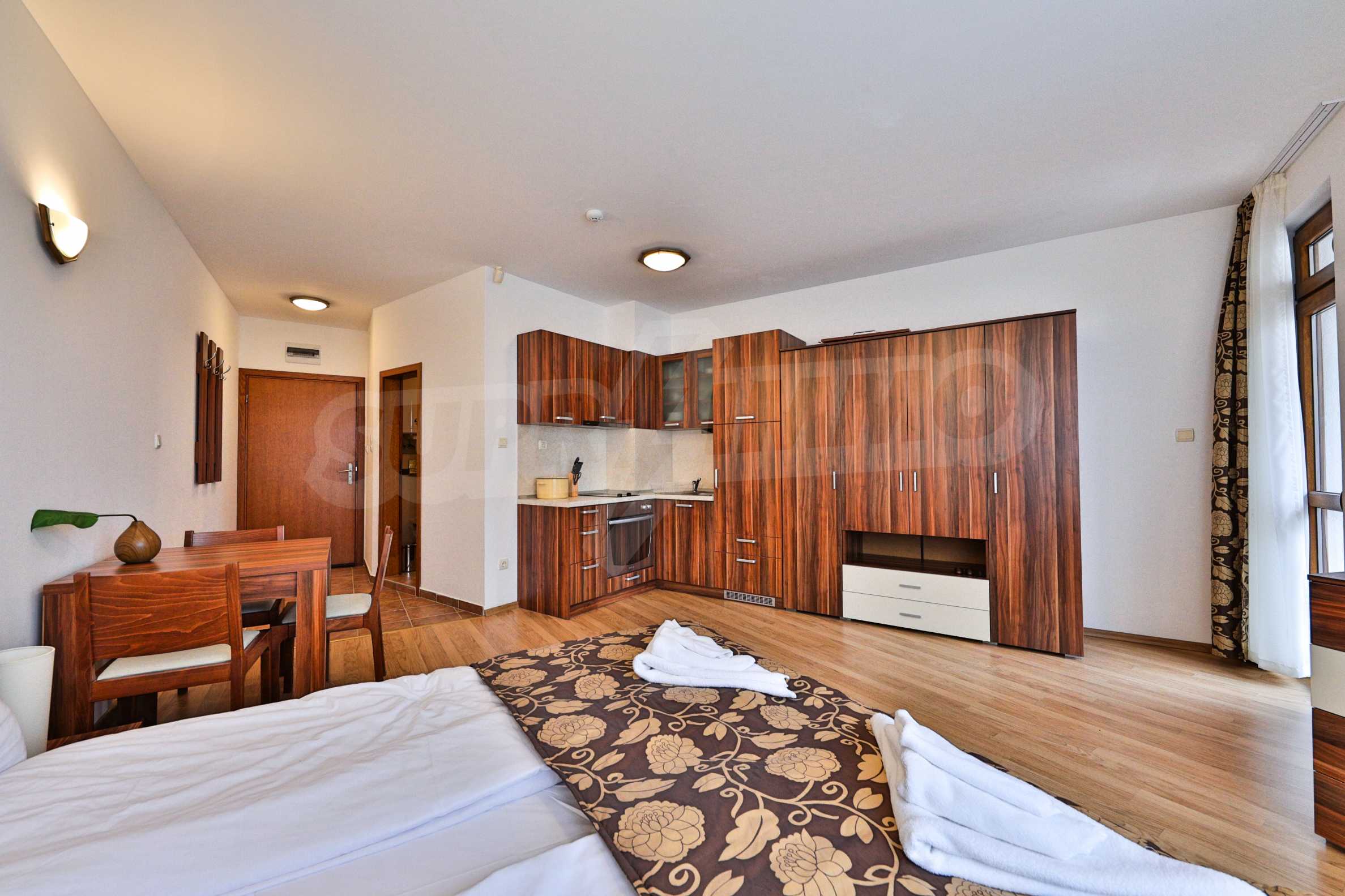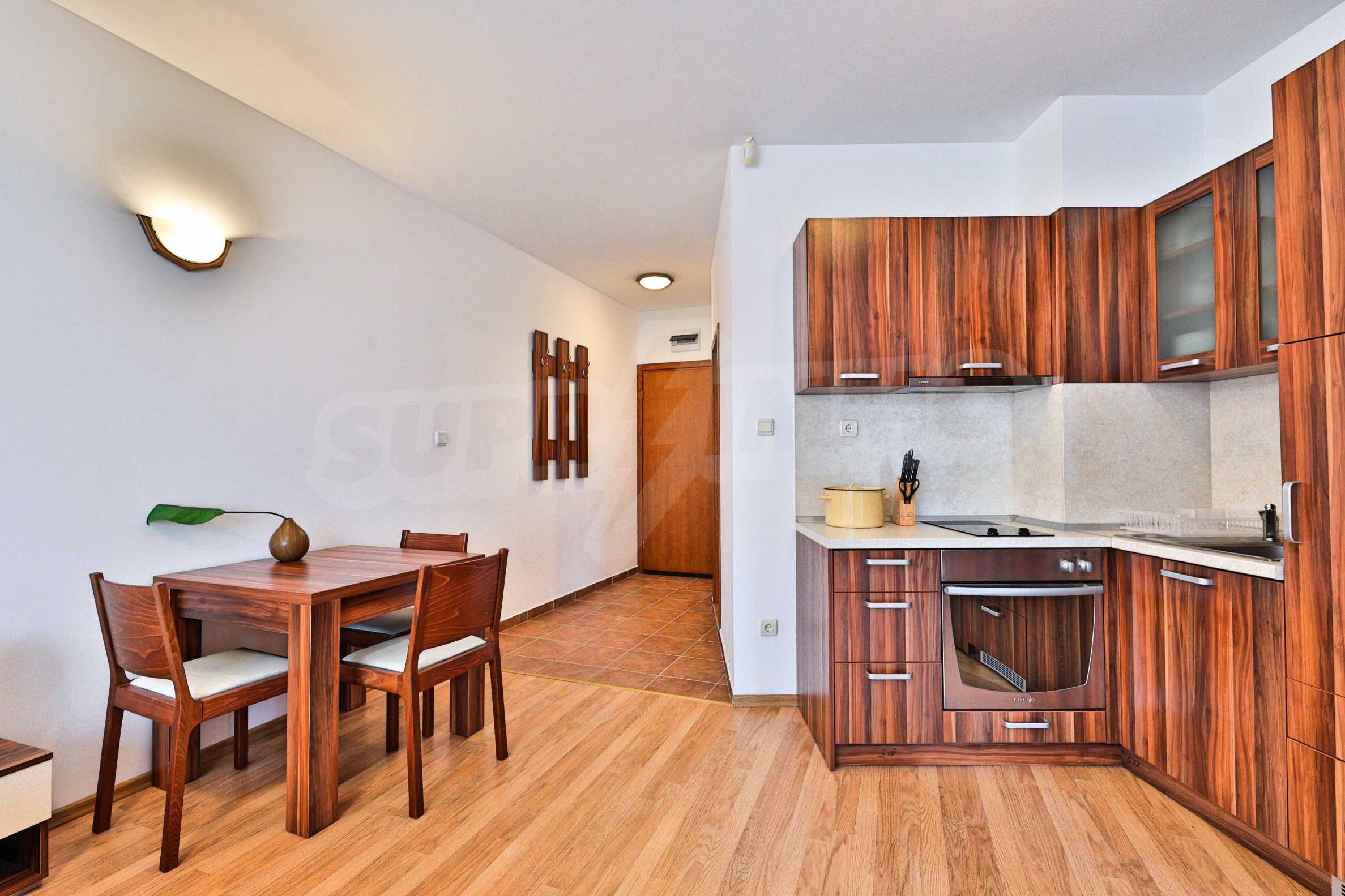 We are glad to present this fully furnished apartment with south-east exposure in the ski resort Borovets. The studio is located on the first floor with a total area of 49.67 sq.m., distributed between an entrance hall, a living room with a kitchenette, and bedroom, a bathroom with a tub, and a balcony. The rooms are finished with walls - latex, floor - laminate in the rooms and granite in the hallway, PVC window frames. The furniture and equipment include a sink, cabinets, refrigerator, stove, table with 4 chairs (kitchen); sofa, coffee table, 2 stools, TV, TV cabinet (living room); double bed, two bedside tables, wardrobe (bedroom); bath, sink with mirror (bathroom with toilet). The apartment is wired for internet and cable TV. The heating is with electric convectors.