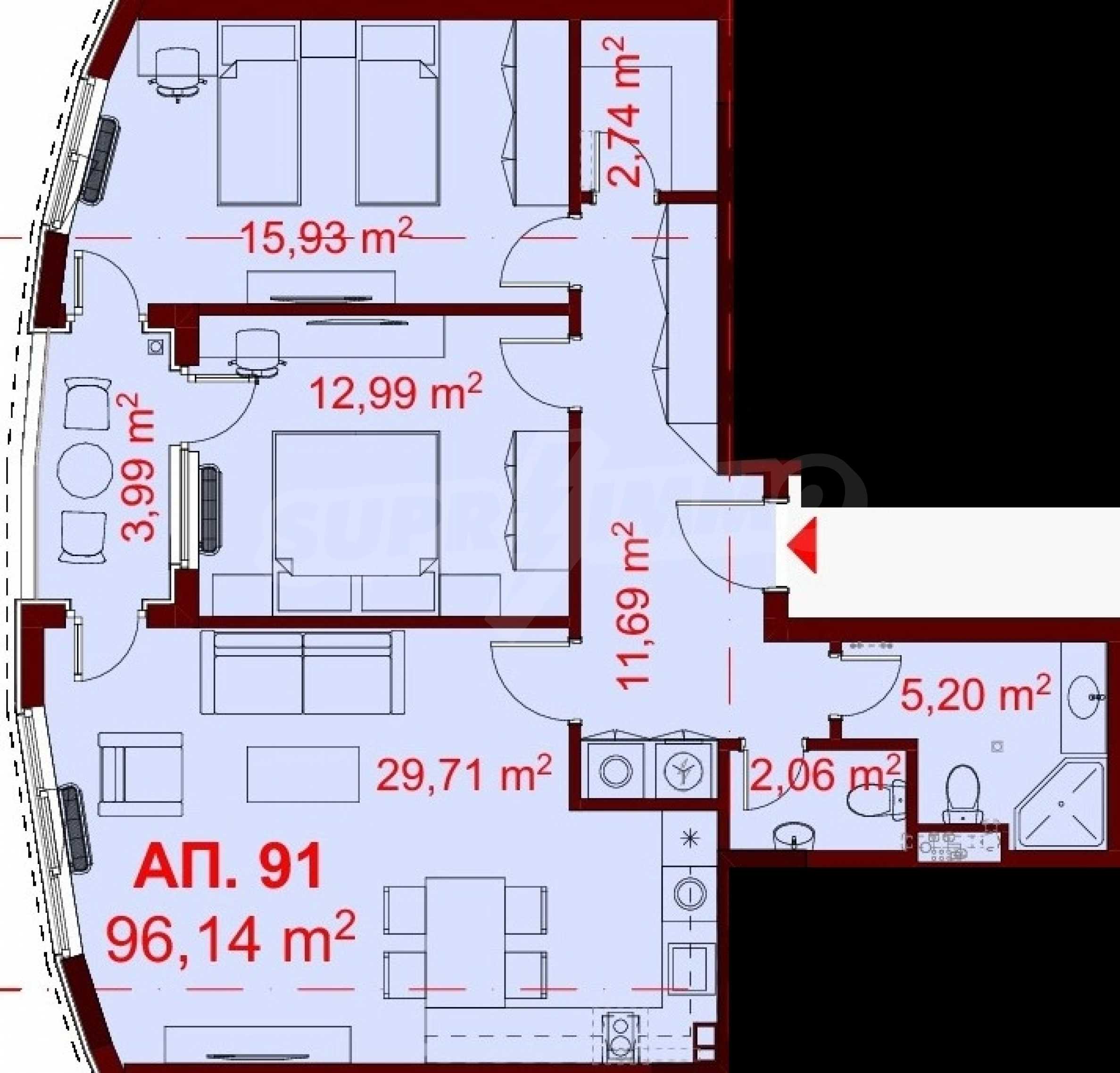 The property is offered in the degree of completion according to BDS (plaster and putty). Located on the 9th floor and consists of living room with kitchenette, 2 bedrooms, bathroom / WC, bathroom, storage room, common terrace to the three rooms.