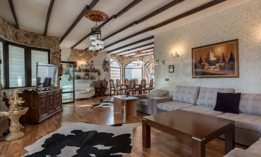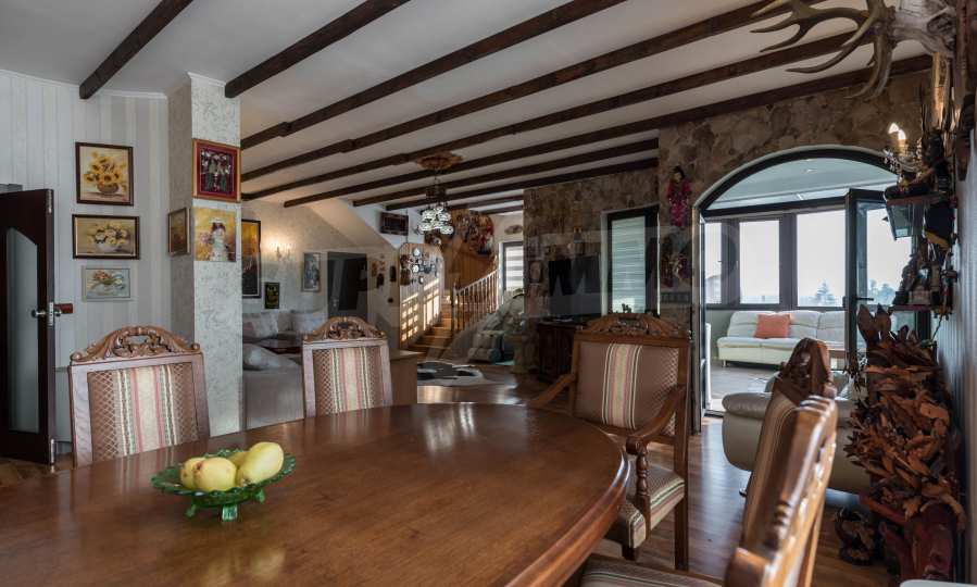 • On the first level 134.73 m2: large entrance hall, laundry room, bathroom with shower, sink and toilet, large living room attractively divided into several zones - kitchen with dining table and balcony, dining room with large banquet table, living room with seating area , large glazed balcony.